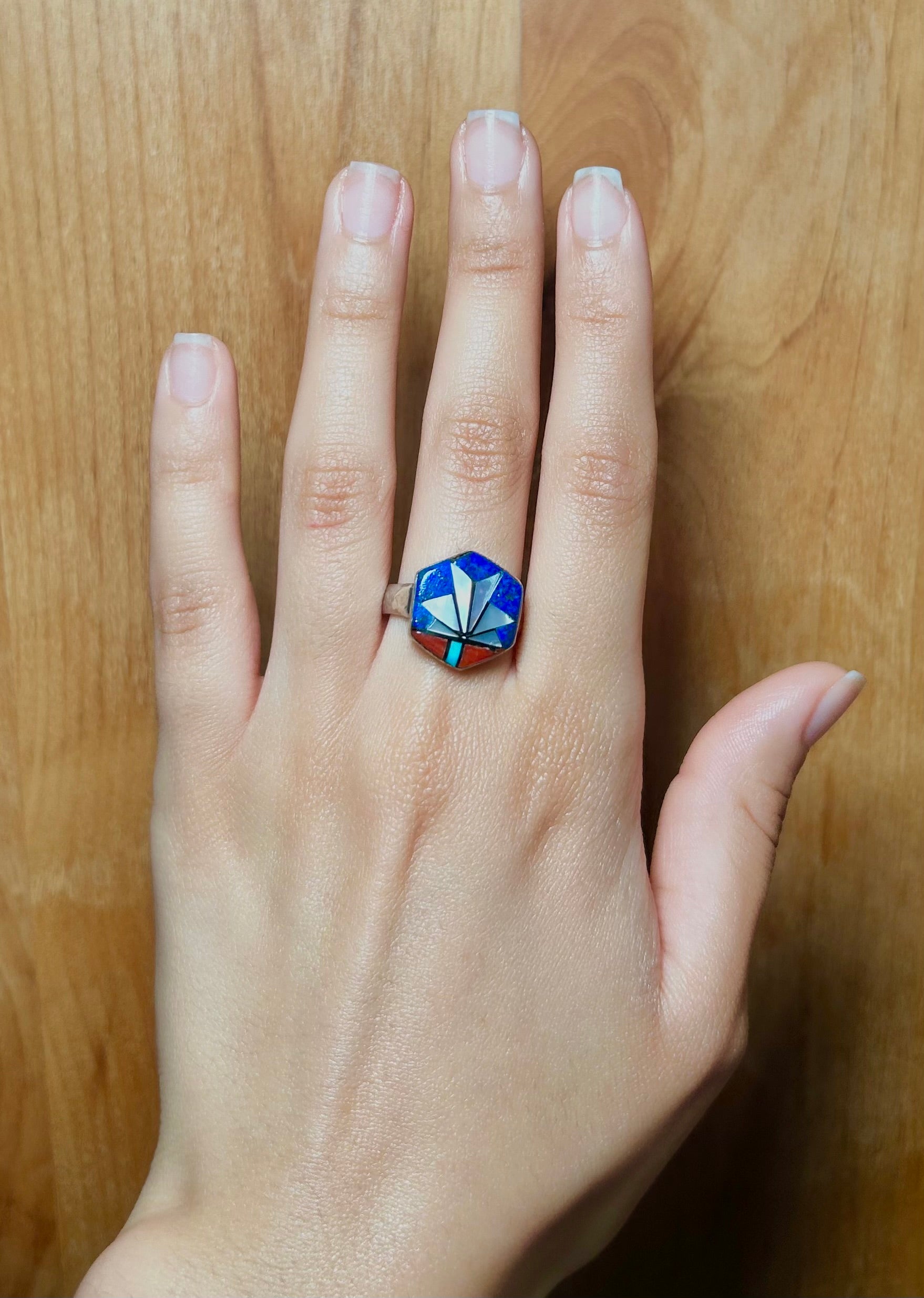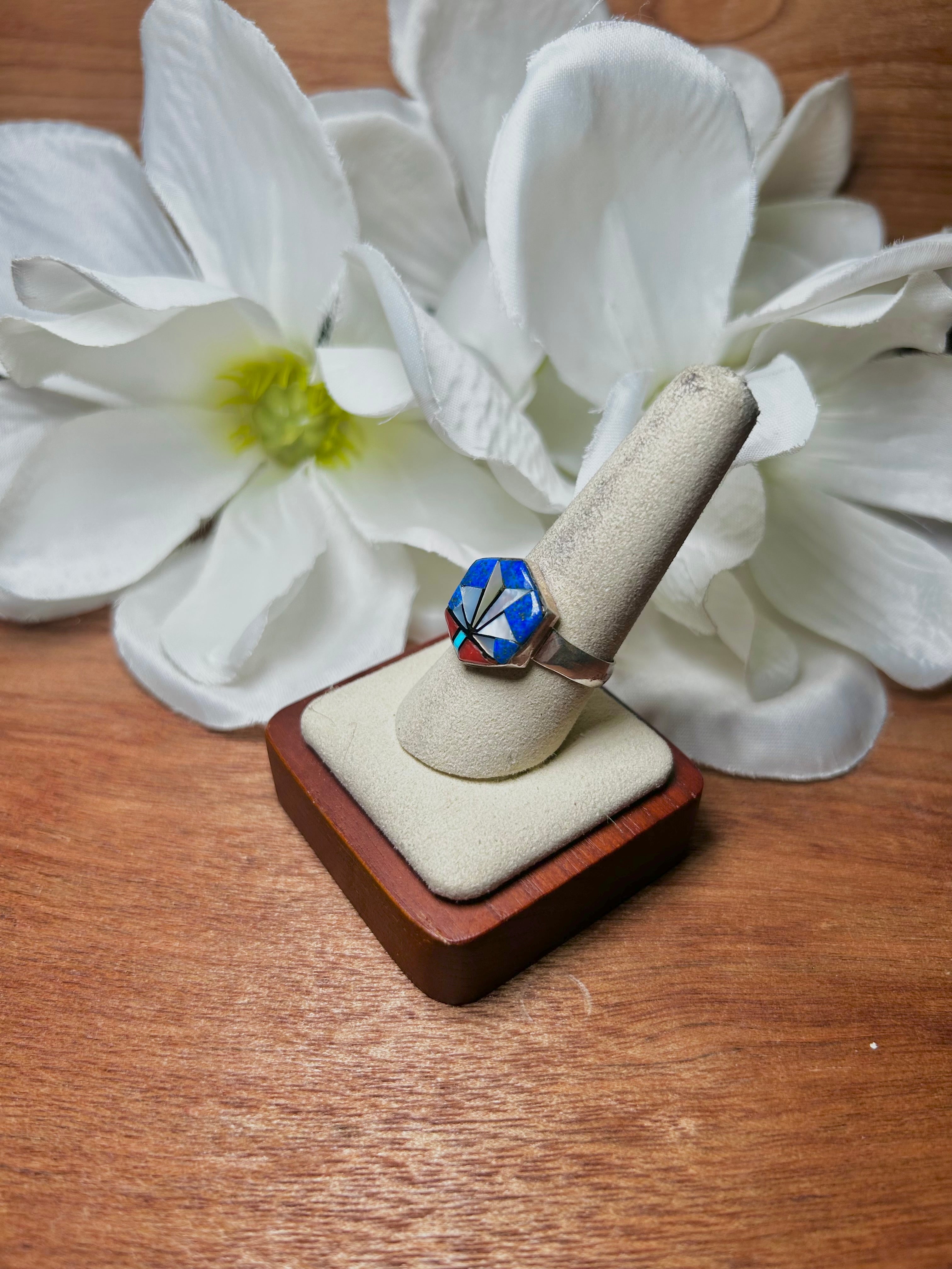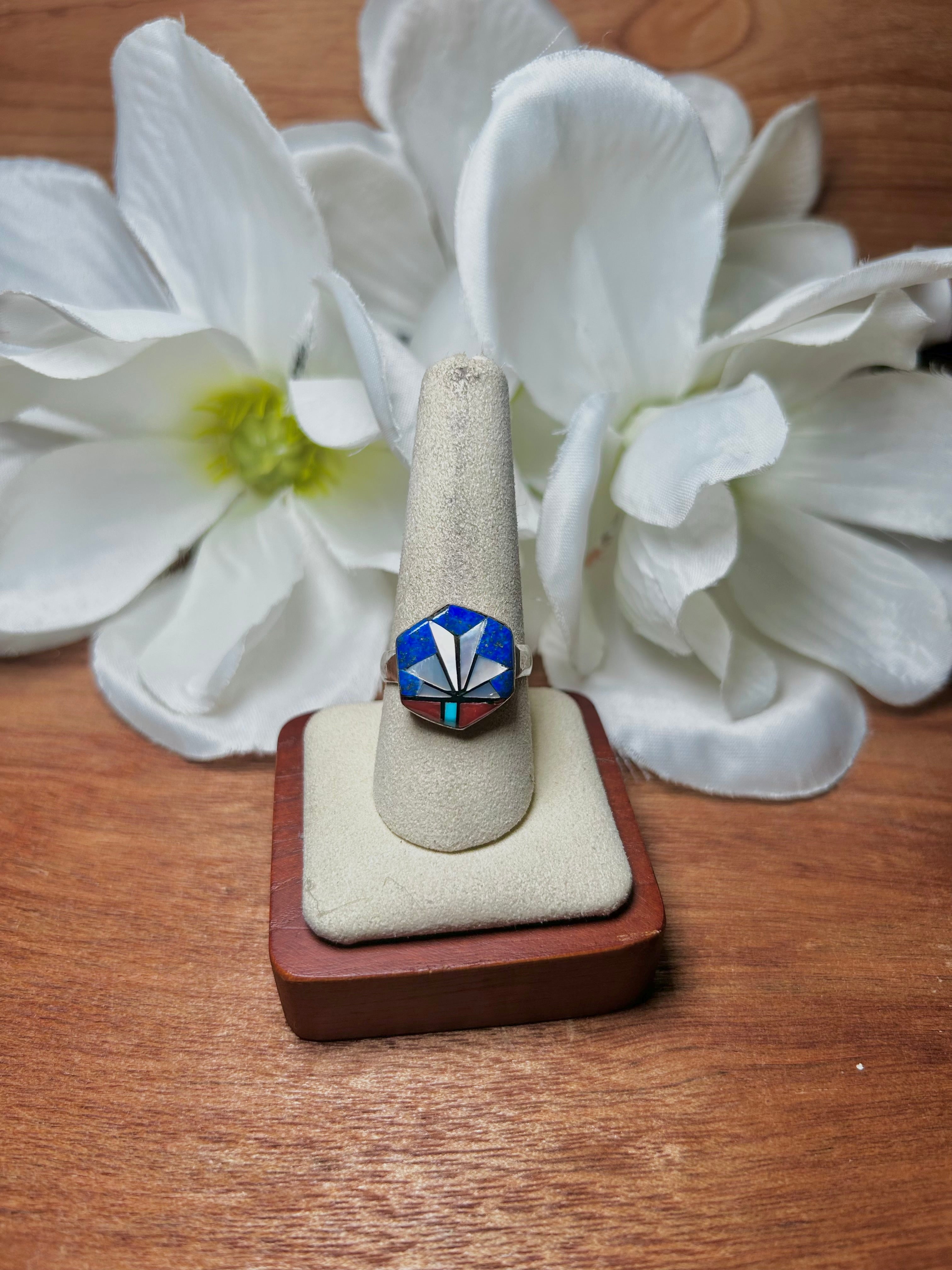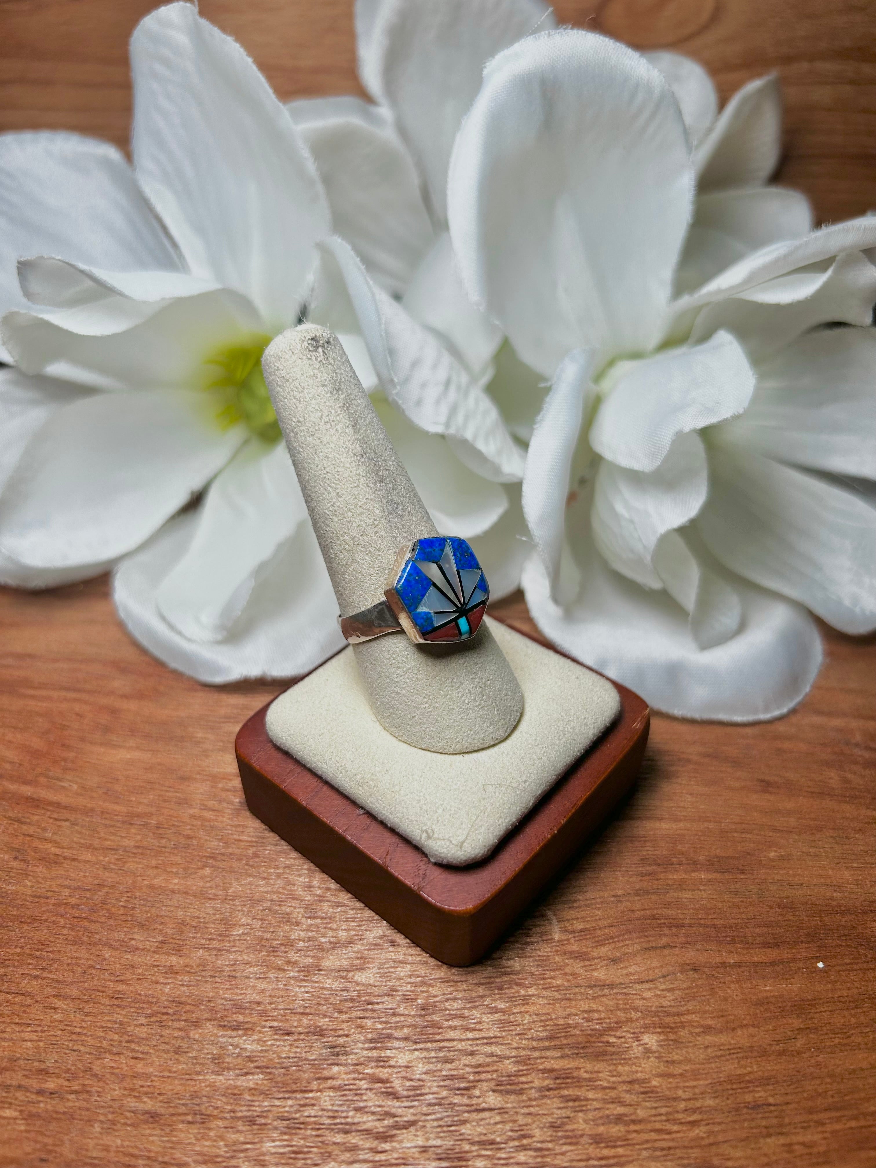 Zuni Multi Stone Inlay & Sterling Silver Ring Size 9.5