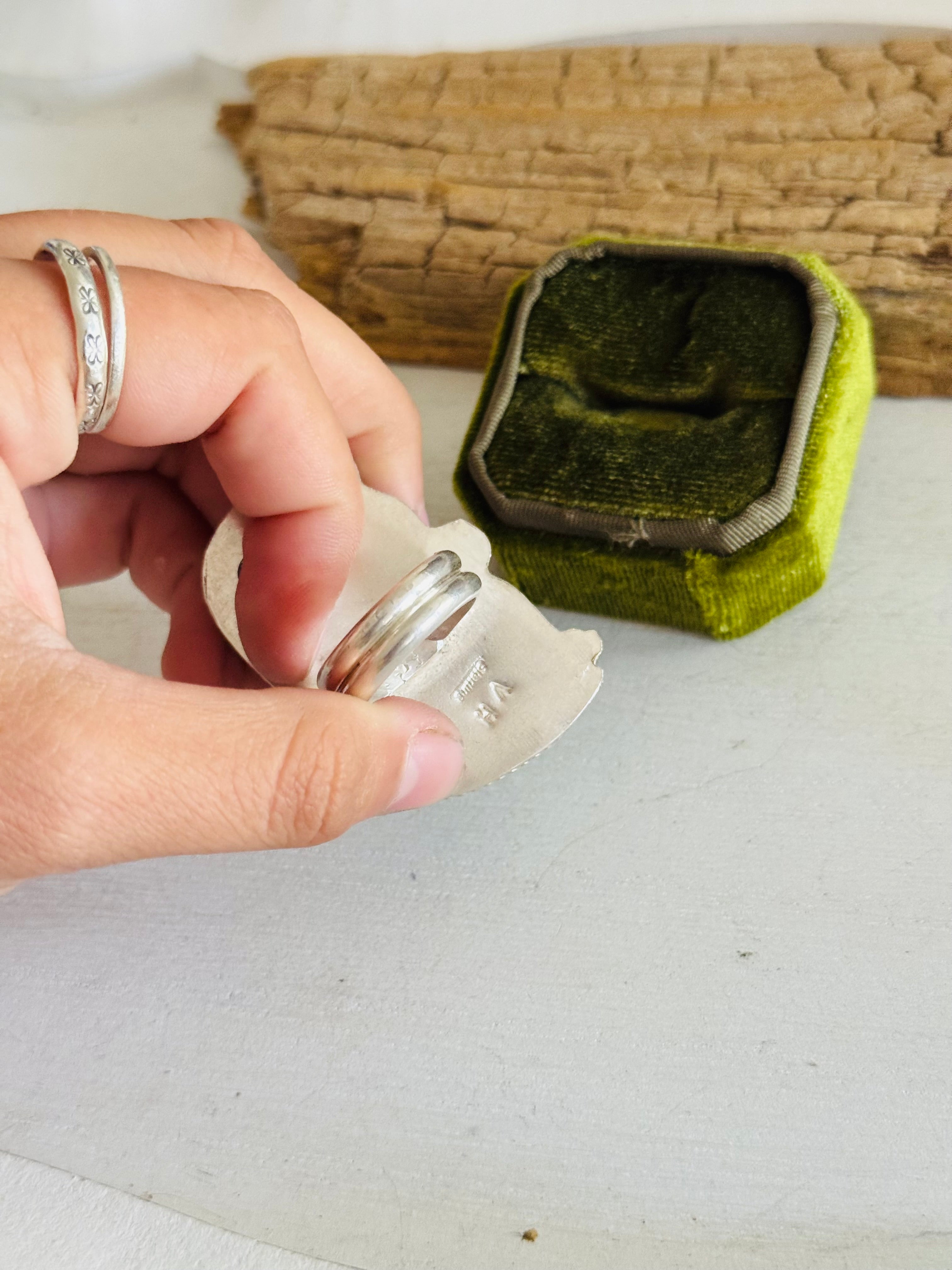 Navajo Made #8 Turquoise & Sterling Silver Adjustable Ring. It measures 2 inches long and 1 1/4 inches wide. Signed by the artist and stamped sterling silver.