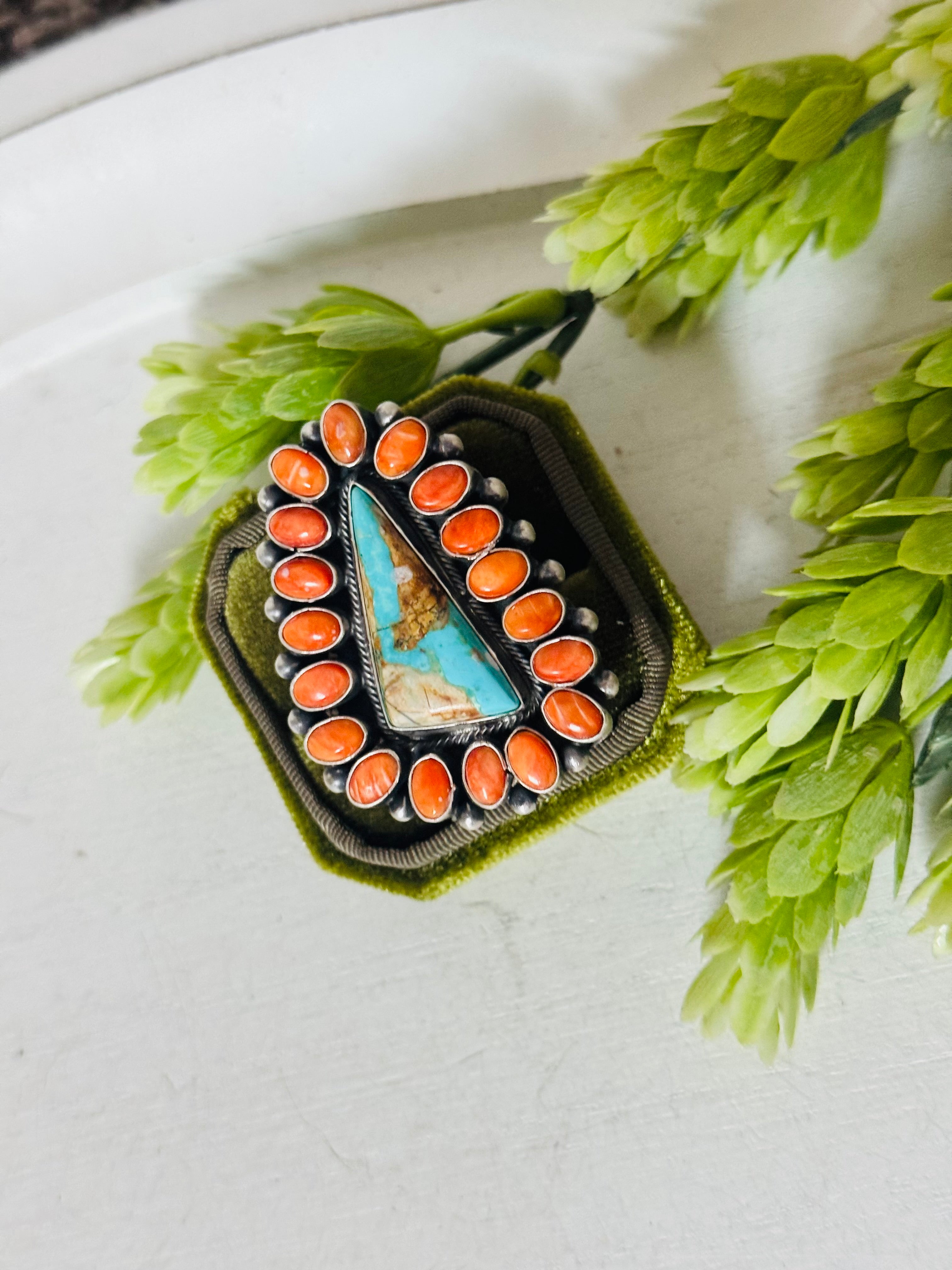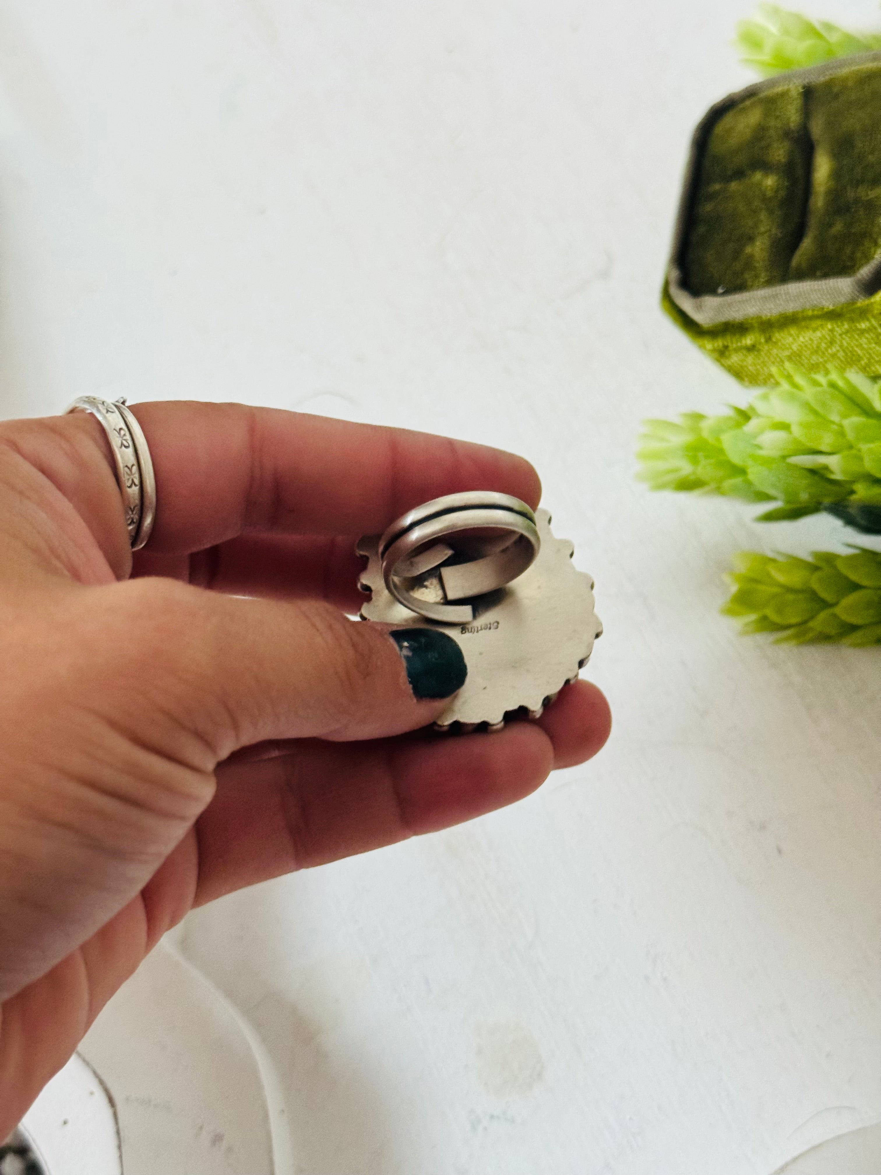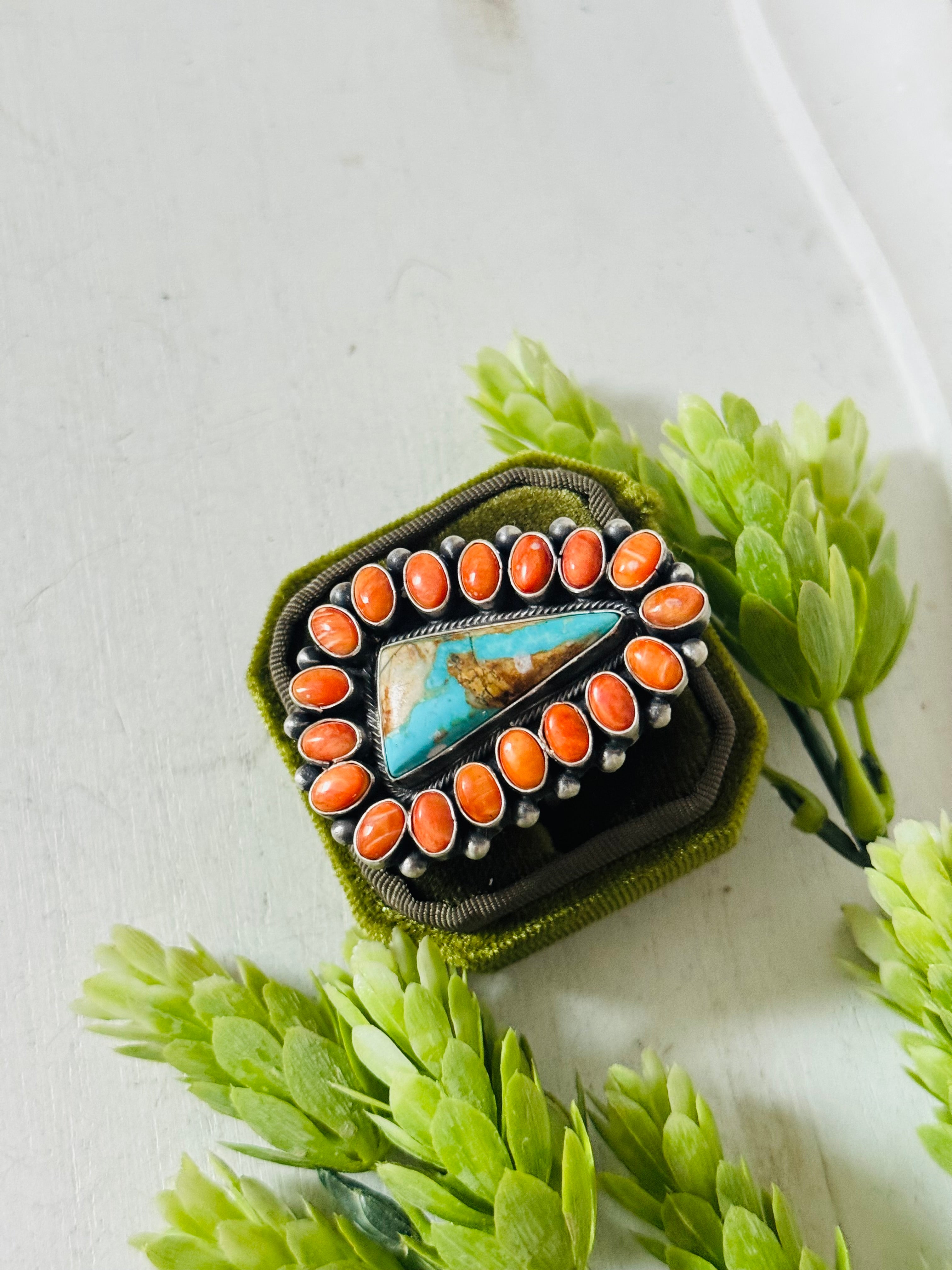 Navajo Made Multi Stone & Sterling Silver Adjustable Ring. It measures 1 7/8 inches long and 1 3/8 inches wide. Signed by the artist and stamped sterling silver.