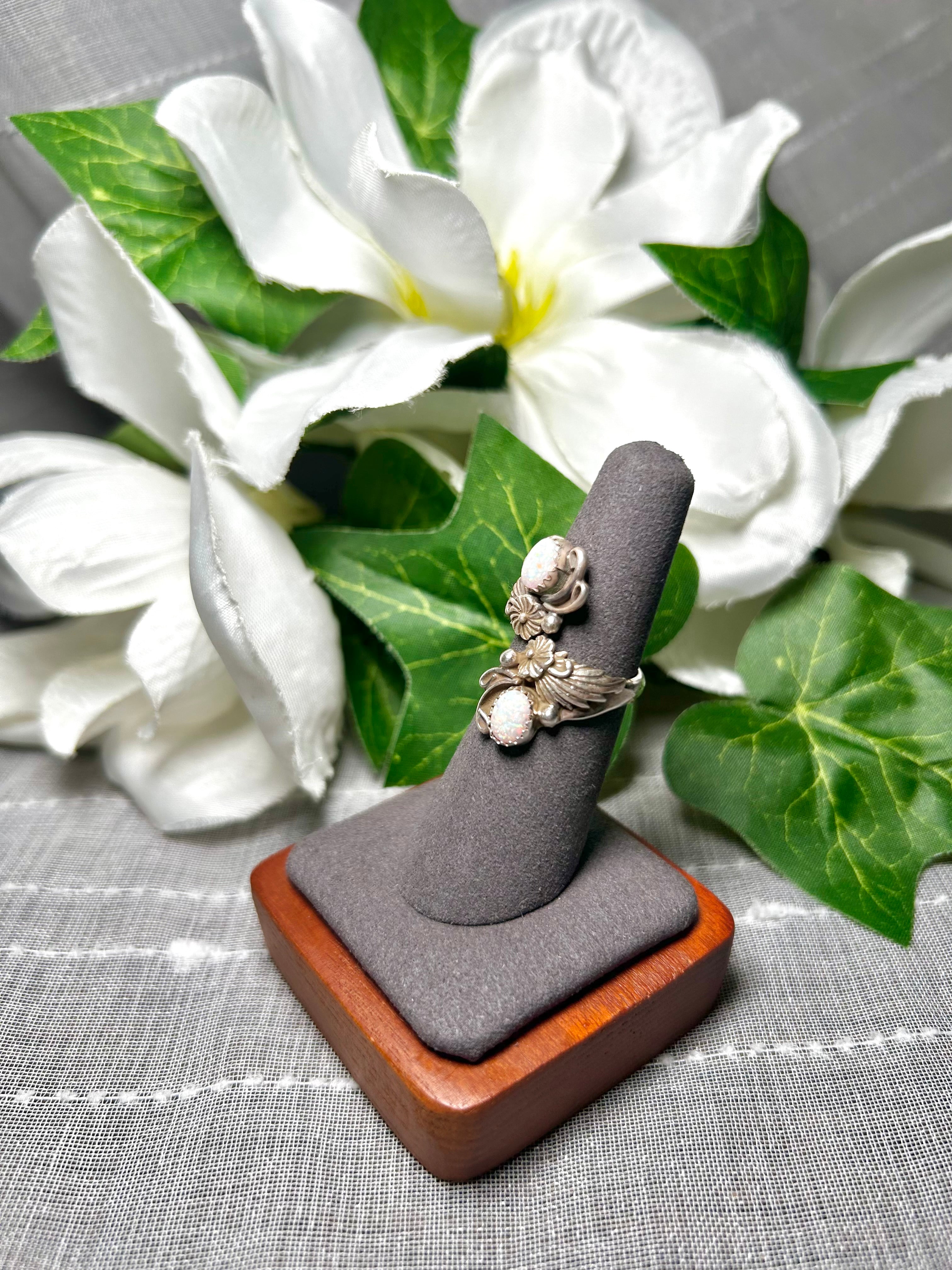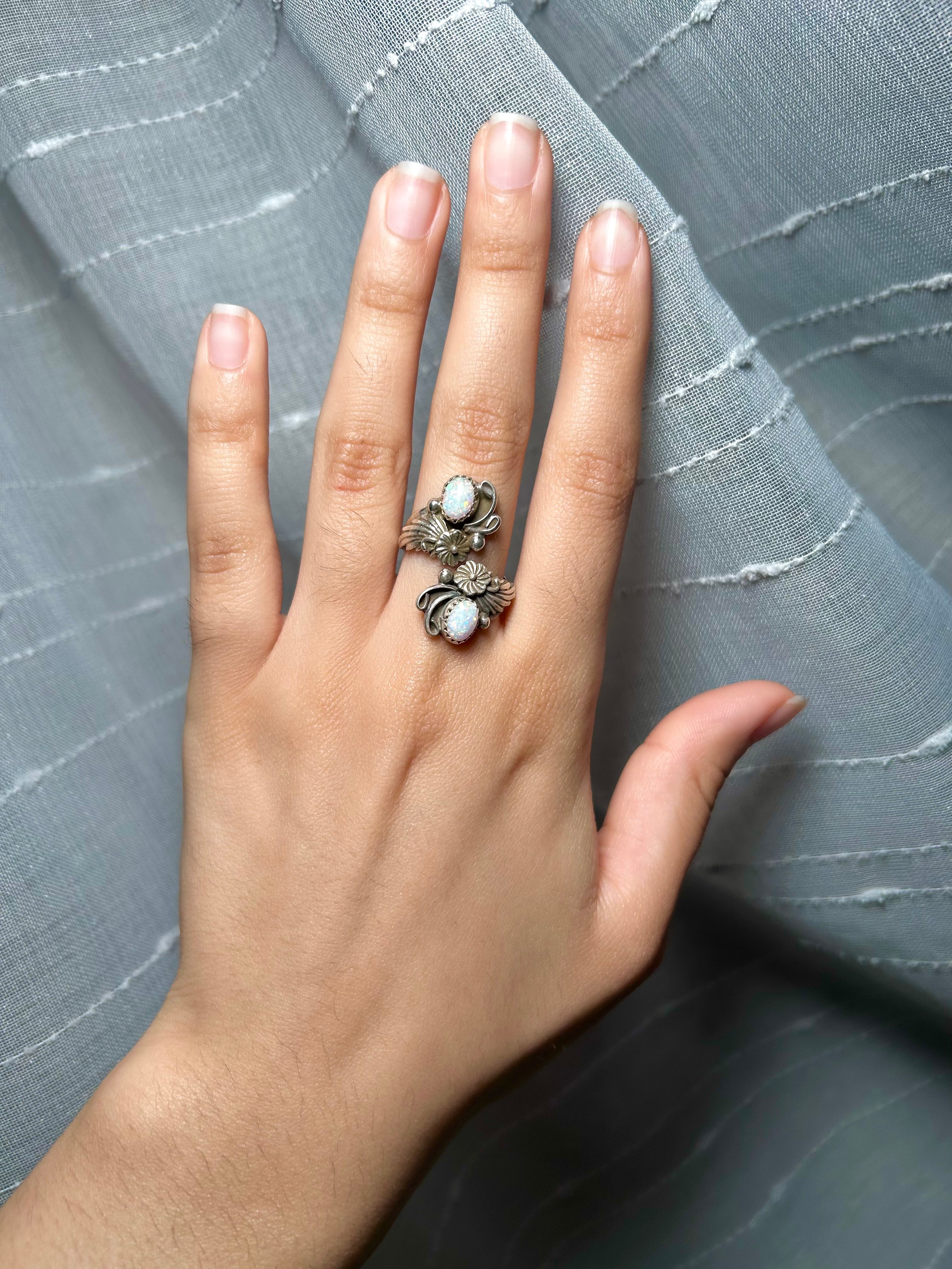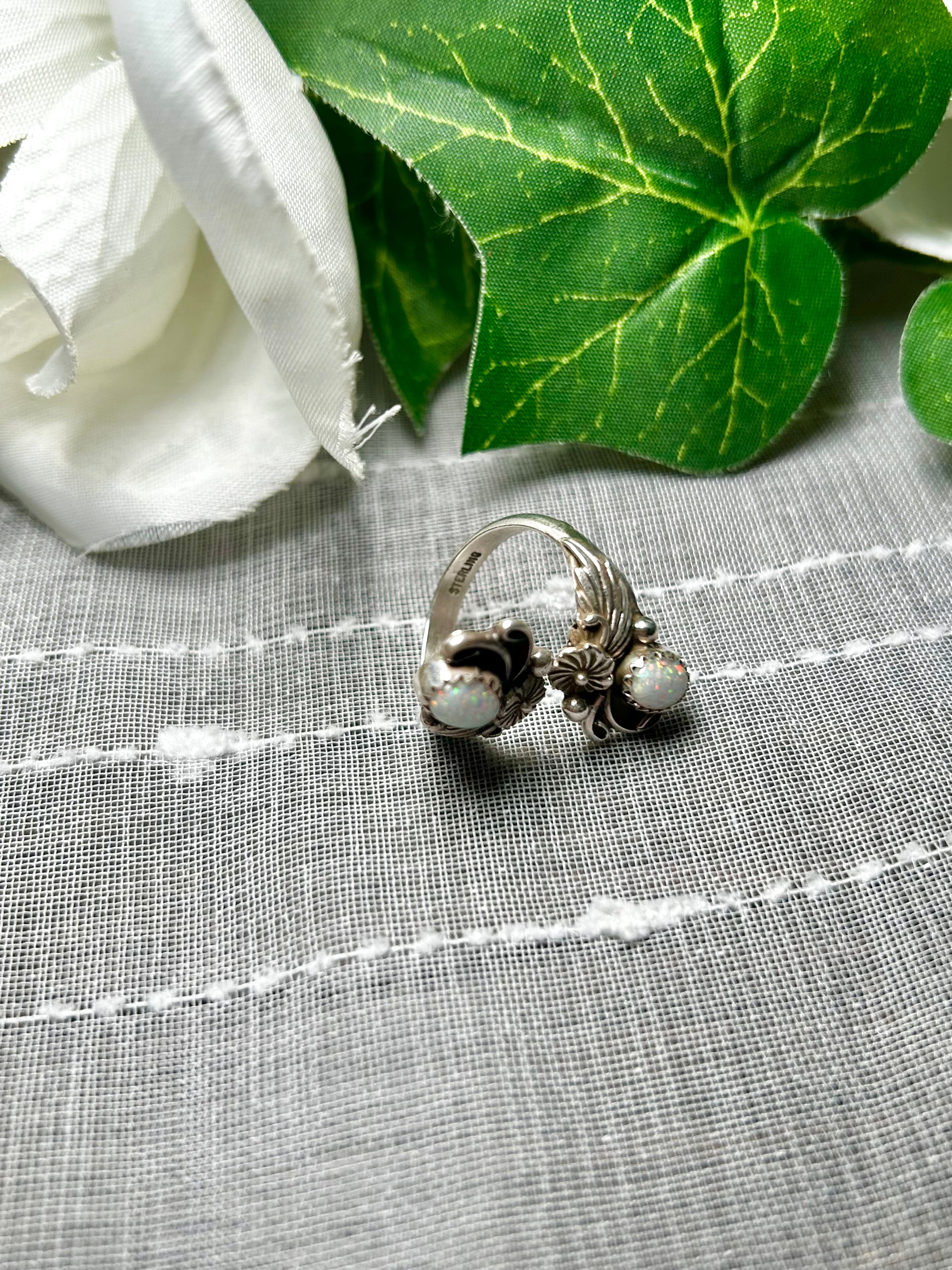 Navajo Made Opal & Sterling Silver Adjustable Ring. It measures 1 1/8 inches long and 7/8 of an inch wide. Signed by the artist and stamped sterling silver.