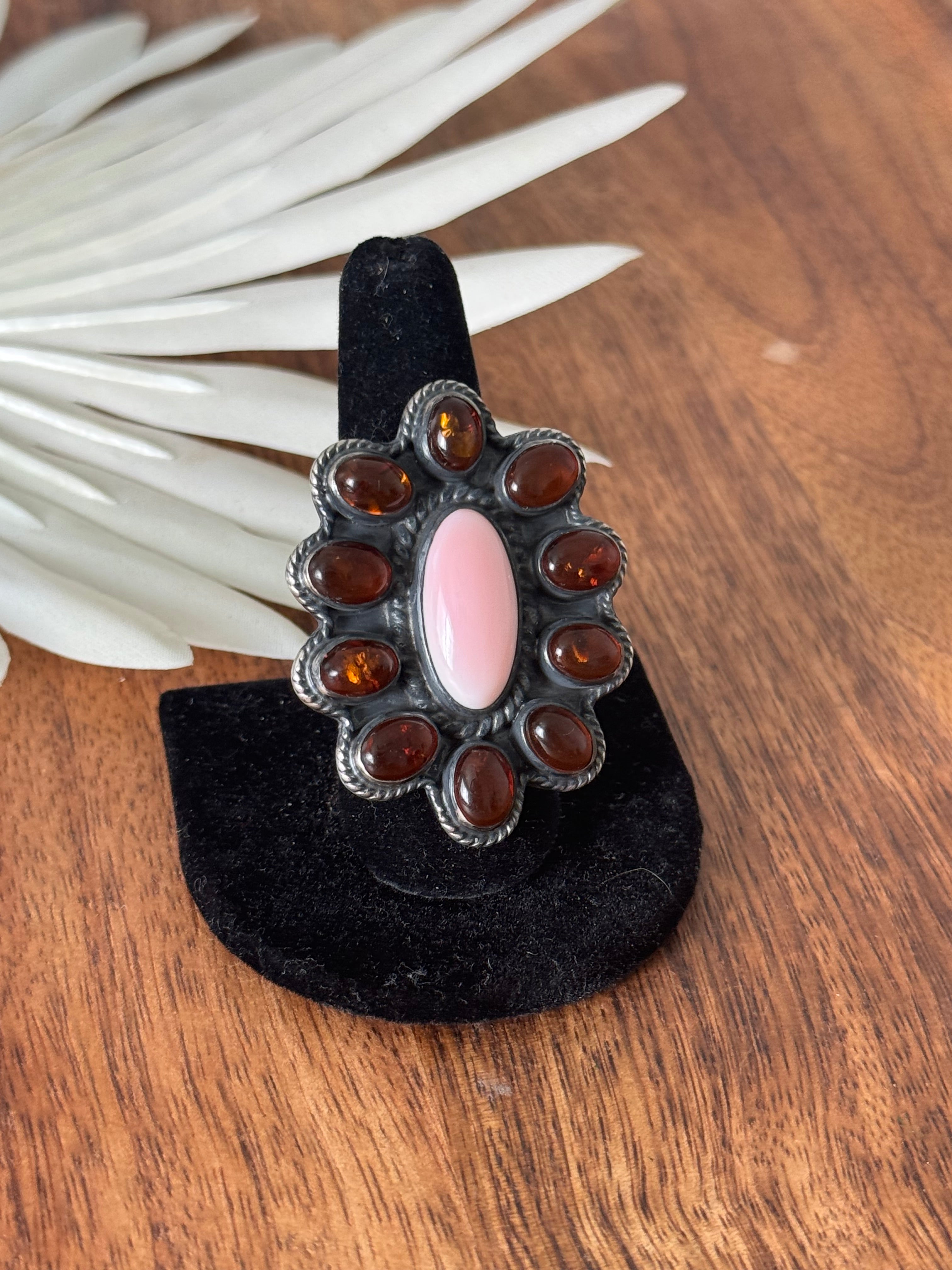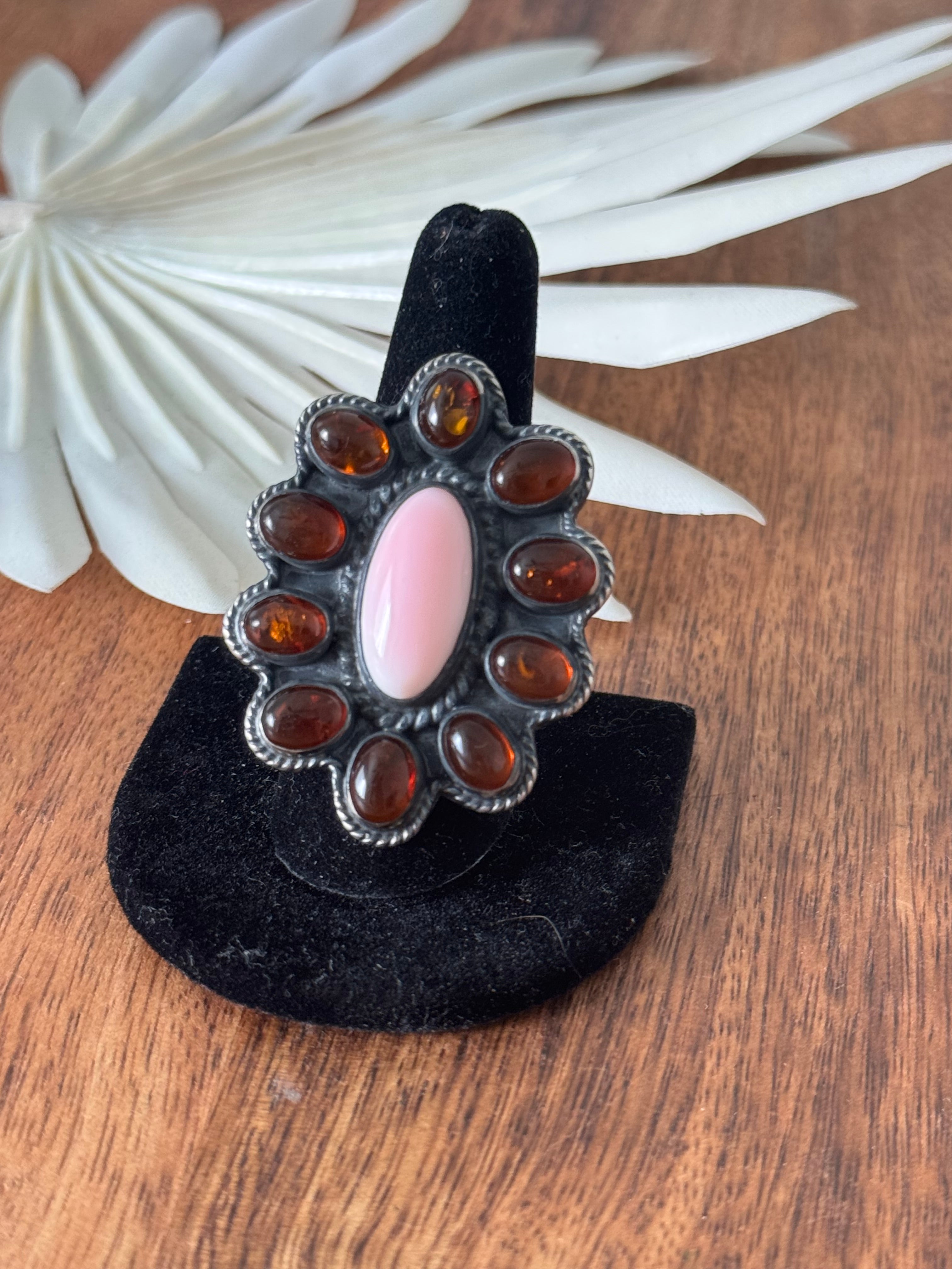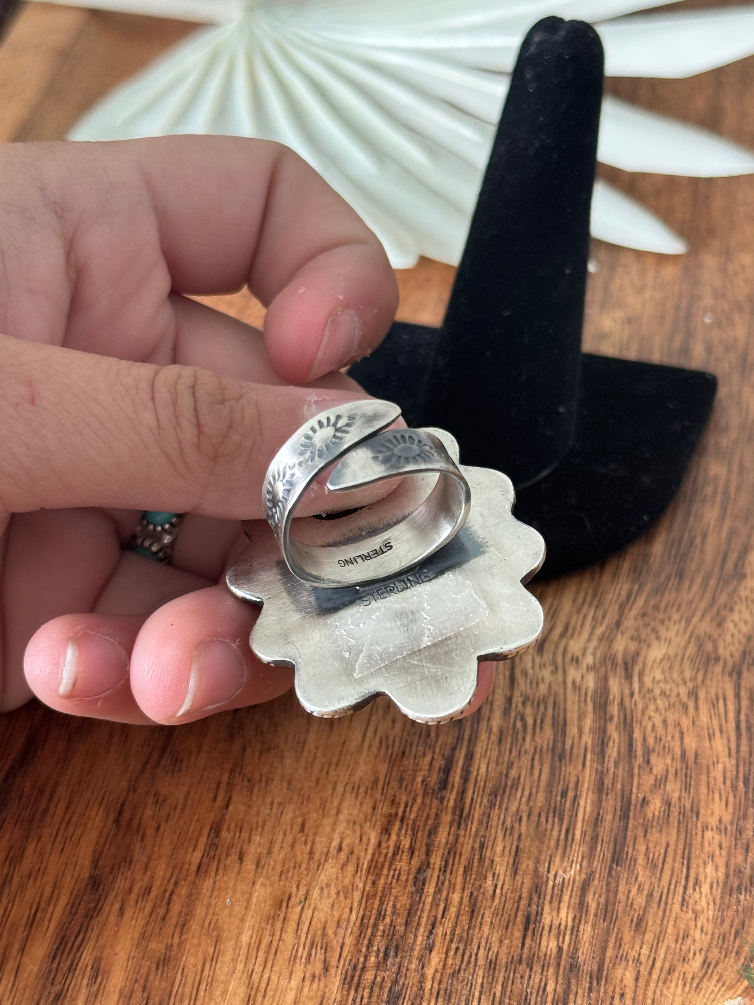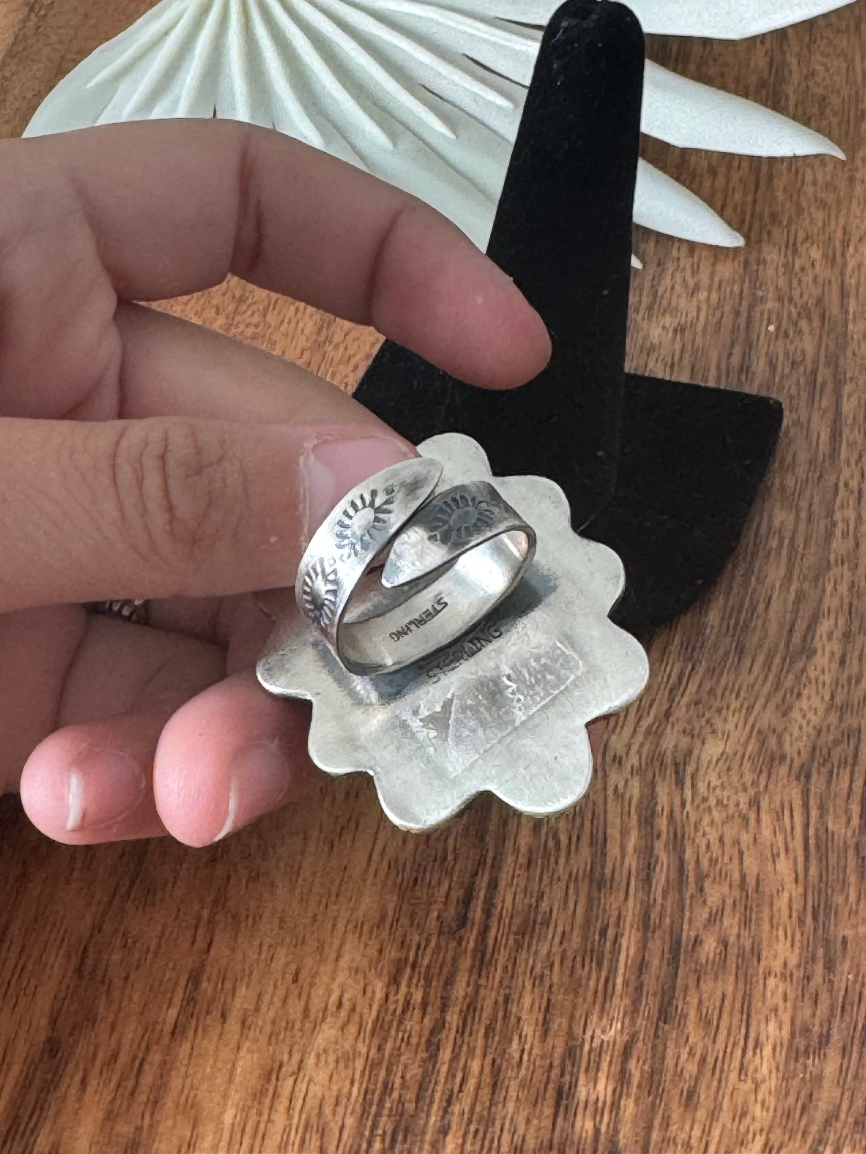 Beautiful ring. Navajo Made Multi Stone & Sterling Silver Adjustable Ring. It measures 1 3/4 inches long and 1 3/8 inches wide. Stamped sterling silver and signed. Stones will differ due to natural stones.
