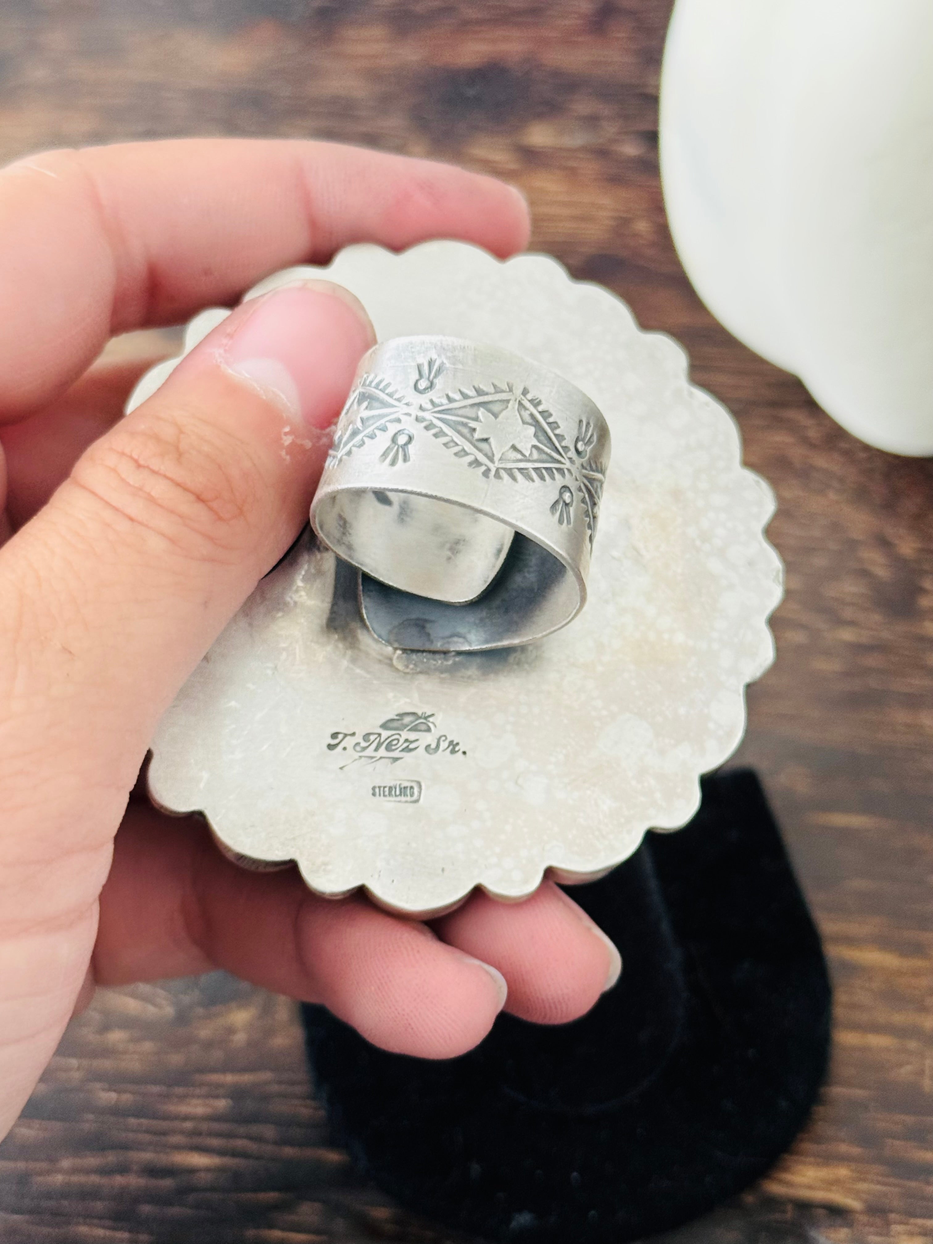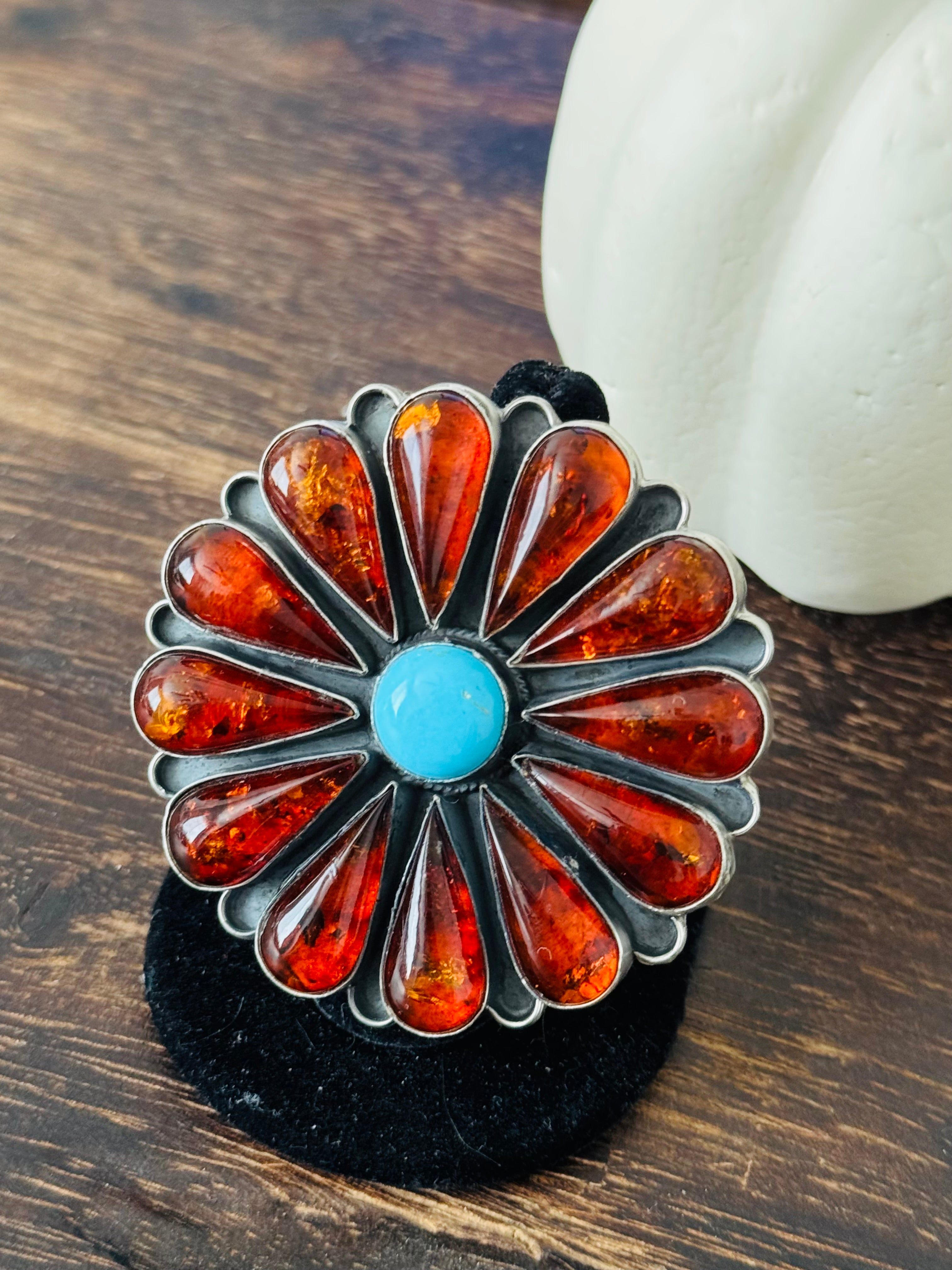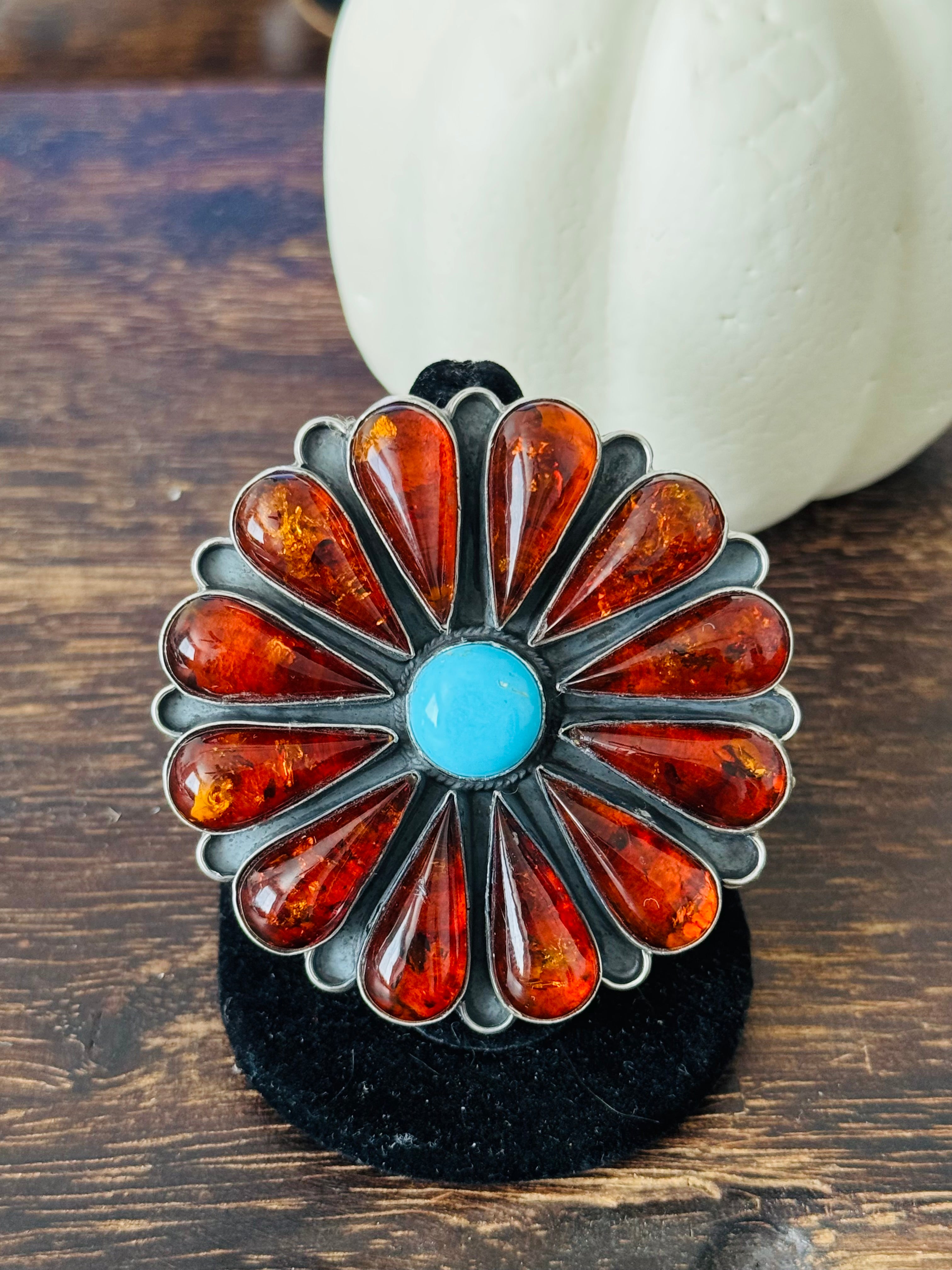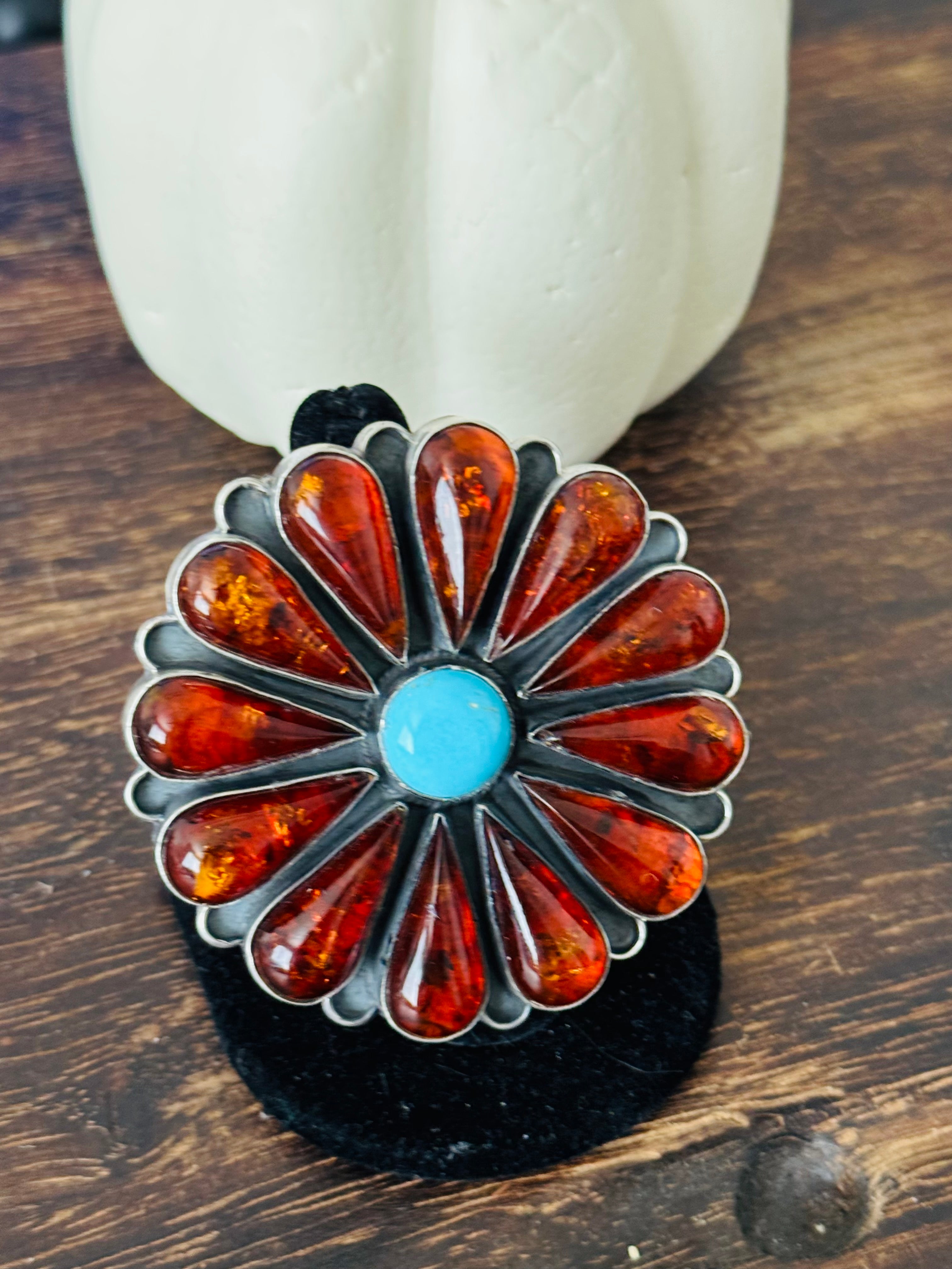 Beautiful ring. Navajo Made Multi Stone & Sterling Silver Adjustable Ring. It measures 2 3/8 inches round. Stamped sterling silver and signed.