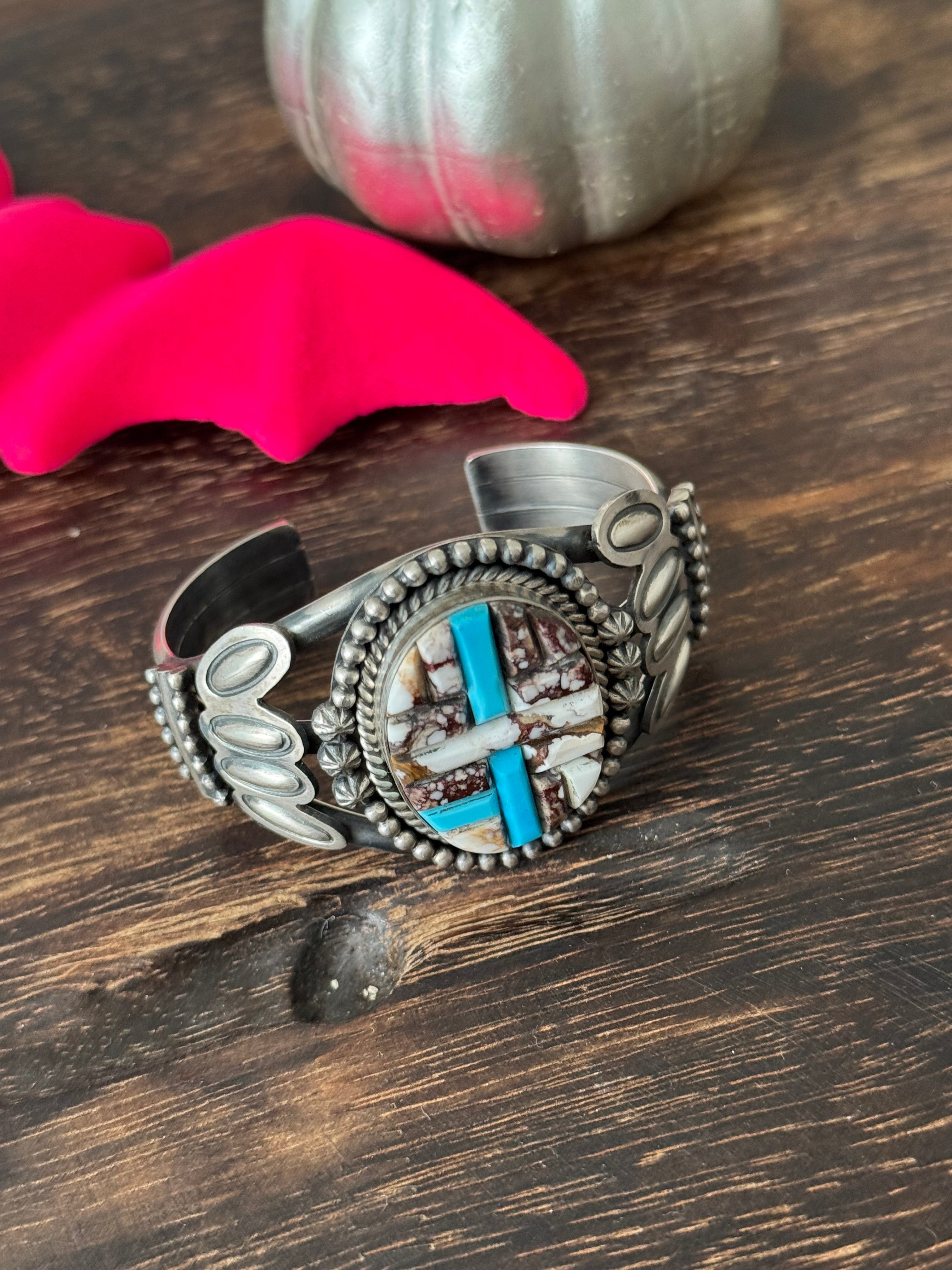 Navajo Made Multi Stone & Sterling Silver Cobblestone Cuff Bracelet. It measures 1 1/2 inches wide with an inside circumference of 5 1/2 inches and a gap of 7/8 of an inch. Signed by the artist and stamped sterling silver.