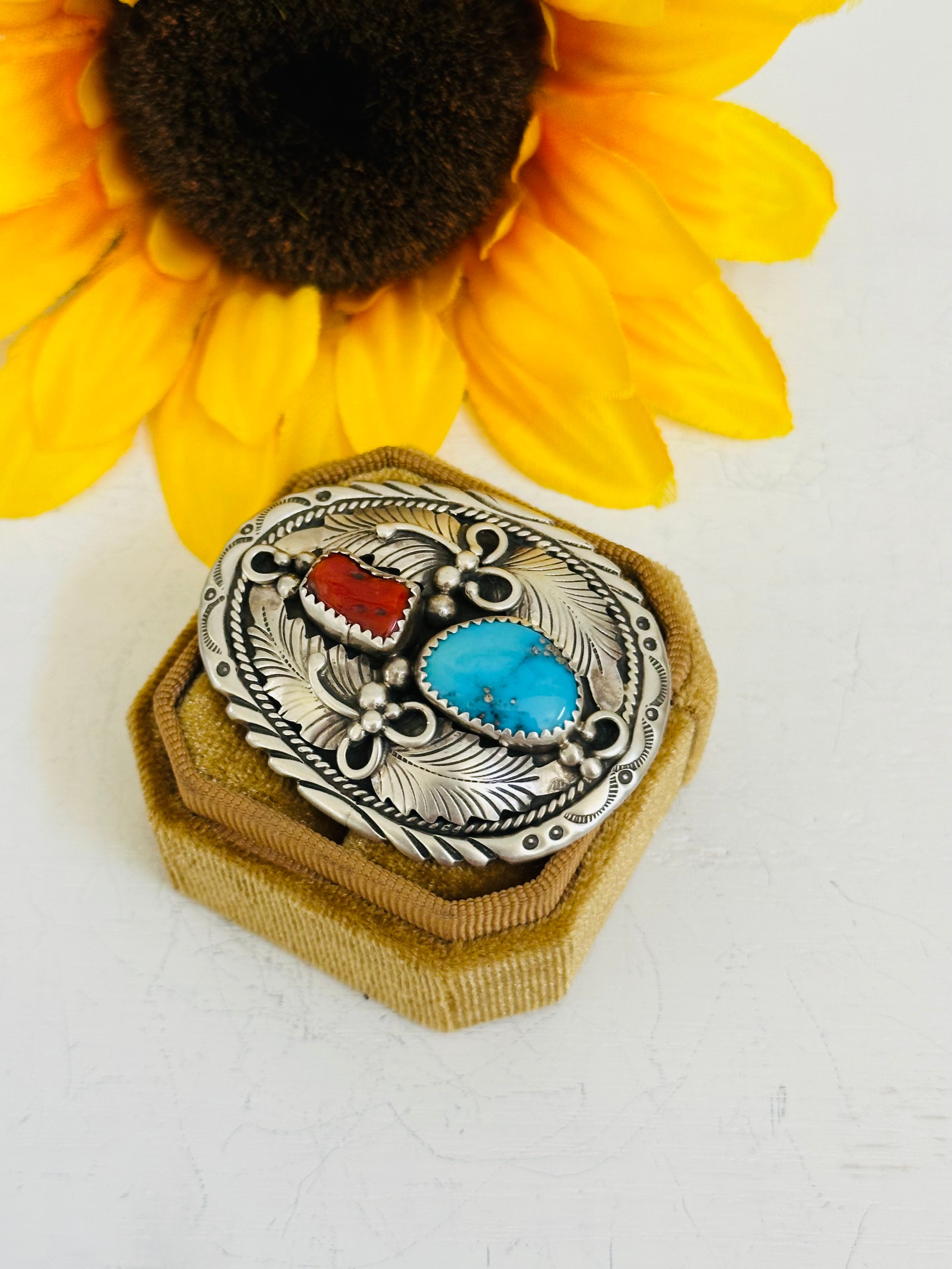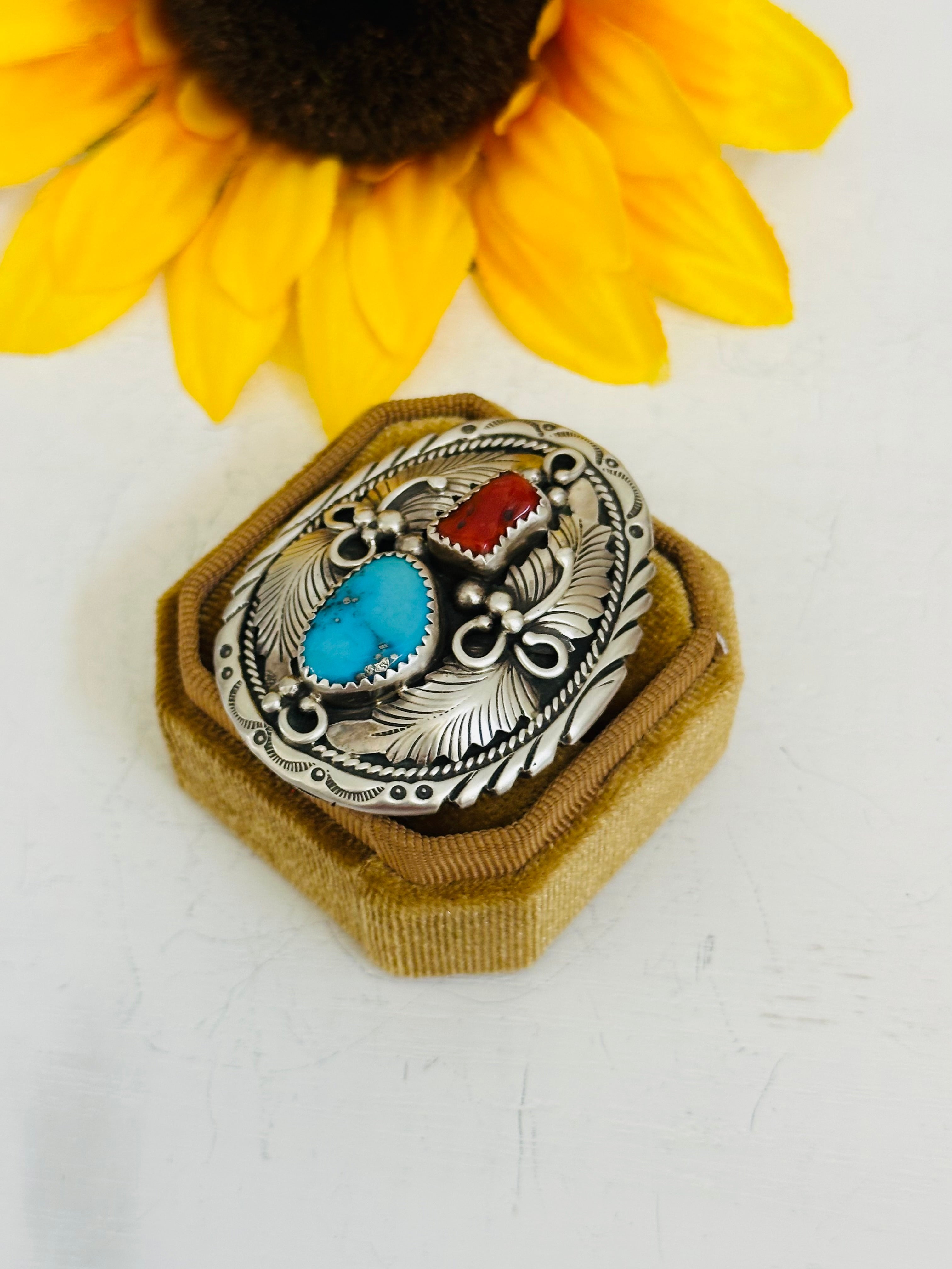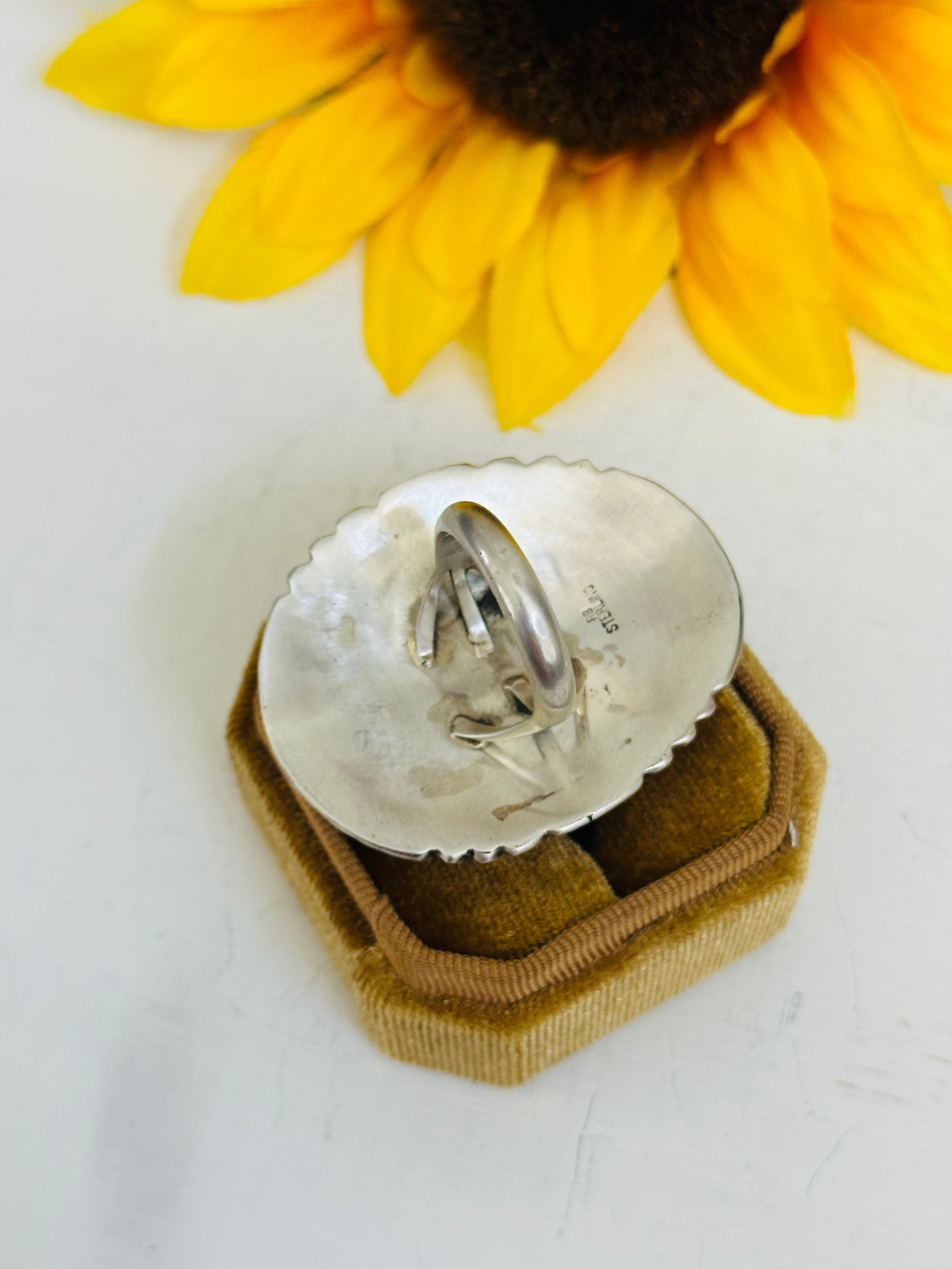 Navajo Made Multi Stone & Sterling Silver Ring Size 6.75. It measures 1 7/8 inches long and 1 5/8 inches wide. Signed by the artist and stamped sterling silver.