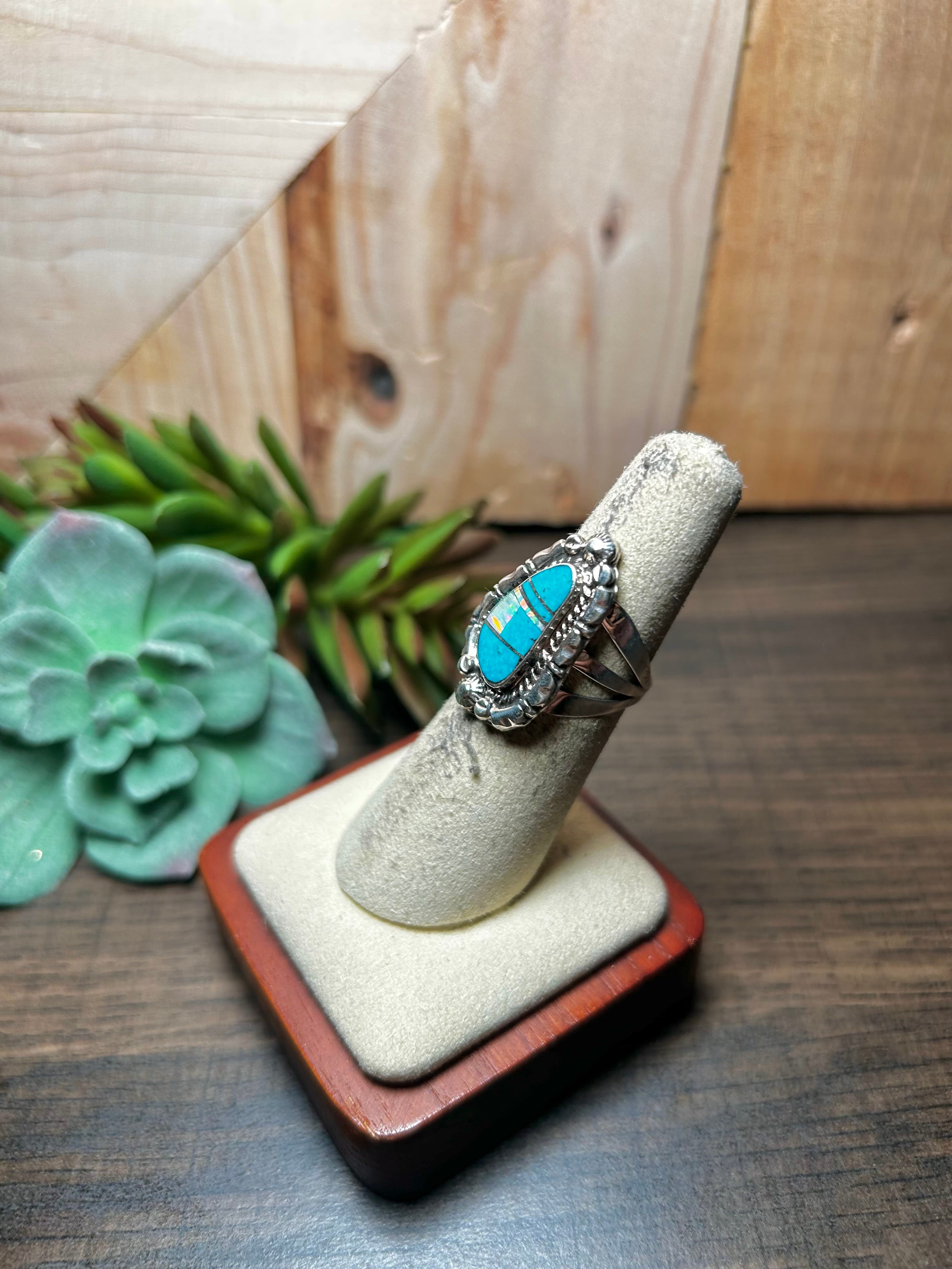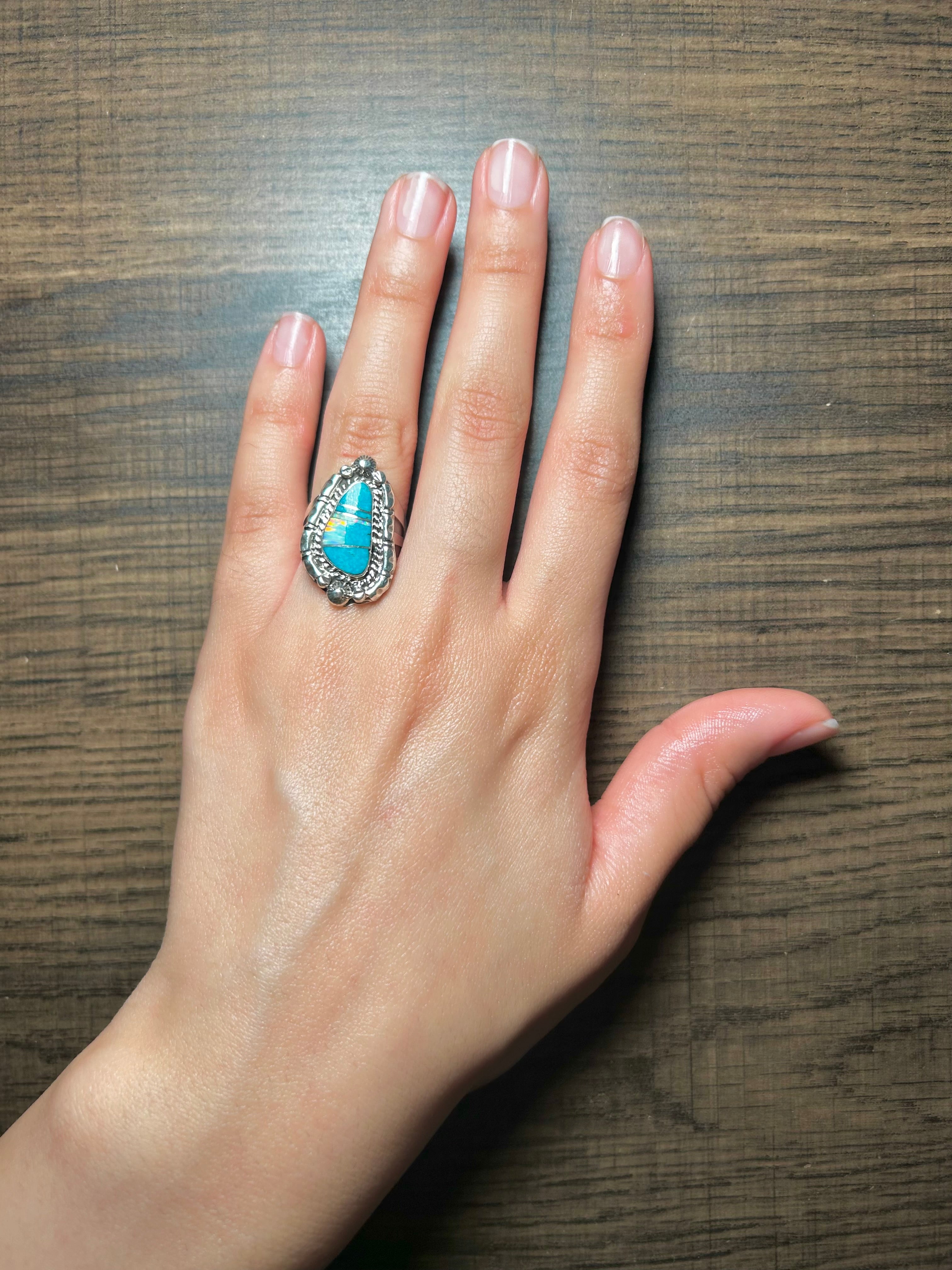 James Mannygoats Multi Stone & Sterling Silver Ring Size 5.5. It measures 1 inch long and 5/8 of an inch wide.