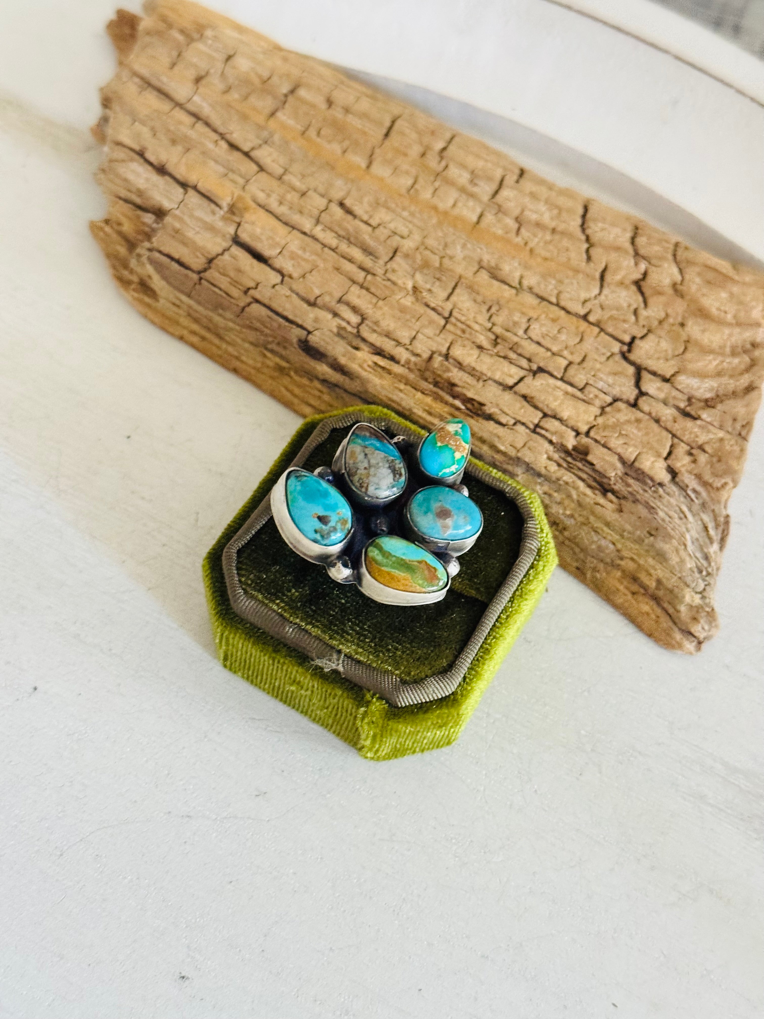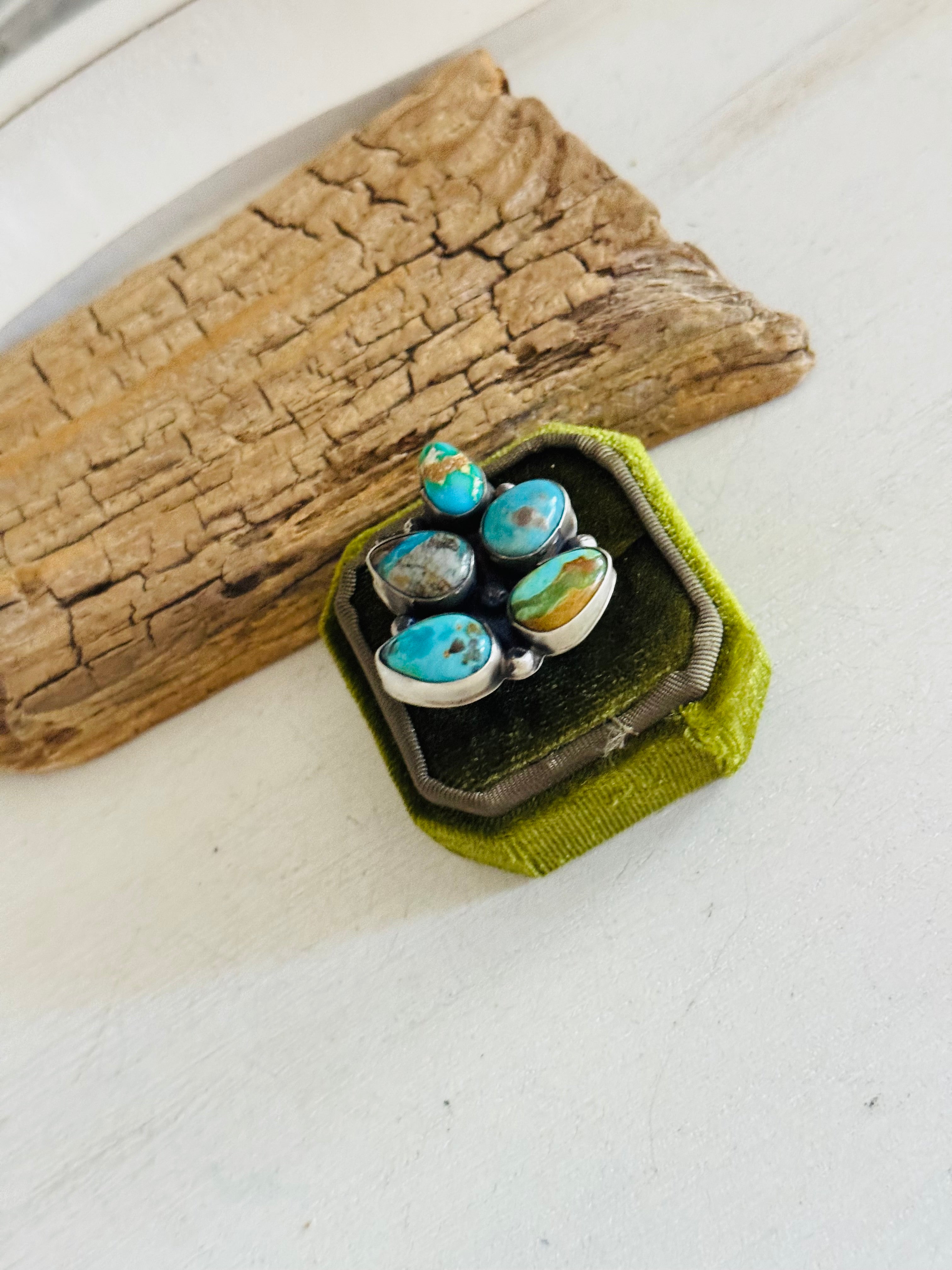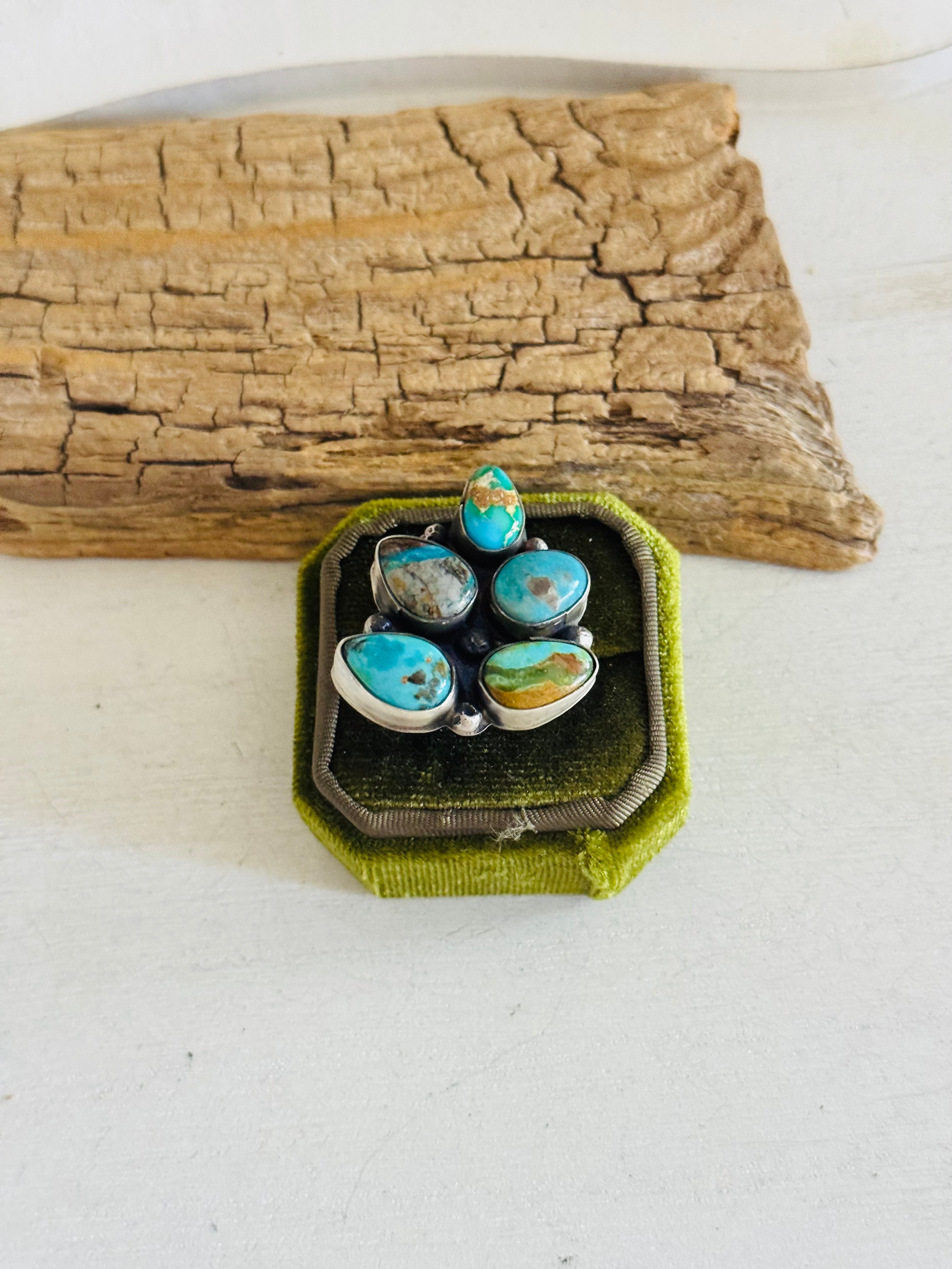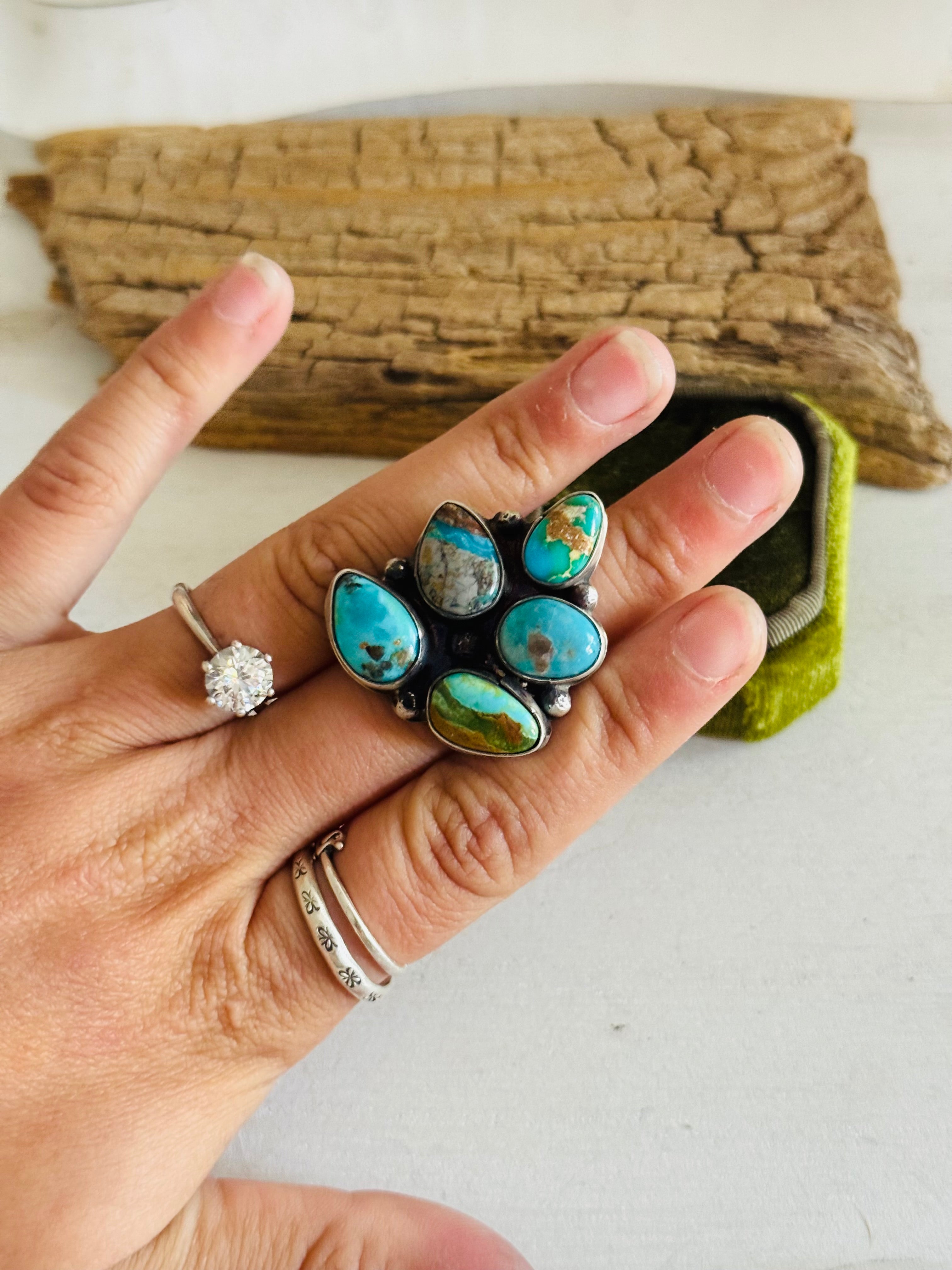 Navajo Made Multi Turquoise & Sterling Silver Adjustable Cluster Ring