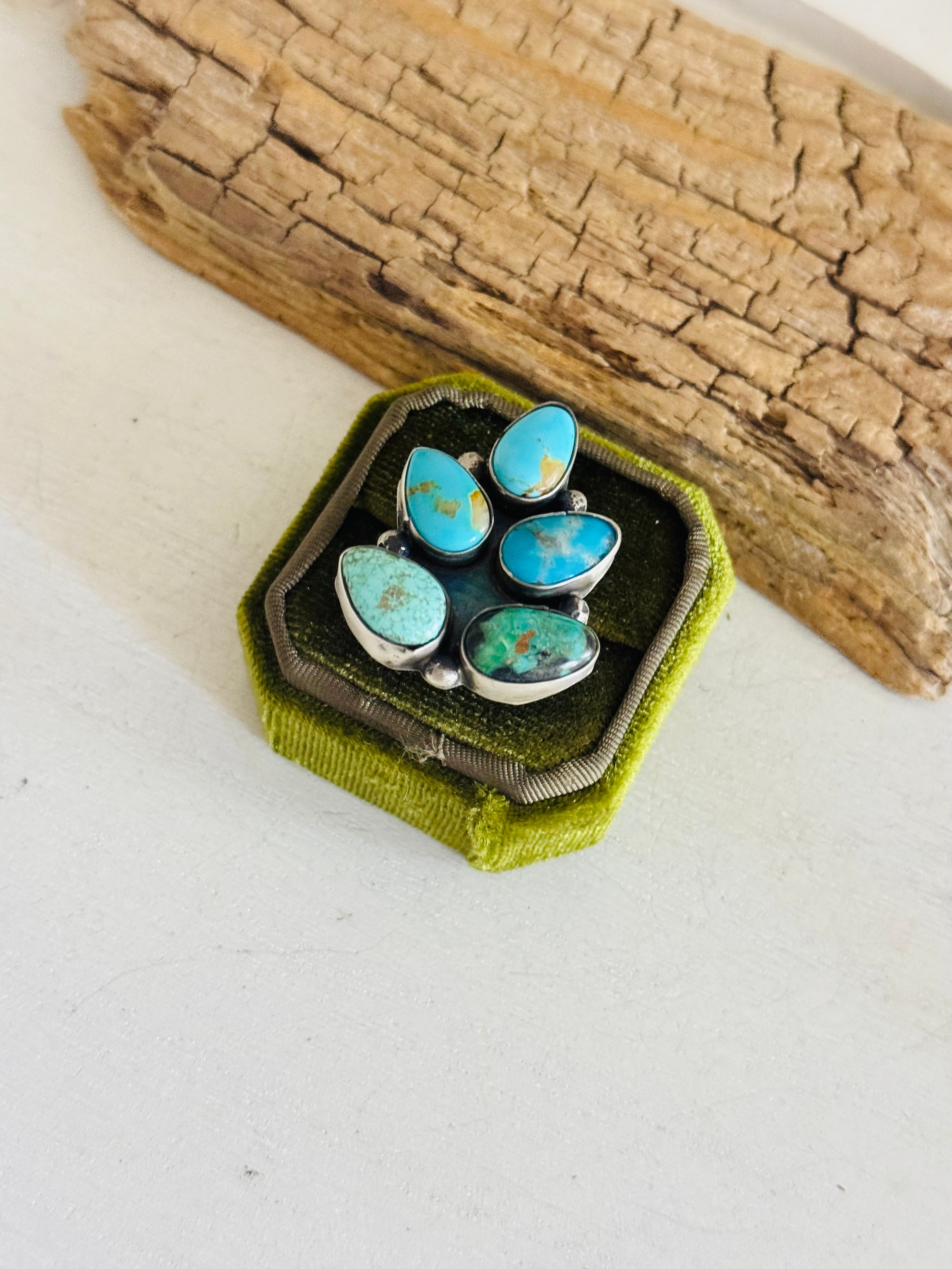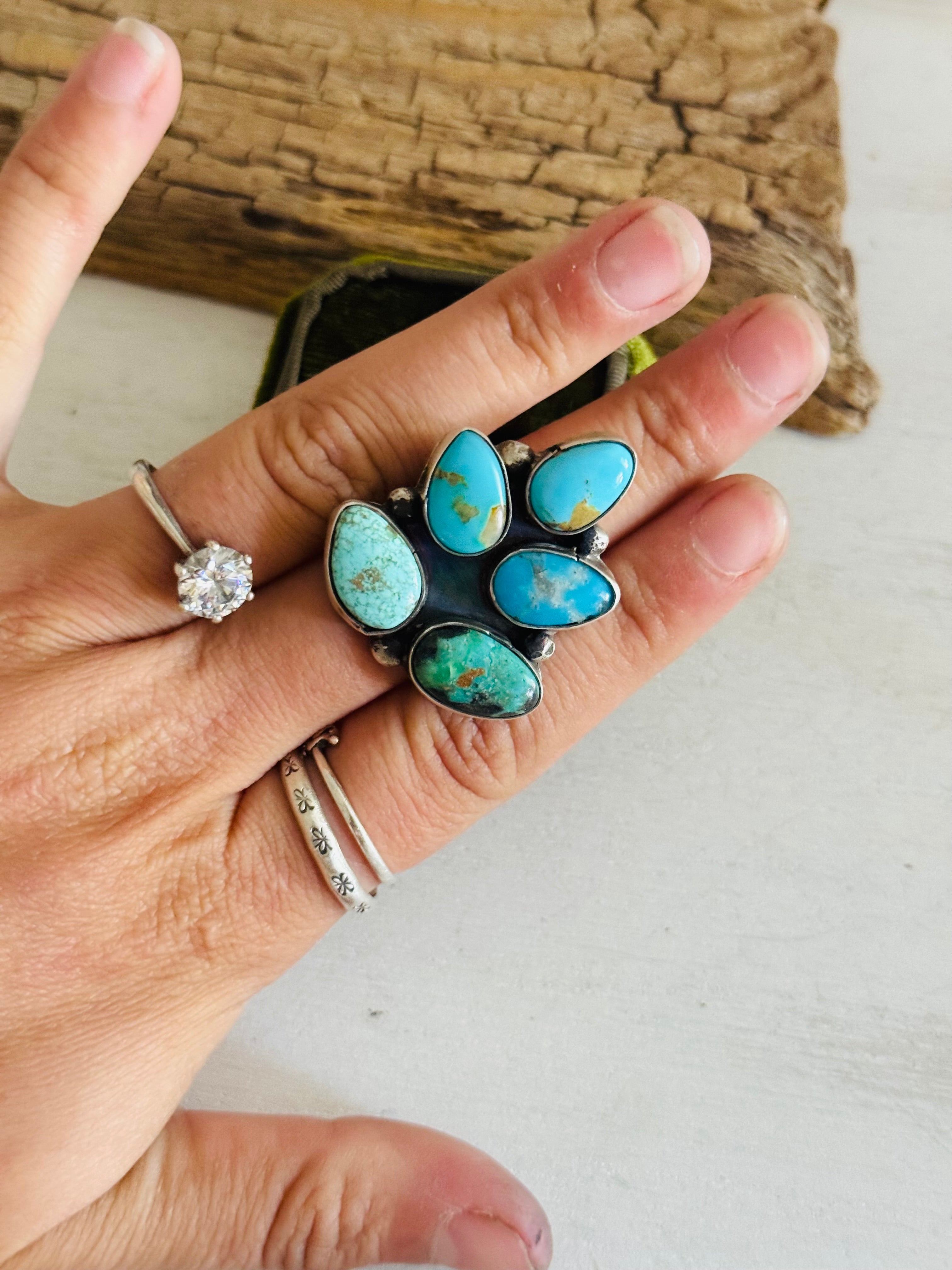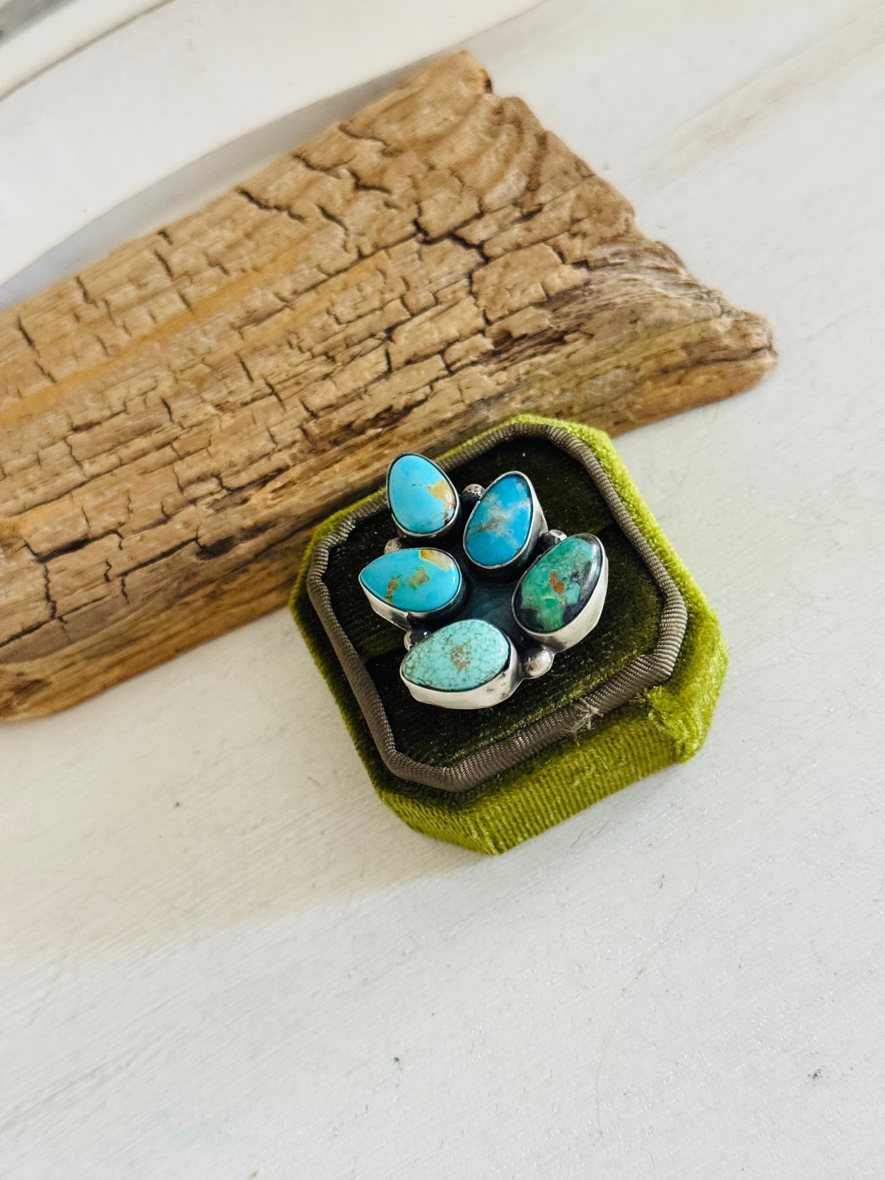 Navajo Made Multi Turquoise & Sterling Silver Adjustable Cluster Ring