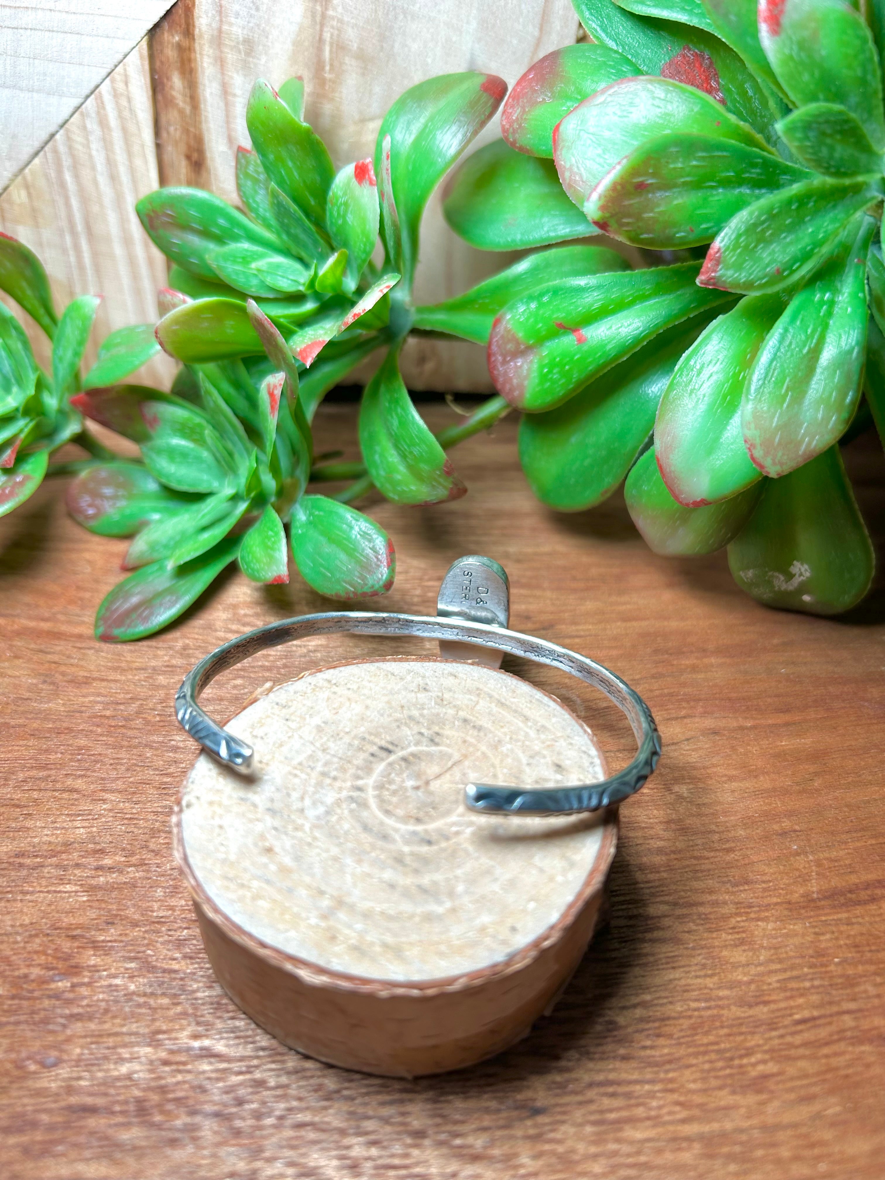 Navajo Made New Lander Varicsite & Sterling Silver Cuff Bracelet. It measures 7/8 of an inch wide with an inside circumference of 5 1/4 inches and a gap of 1 1/8 inches. Signed by artist and stamped sterling silver.