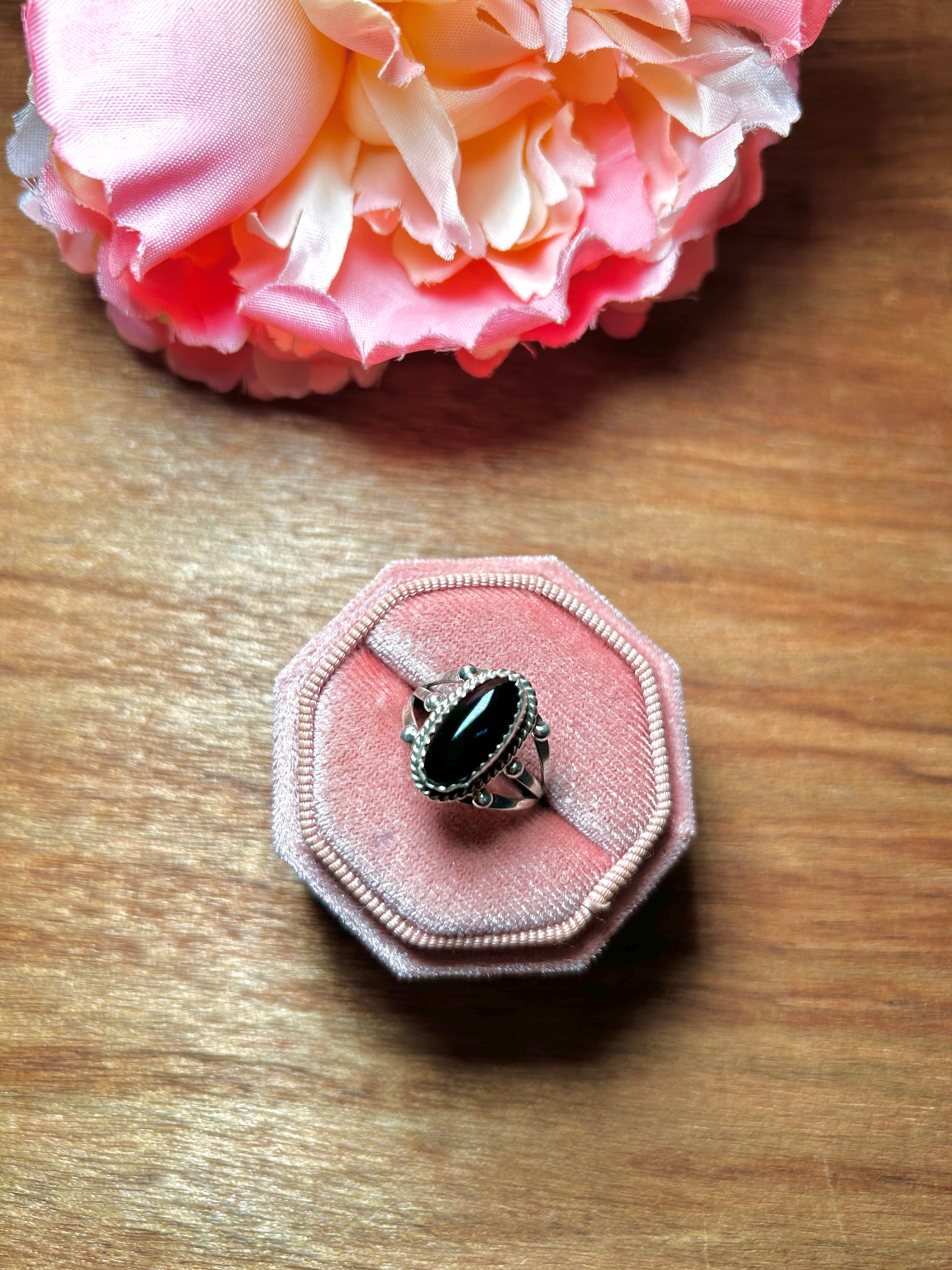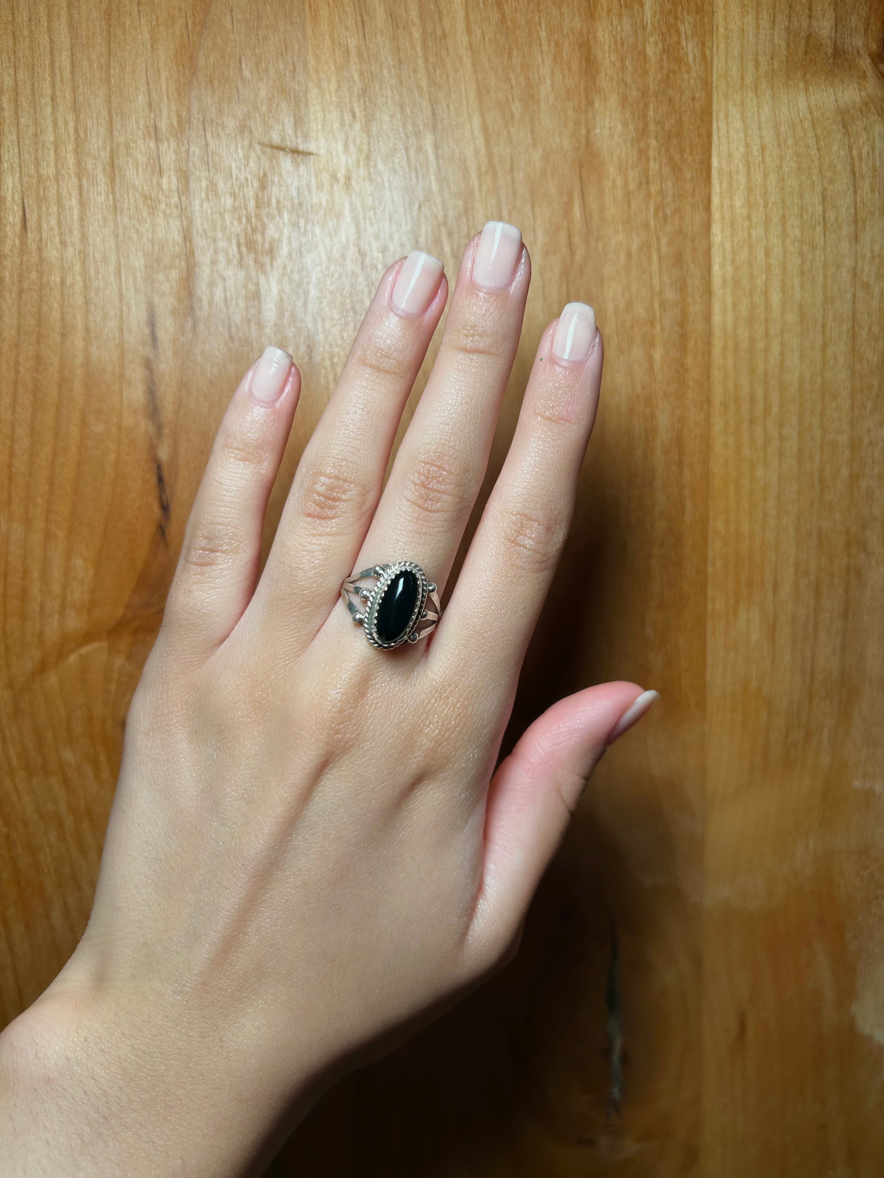 Navajo Made Onyx & Sterling Silver Ring. It measures 3/4 of an inch long and 1/2 of an inch wide. Stamped sterling silver and signed. Stones will vary due to natural stones.