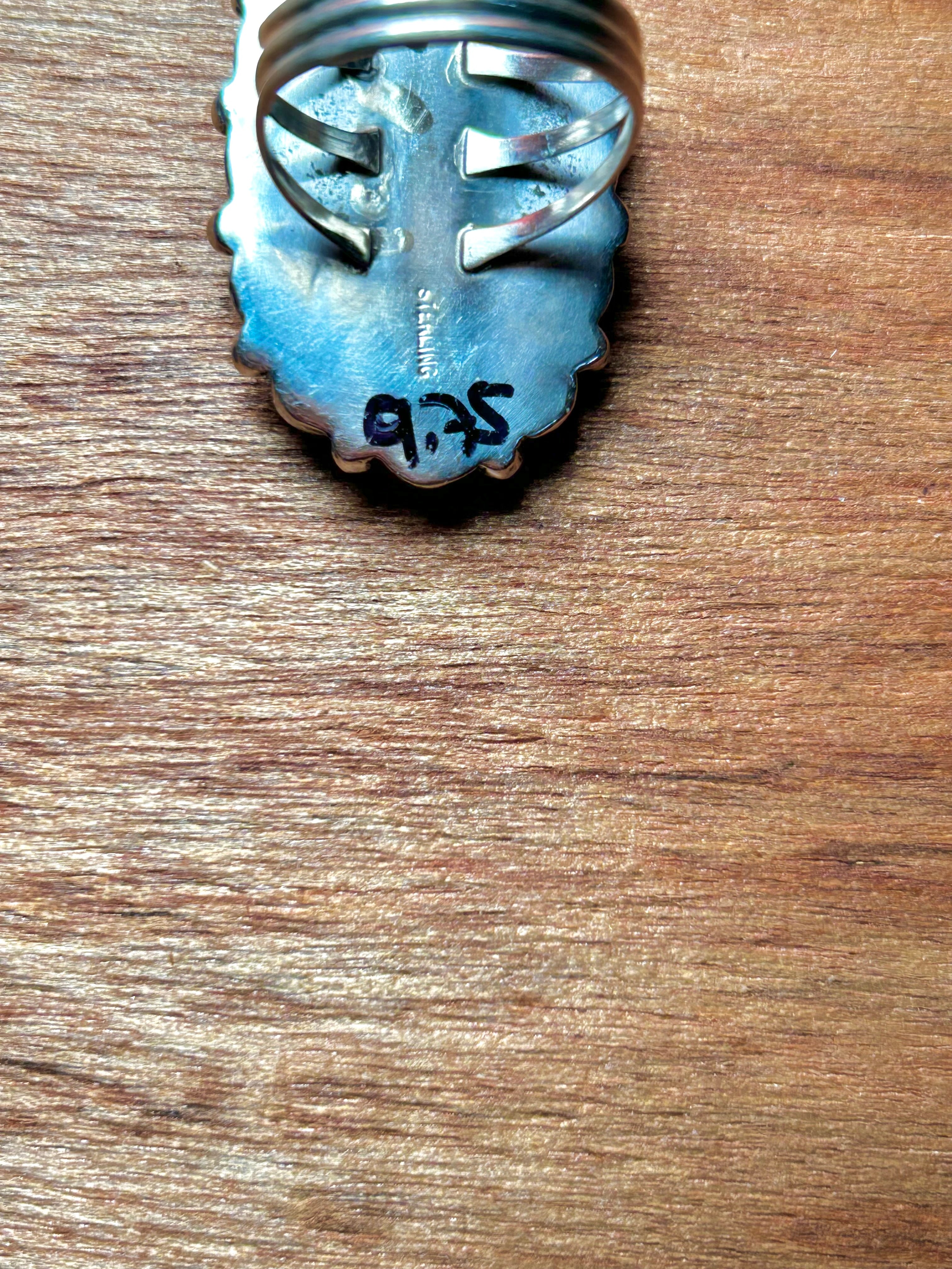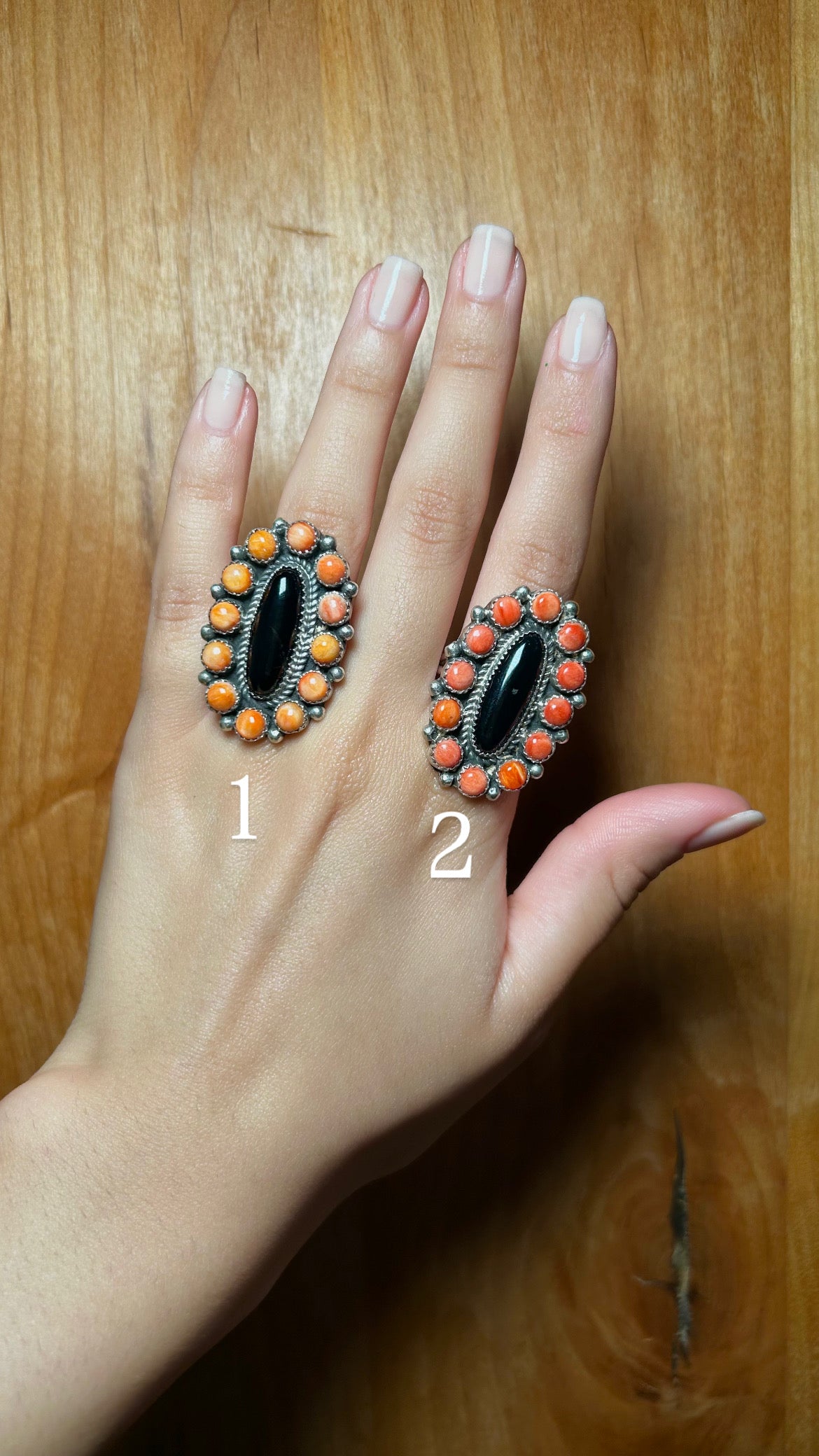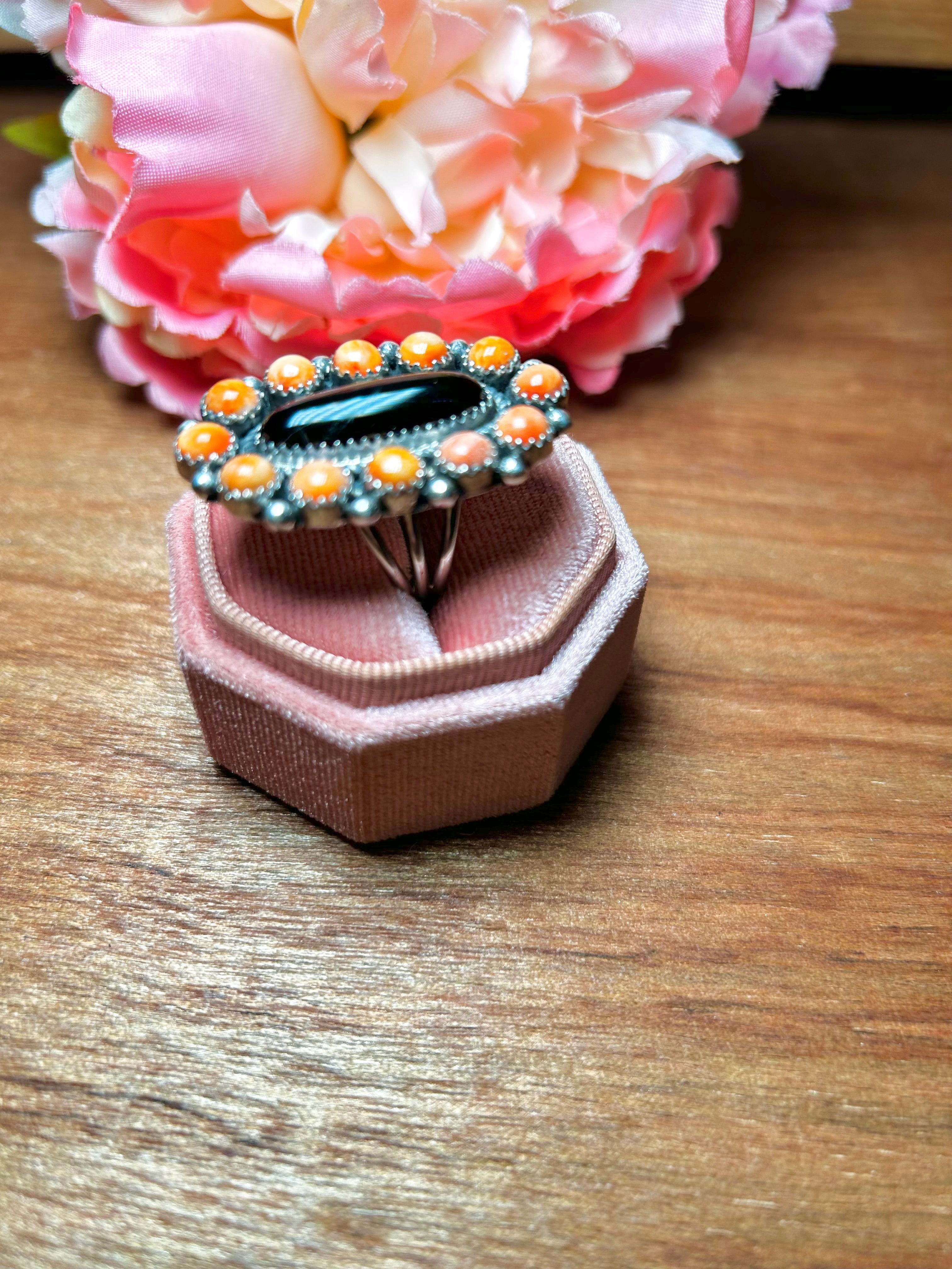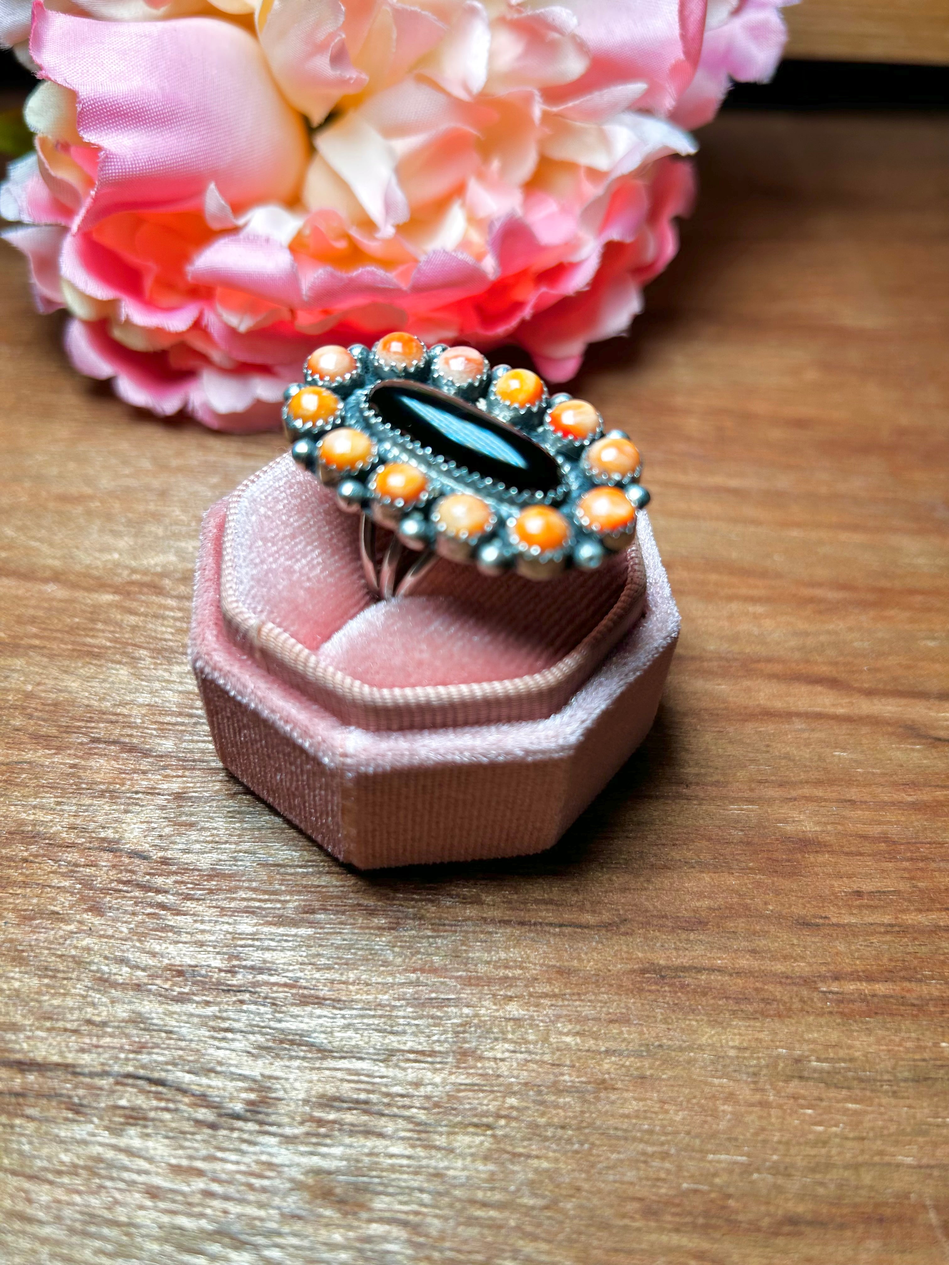 Navajo Made Spiny Oyster & Sterling Silver Ring. It measures 1 1/2 inches long and 1 inch wide. Stamped sterling silver and signed. Stones will vary due to natural stones.