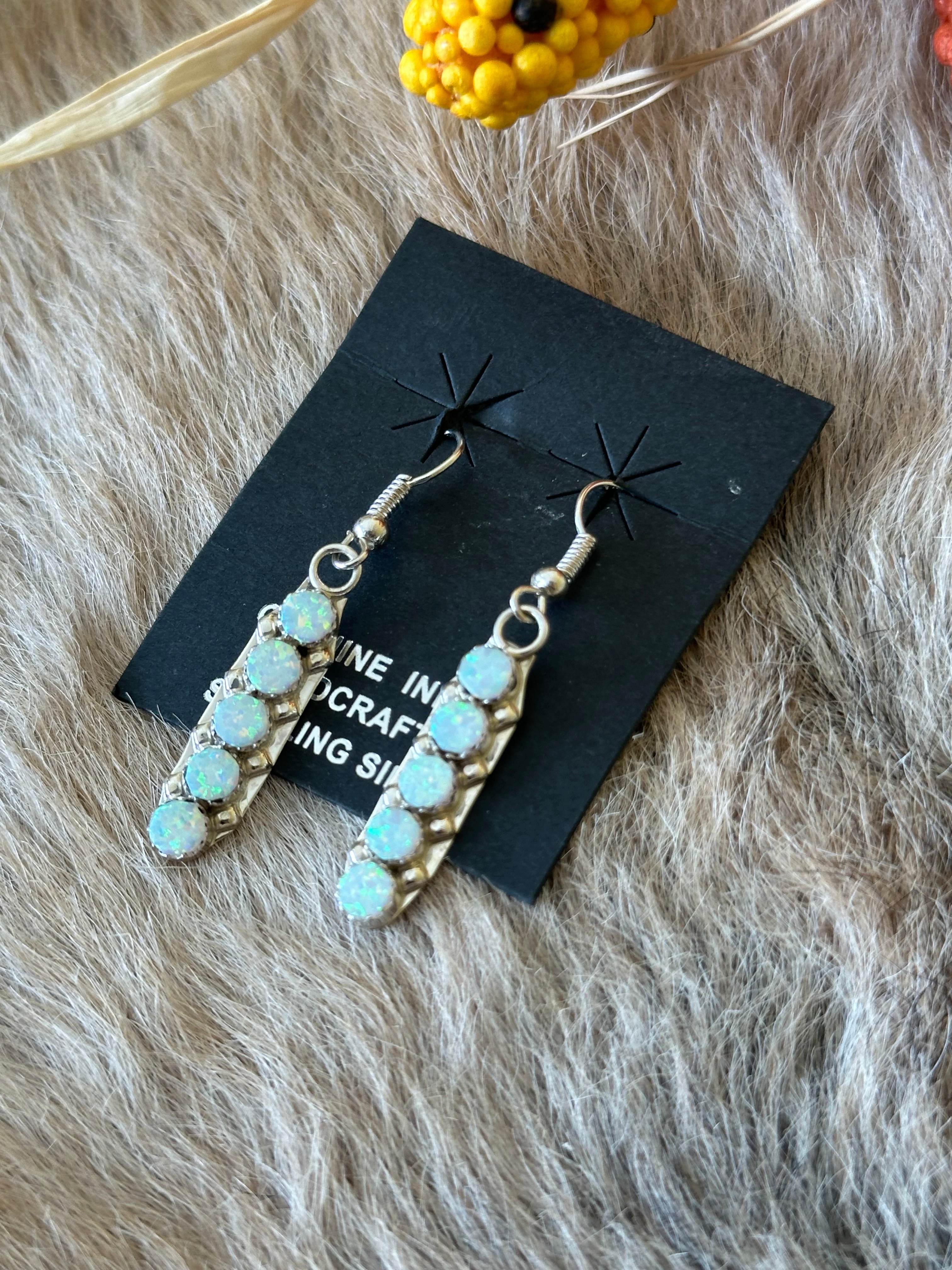 Navajo Made Opal (Man Made) & Sterling Silver Dangle Earrings. It measures 1 3/4 inches long and just over 1/4 of an inch wide. Stamped sterling silver.