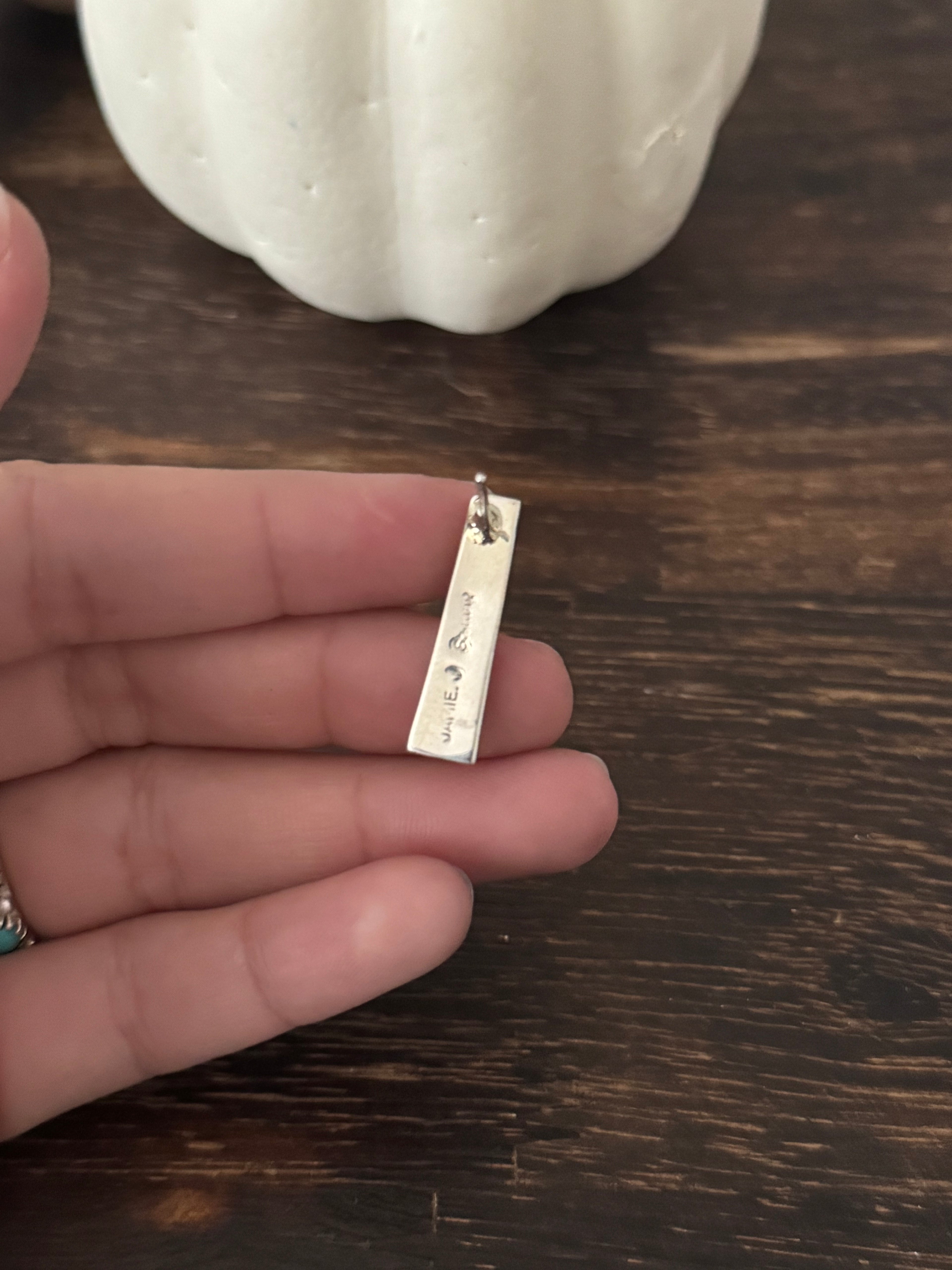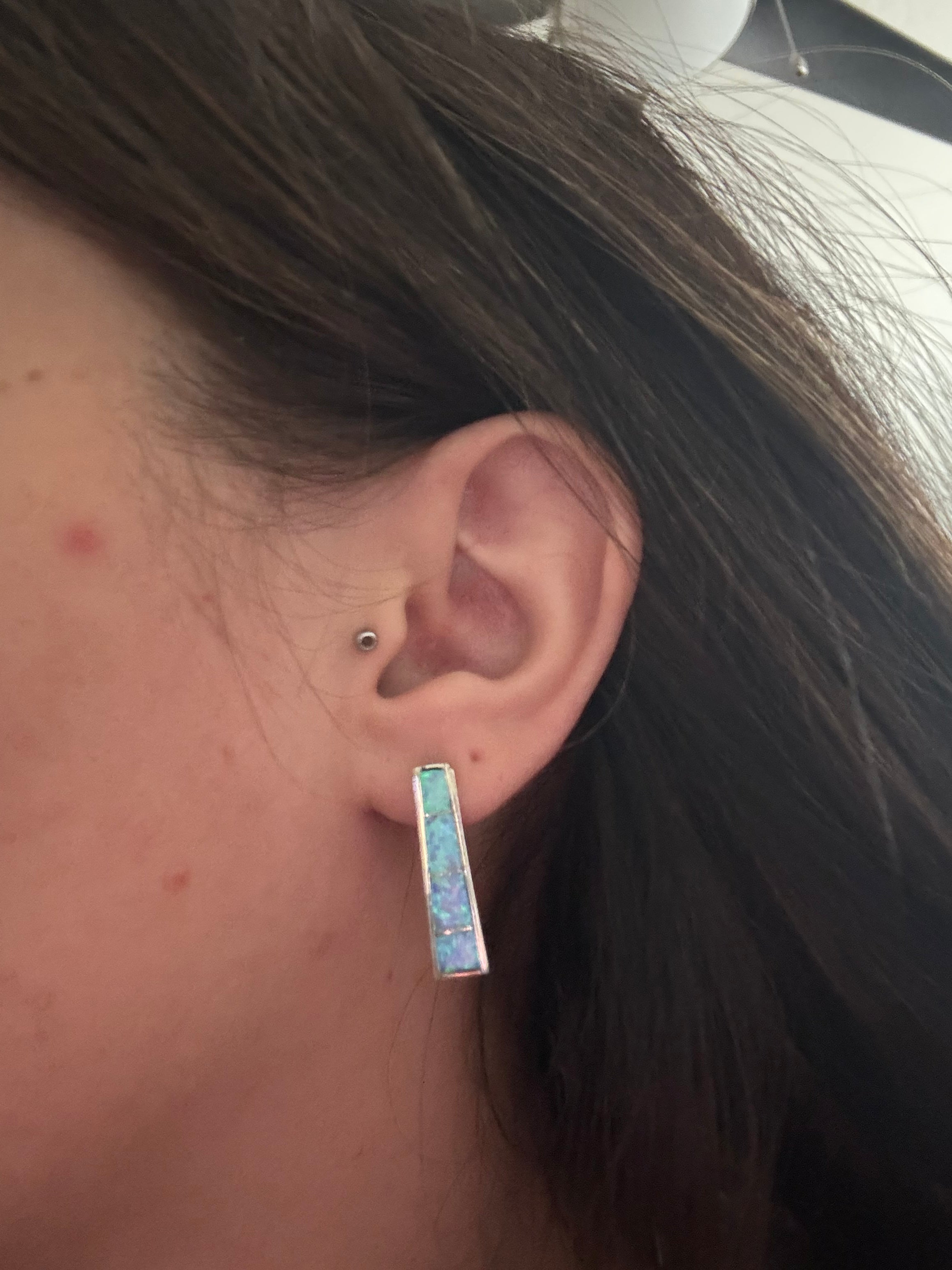 Janet Jake Opal (Man Made) & Sterling Silver Dangle Earrings. It measures 7/8 of an inch long and 1/4 of an inch wide. Stamped sterling silver.