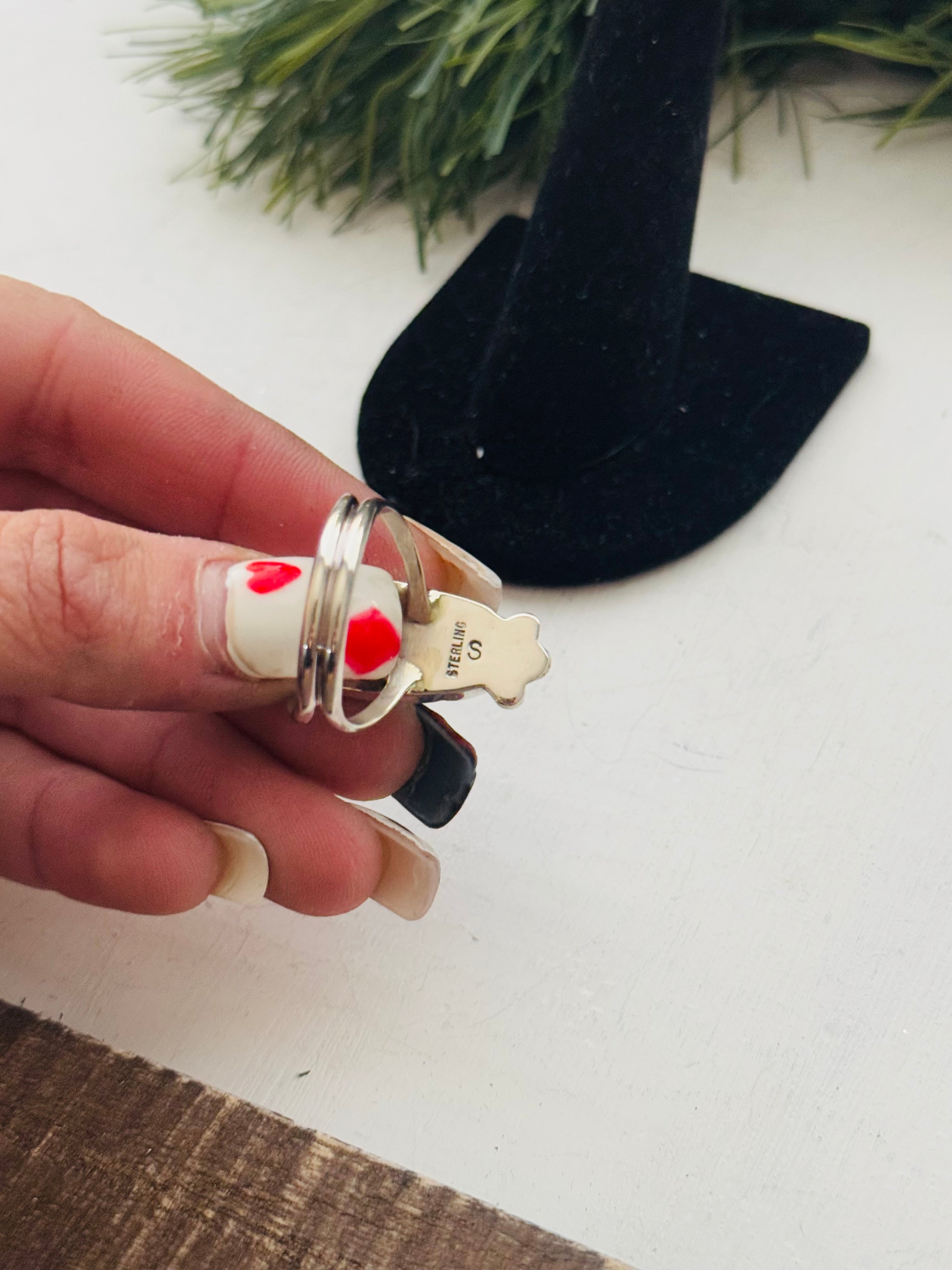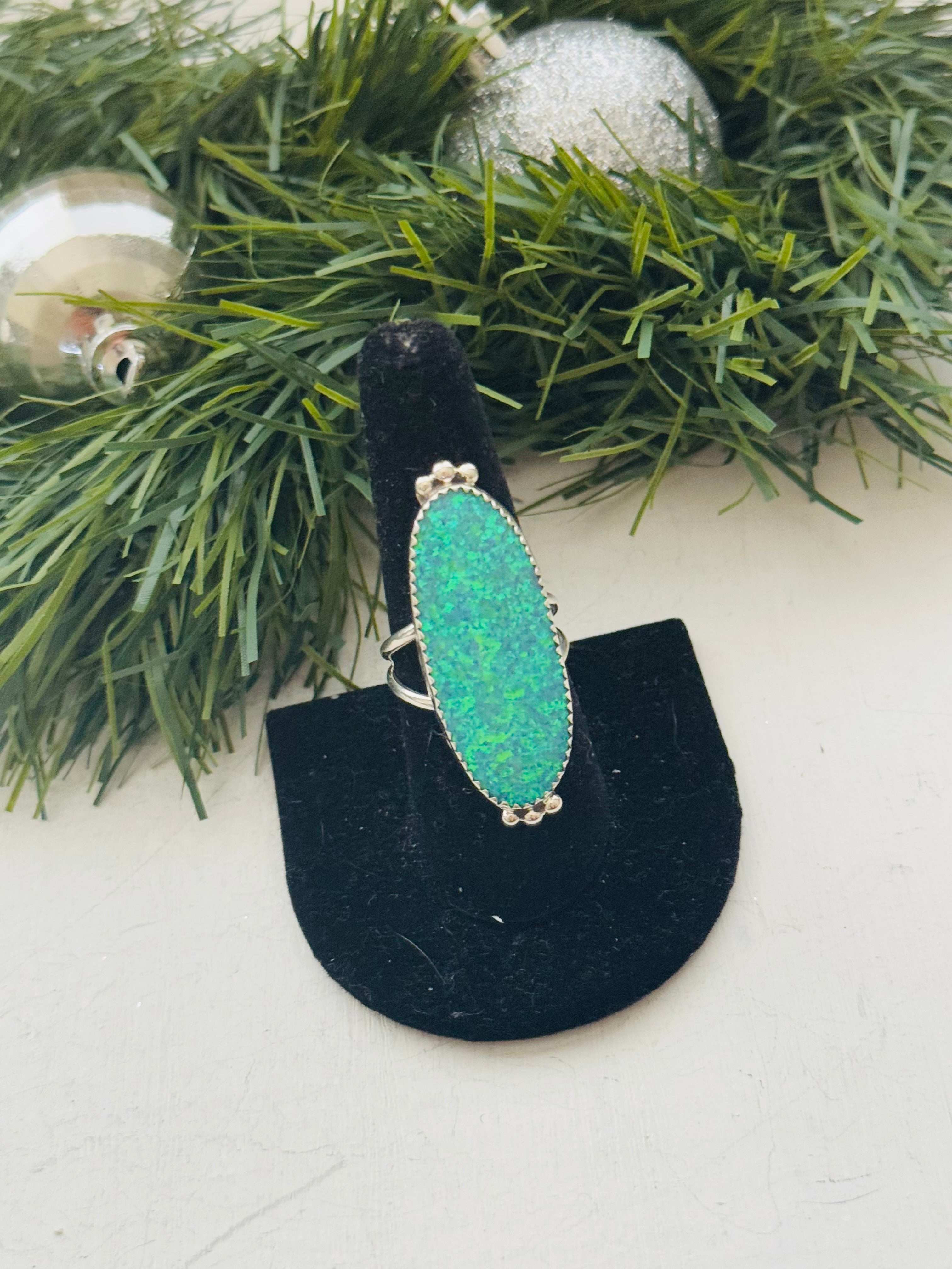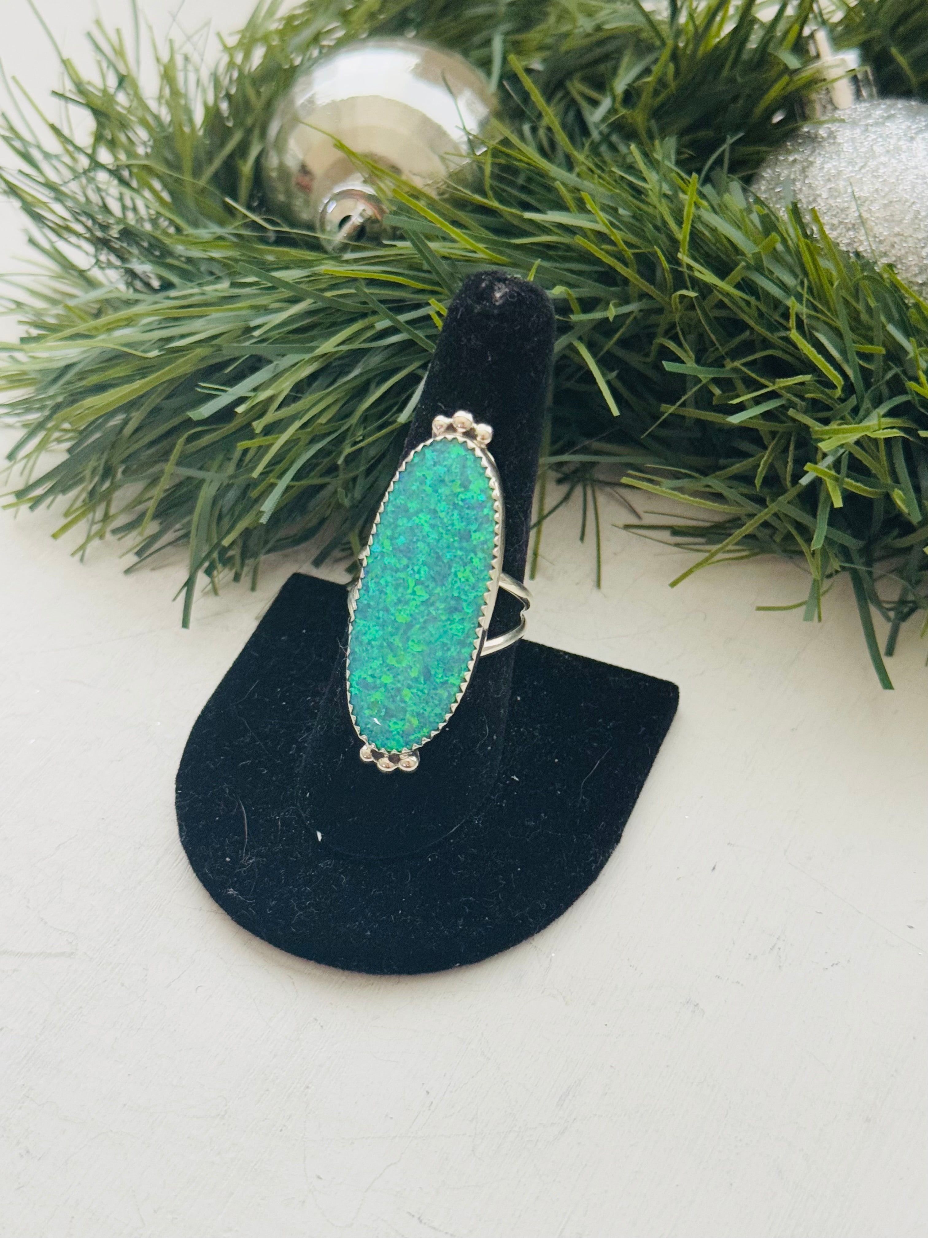 Navajo Made Opal (Man-Made) & Sterling Silver Ring. It measures 1 5/8 inches long and 5/8 of an inch wide. Signed by artist and stamped sterling silver.