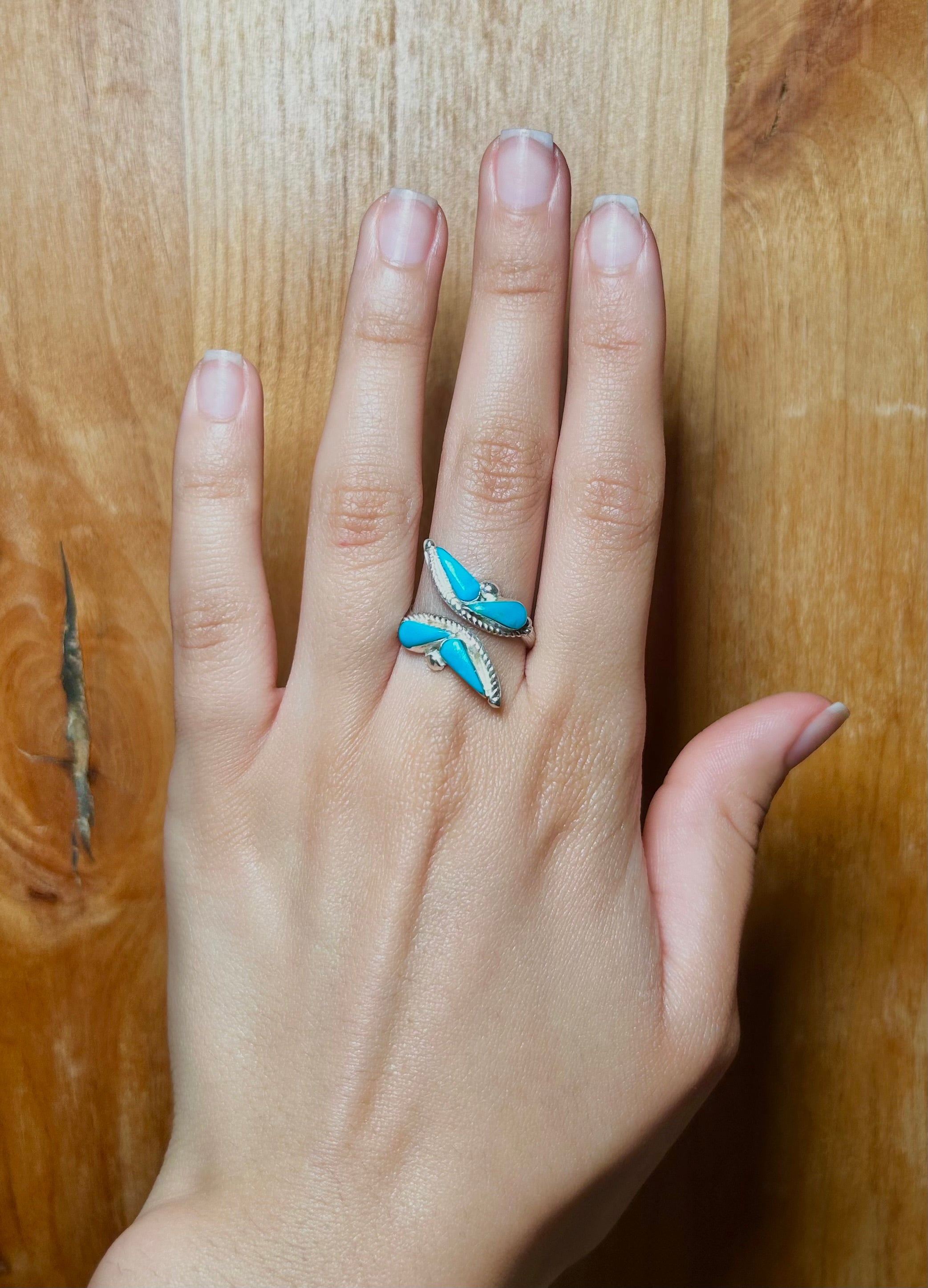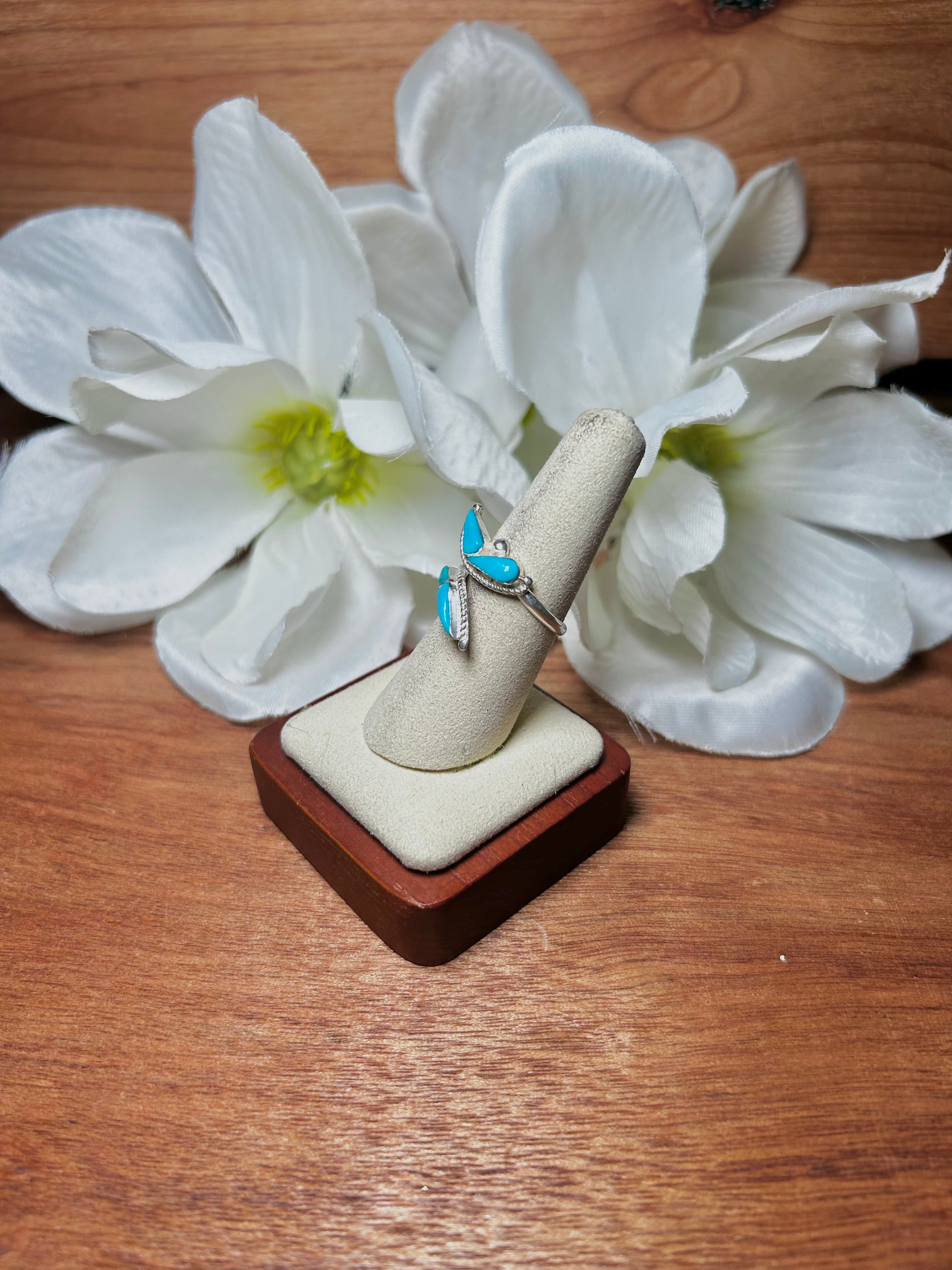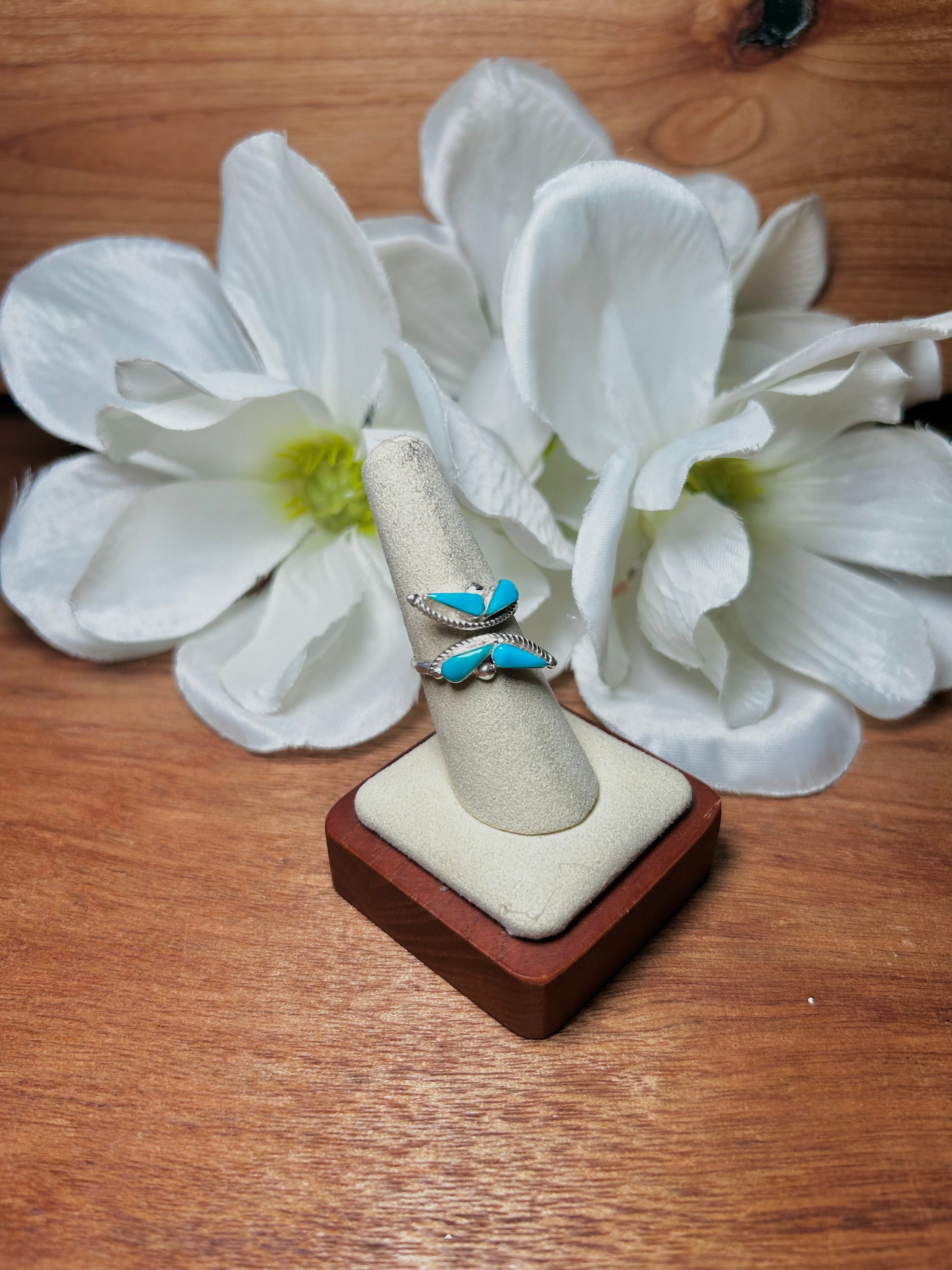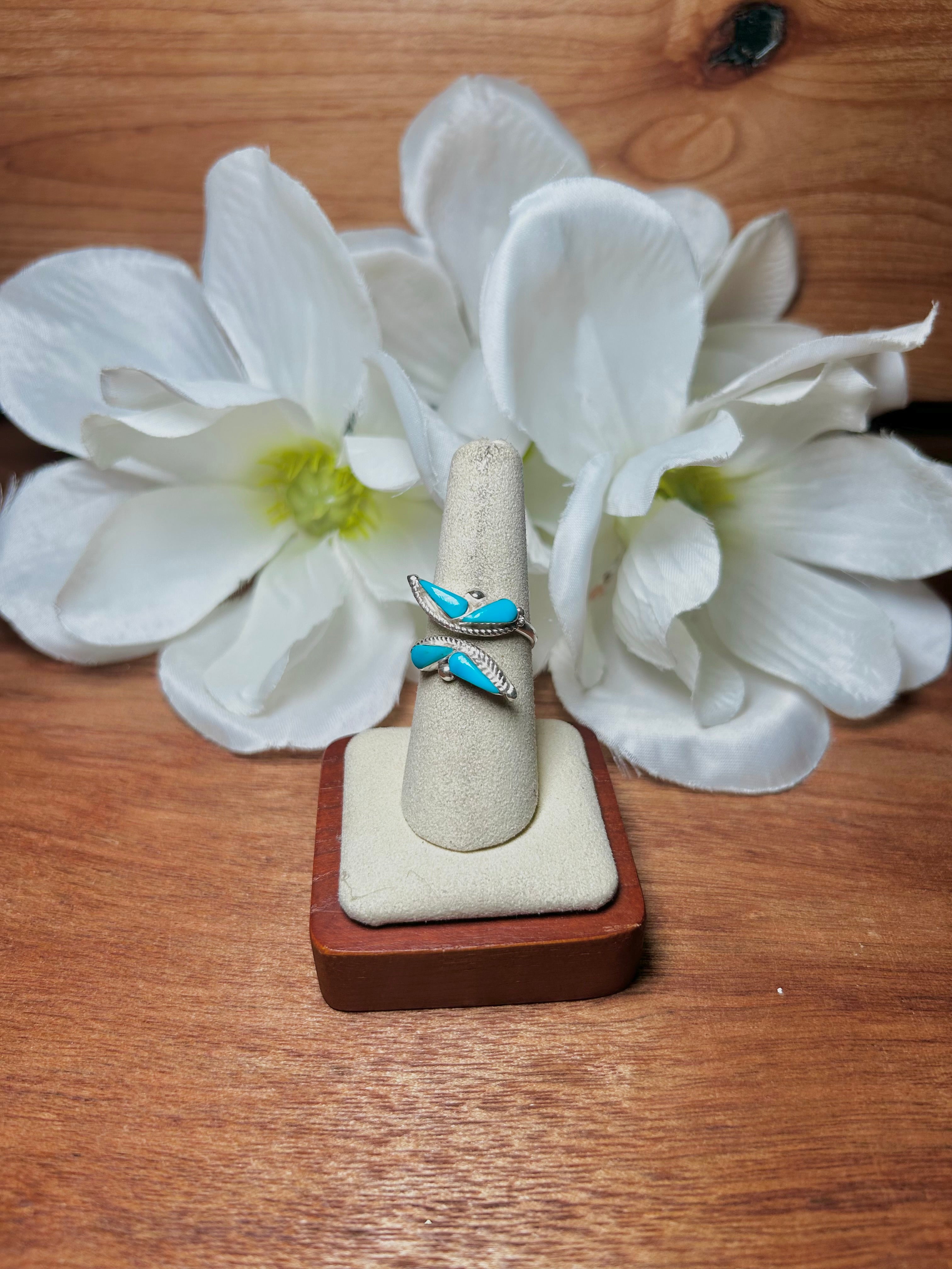 Navajo Made Kingman Turquoise & Sterling Silver Adjustable Ring. It measures 1/2 of an inch long and 3/4 of an inch wide. Signed by the artist and stamped sterling silver.