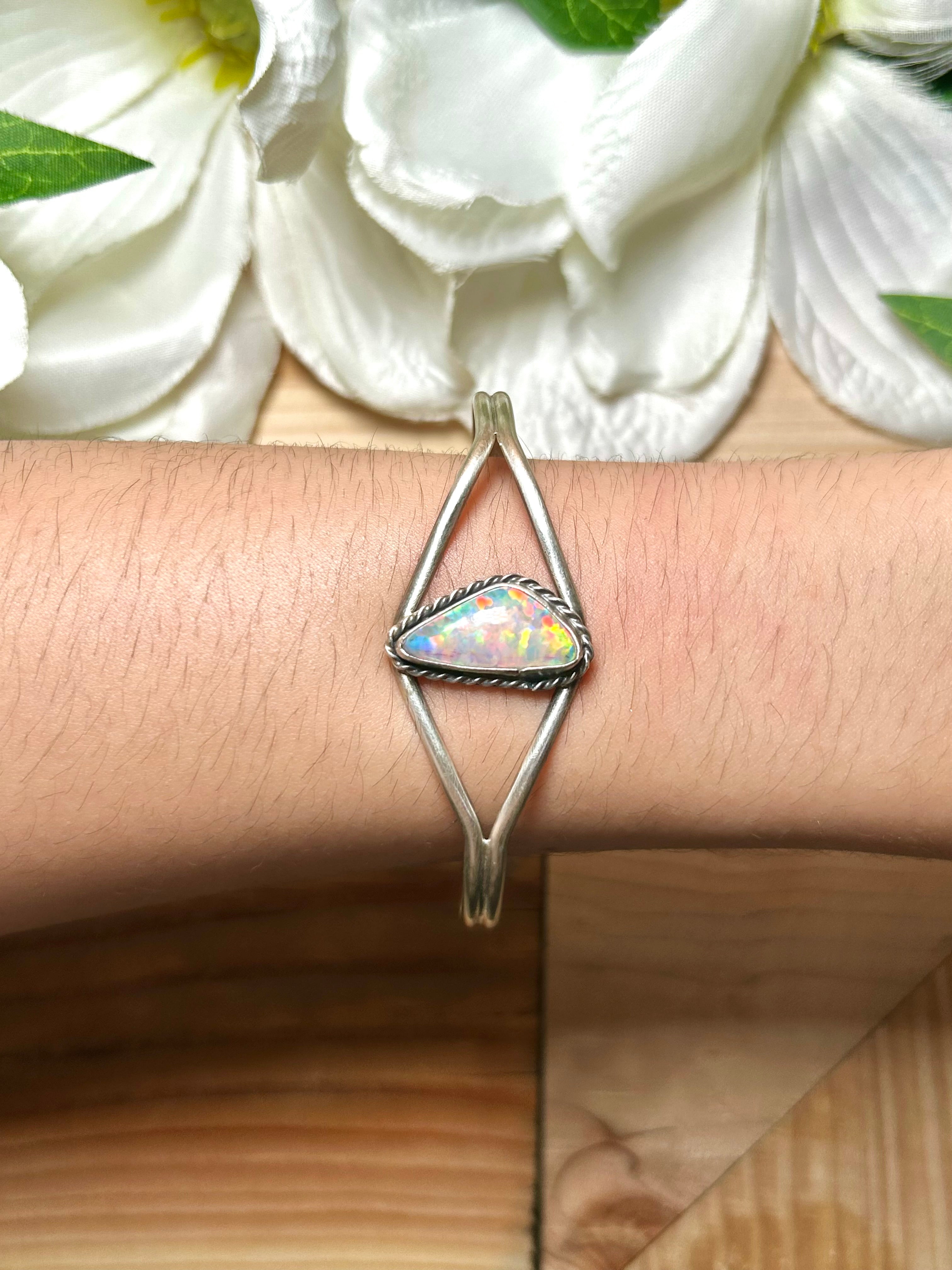 Navajo Man Made Opal & Sterling Silver Cuff Bracelet. It measures 7/8 of an inch wide with an inside circumference of 5 3/8 inches and a gap of 1 inch. Signed by the artist and stamped sterling silver.