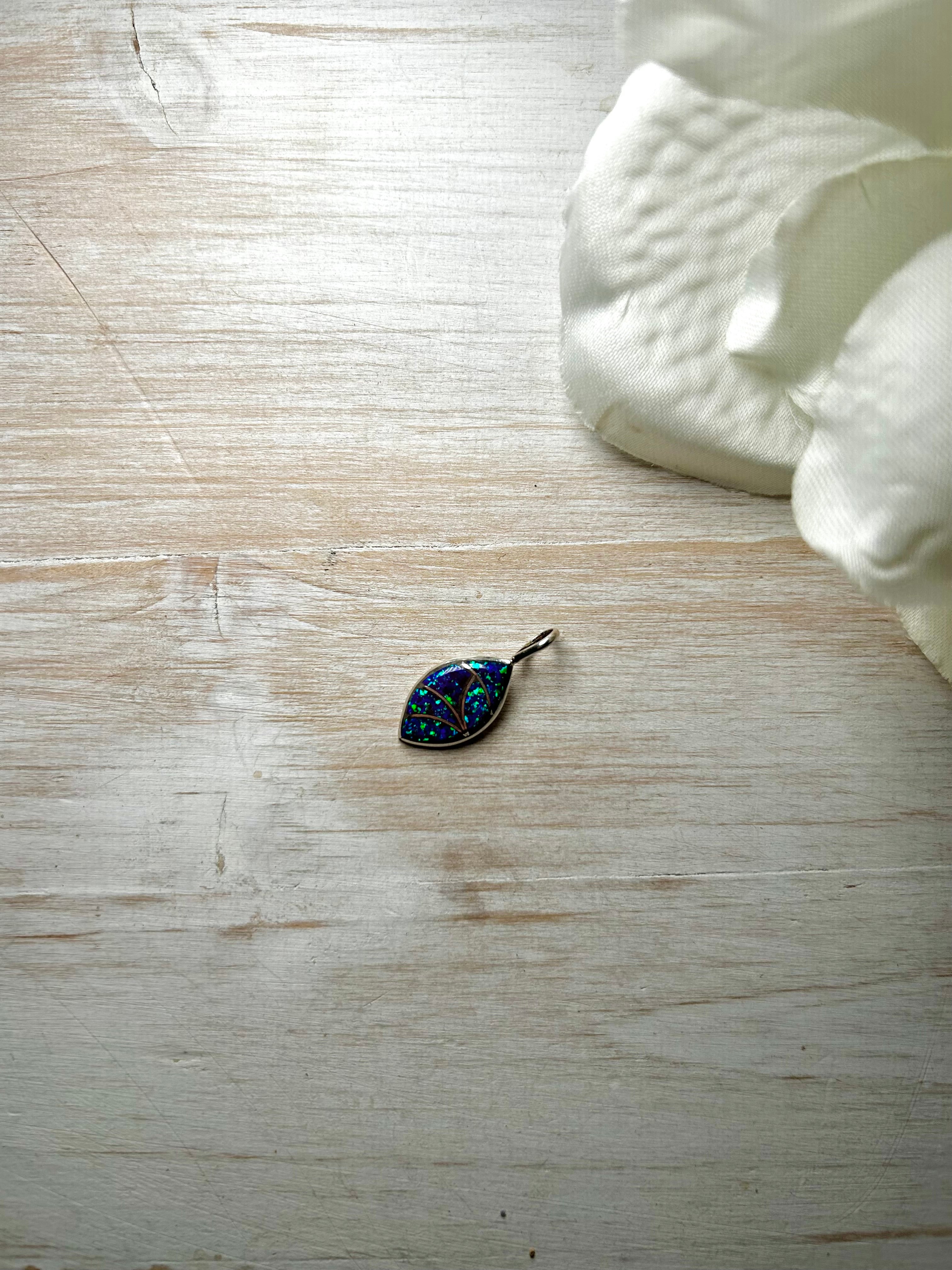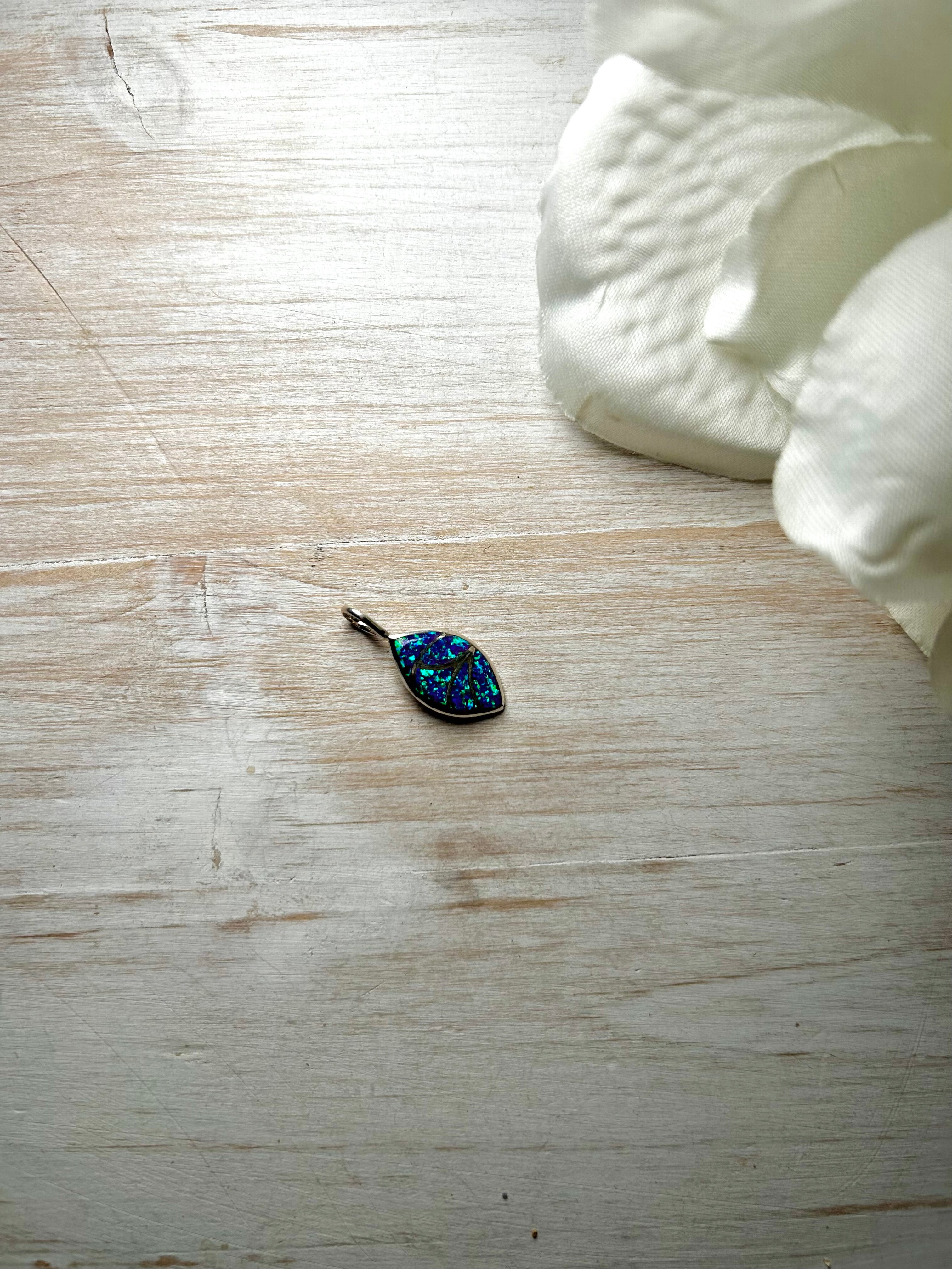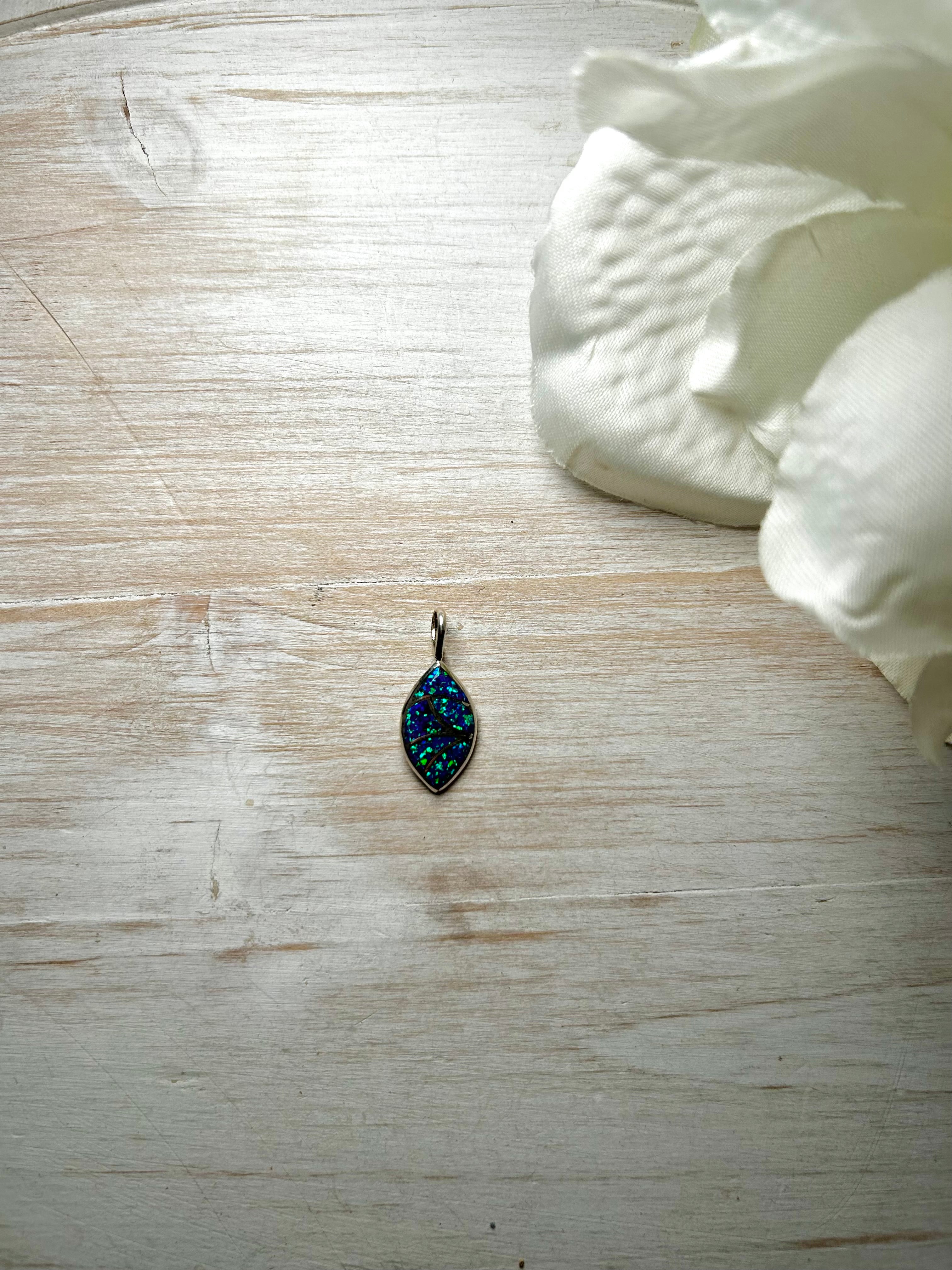 Navajo Man-Made Opal & Sterling Silver Pendant. It measures 1 inch long and 3/8 of an inch wide. Signed by the artist and stamped sterling silver. Pendant only!