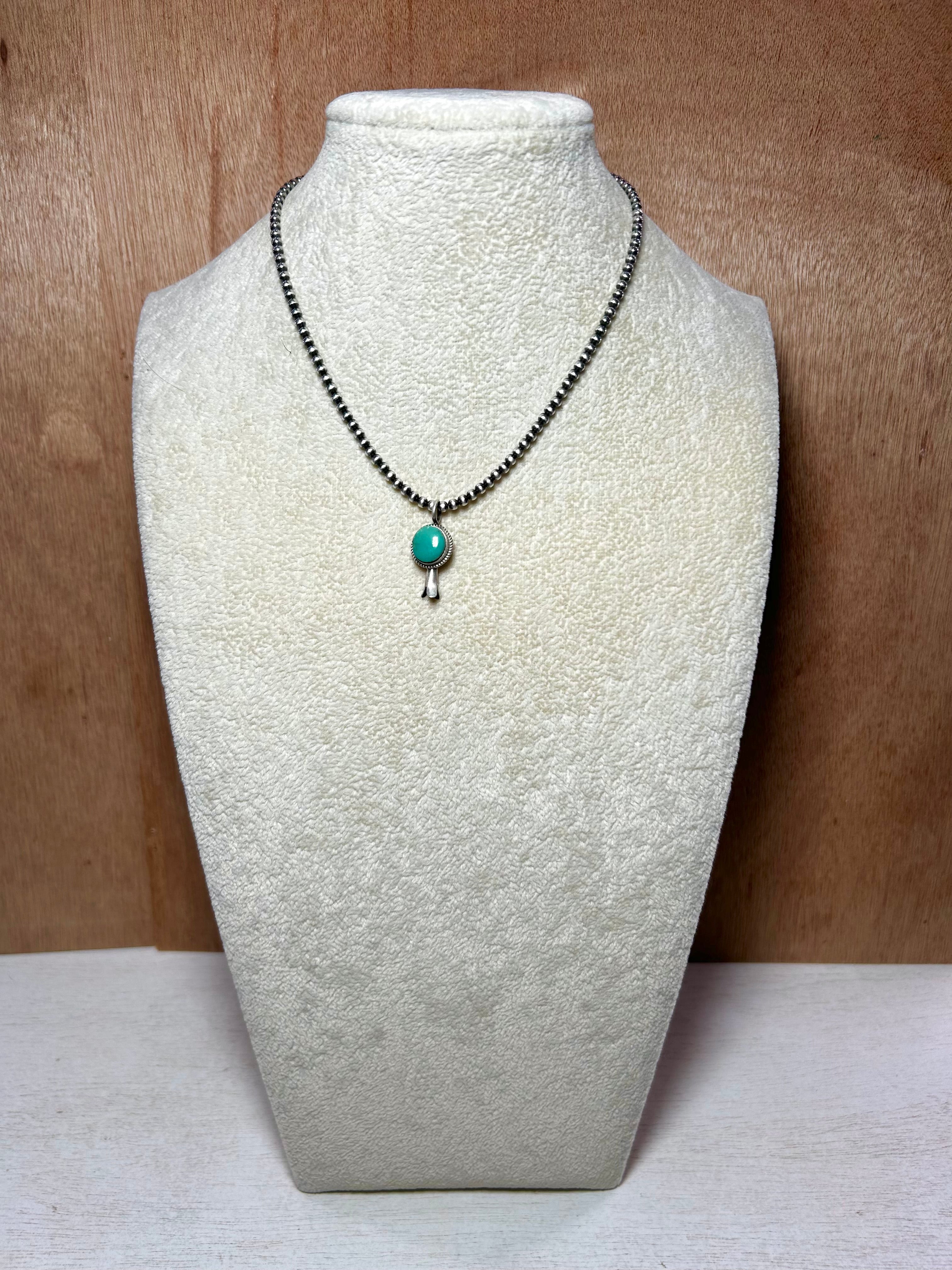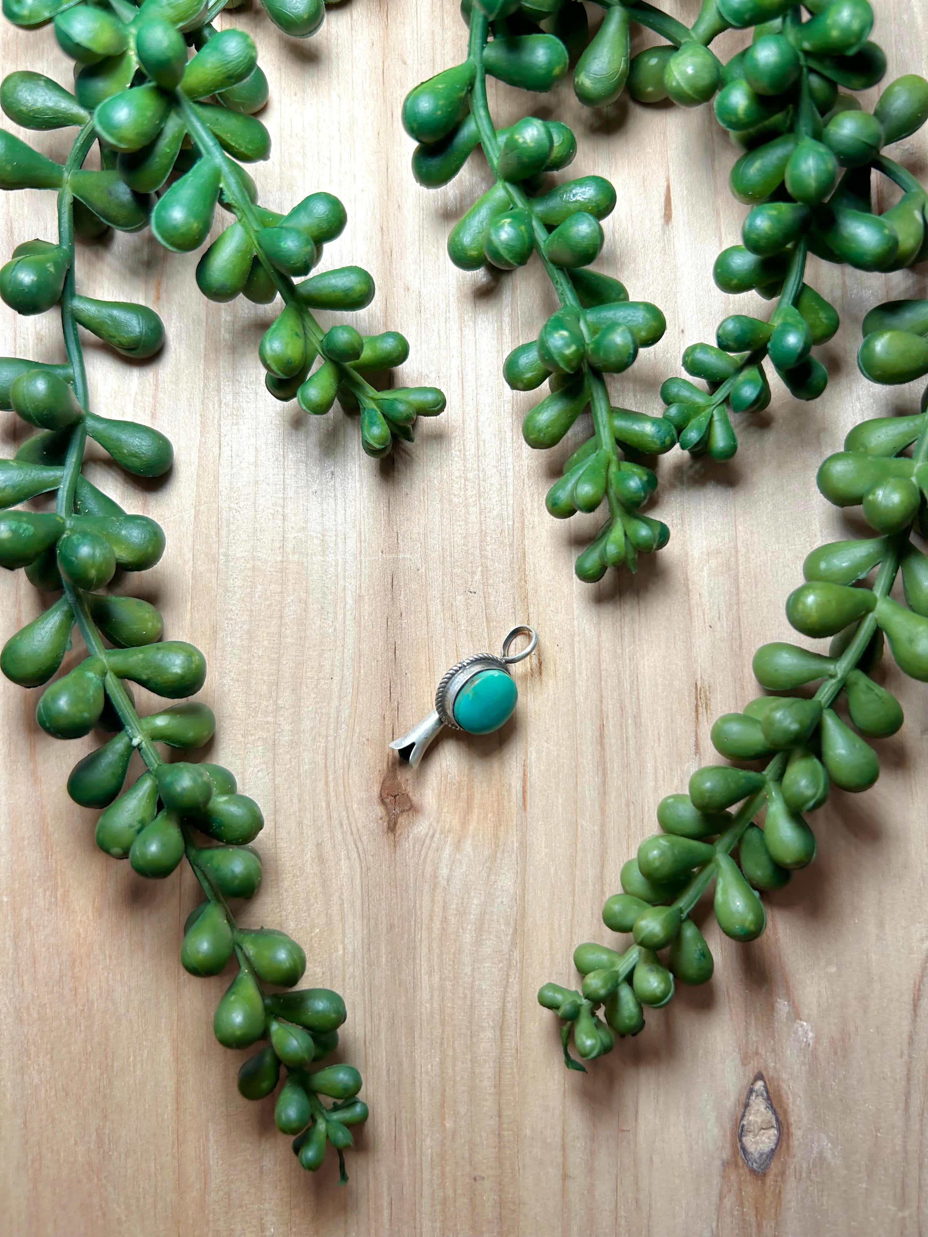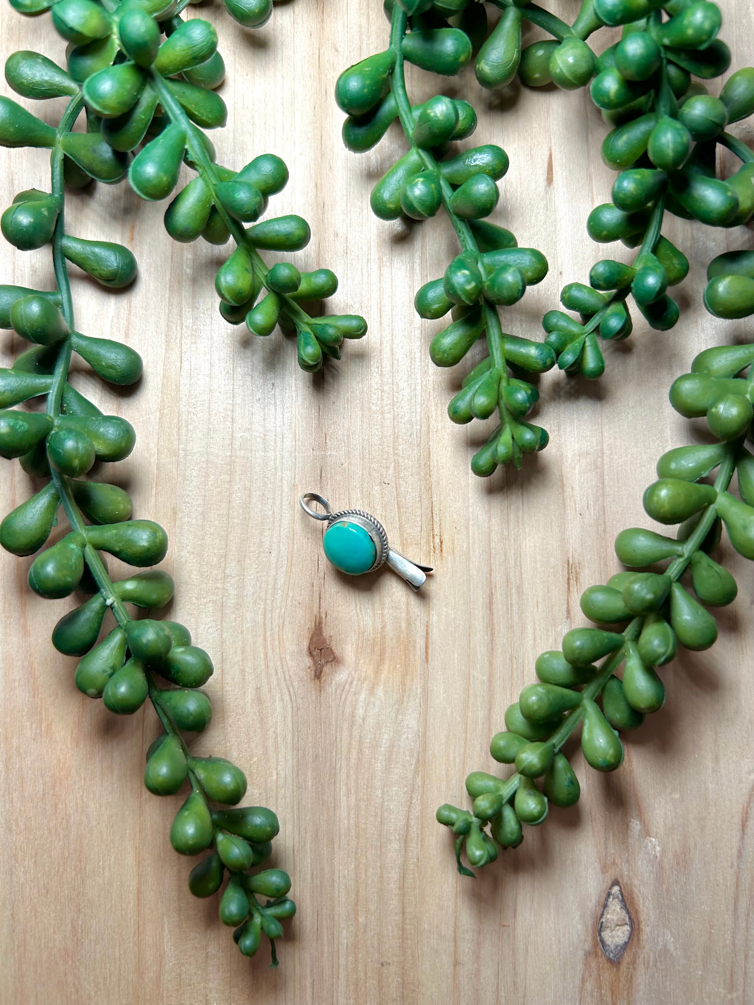 Navajo Made Kingman Turquoise & Sterling Silver Pendant. It measures 1 inch long and 1/2 of an inch wide. Pendant Only. Signed by the artist and stamped sterling silver.