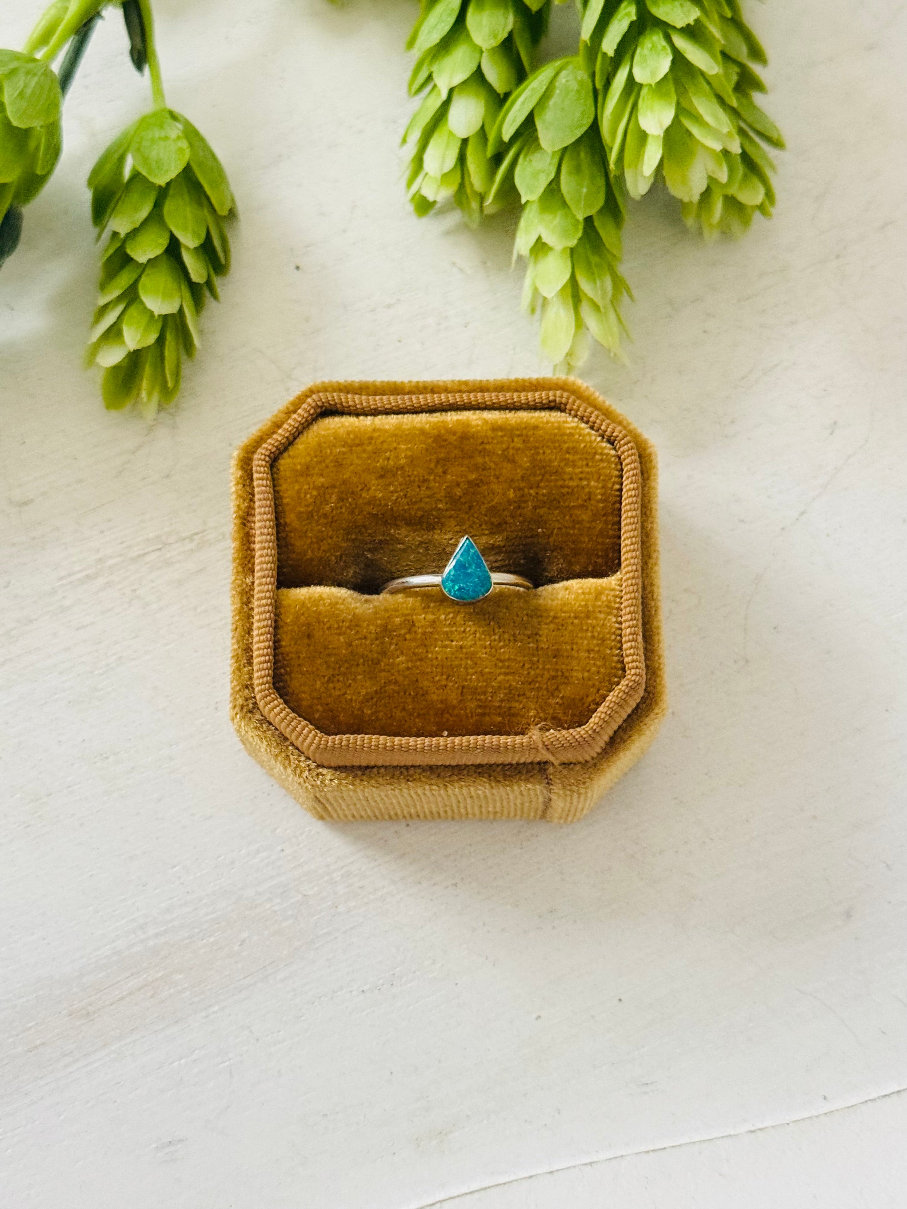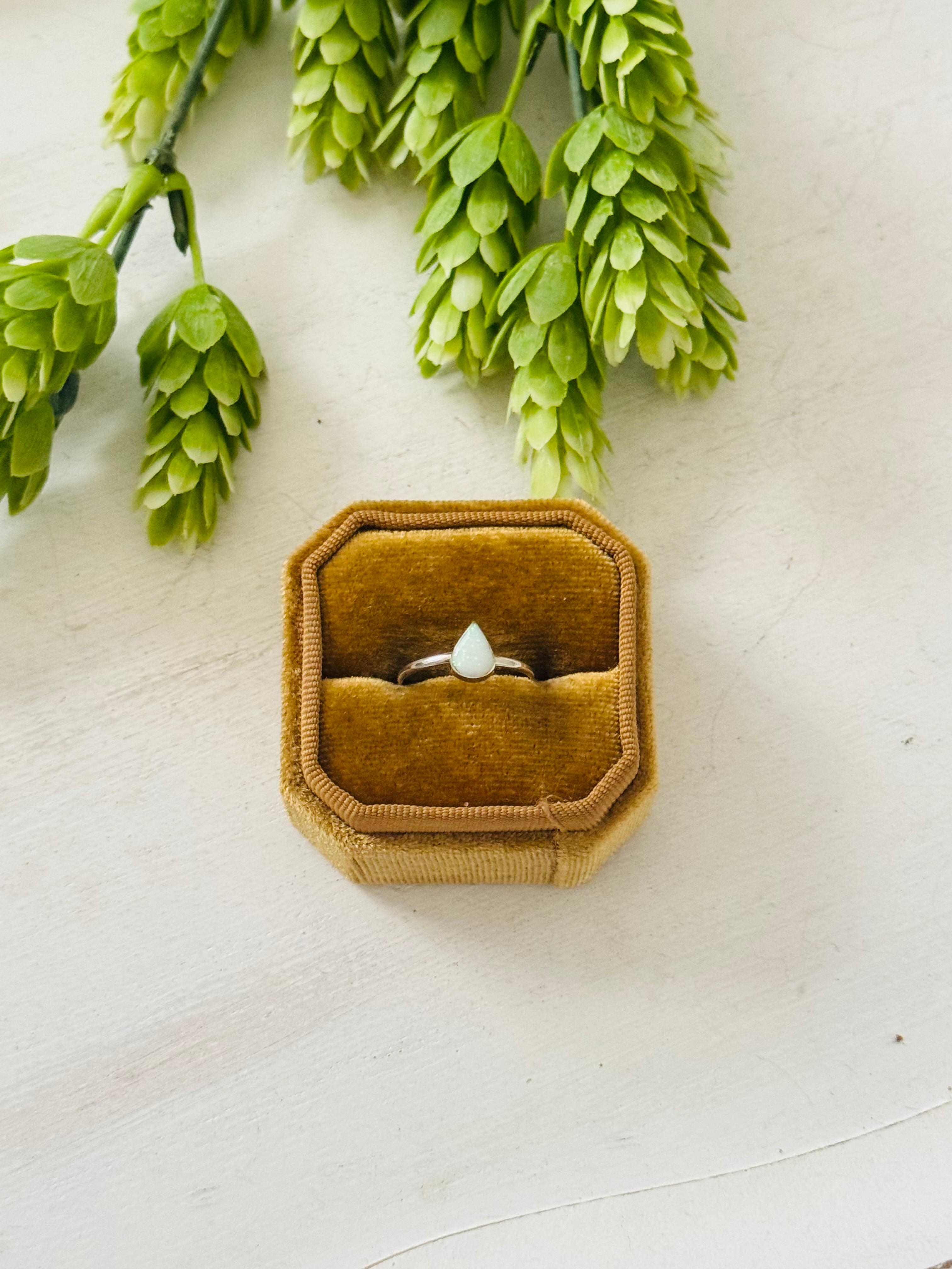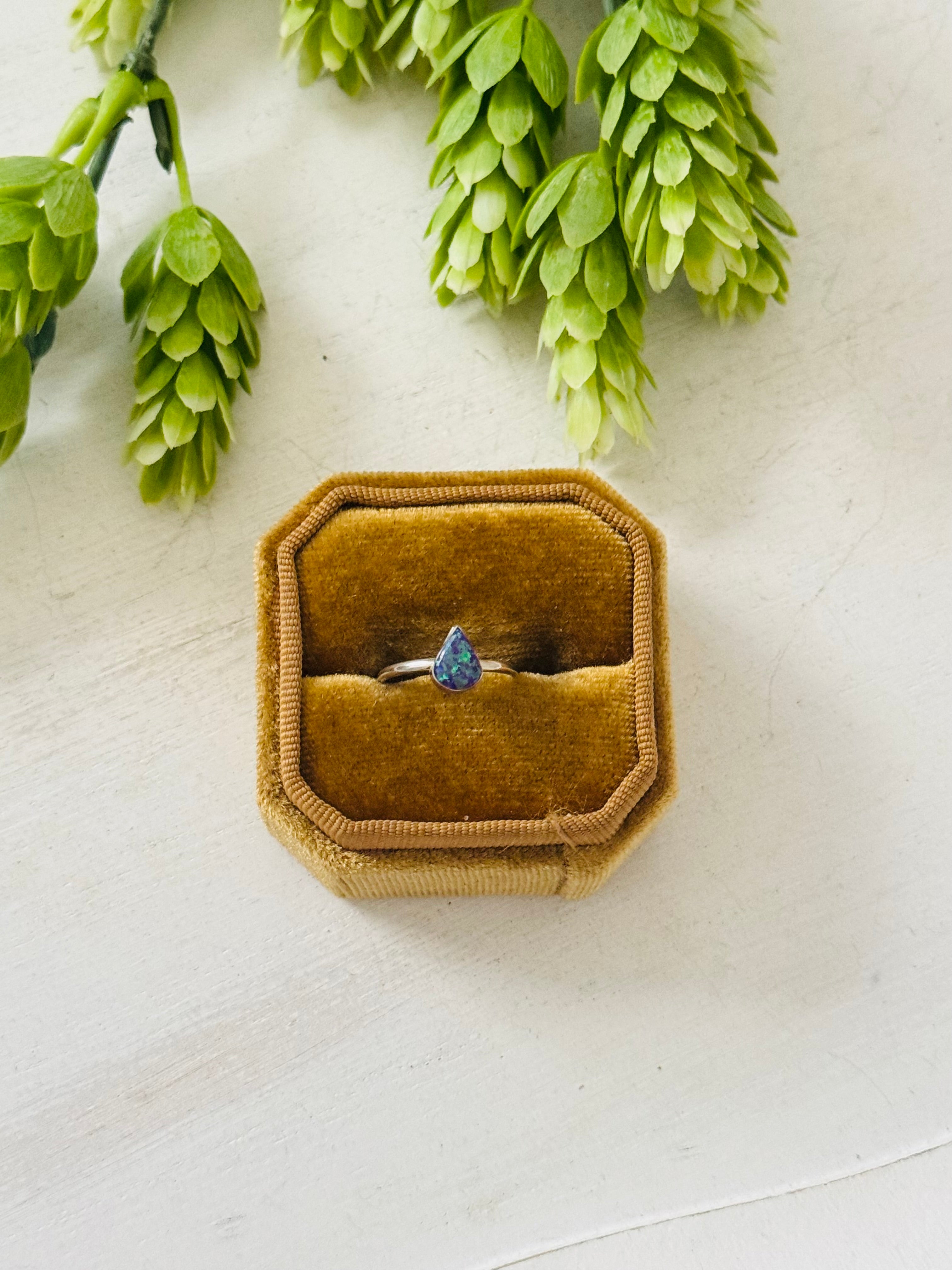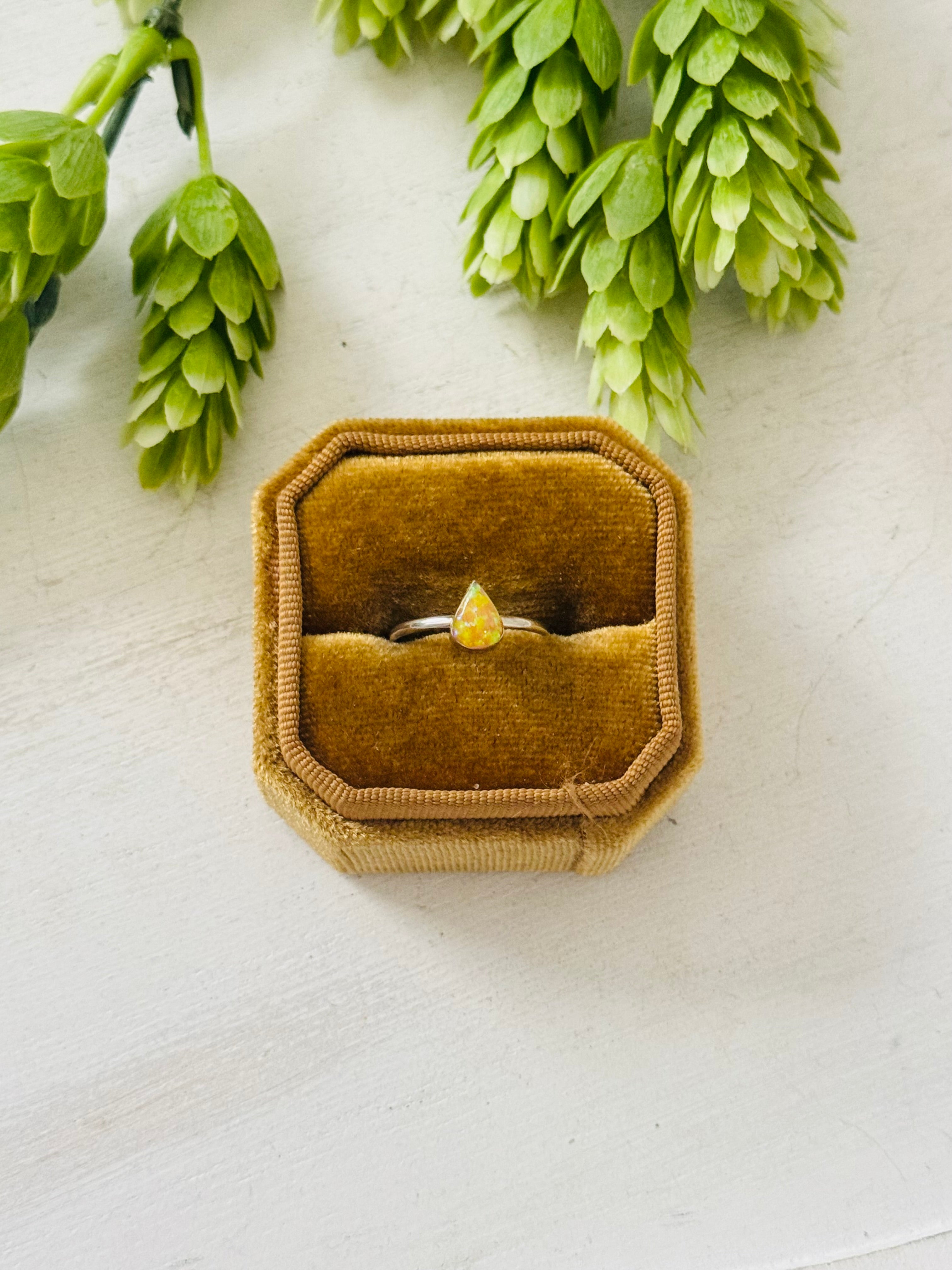 Navajo Made Opal & Sterling Silver Ring. It measures a little over 1/4 of an inch long and 1/8 of an inch wide. Signed by the artist and stamped sterling silver.