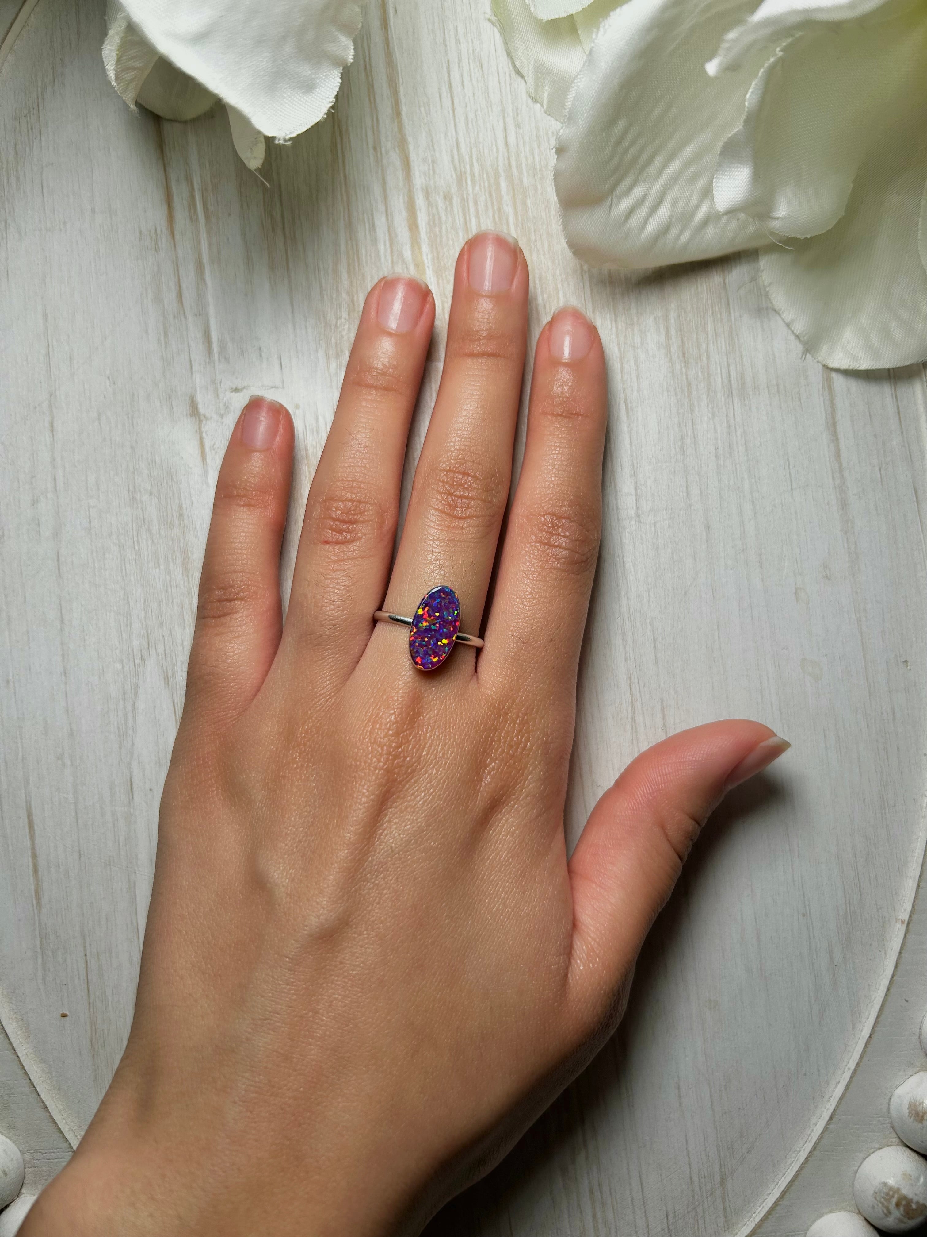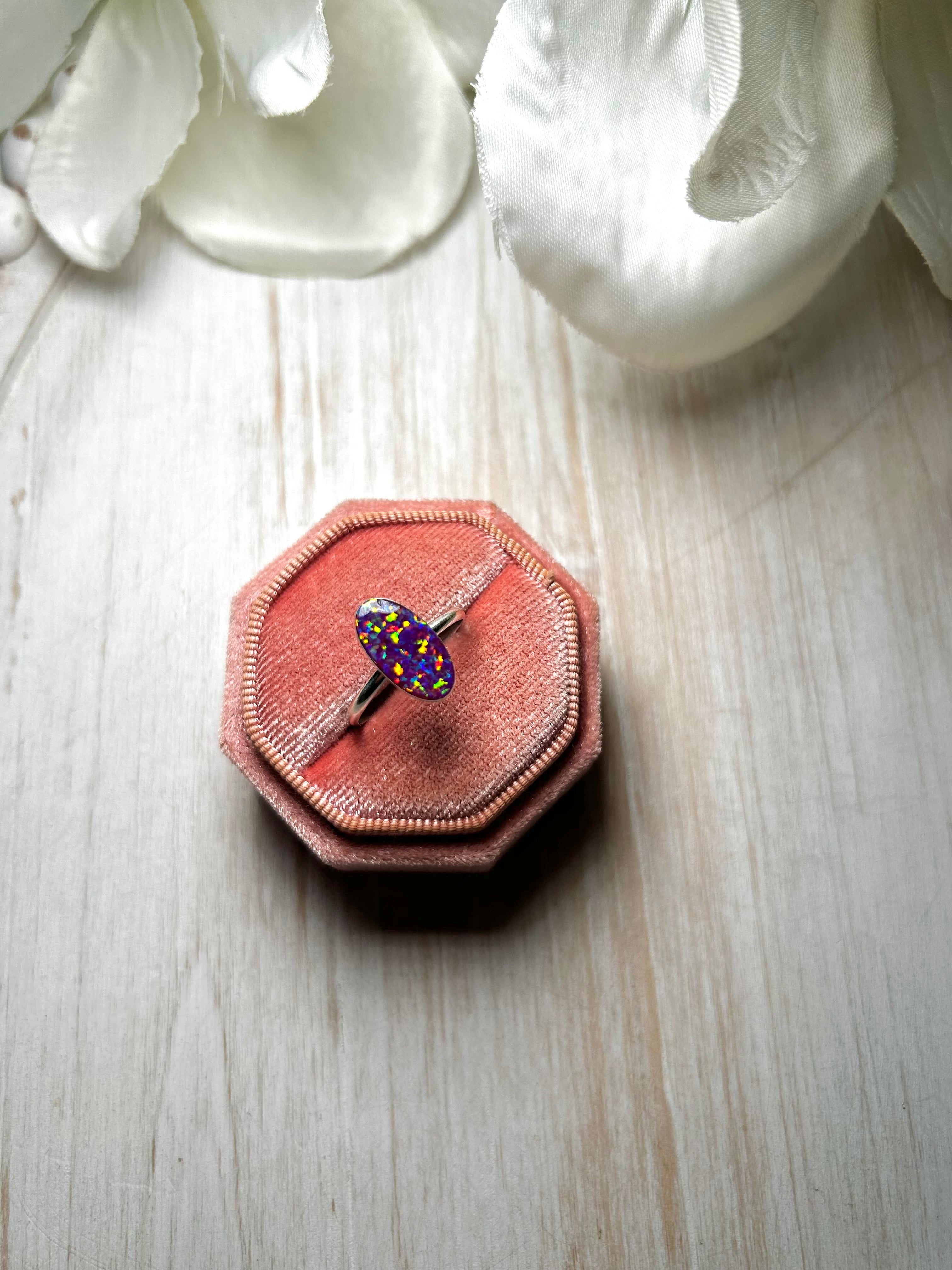 Navajo Man-Made Opal & Sterling Silver Ring. It measures 5/8 of an inch long and 1/4 of an inch wide. Signed by the artist and stamped sterling silver.