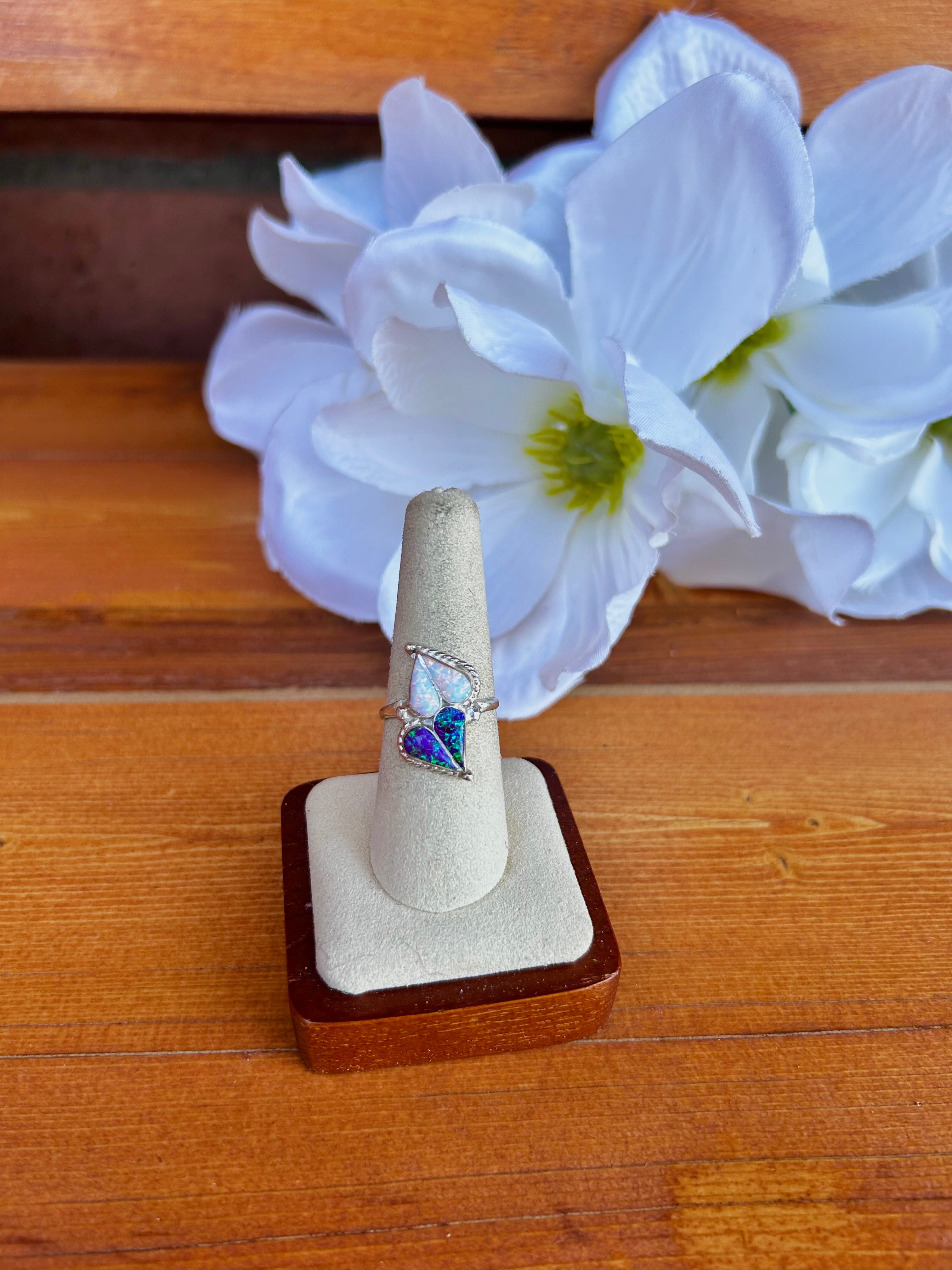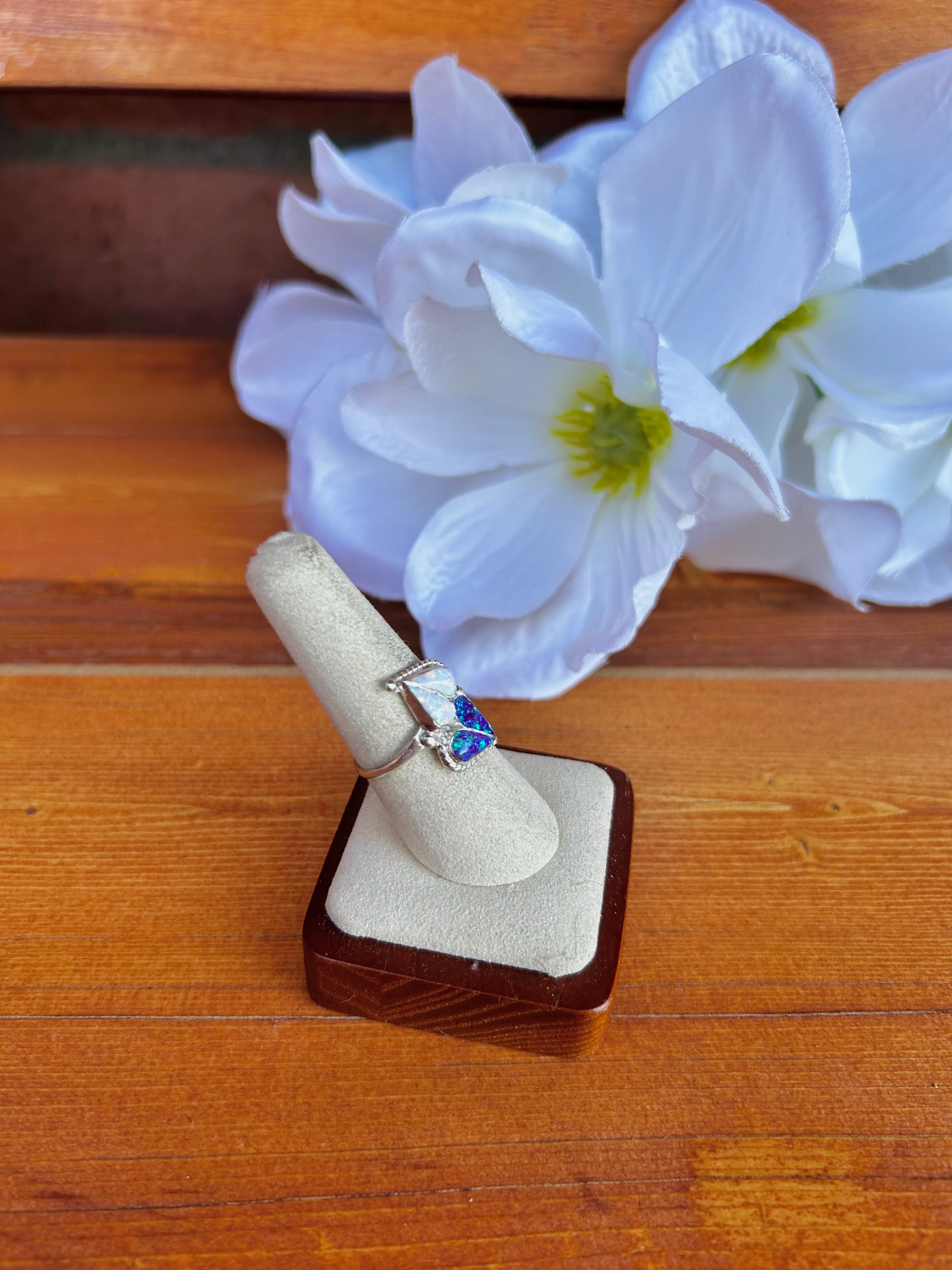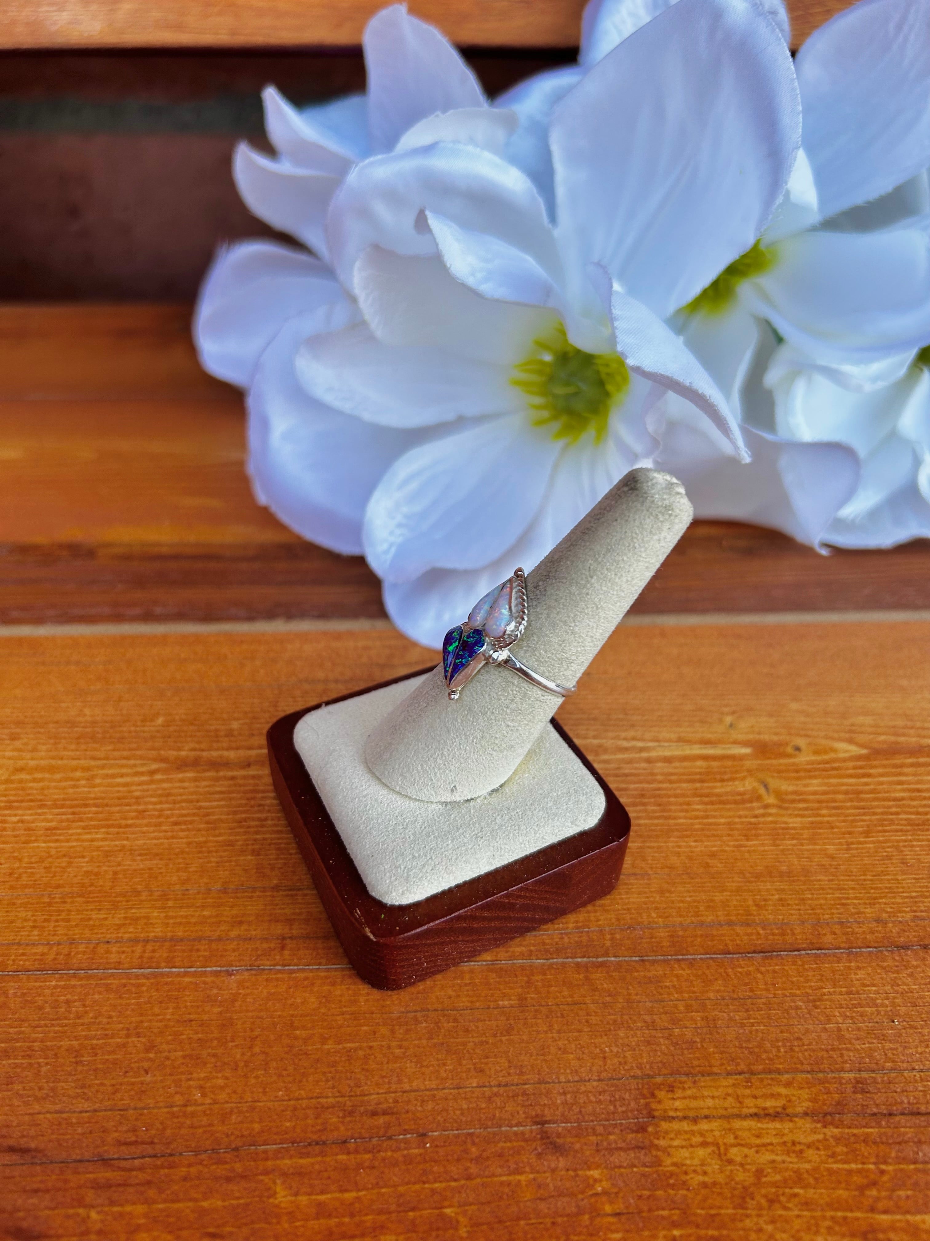 Navajo Man-Made Opal & Sterling Silver Ring. It measures 1 inch long and 5/8 of an inch wide. Signed by the artist and stamped sterling silver. Stones may vary due to natural stones