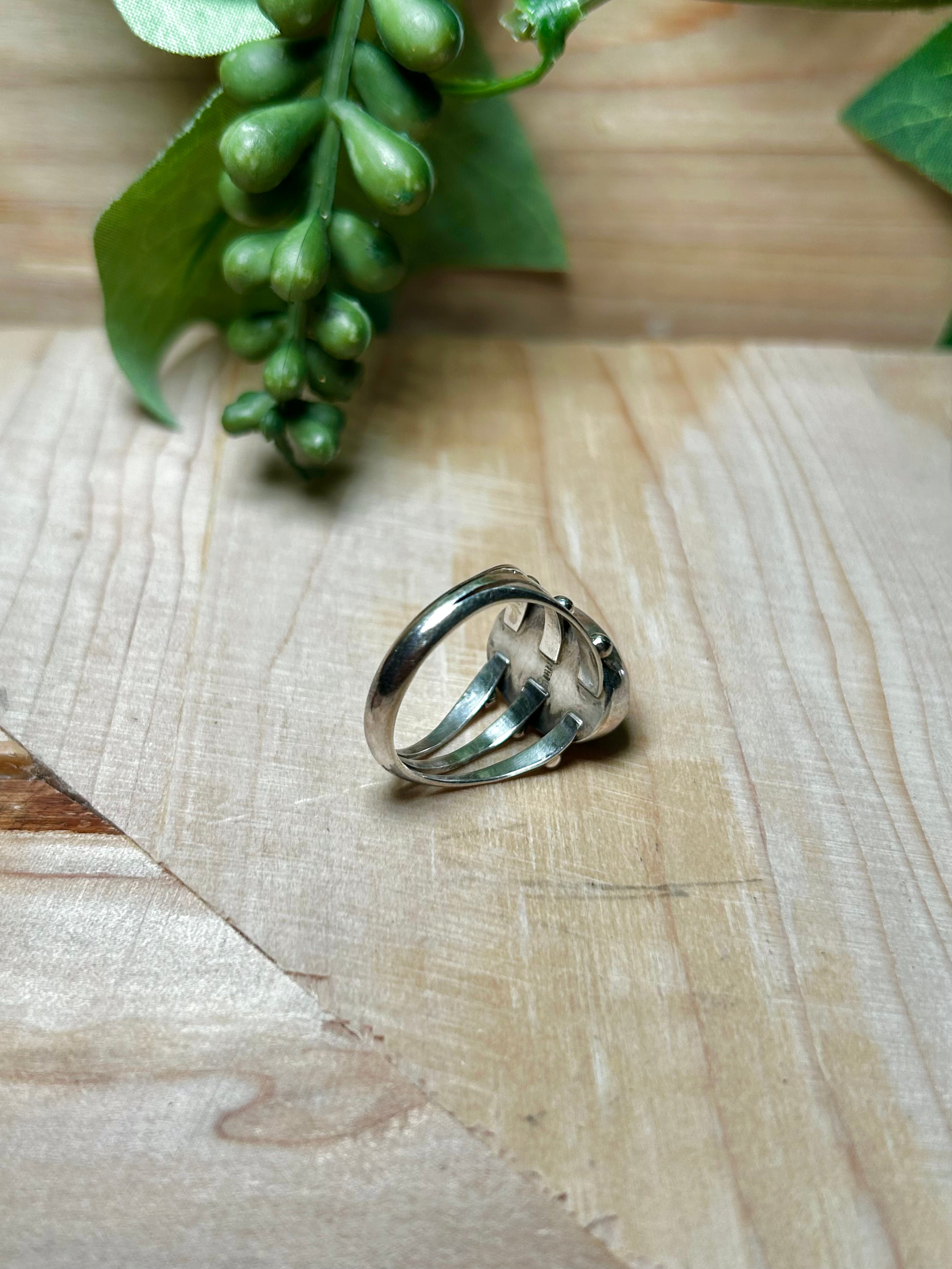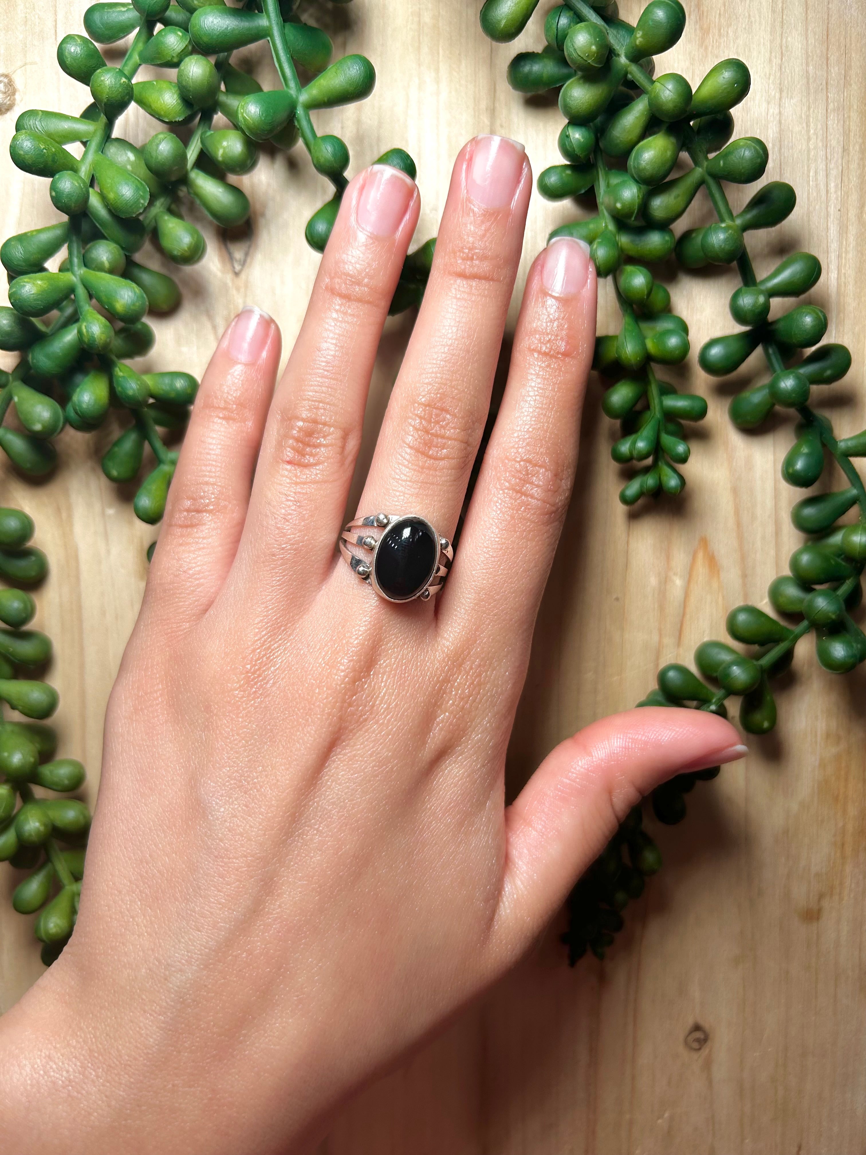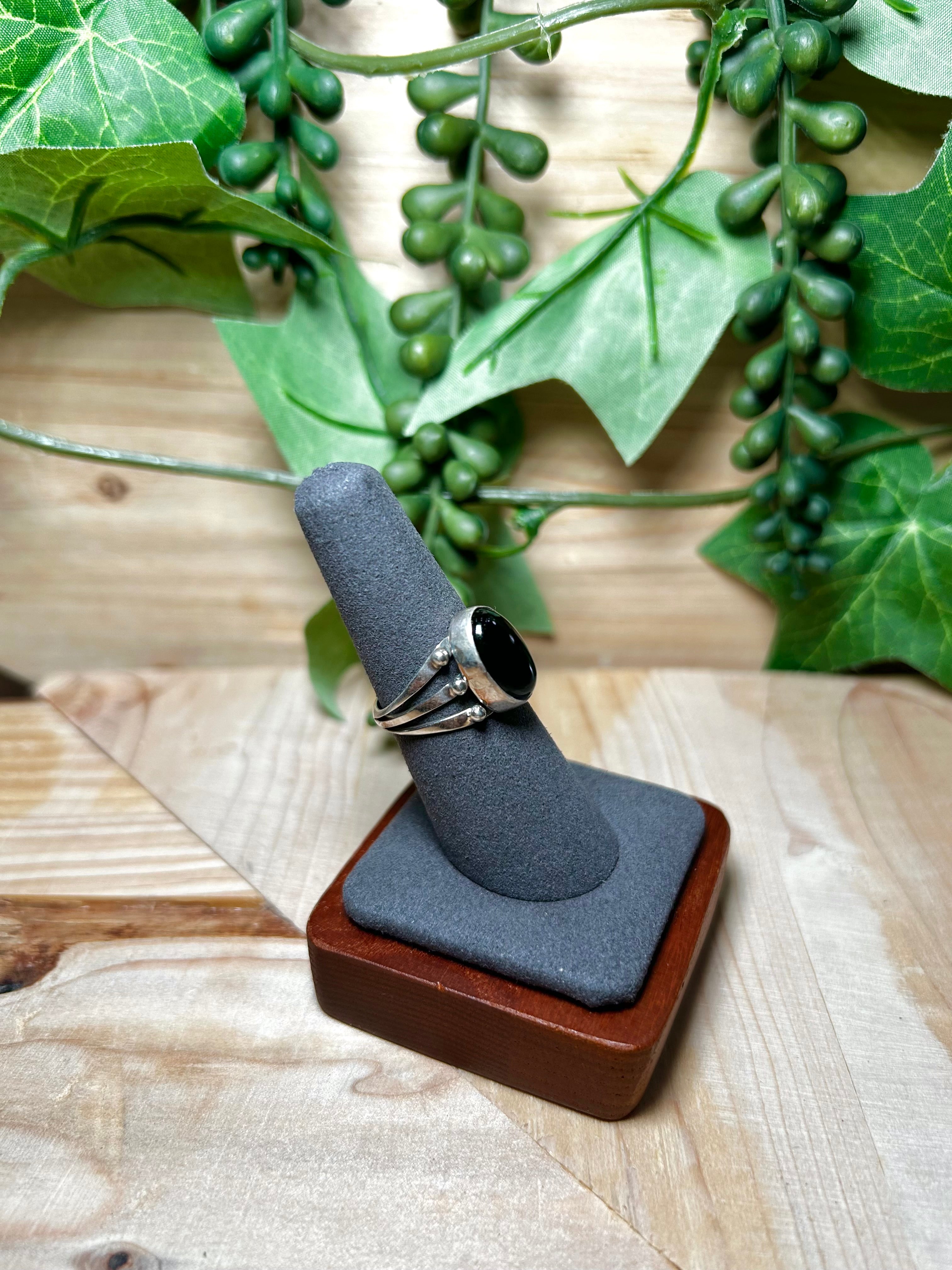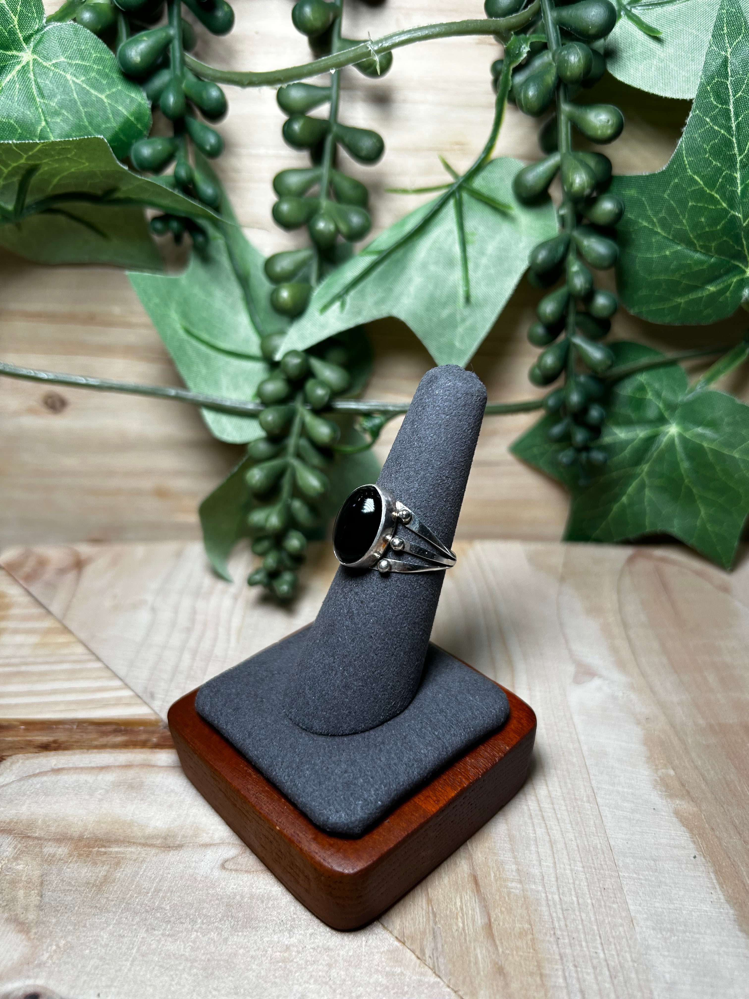 Navajo Made Onyx & Sterling Silver Ring. It measures 5/8 of an inch long and 1/2 of an inch wide. Signed by the artist and stamped sterling silver.