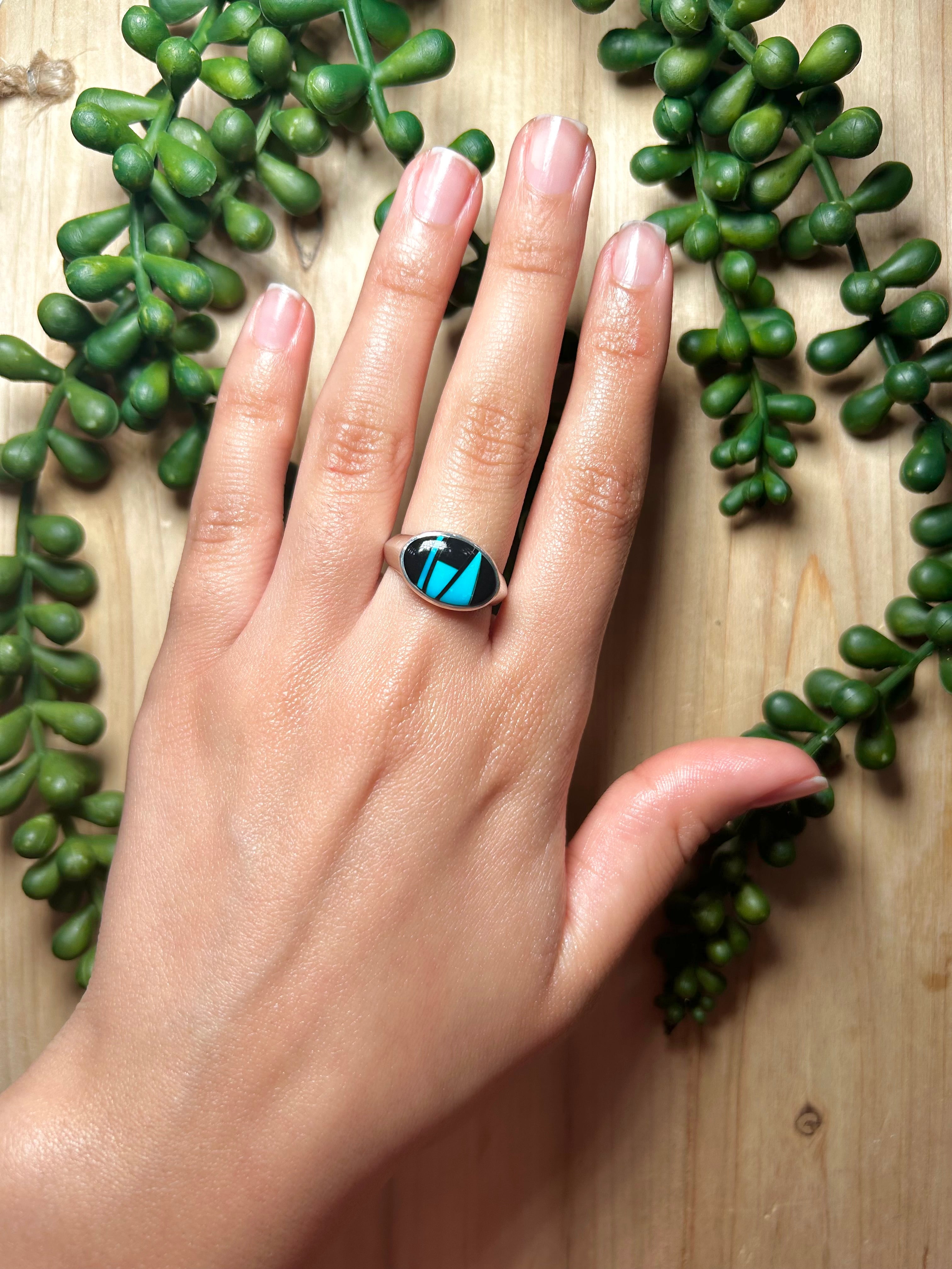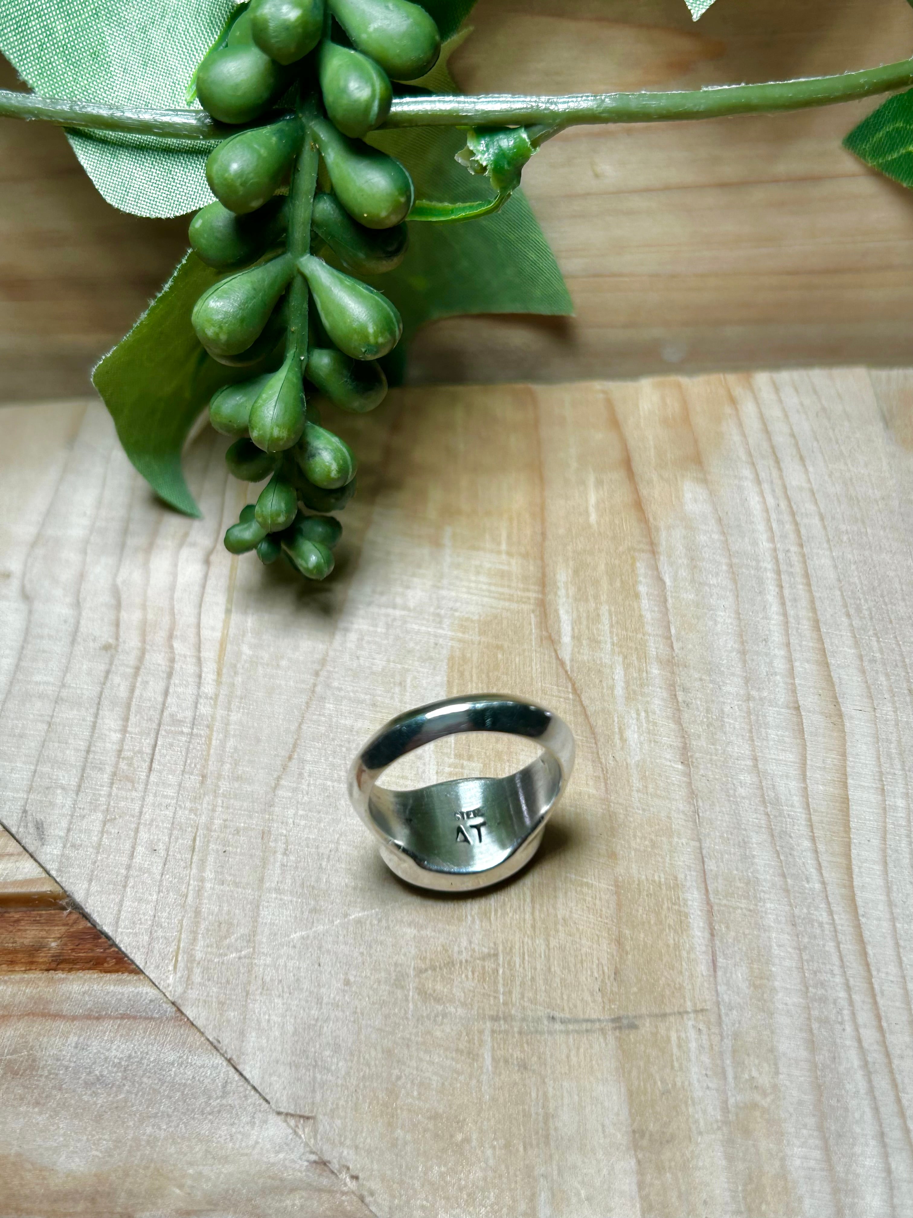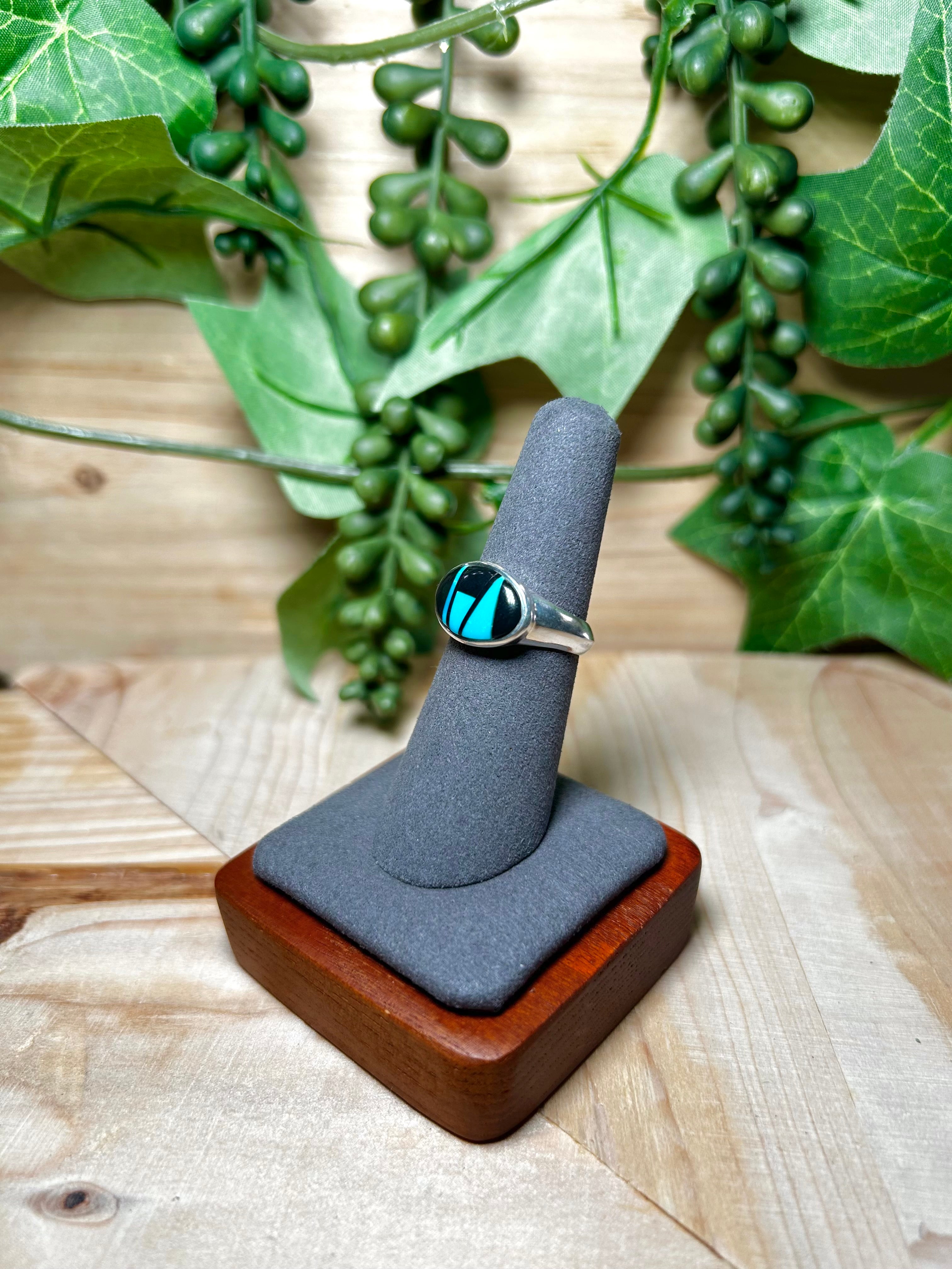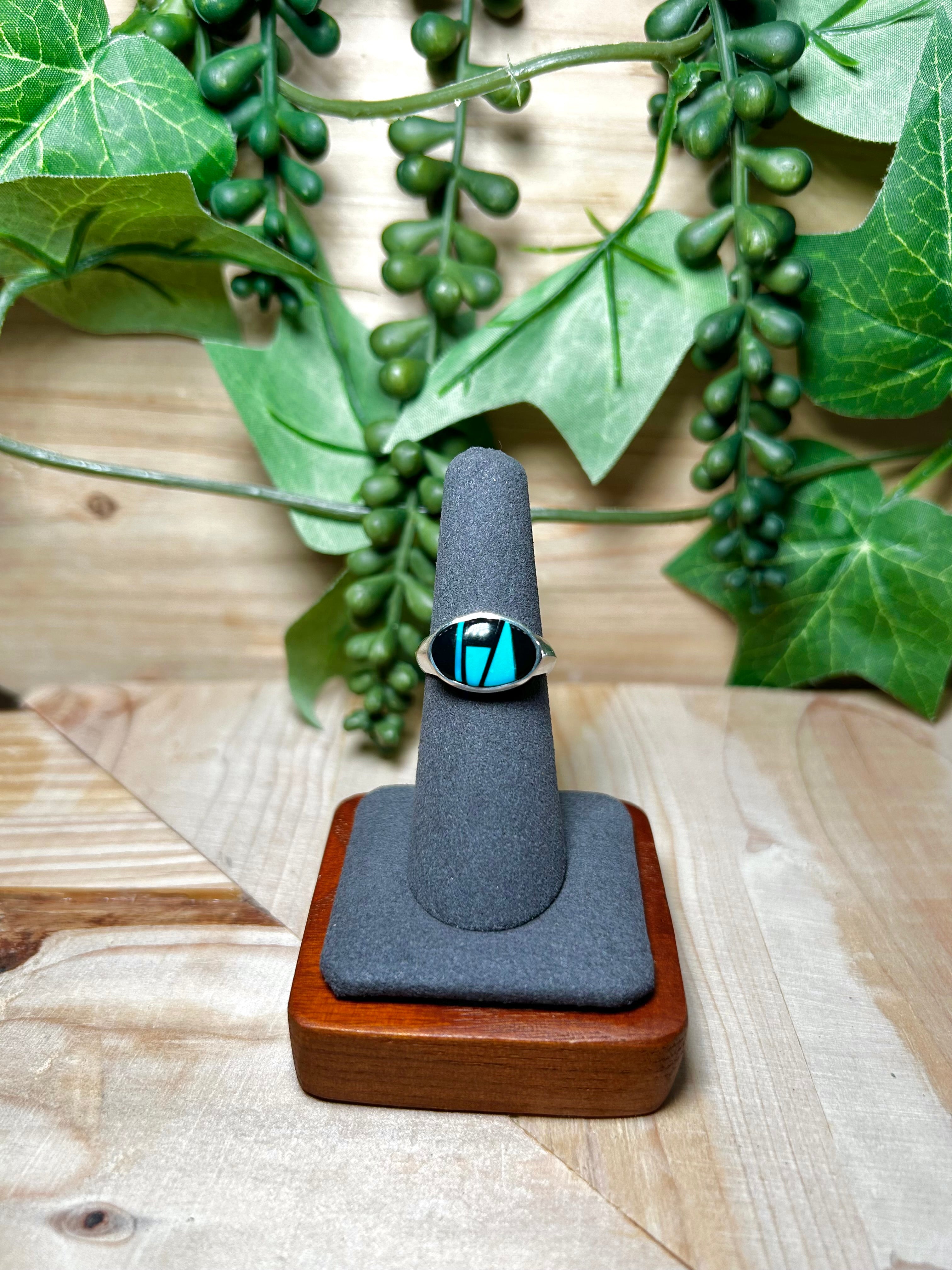 Navajo Made Multi Stone & Sterling Silver Ring. It measures 5/8 of an inch long and 1/2 of an inch wide. Signed by the artist and stamped sterling silver.