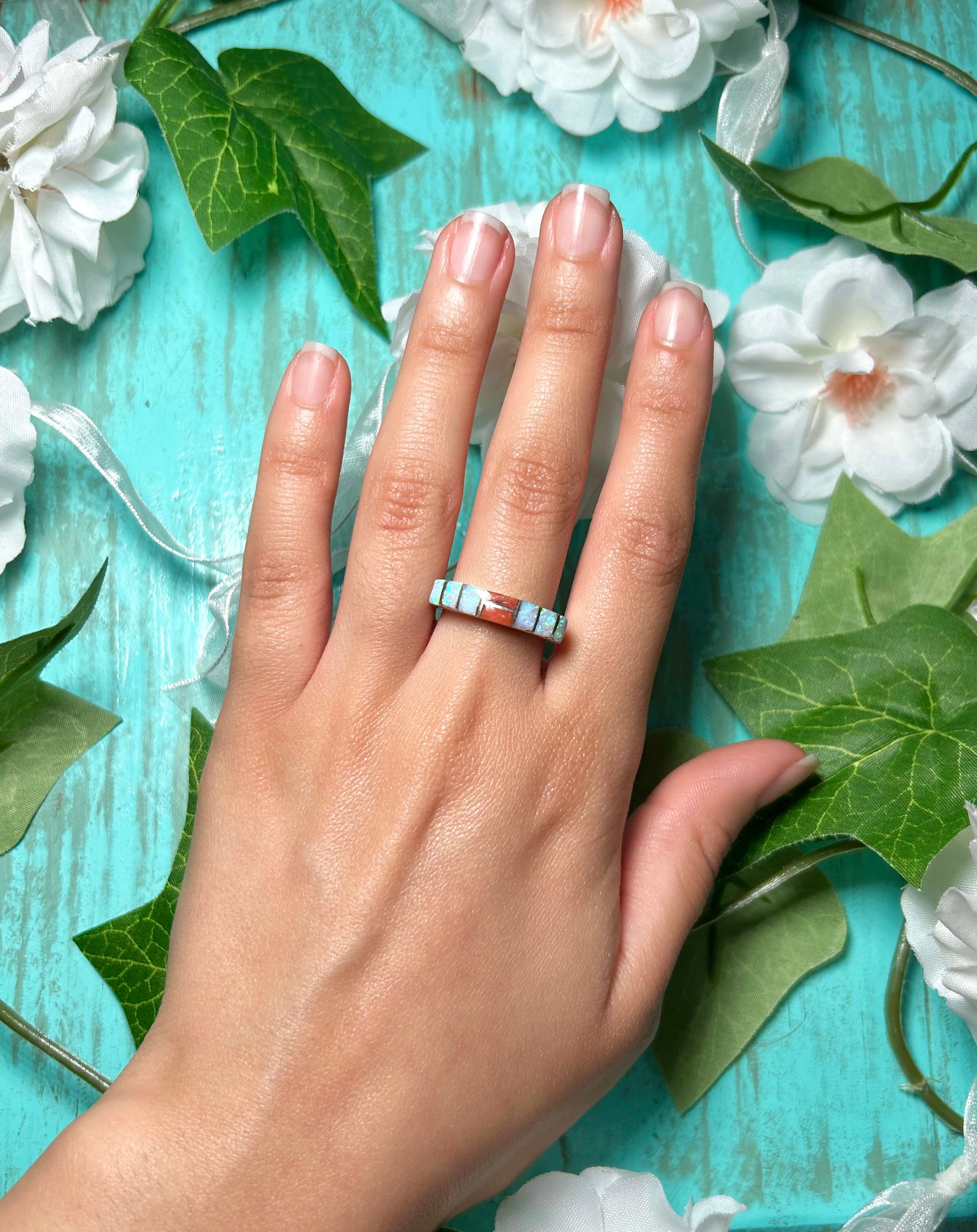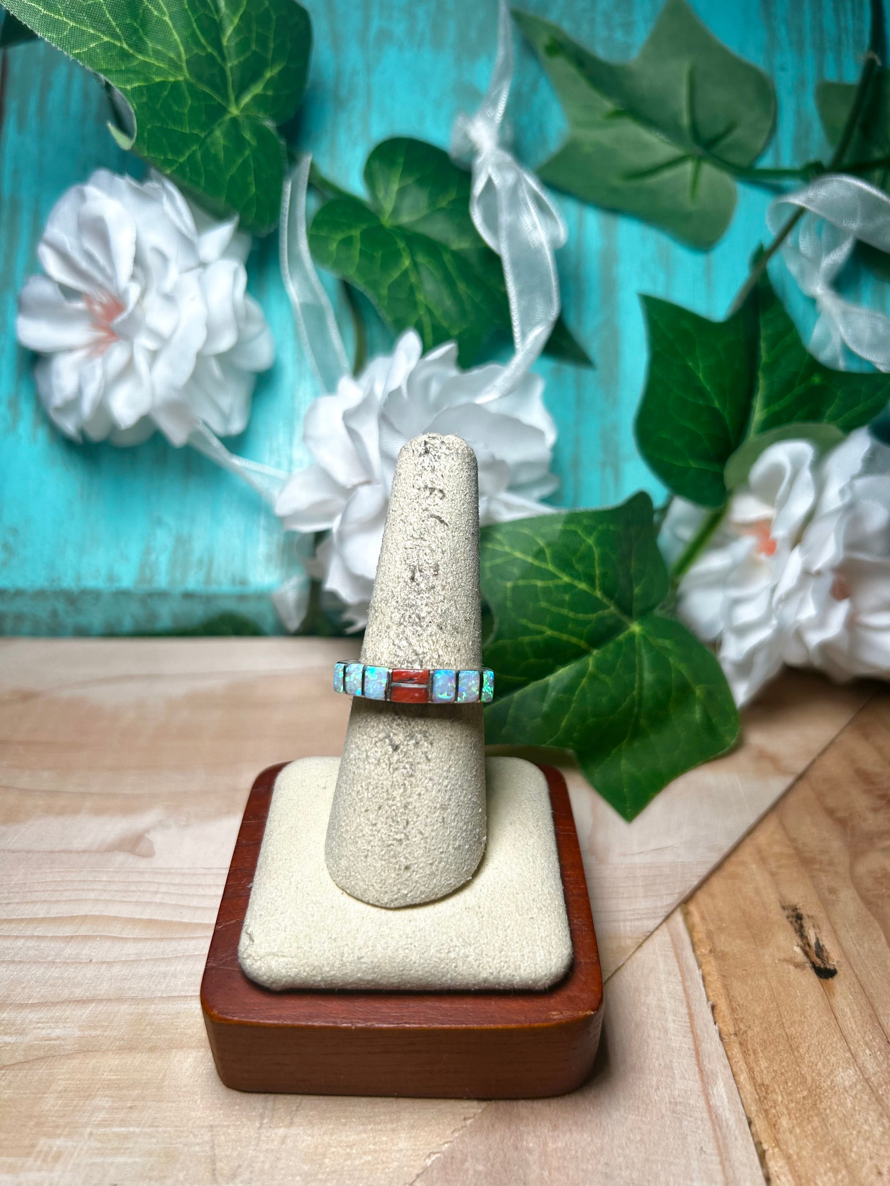 Navajo Made Multi Stone & Sterling Silver Ring Size 8. It measures 1/8 of an inch long and 7/8 of an inch wide. Stamped sterling silver and signed. Stones will differ due to natural stones.d