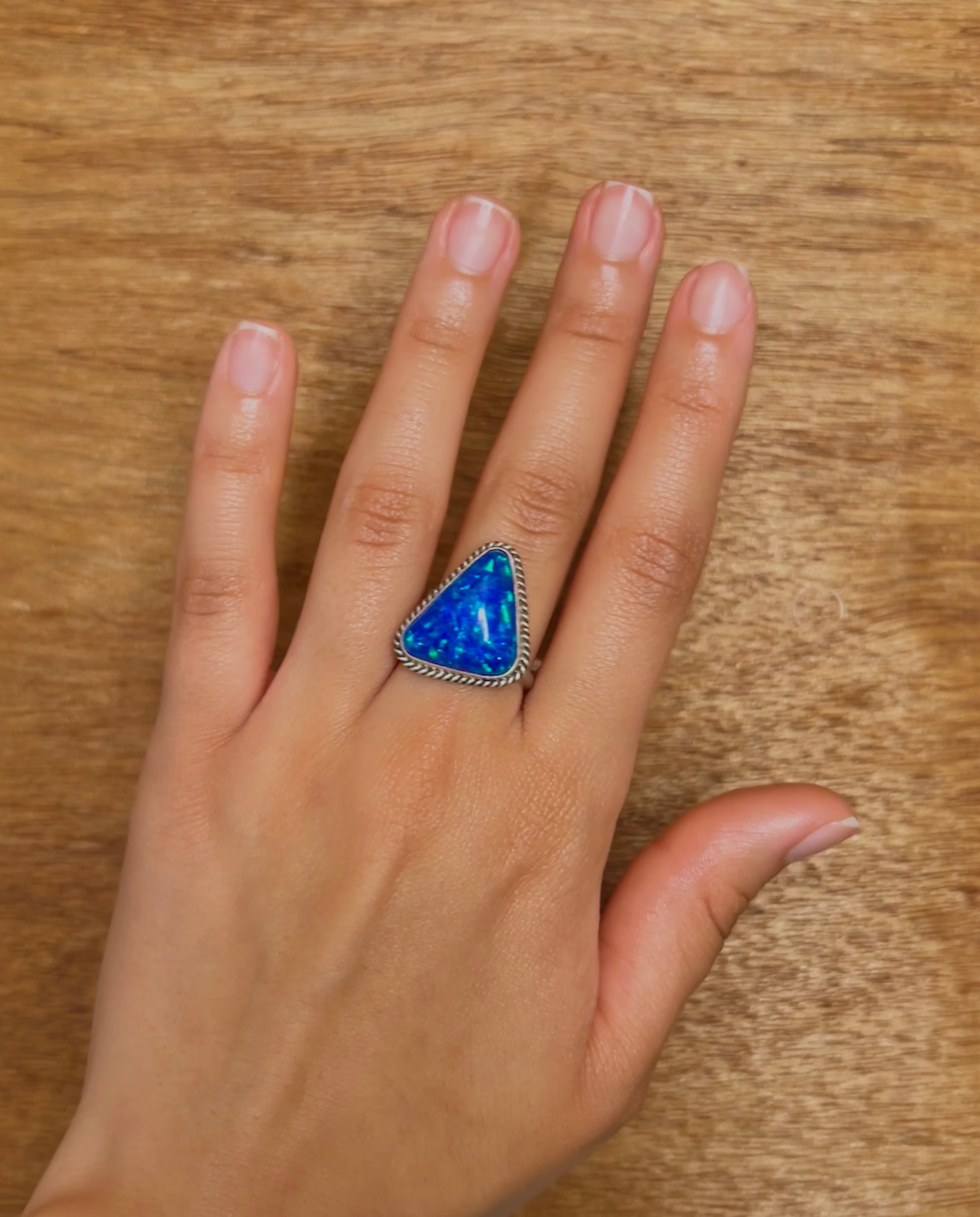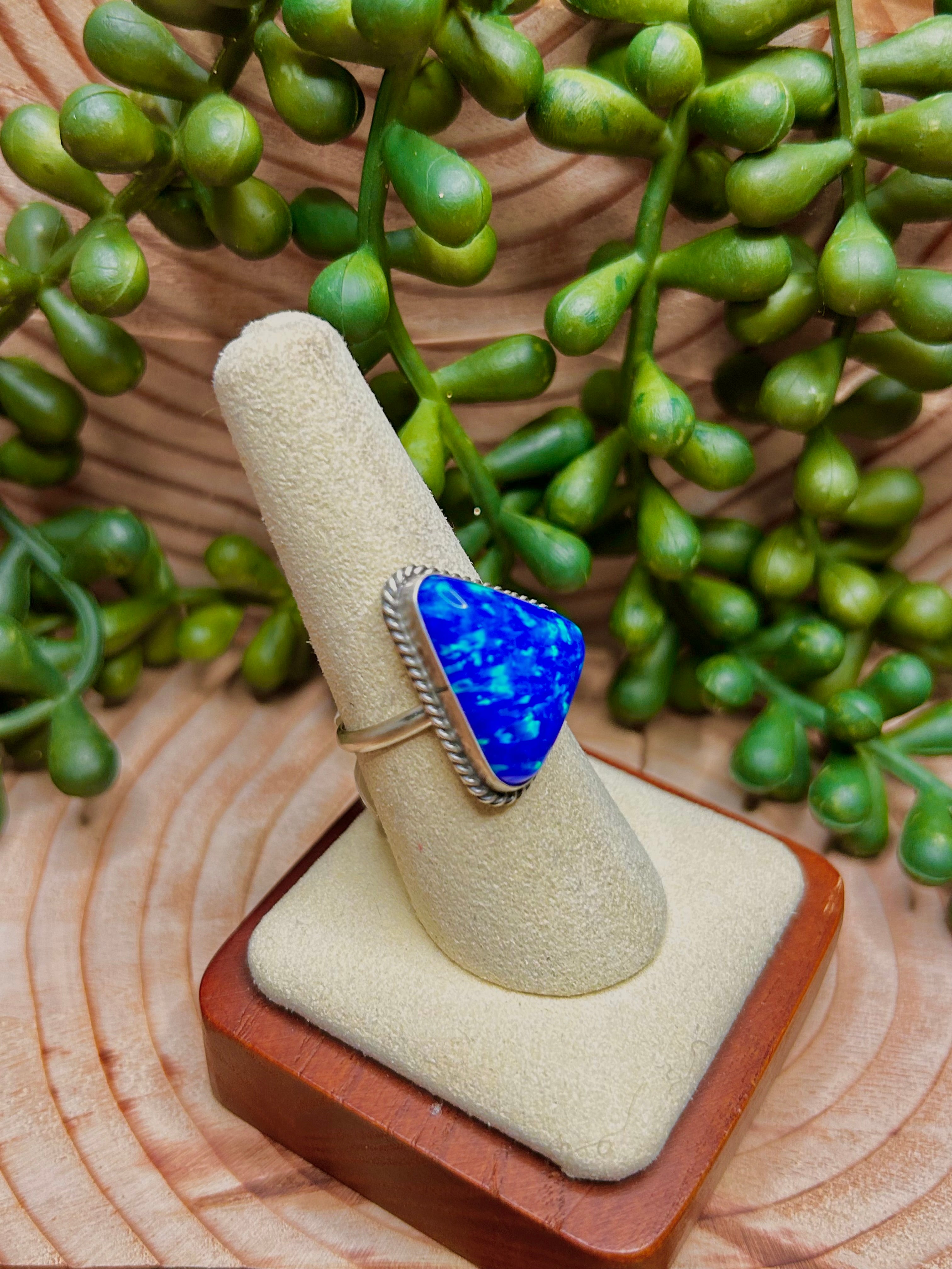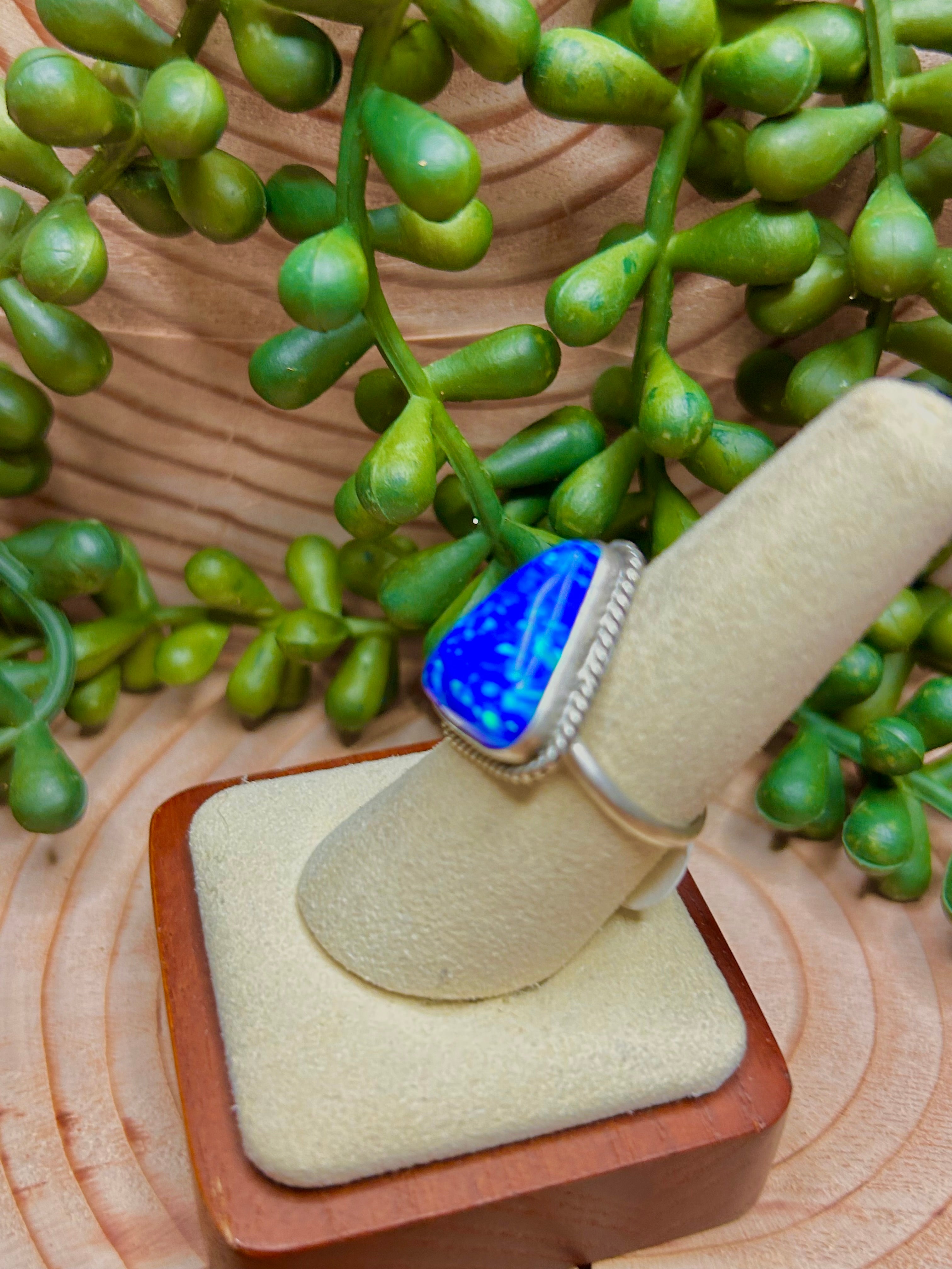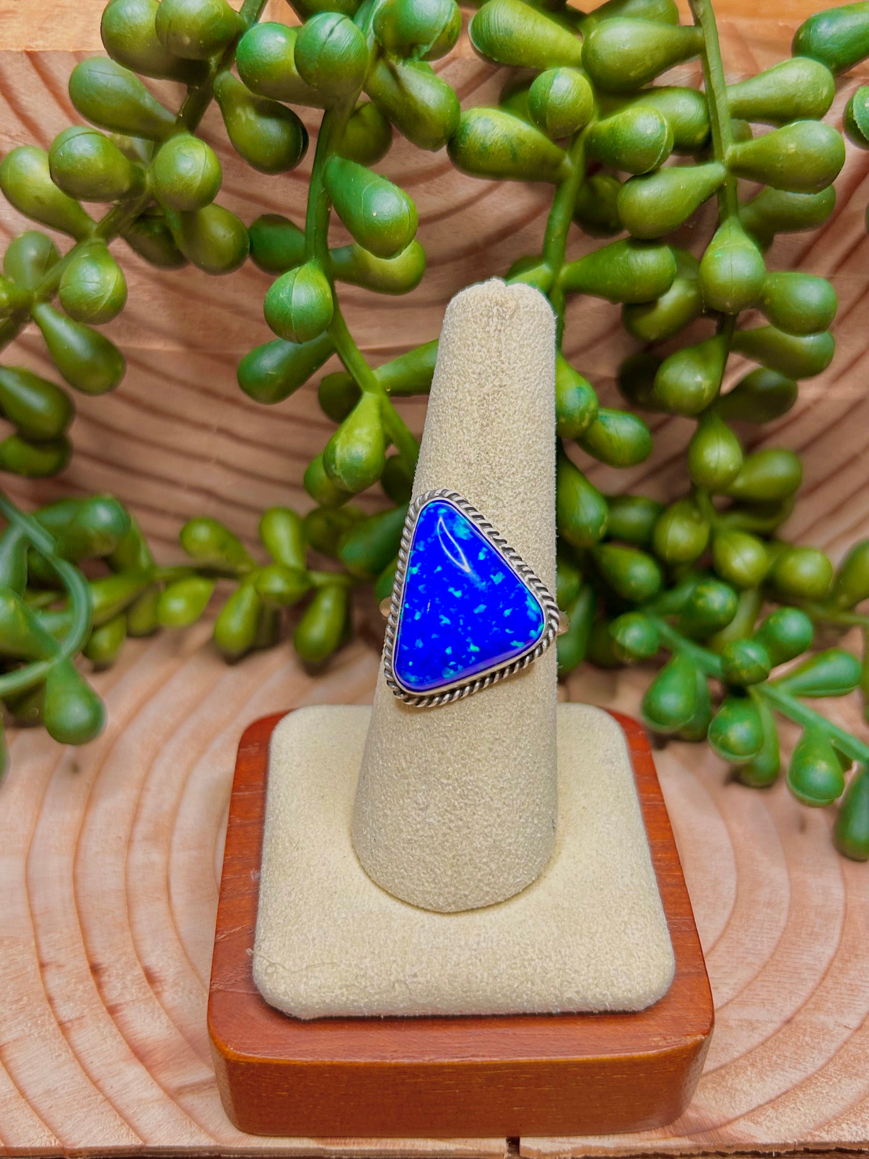 Navajo Man-Made Opal & Sterling Sliver Ring Size 8.5 It measures 7/8 of an inch long 3/4 of an inch wide and Signed by the artist and stamped sterling silver.