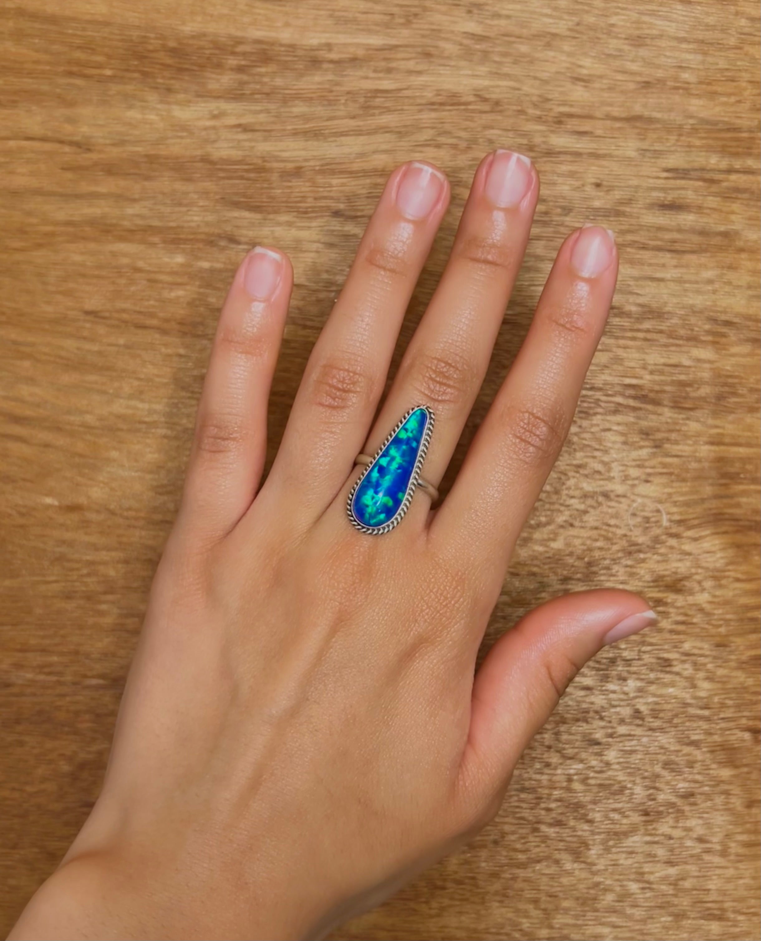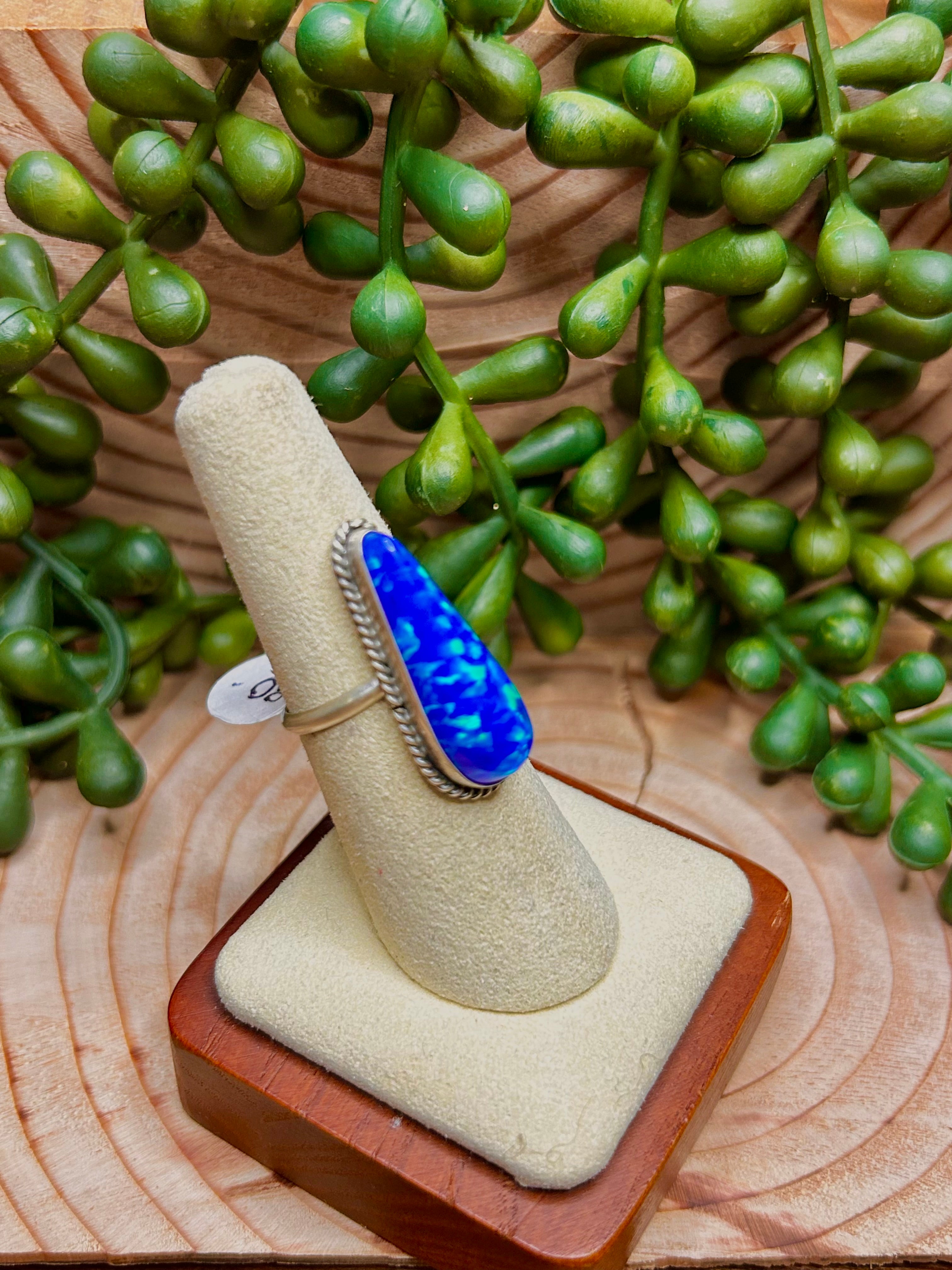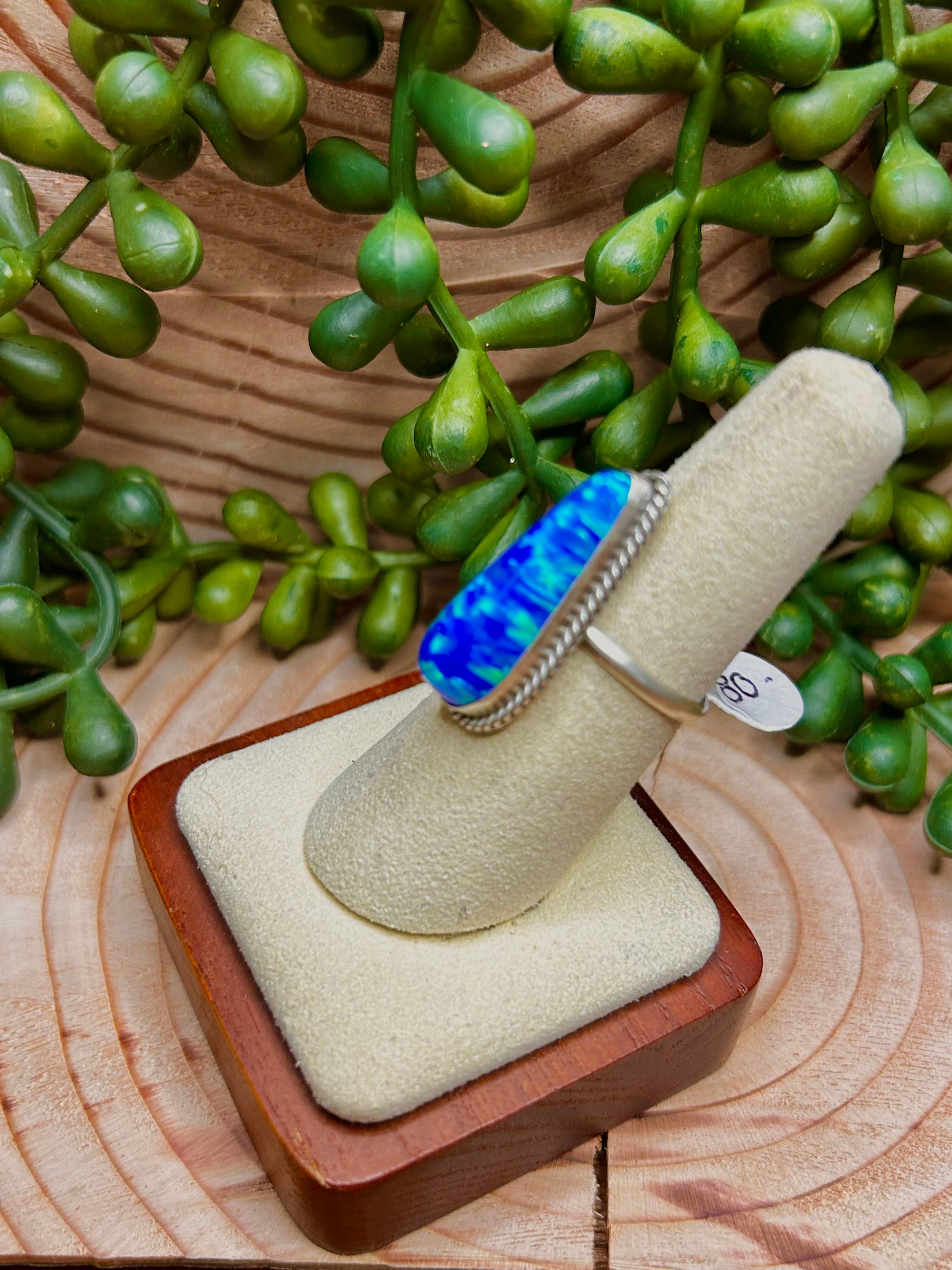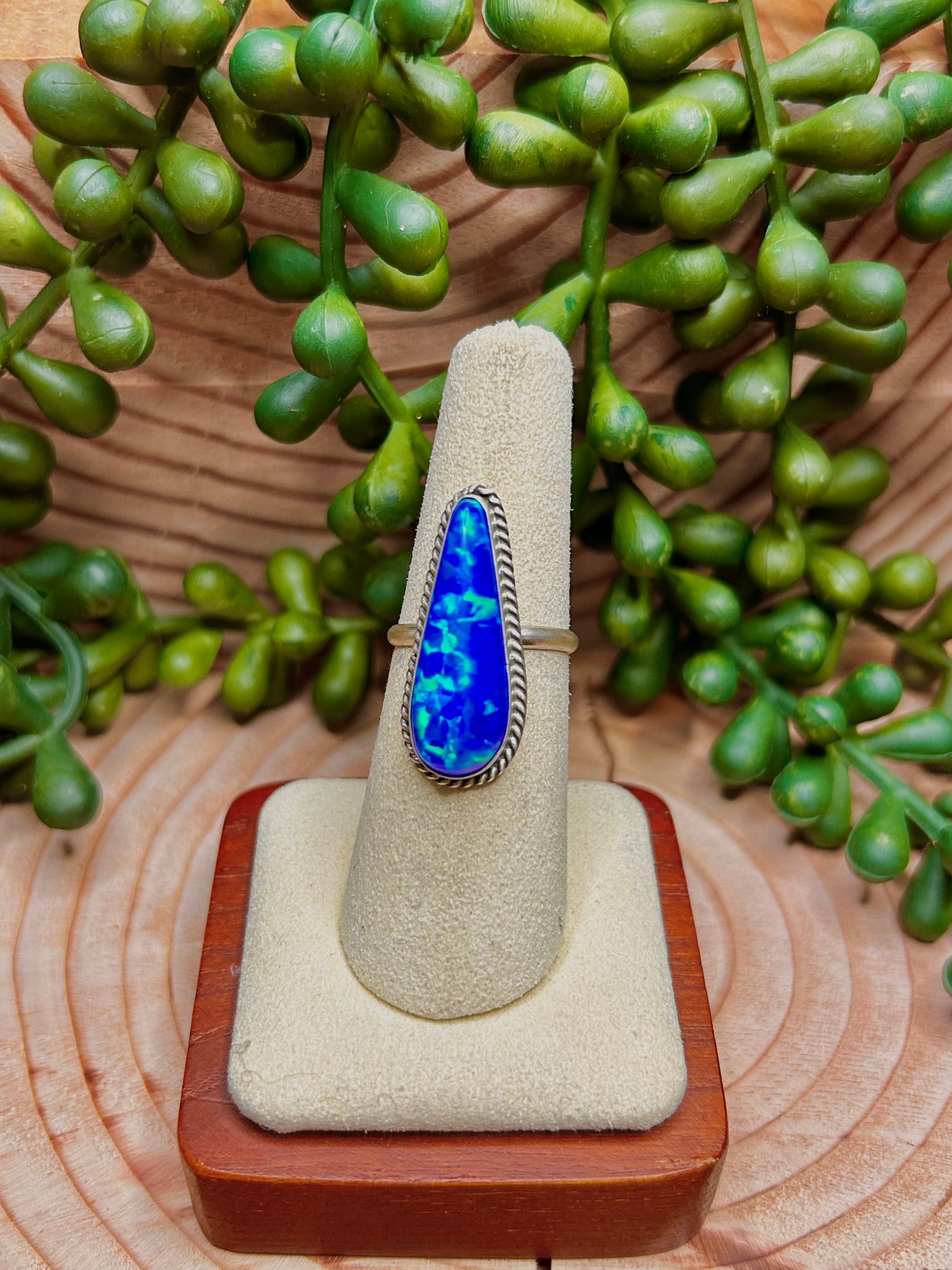 Navajo Man-Made Opal & Sterling Sliver Ring Size 6.25. It measures 1 1/8 inches long 1/2 of an inch wide and Signed by the artist and stamped sterling silver.
