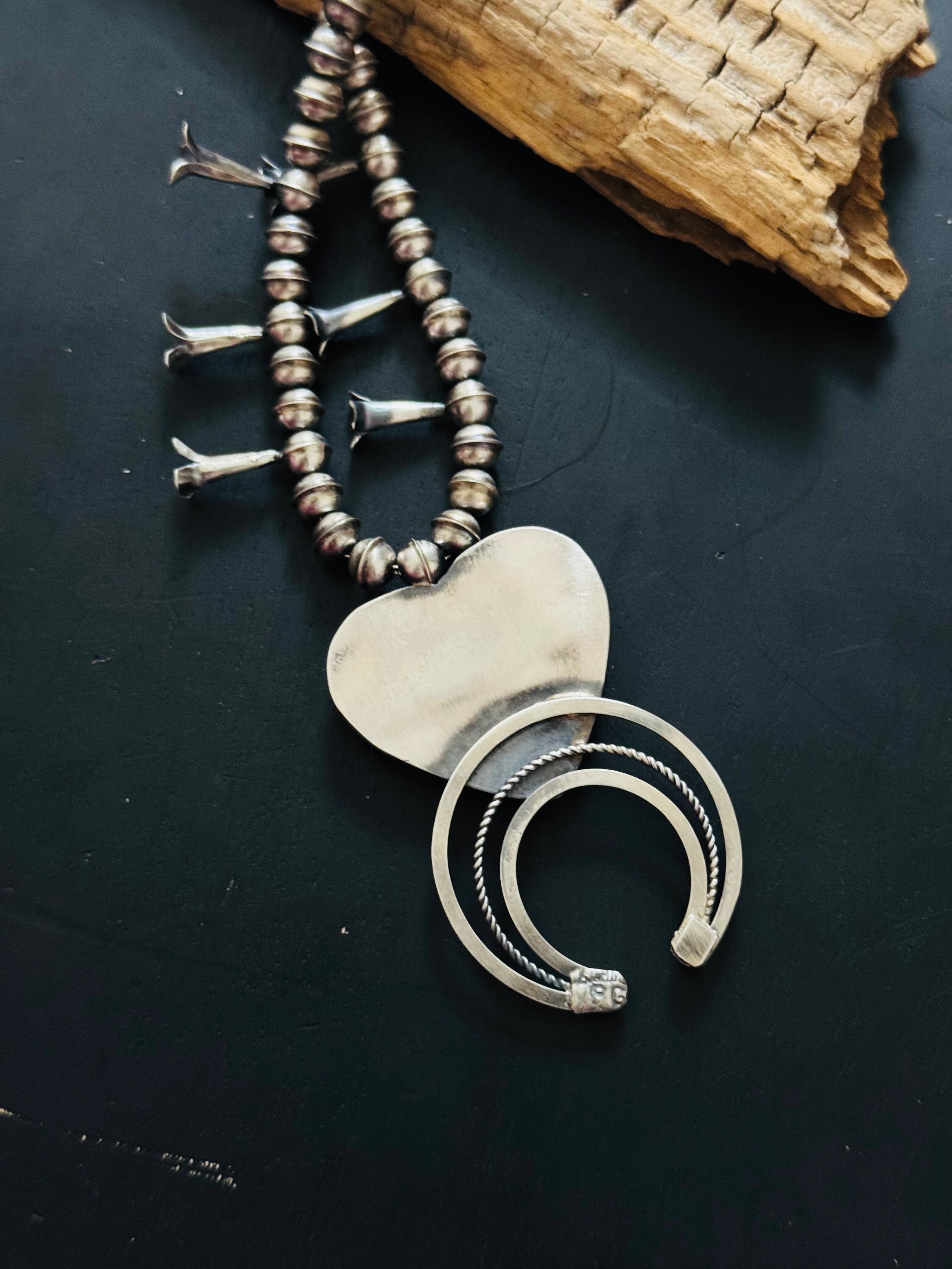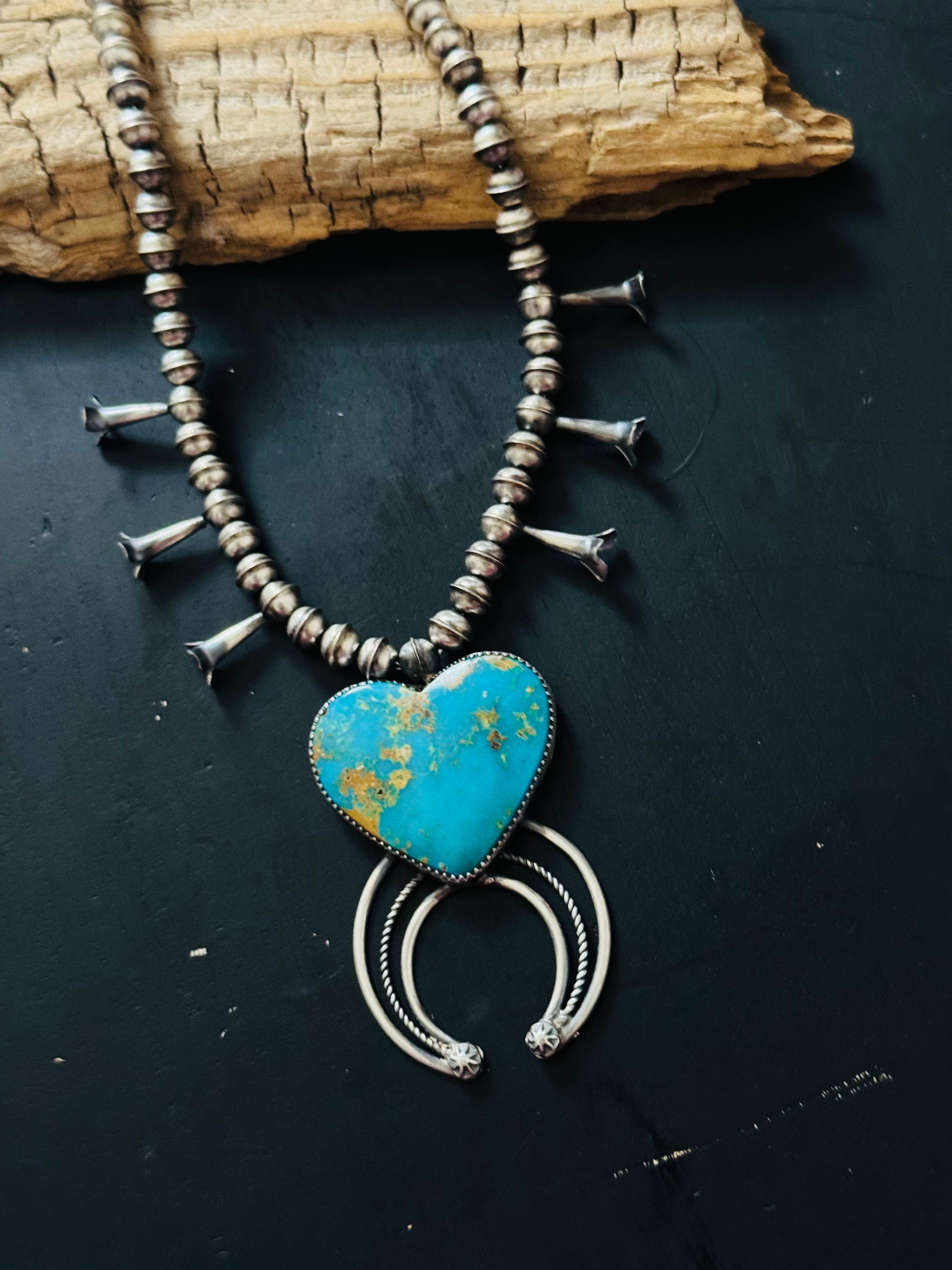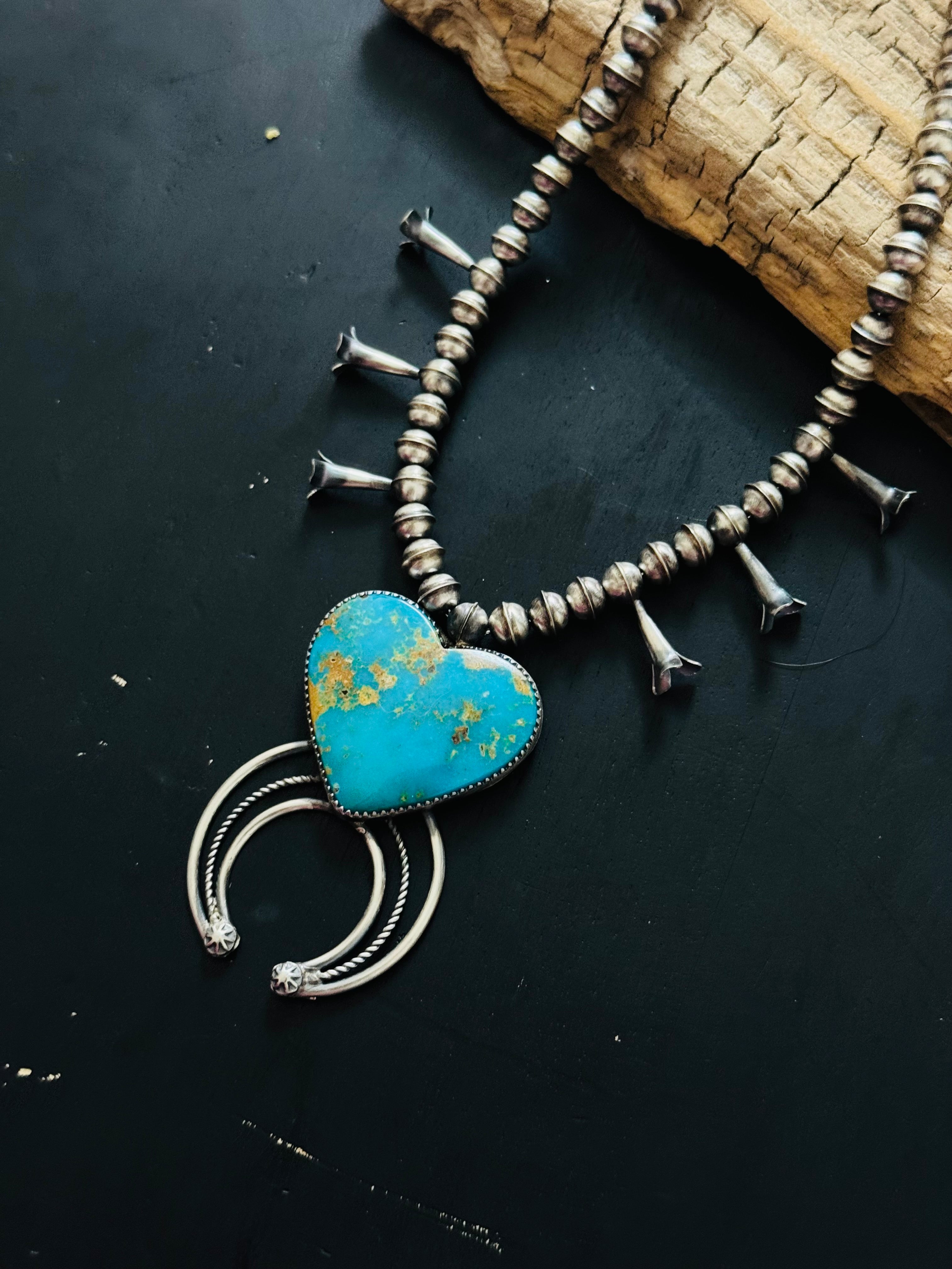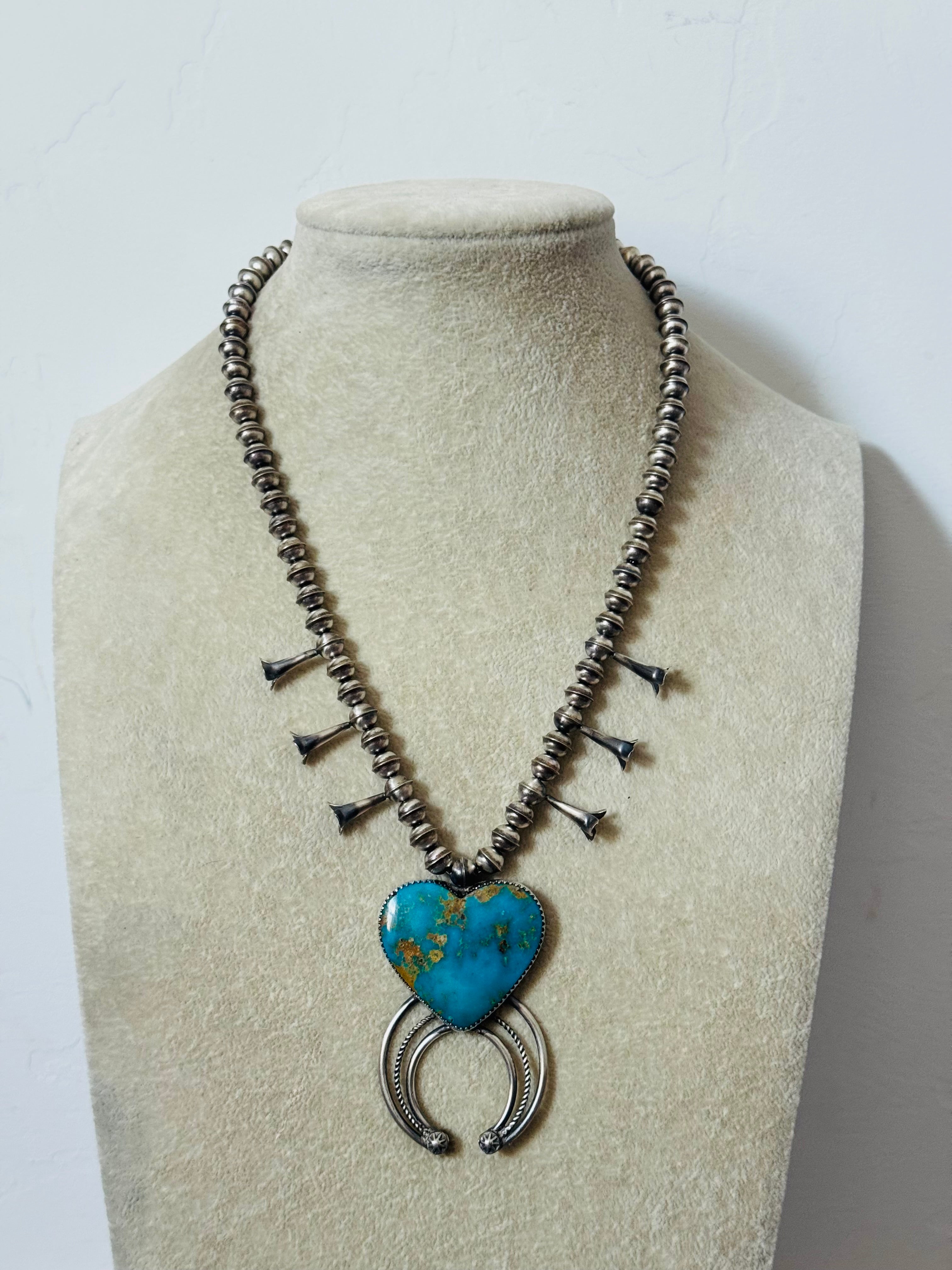Navajo Made Campitos Turquoise & Sterling Silver Squash Blossom Necklace