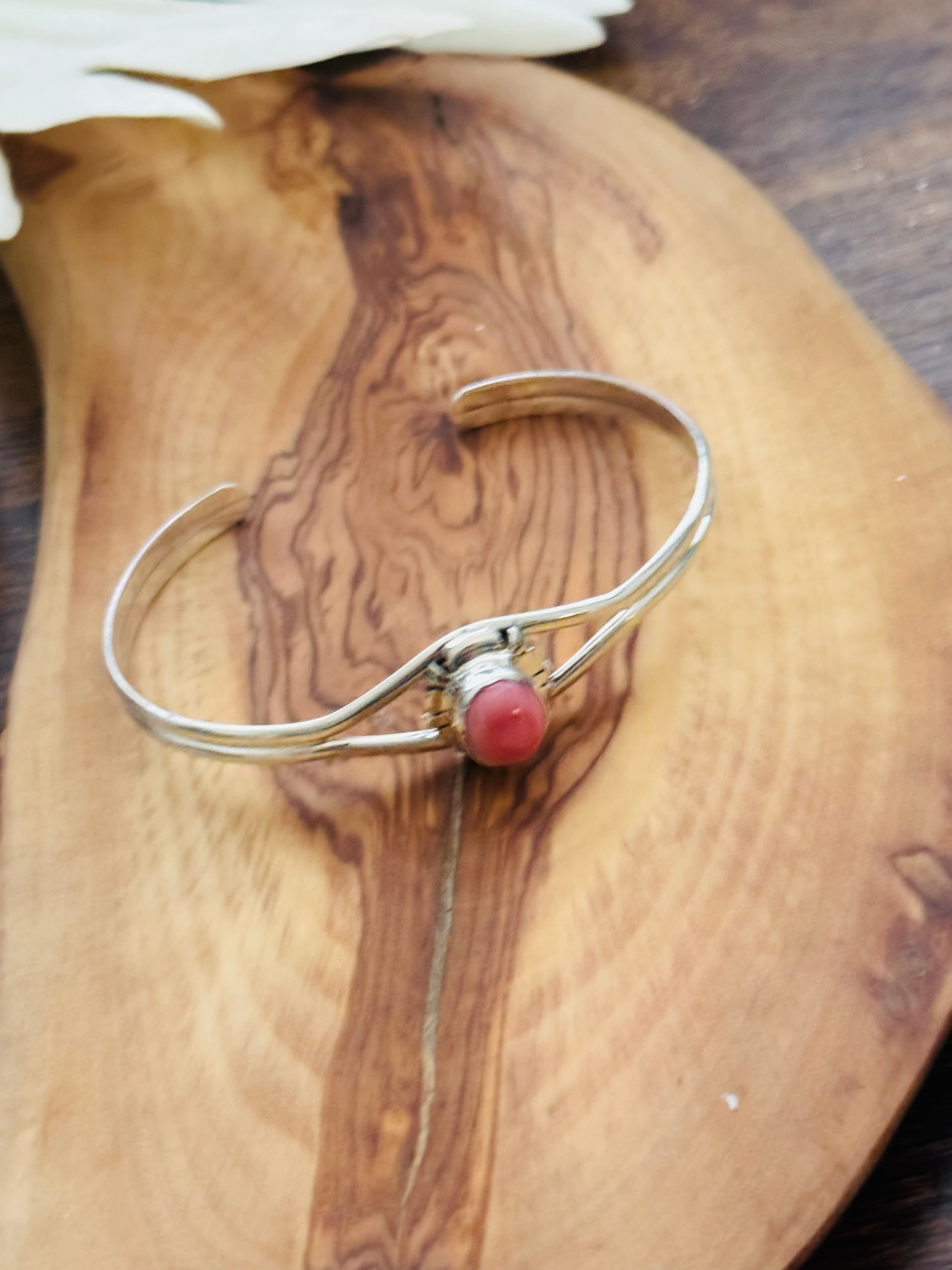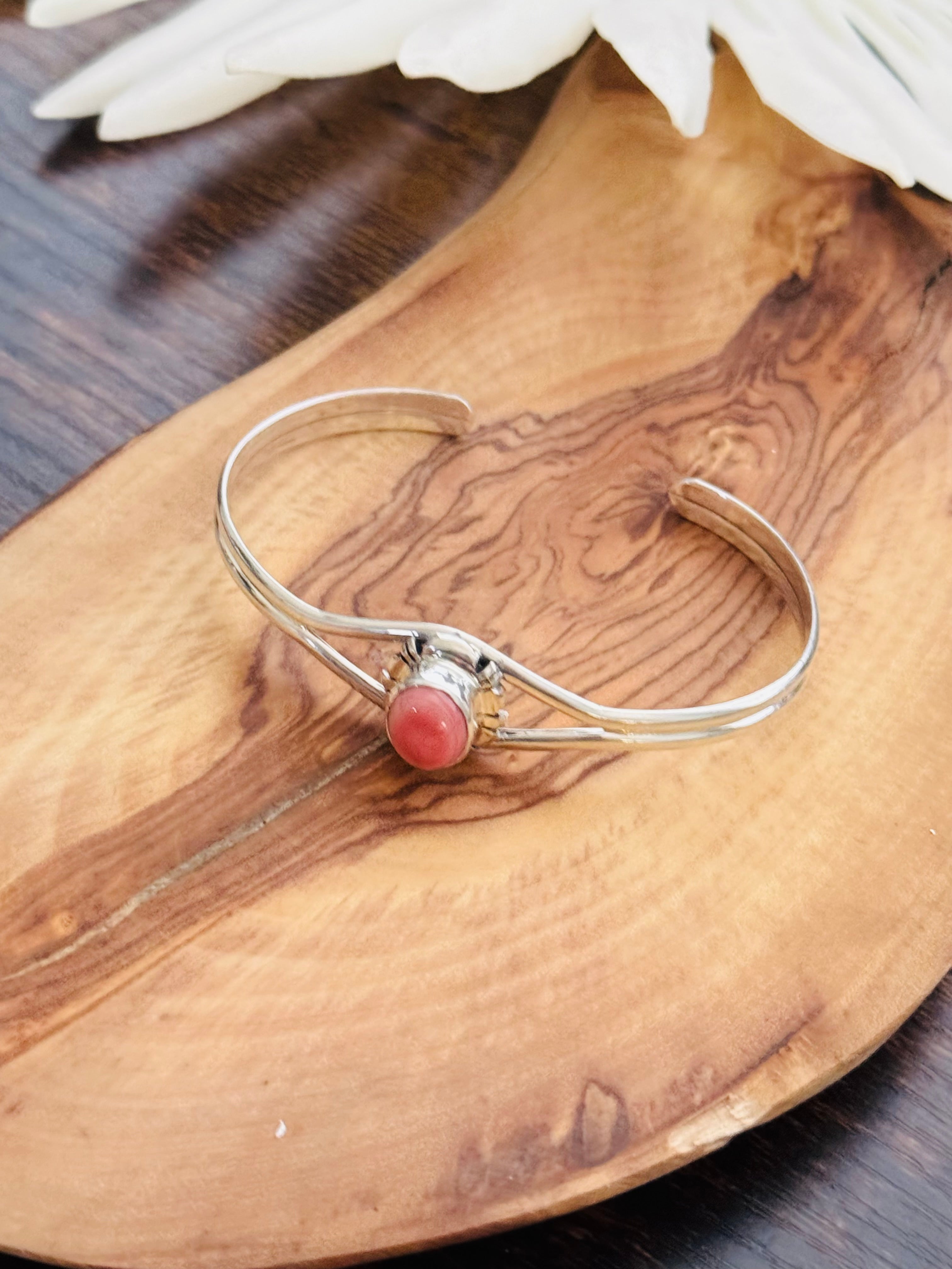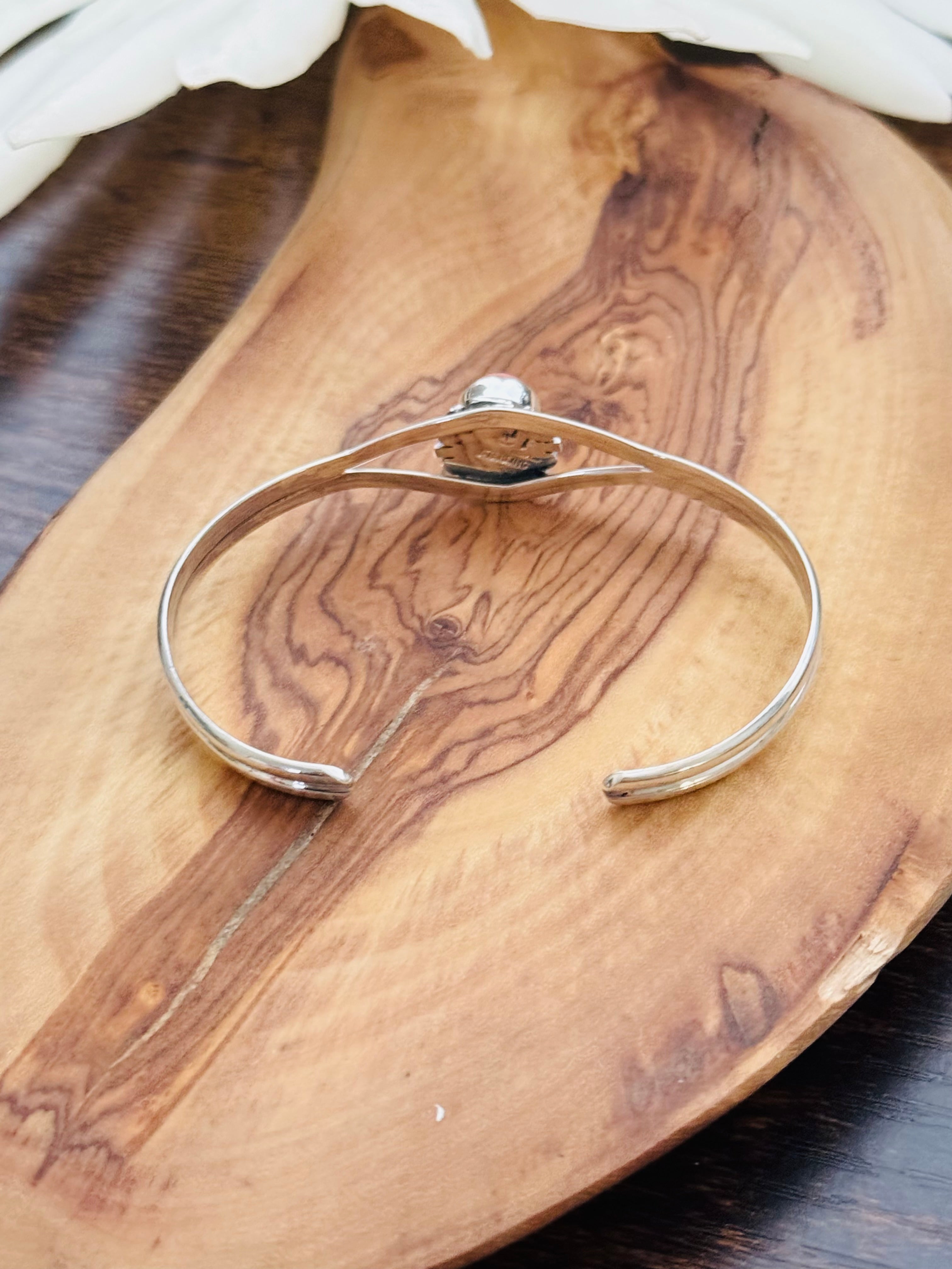 Jeff Frank Pink Conch & Sterling Silver Cuff Bracelet. It measures 1/2 of an inch wide with an inside circumference of 5 3/8 inches and a gap of 1 inch. Signed by the artist and stamped sterling silver.