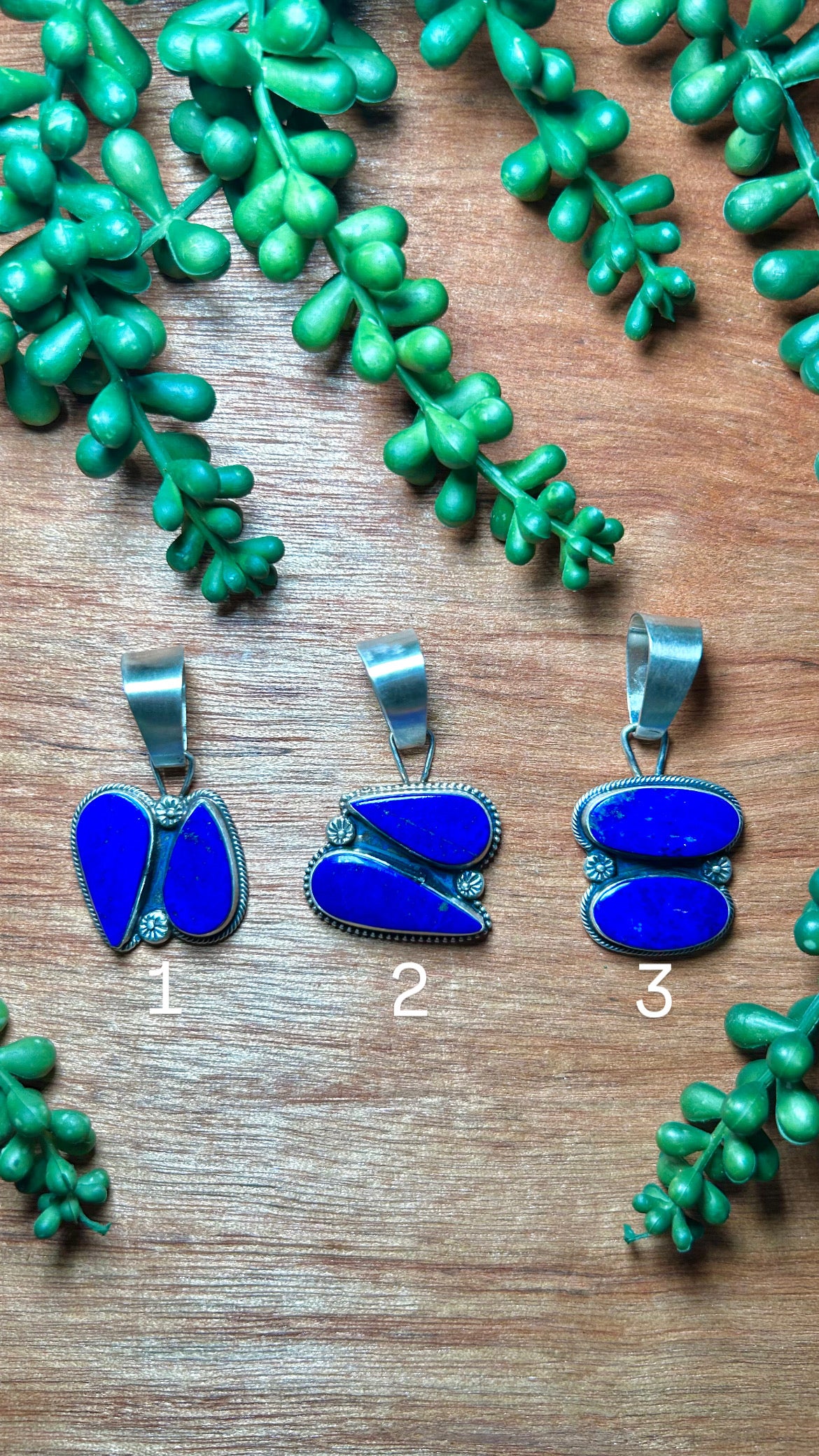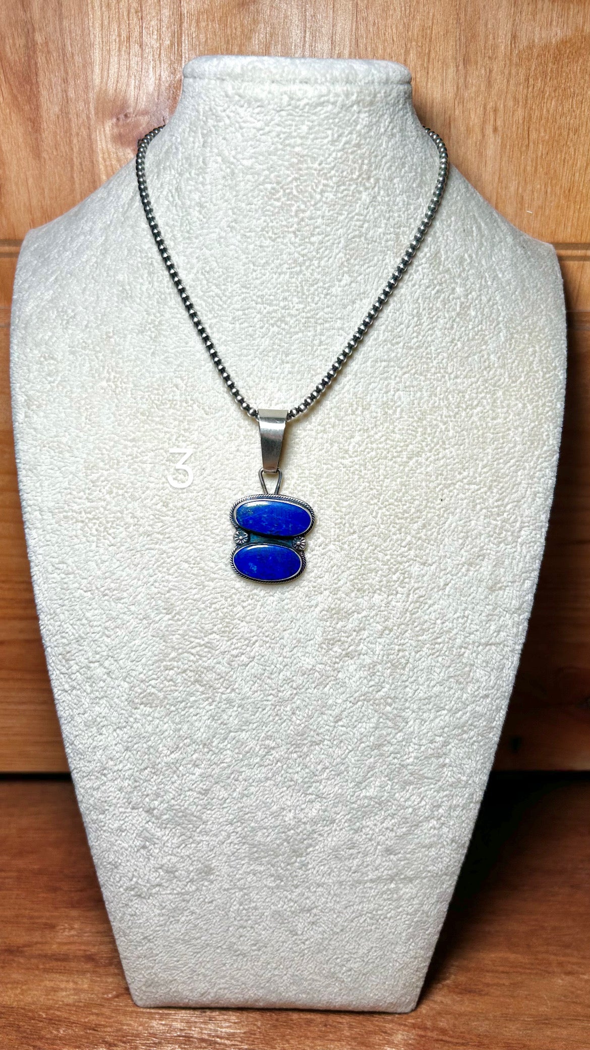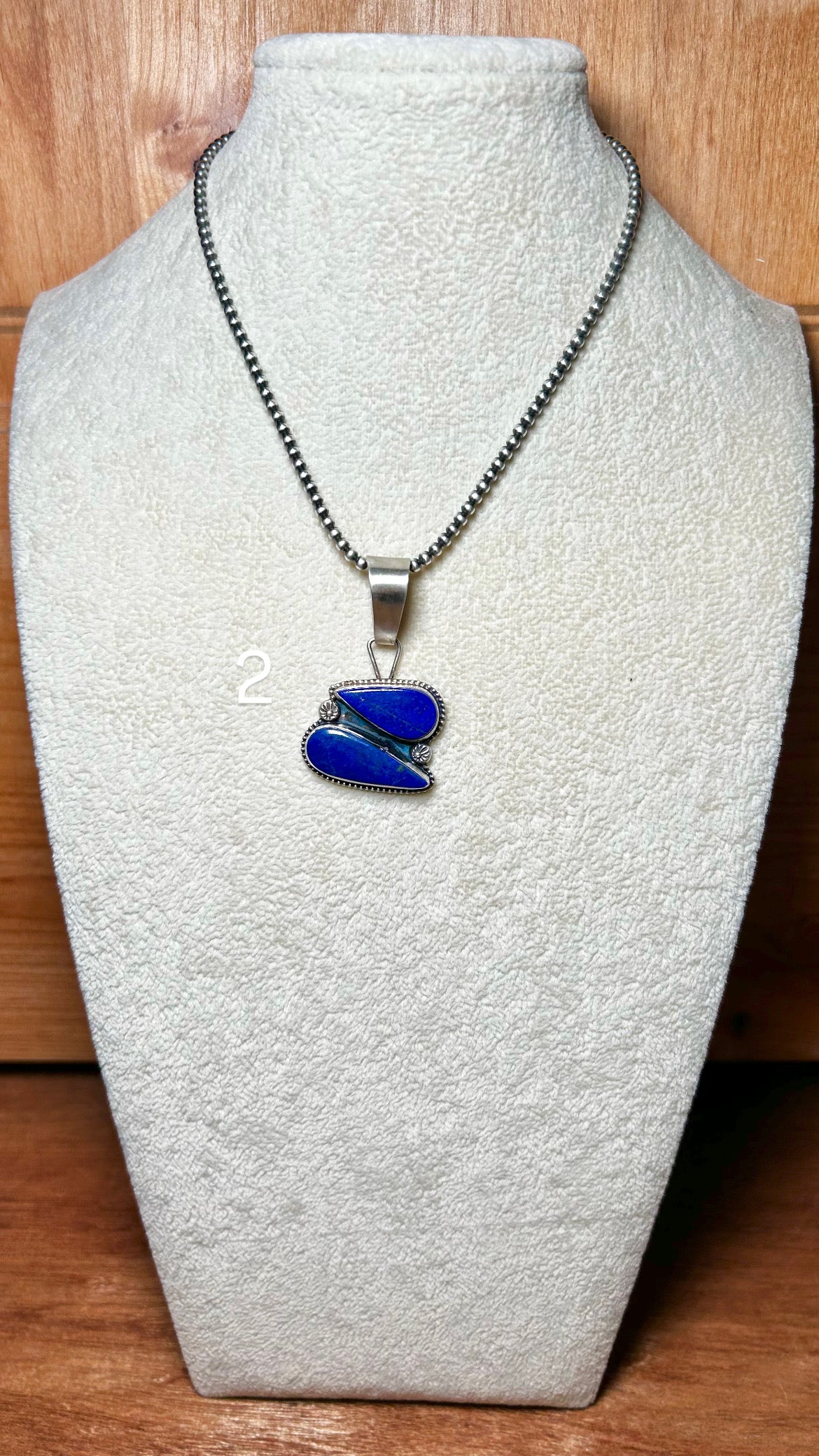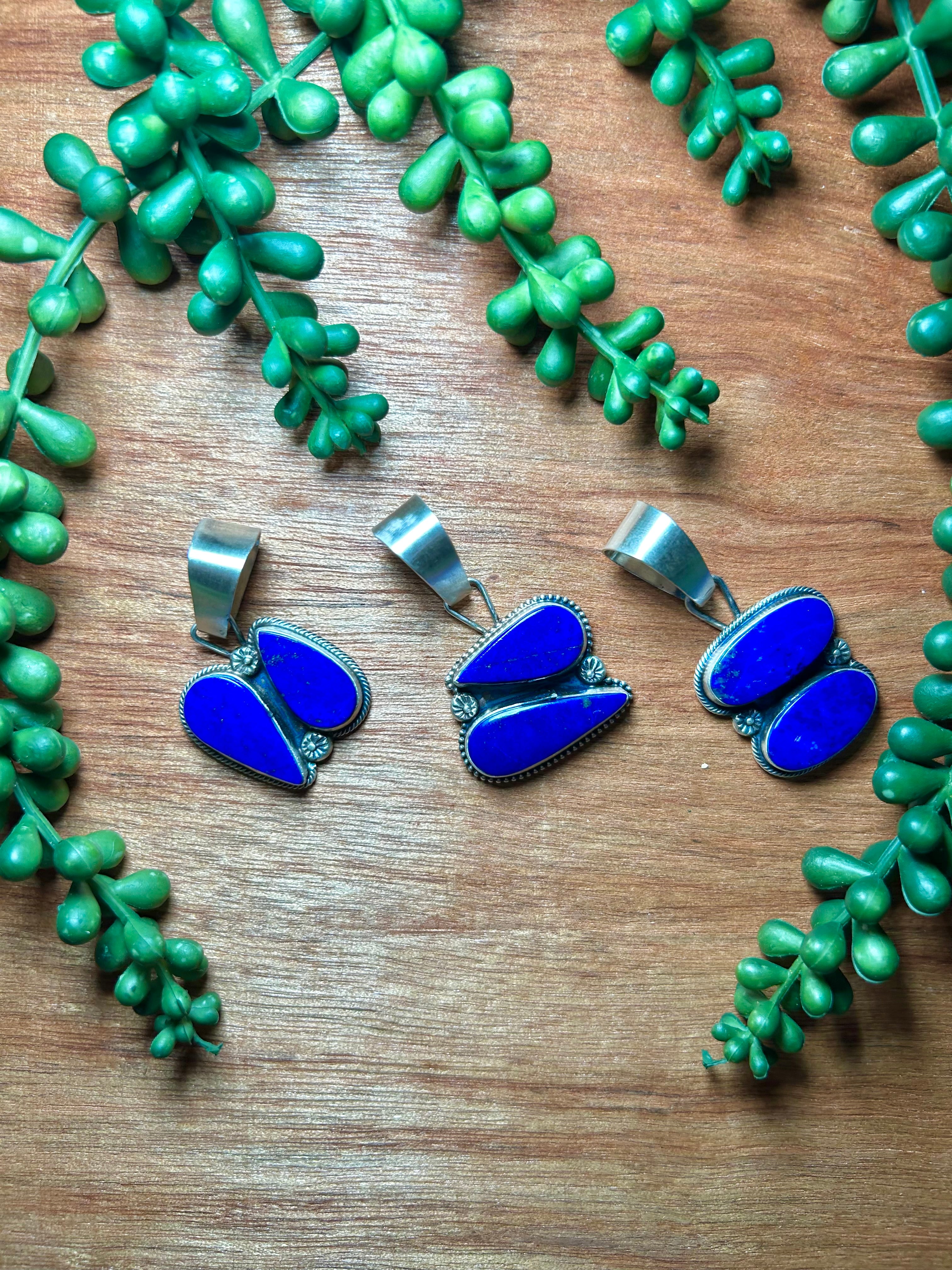 Navajo Made Lapis & Sterling Silver Pendant. It measures 2 inches long and 1 inch wide. Pendant Only! Signed by the artist and stamped sterling silver.