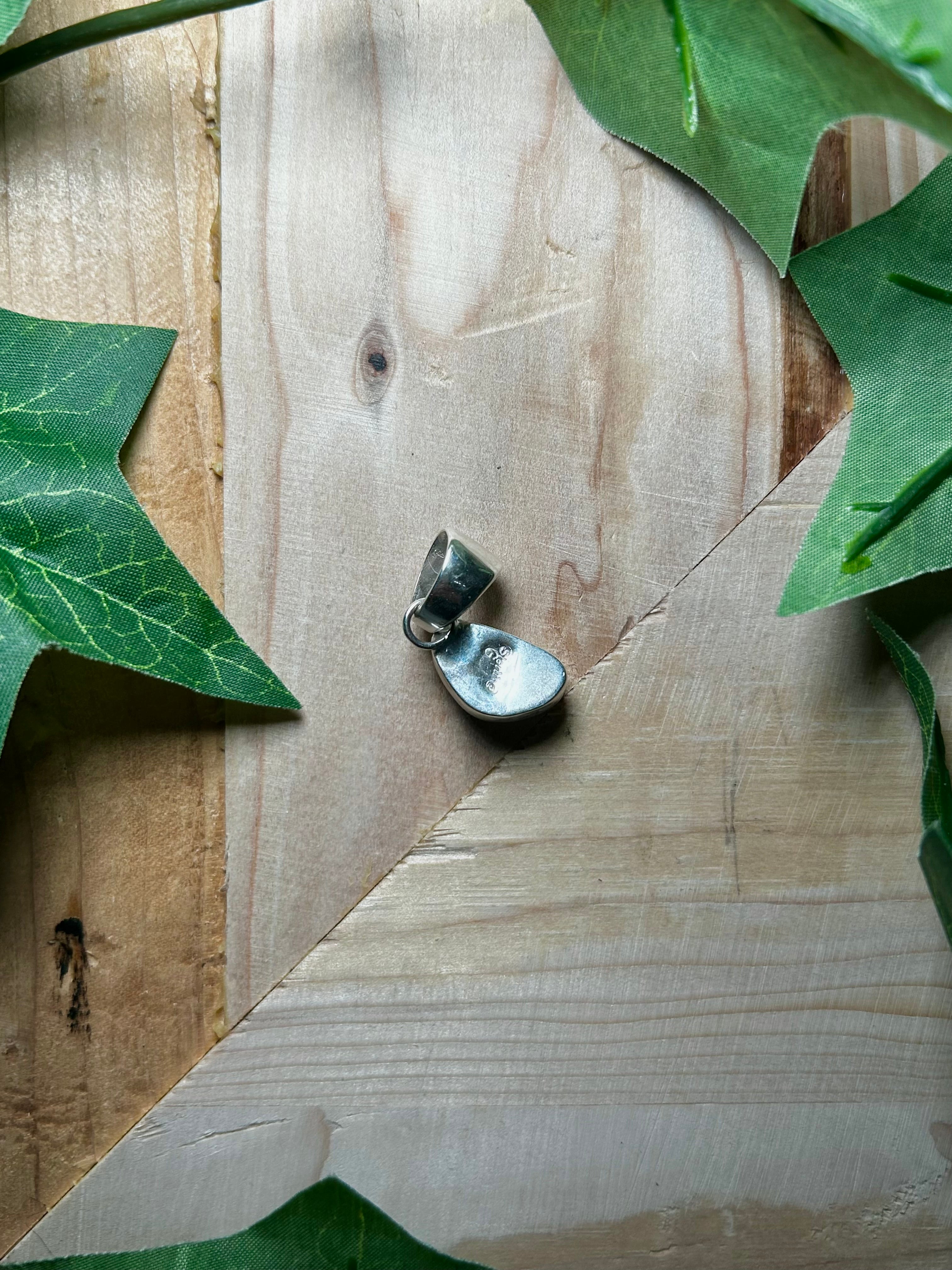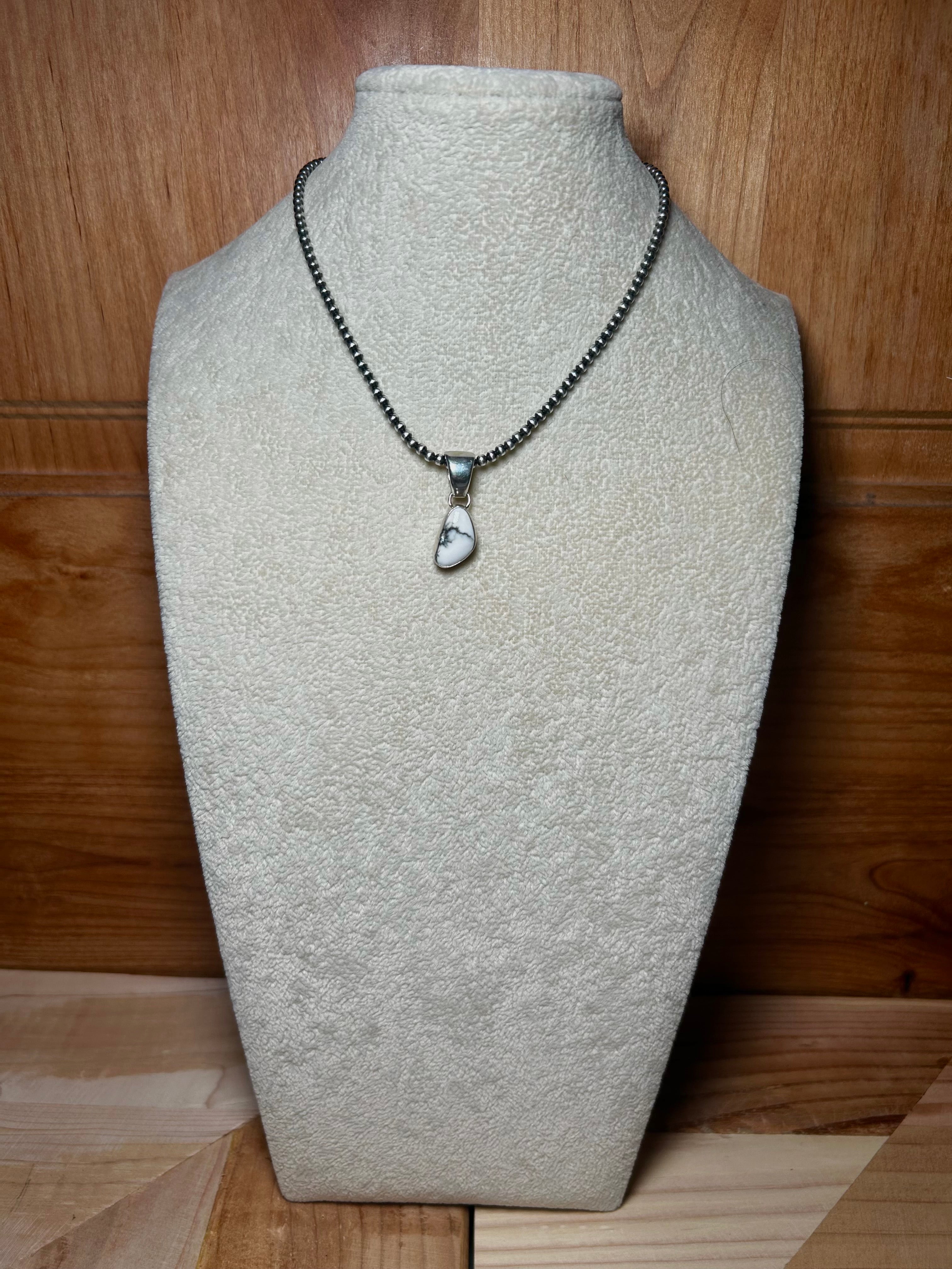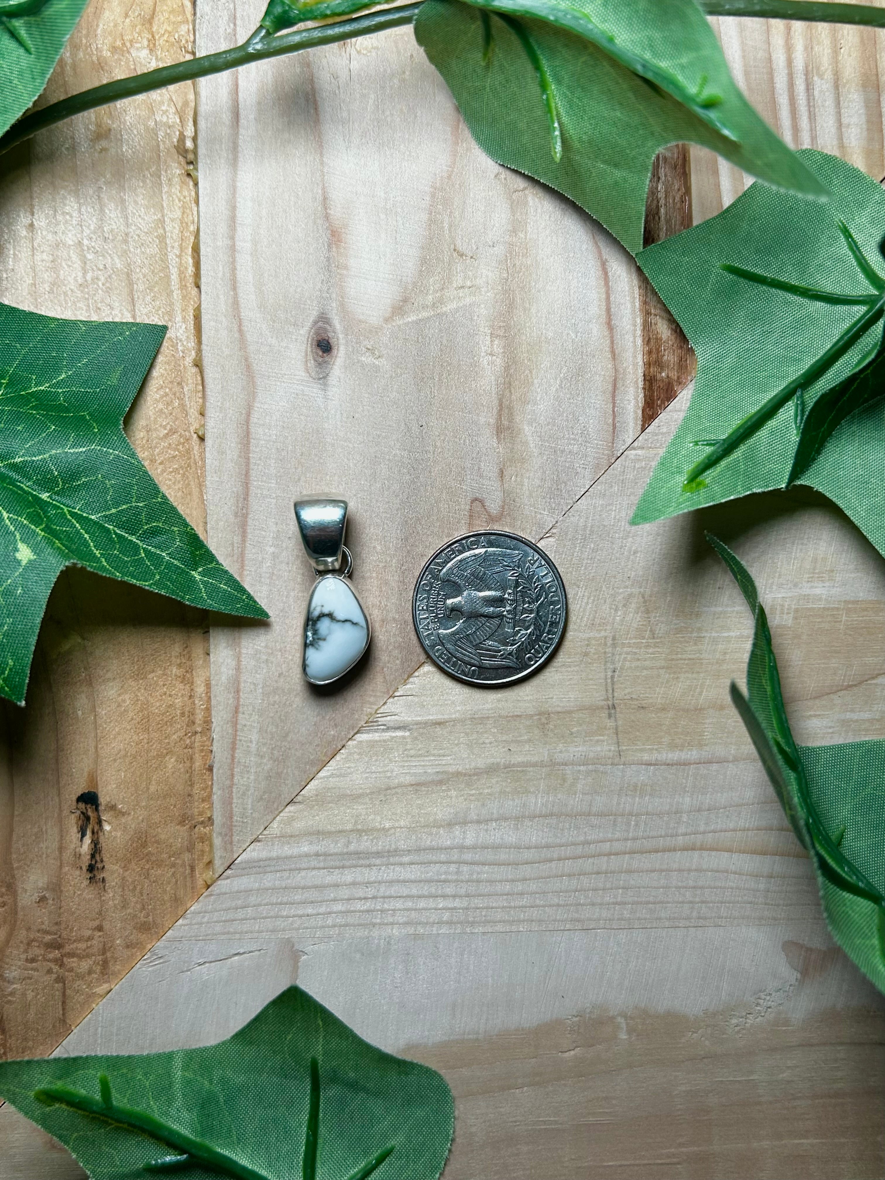 Navajo Made White Buffalo & Sterling Silver Pendant. It measures 1 1/4 inches long and 1/2 of an inch wide. Pendant Only!! Signed by the artist and stamped sterling silver.