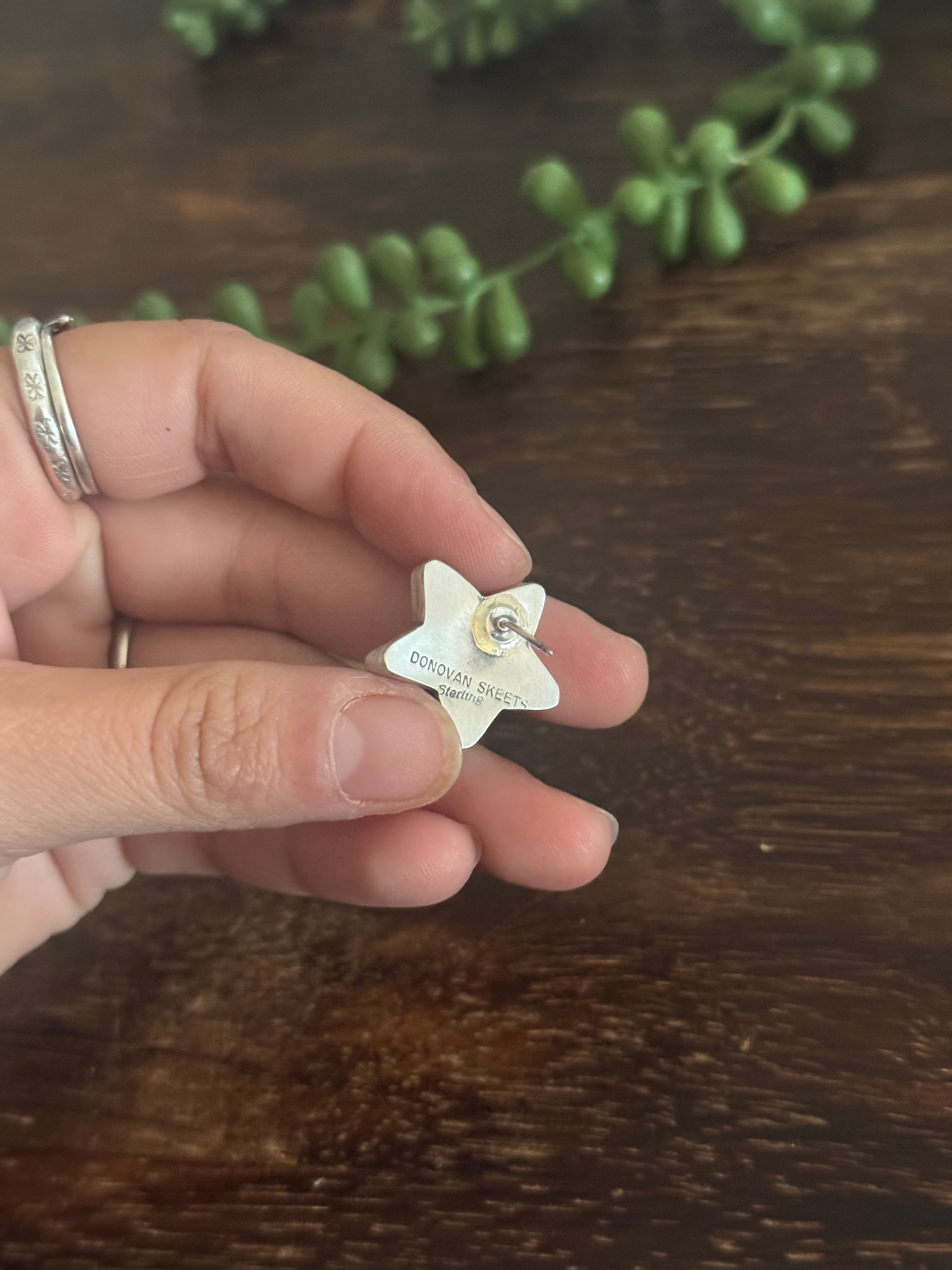 Larson Chee Pink Conch & Sterling Silver Post Star Earrings. It measures just over 7/8 of an inch round. Signed by the artist and stamped sterling silver. Stones will differ due to natural stones.