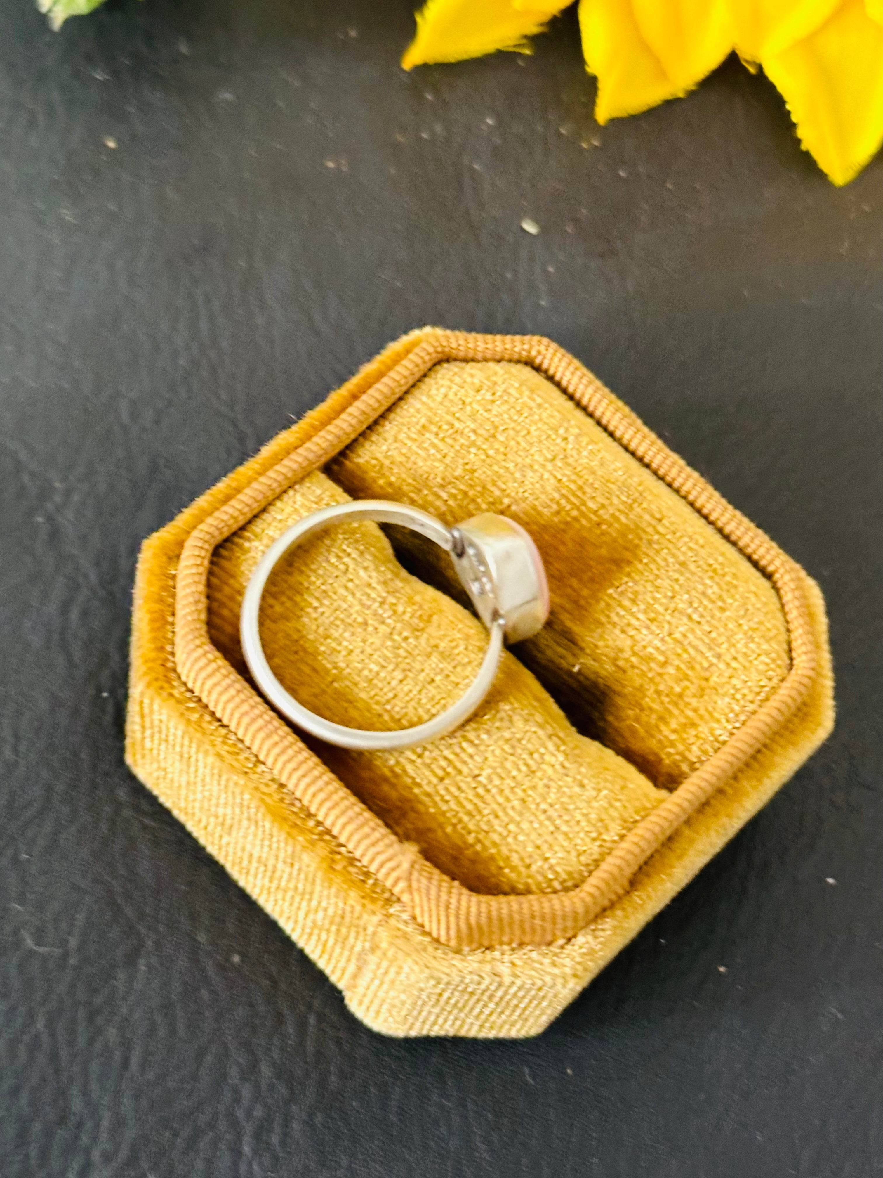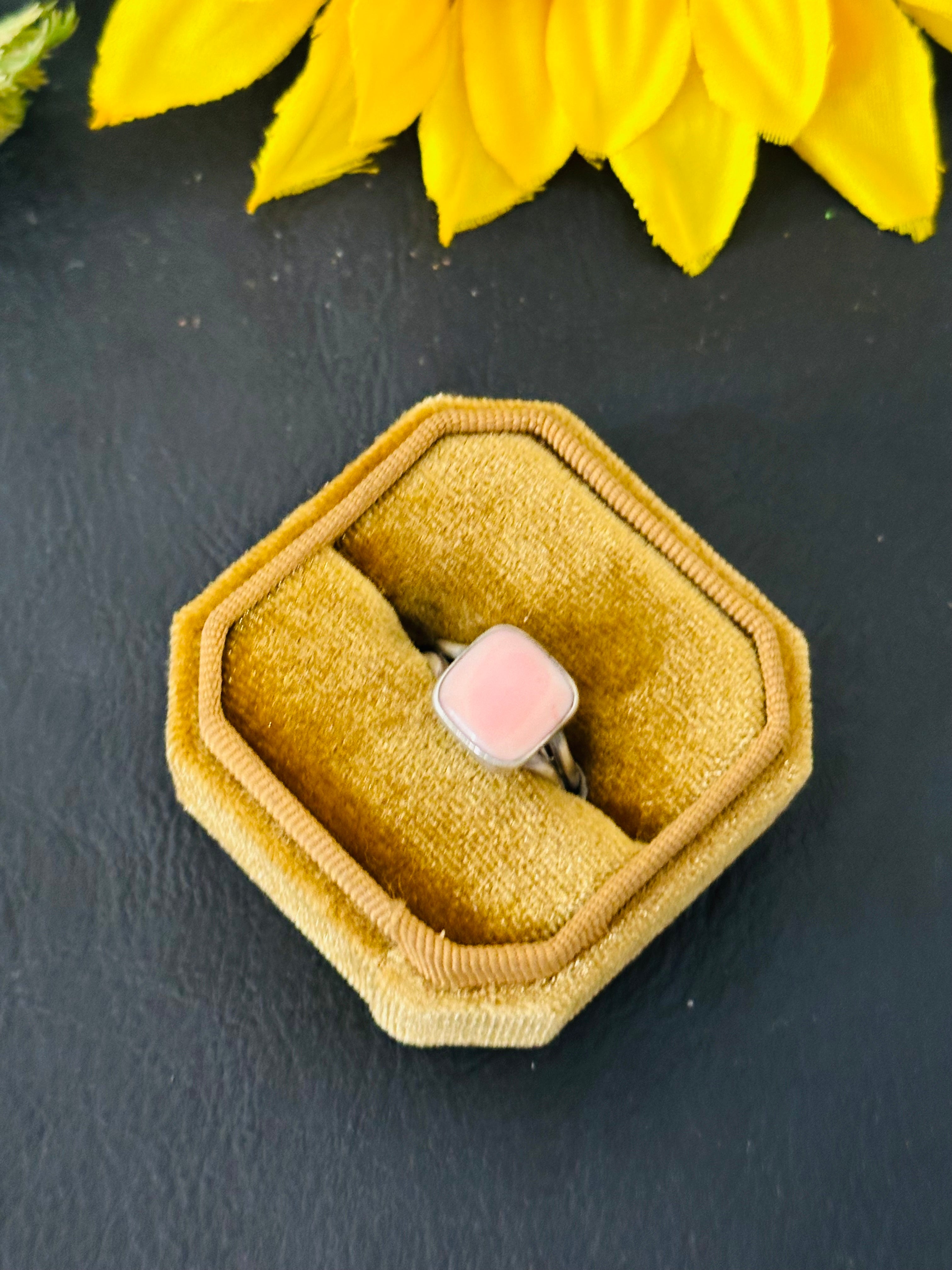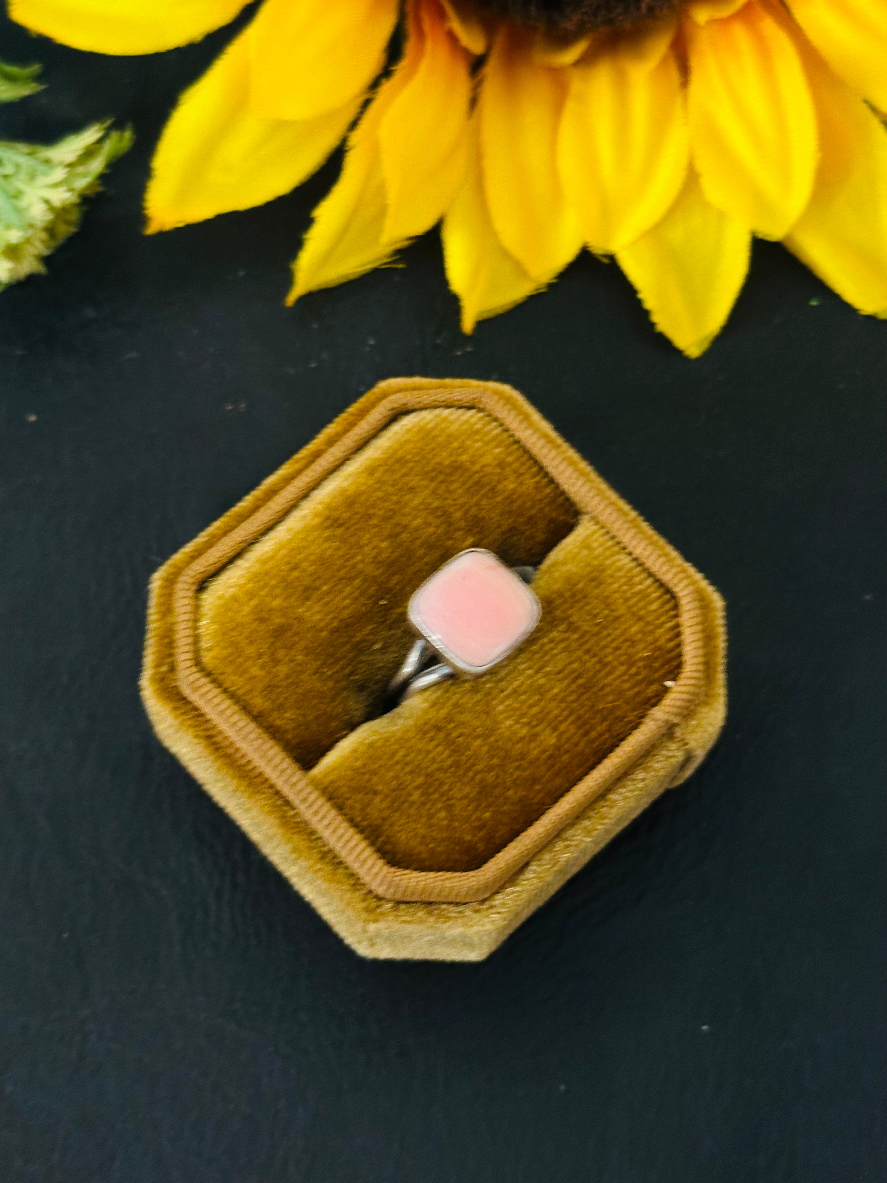 Beautiful ring. Navajo Made Pink Conch & Sterling Silver Ring. It measures 1/4 of an inch long. Stamped sterling silver and signed.