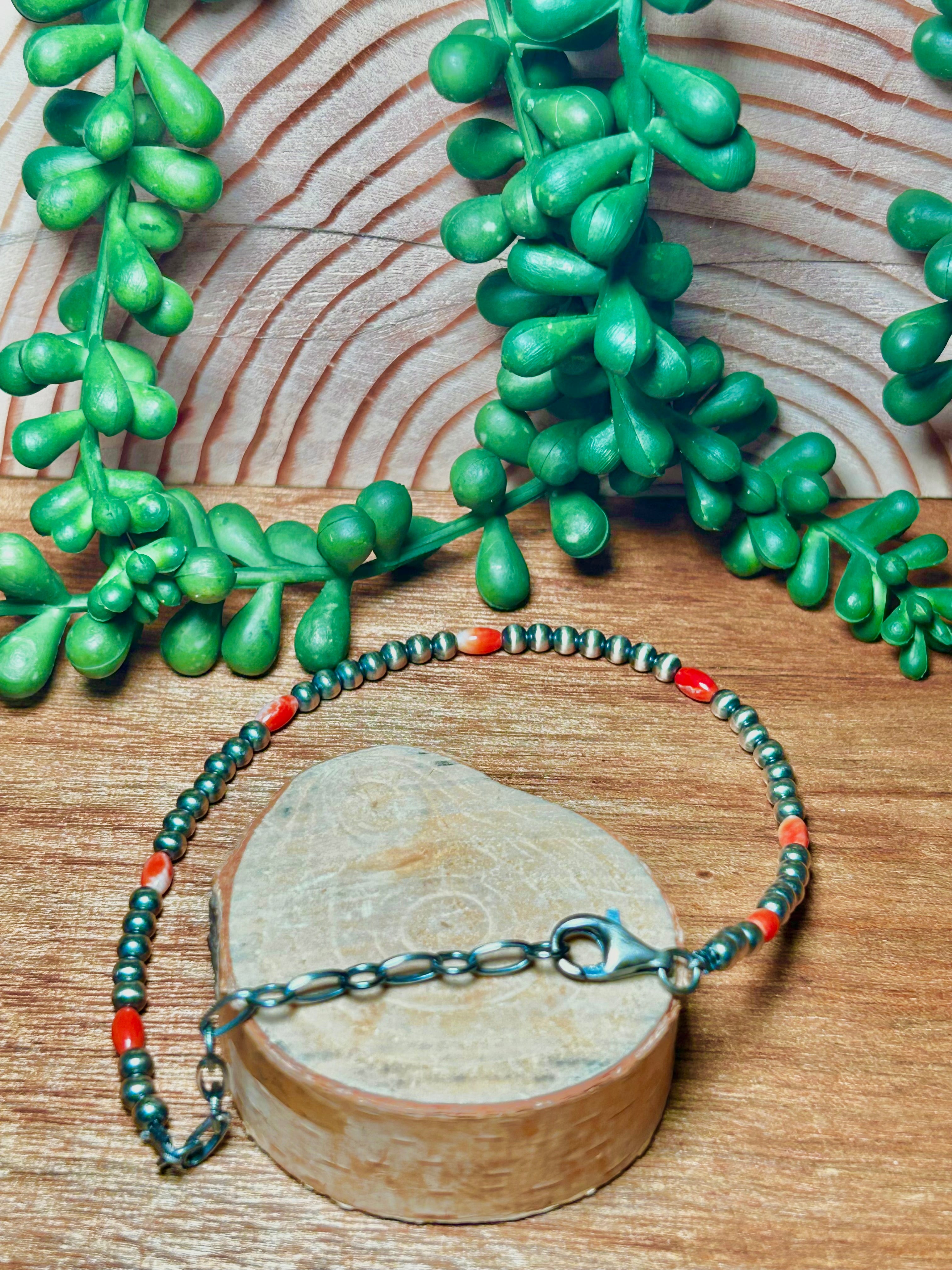 Navajo Made Spiny Oyster Beaded Sterling Silver Strung 4 MM Anklet. It measures 11 1/2 inches long and 1/8 of an inch wide.