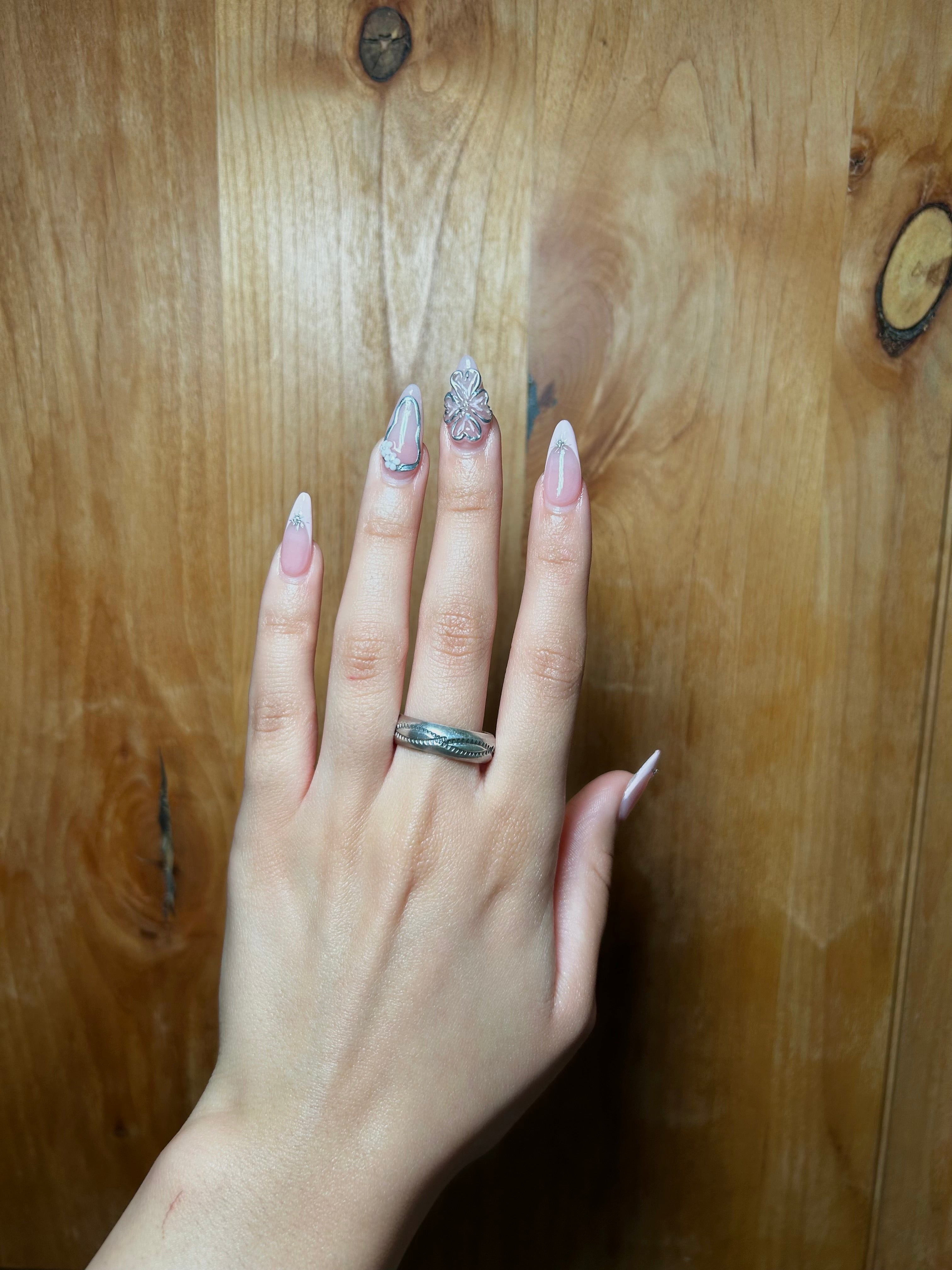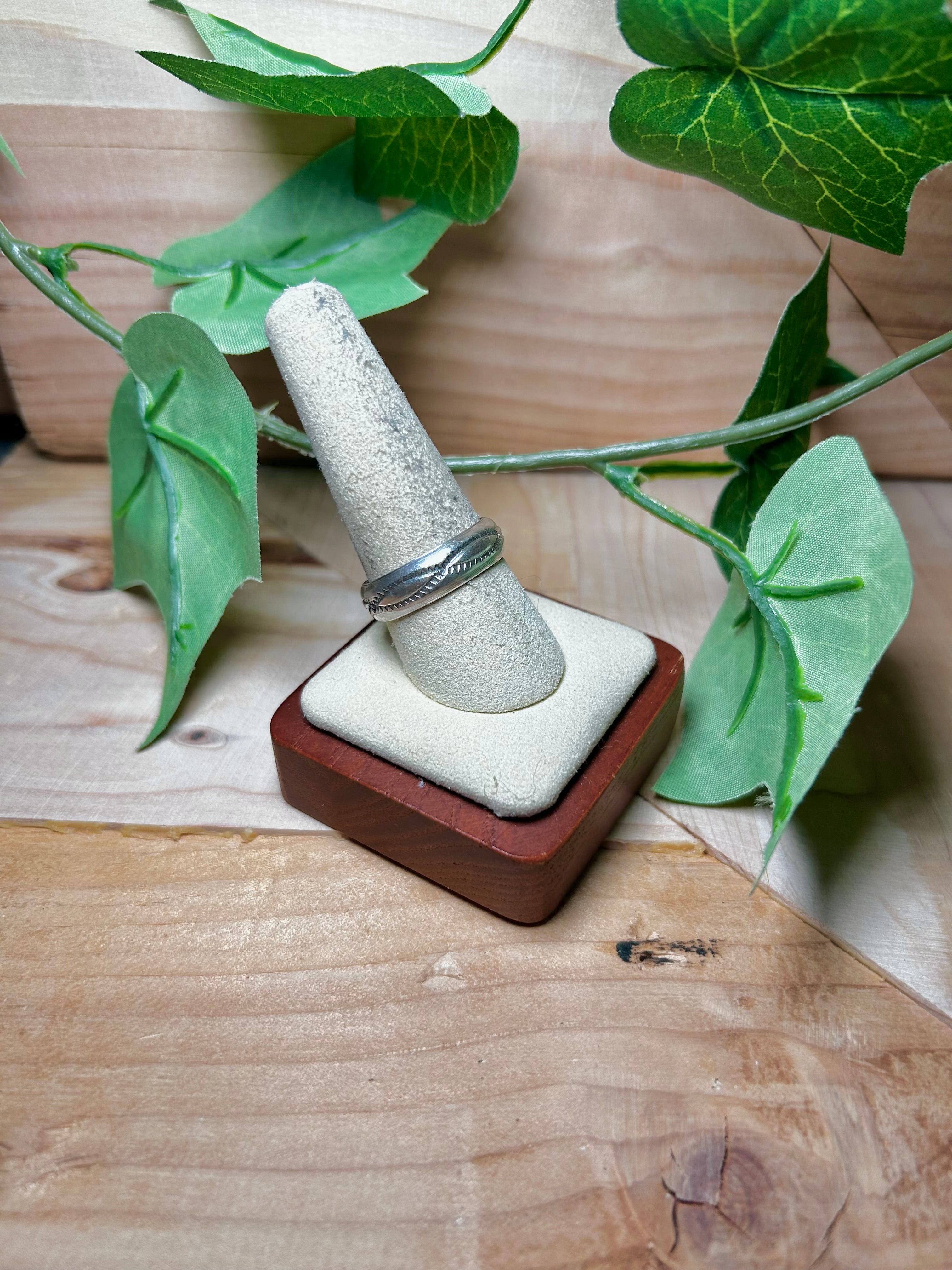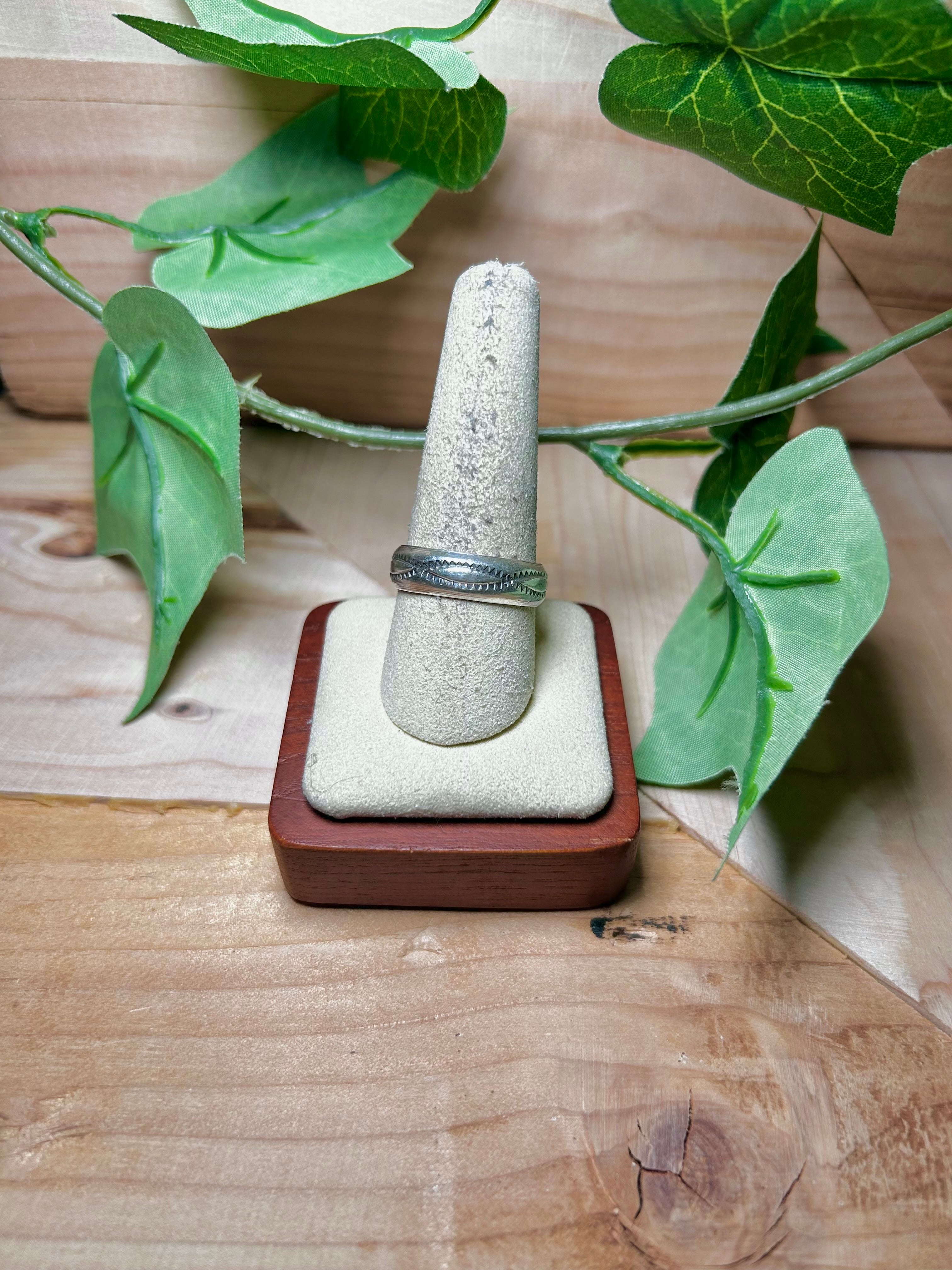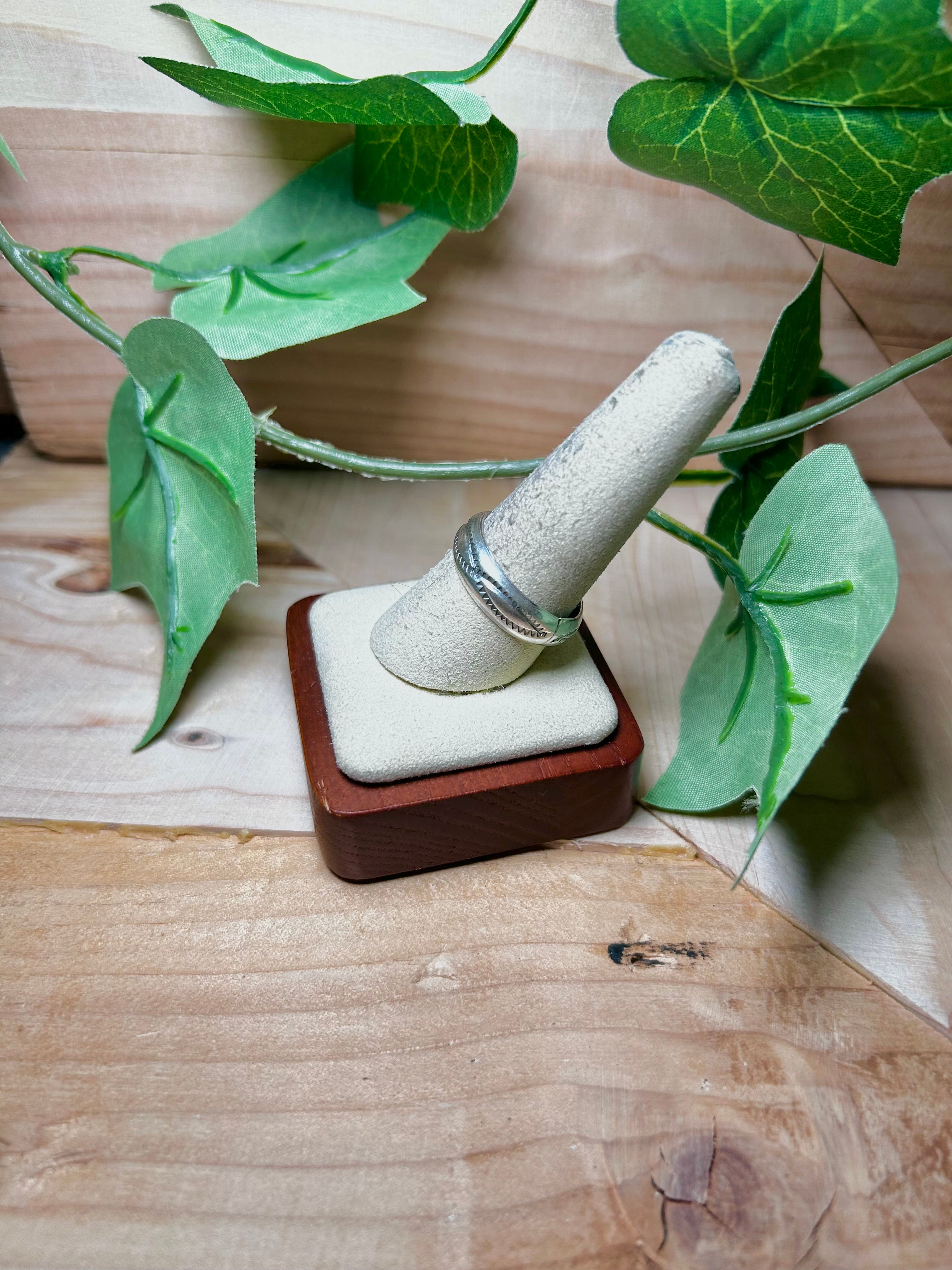 Navajo Made Sterling Sliver Cluster Ring Size 10. It measures 1/4 of an inch long and 5/8 of an inch wide. Signed by the artist and stamped sterling silver.