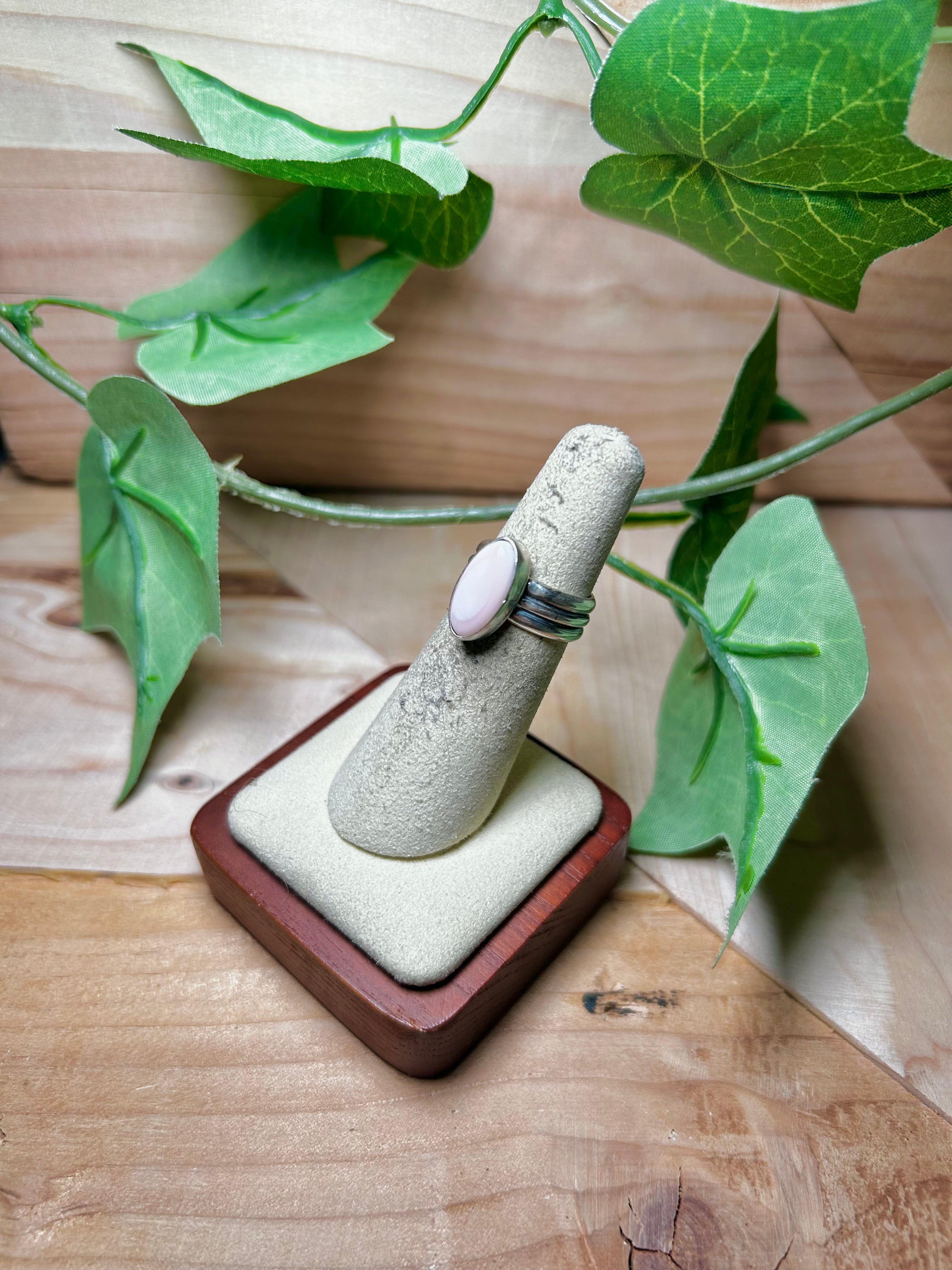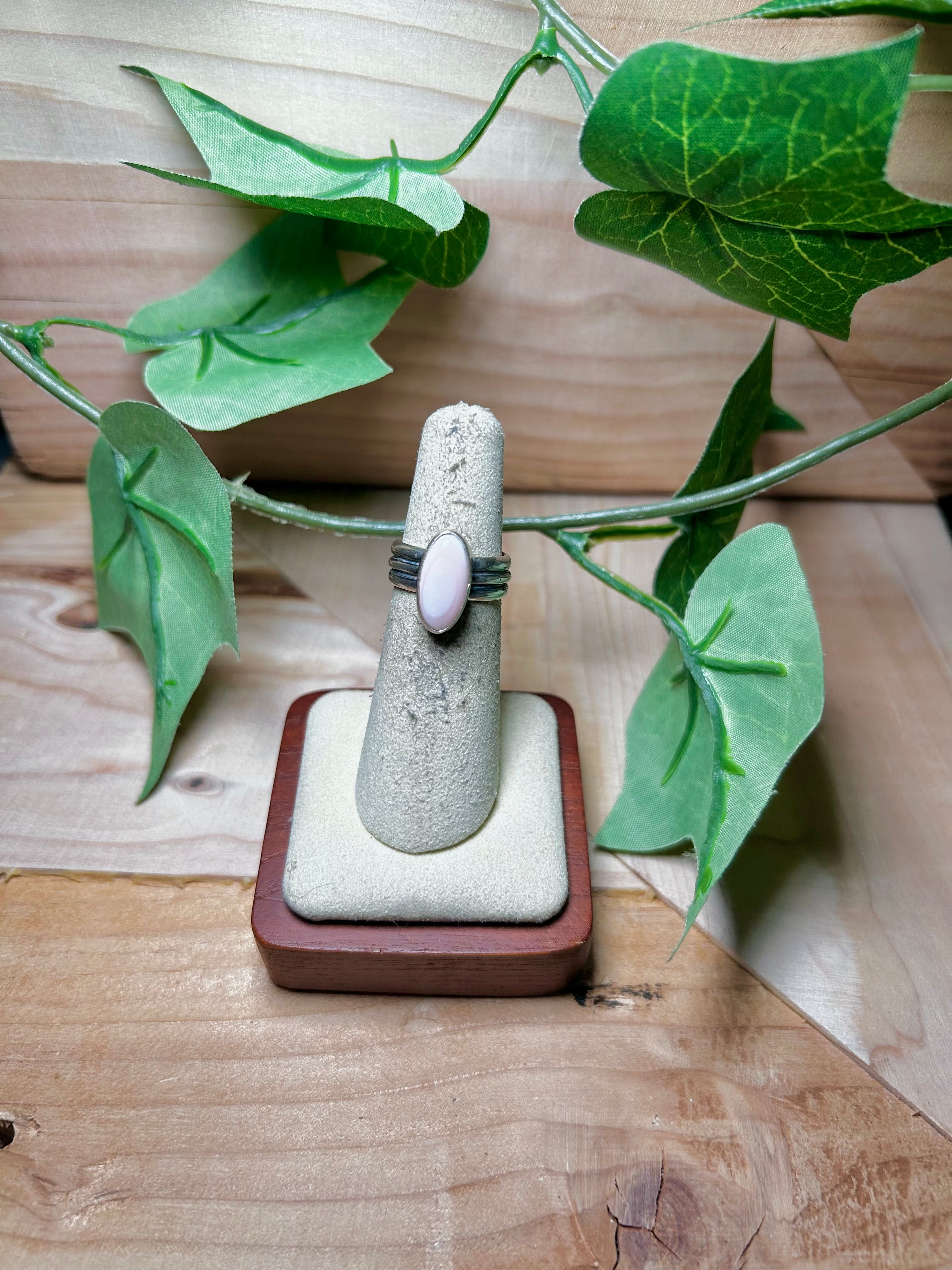 Navajo Made Pink Conch & Sterling Sliver Cluster Ring Size 4.75. It measures 5/8 of an inch long and 1/4 of an inch wide. Signed by the artist and stamped sterling silver.