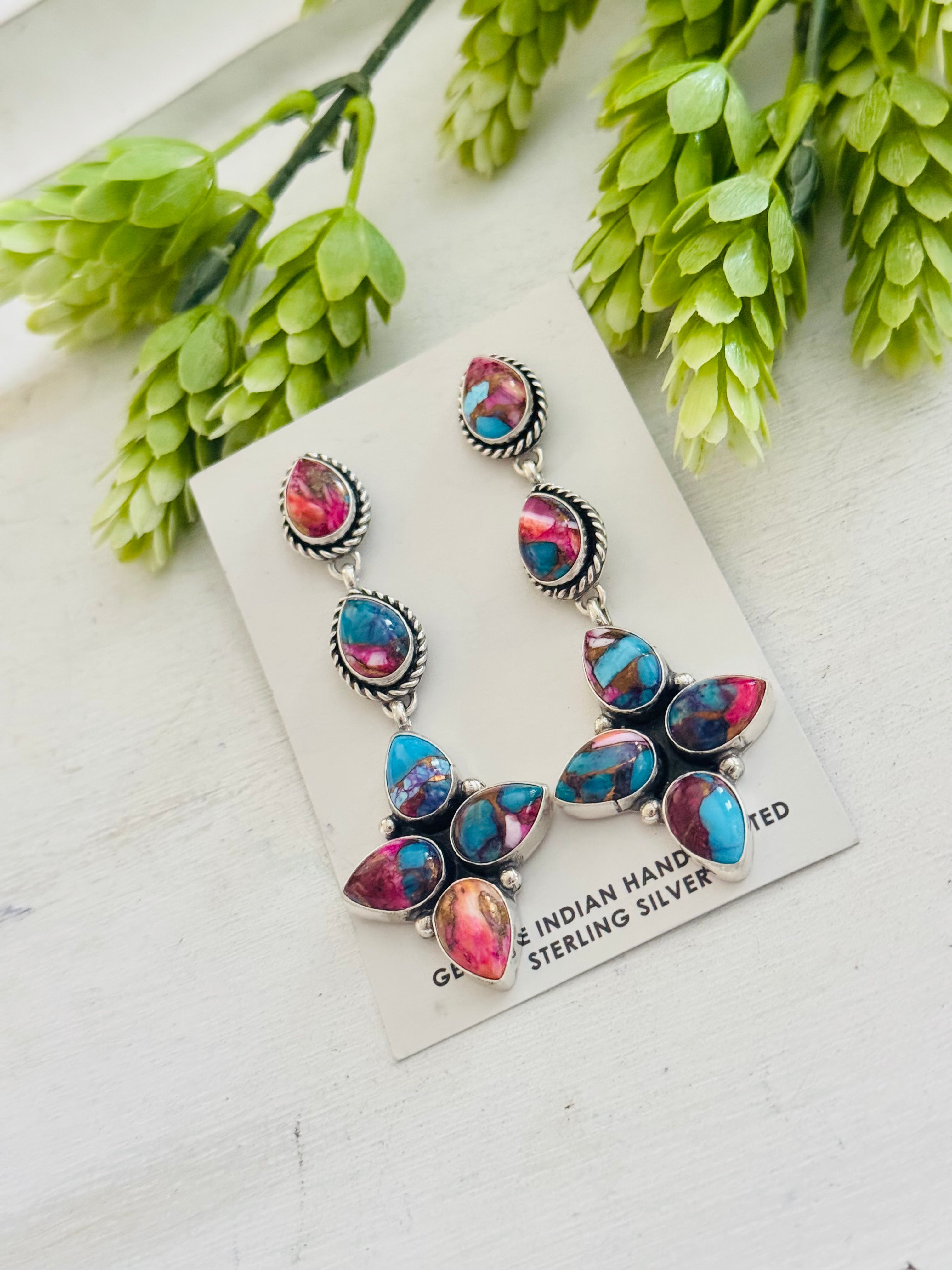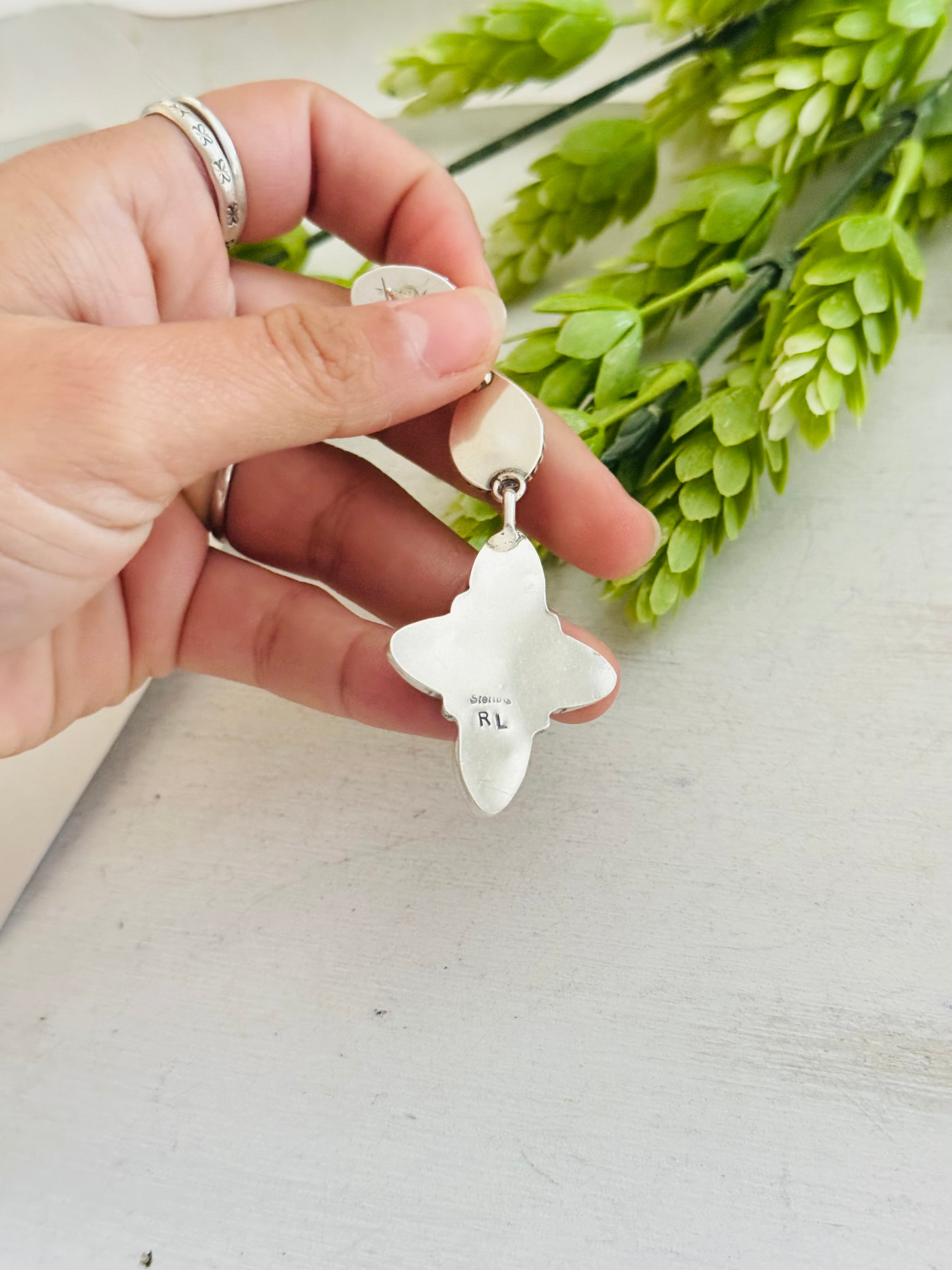 Ronald Lee Pink Mohave Turquoise & Sterling Silver Post Earrings. They measure 3 3/8 inches long and 1 1/8 inches wide. Signed by the artist and stamped sterling silver.