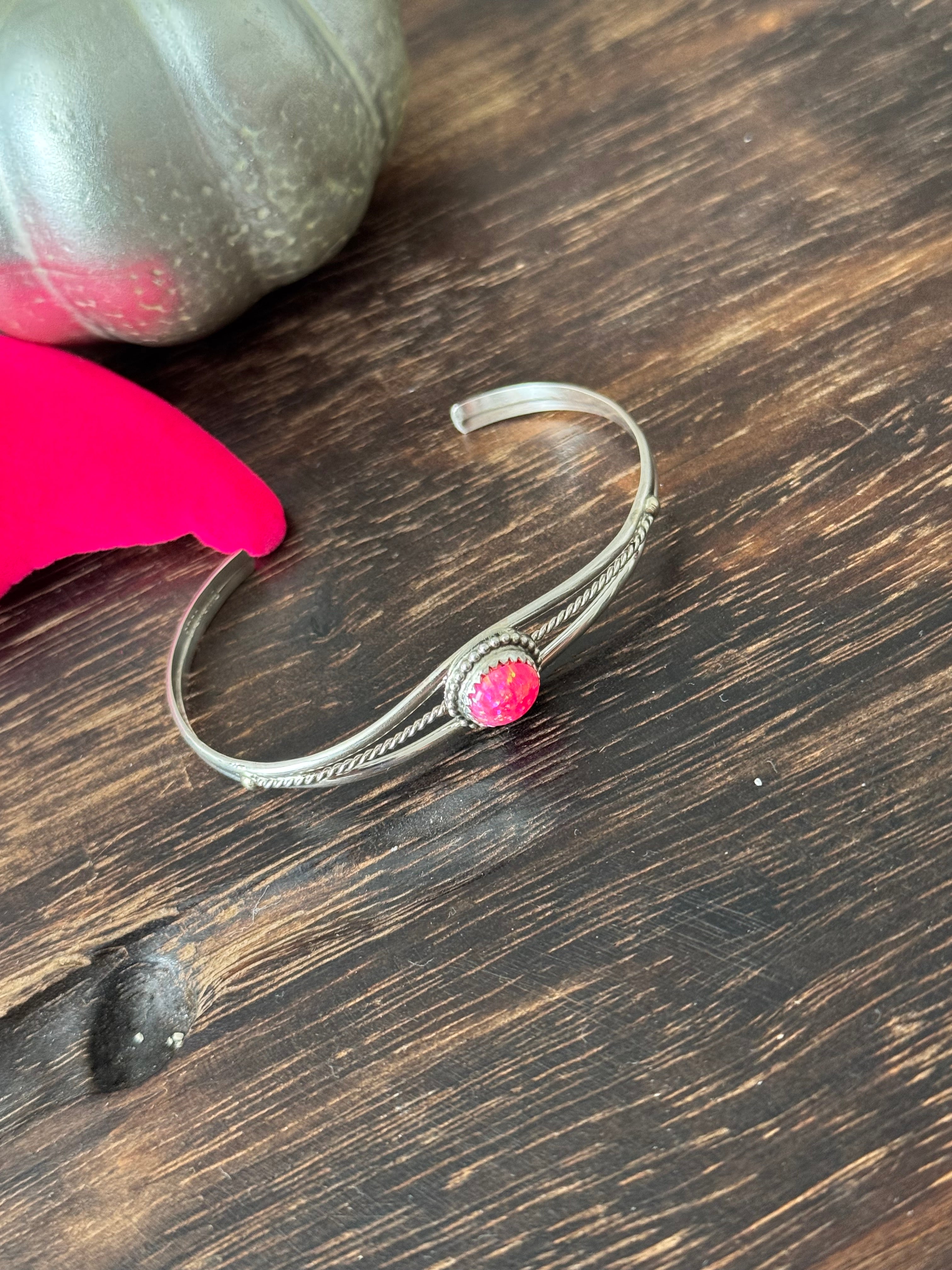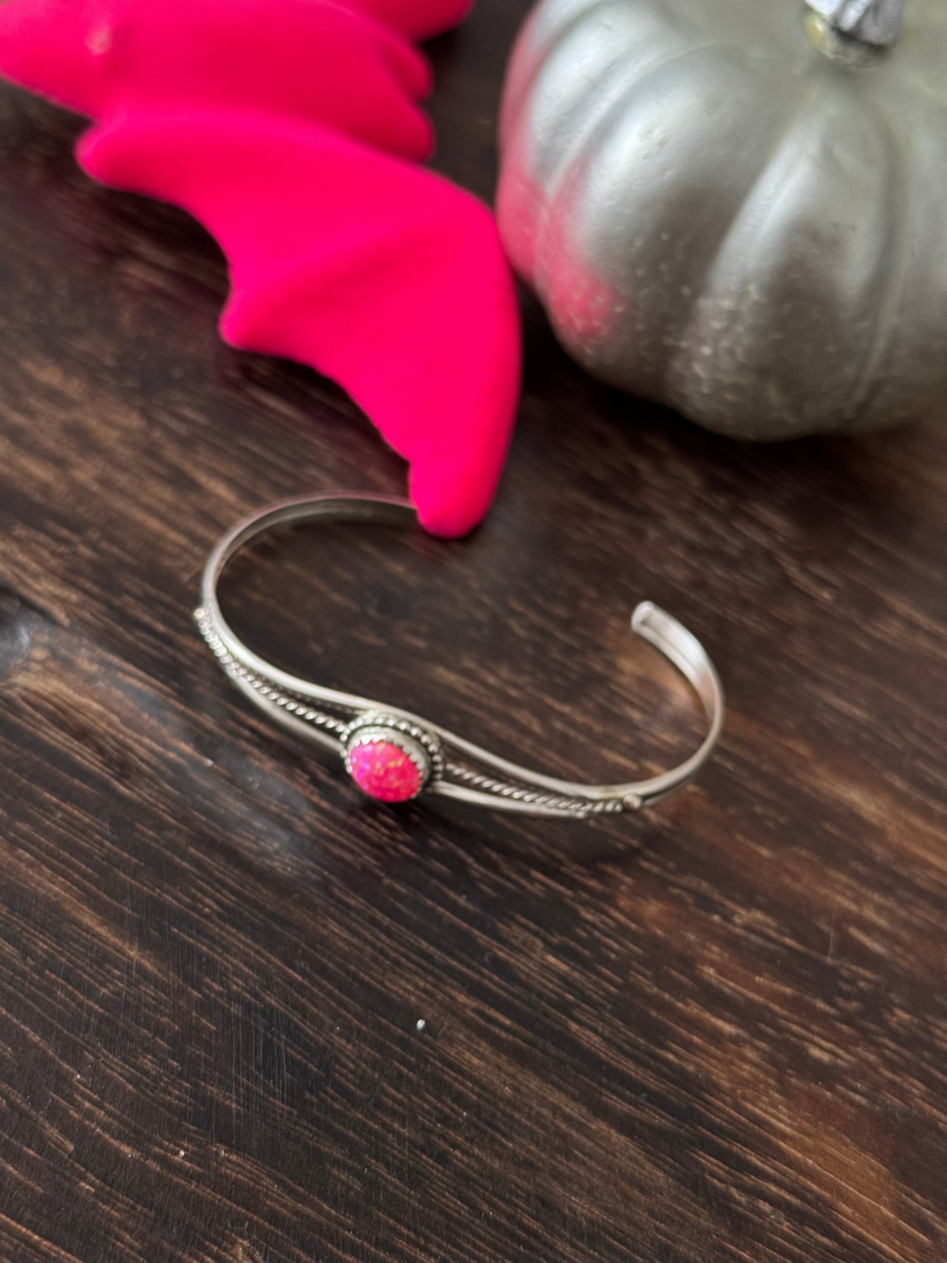 Navajo Made Pink Opal (Man-Made) & Sterling Silver Cuff Bracelet. It measures 1/2 of an inch wide with an inside circumference of 5 inches and a gap of 1 1/8 inches. Signed by the artist and stamped sterling silver.