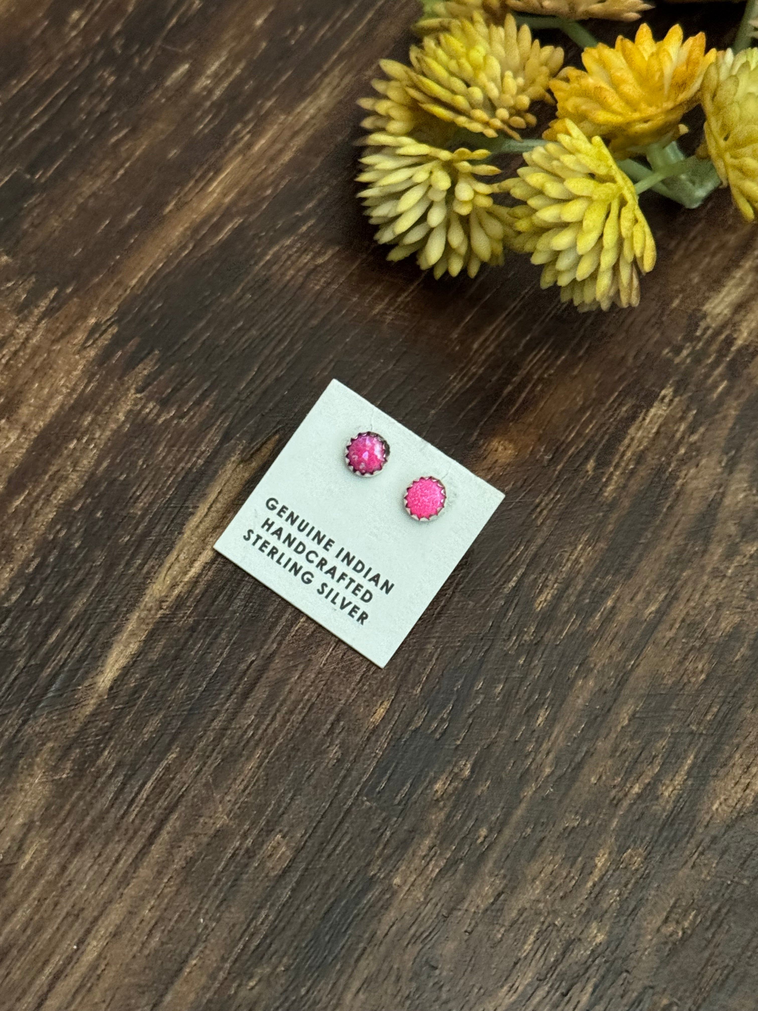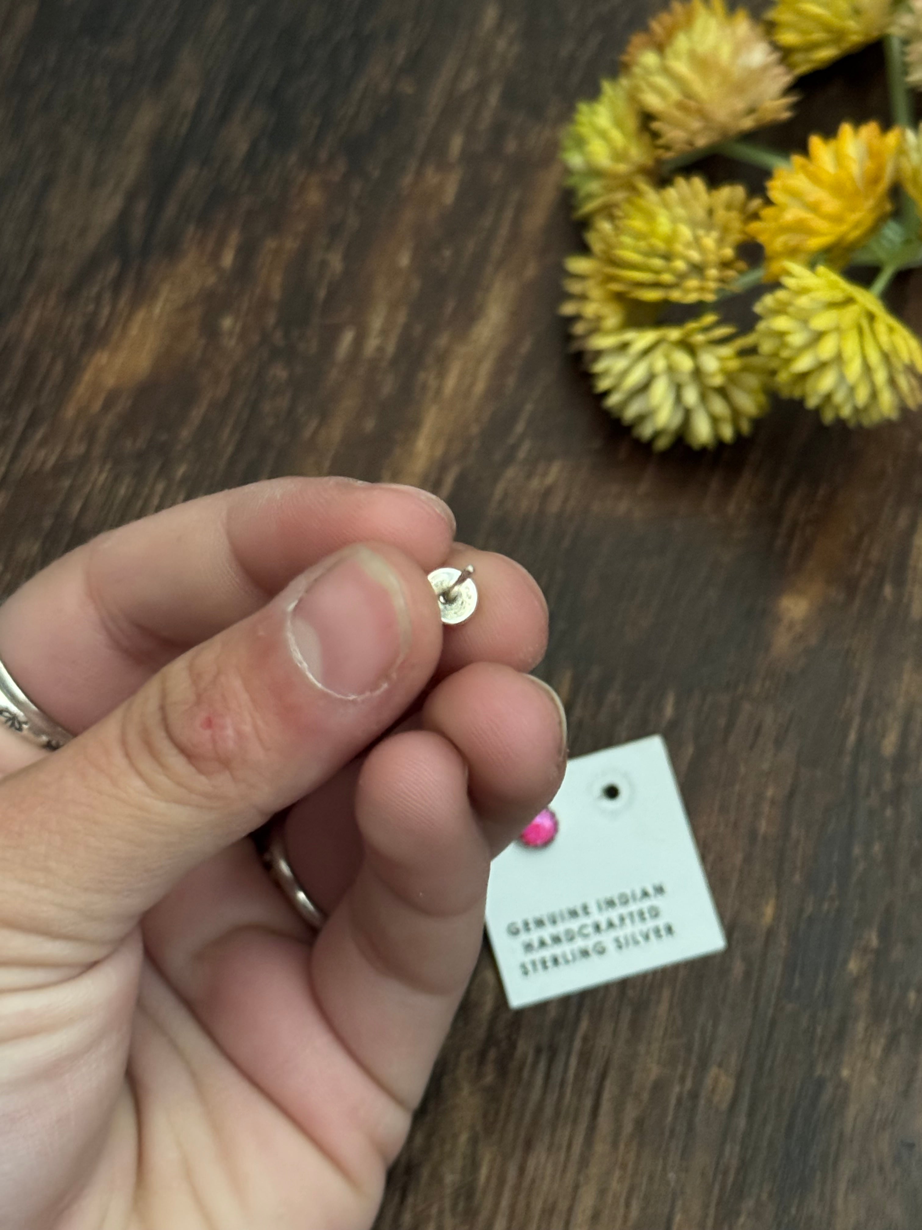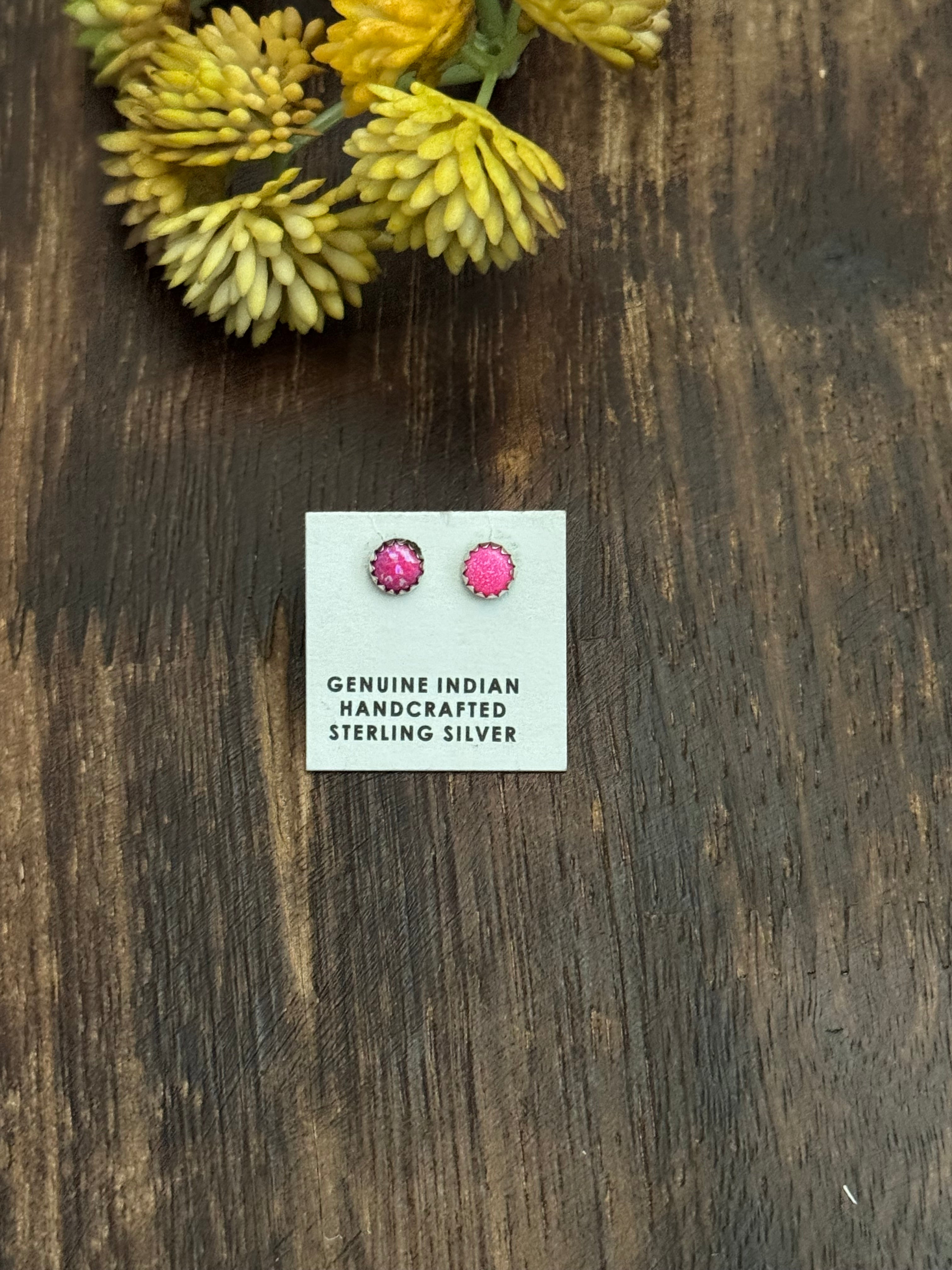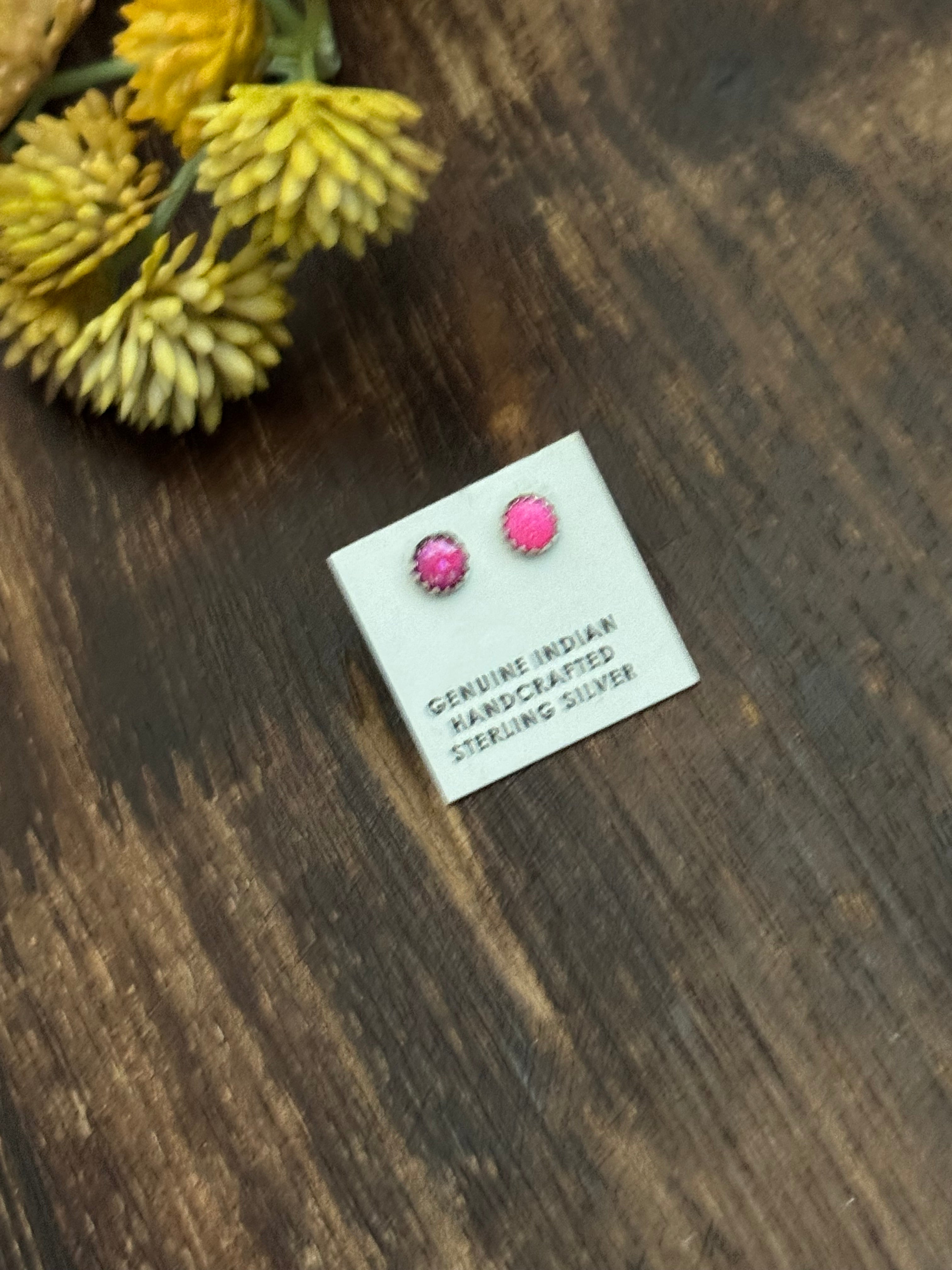 Navajo Made Pink Opal(Manmade) & Sterling Silver Post Earrings. It measures 1/4 of an inch round. Signed by artist and stamped sterling silver.