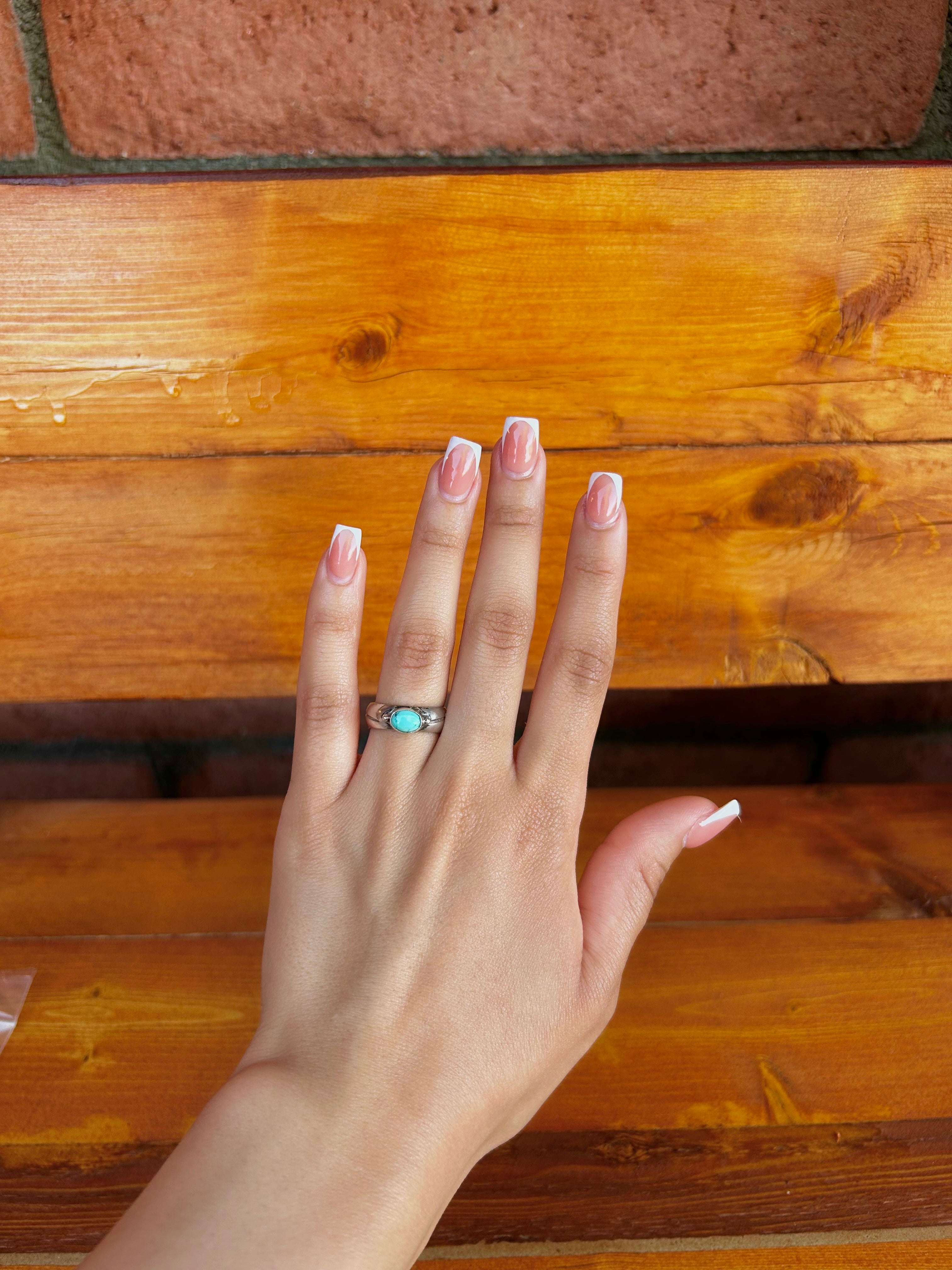 Navajo Made Kingman Turquoise & Sterling Silver Ring Size 6. It measures 1/2 of an inch long and 1/4 of an inch wide. Signed by the artist and stamped sterling silver.