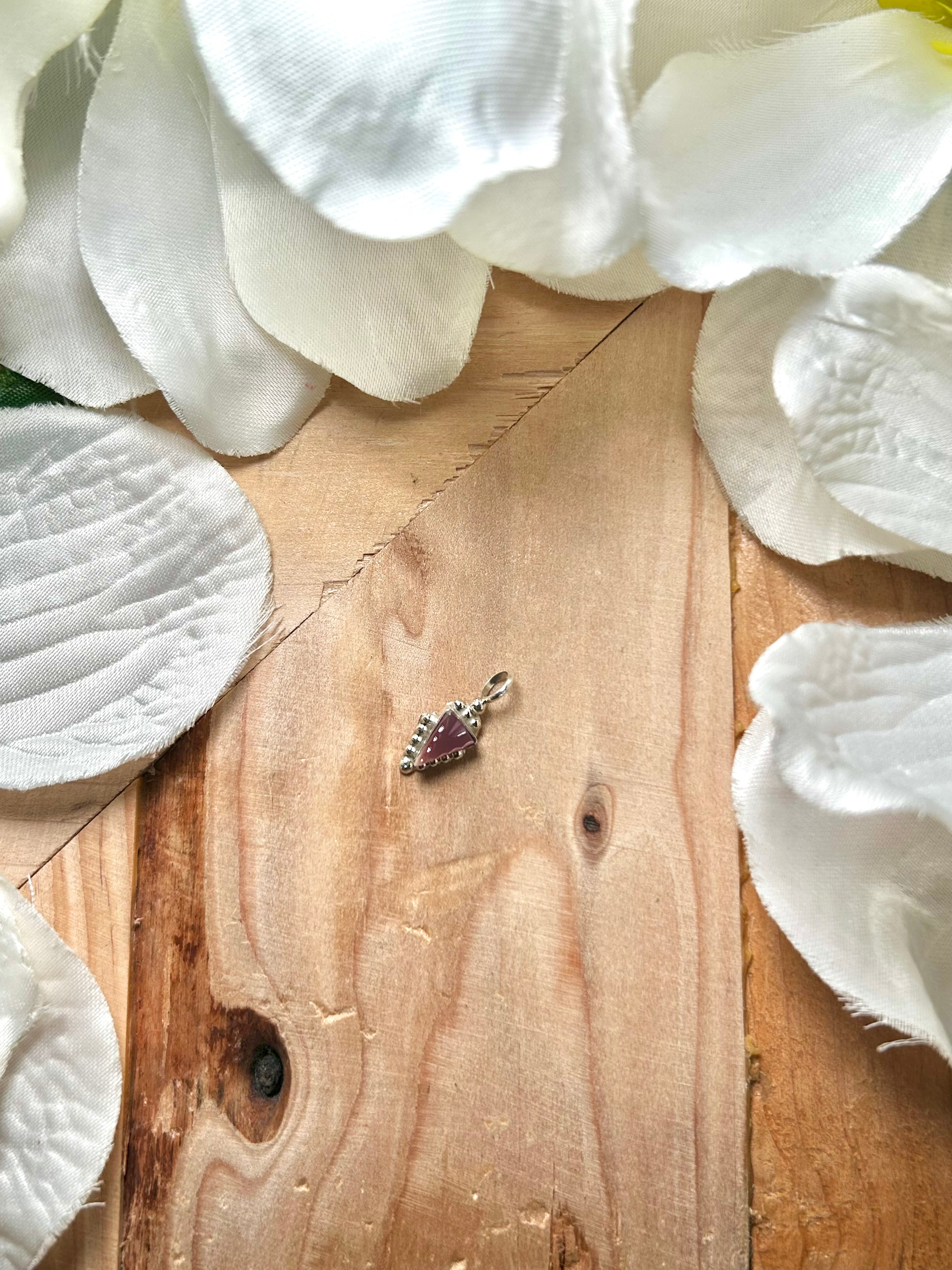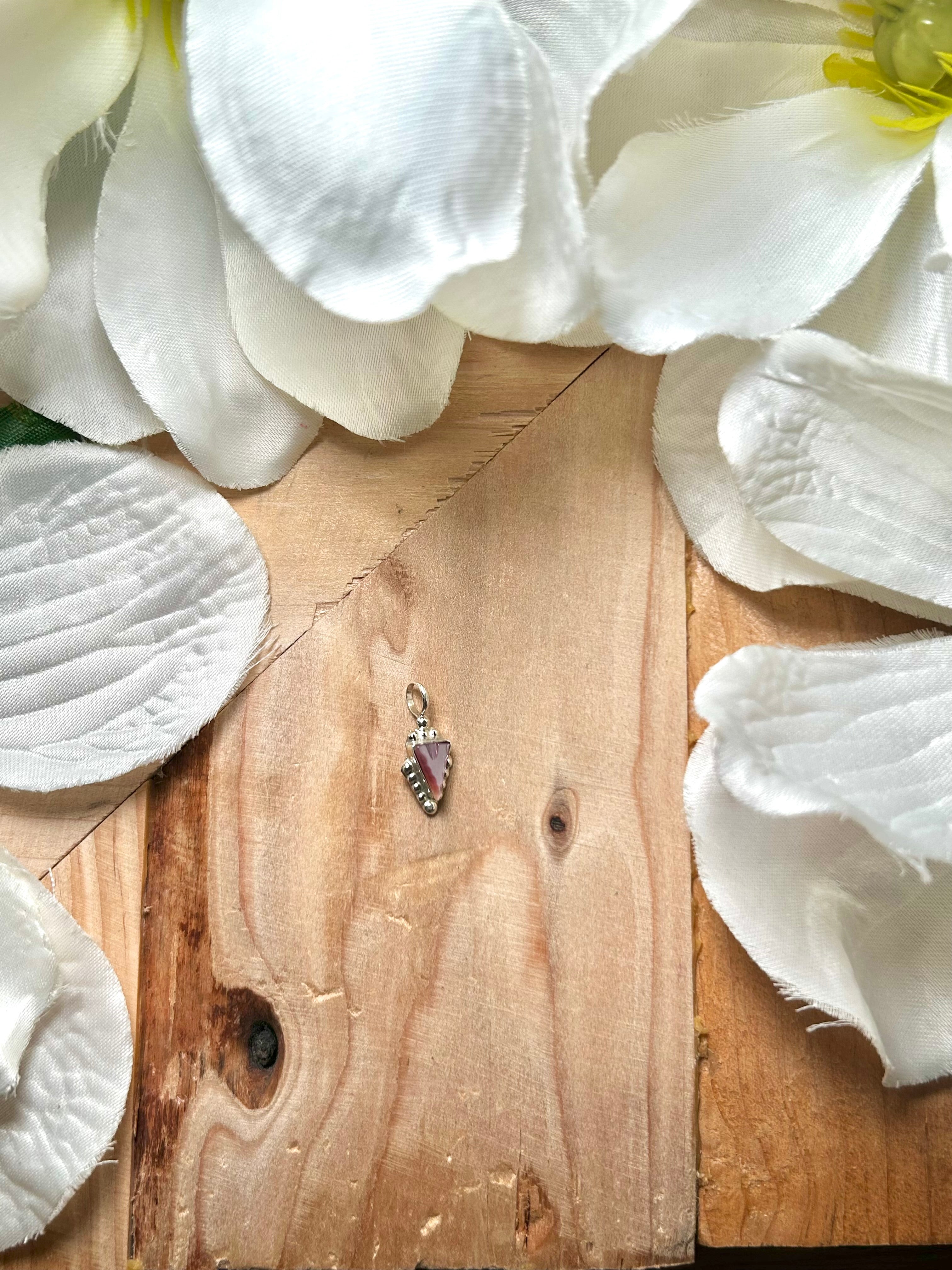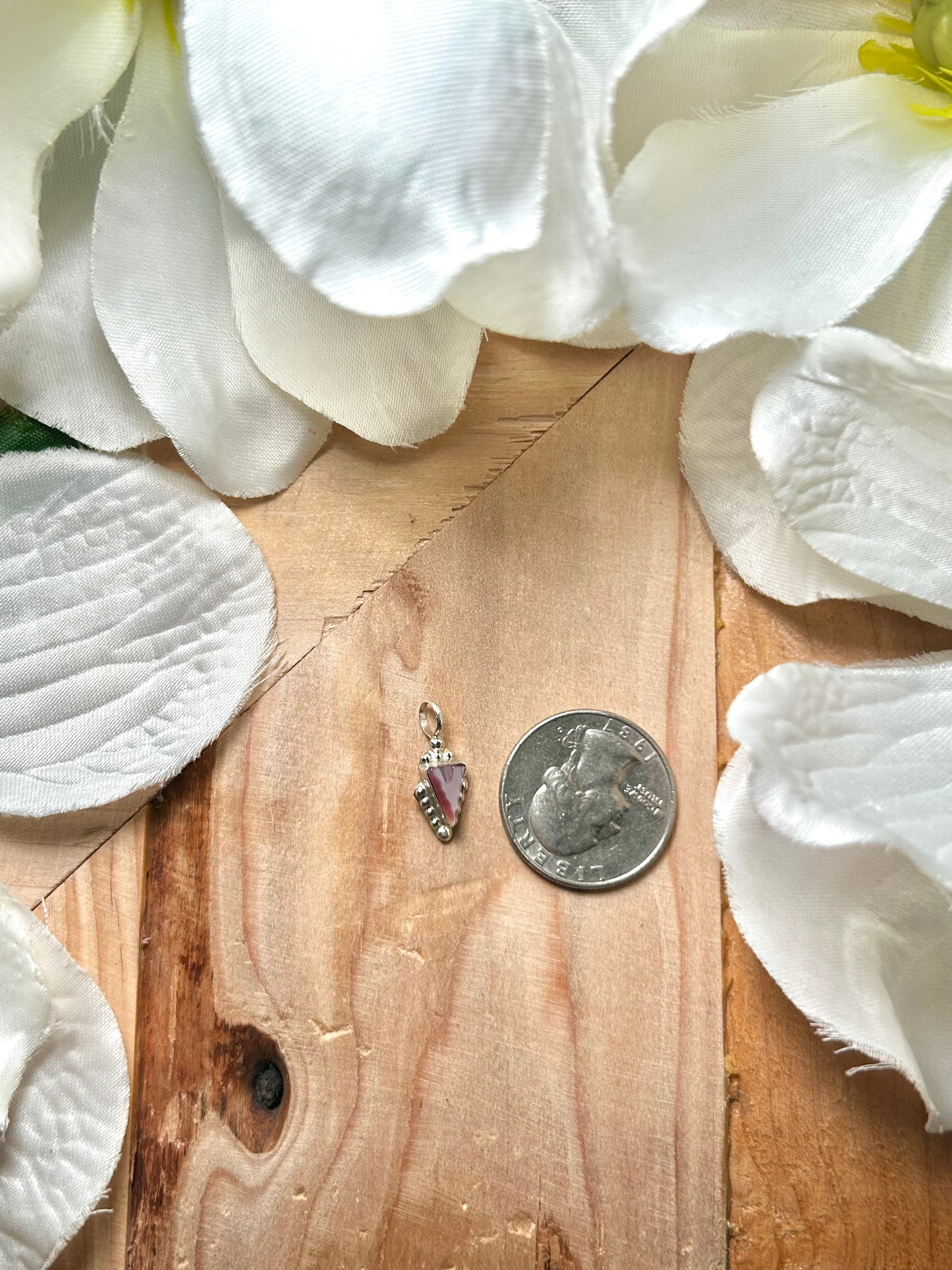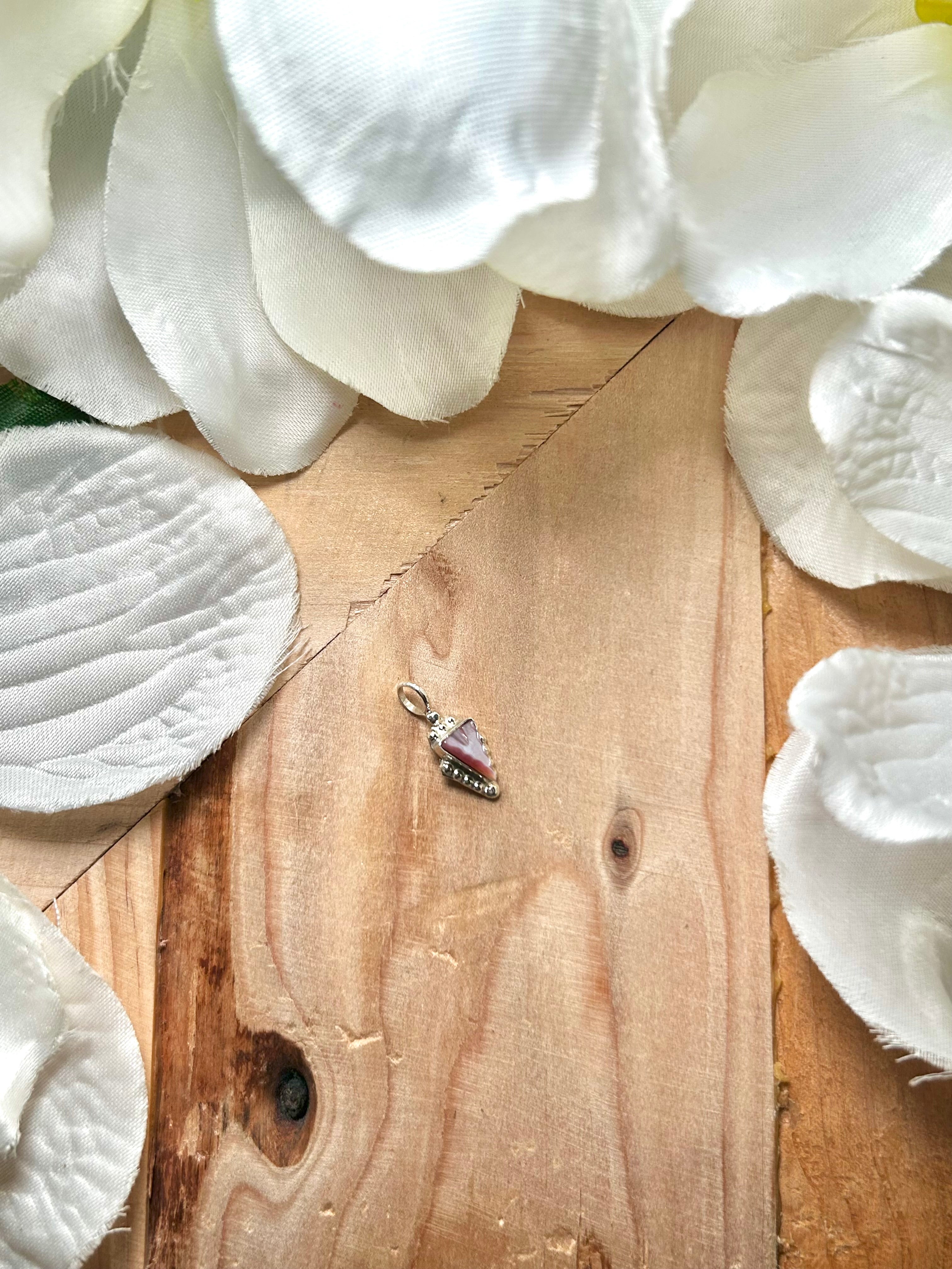 Navajo Made Pink Mother of Pearl & Sterling Silver Pendant. It measures 3/4 of an inch long and 3/8 of an inch wide. Pendant Only! Signed by the artist and stamped sterling silver.
