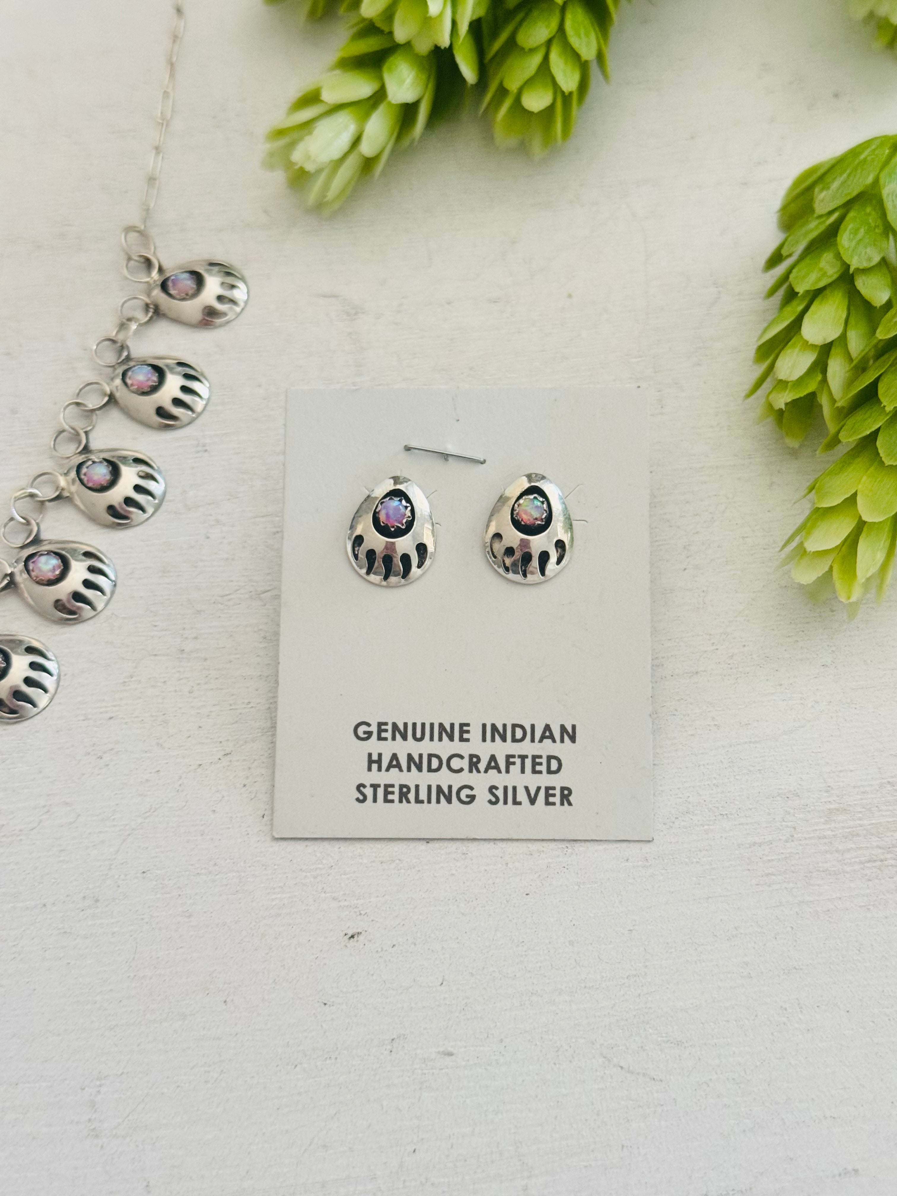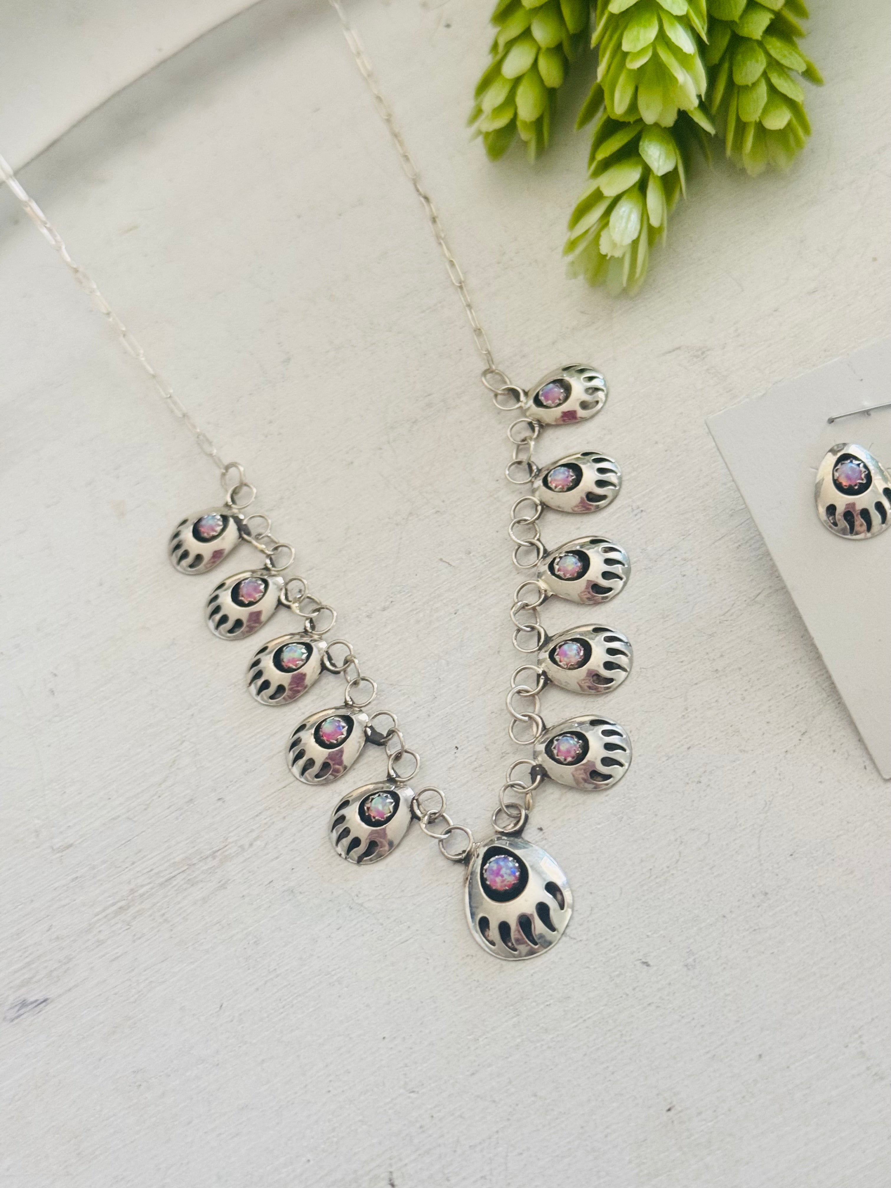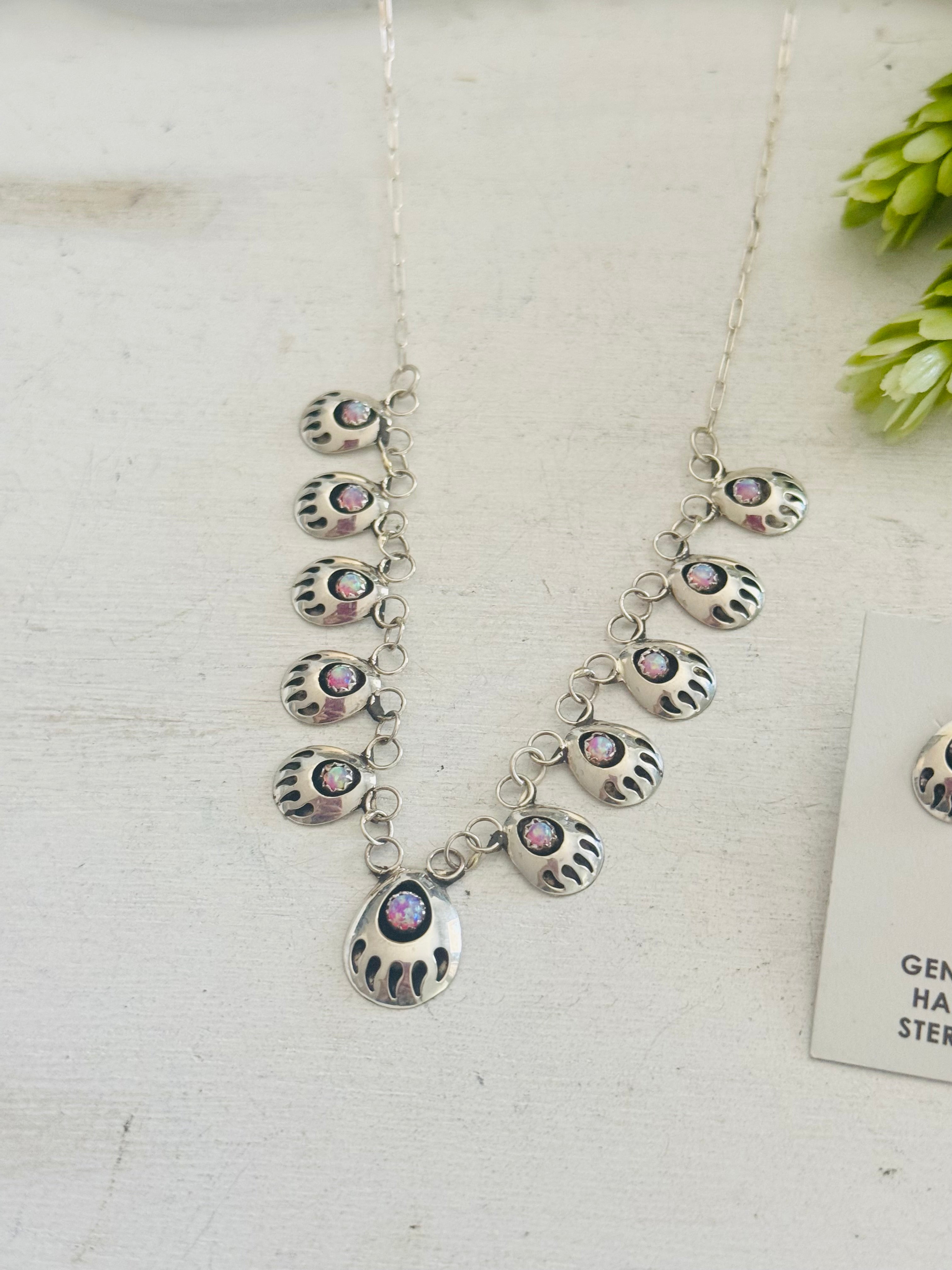 Navajo Made Opal (Man-Made) & Sterling Silver Necklace Set. It measures 20 inches long with hang while chain measures 18 inches long. Signed by the artist and stamped sterling silver.