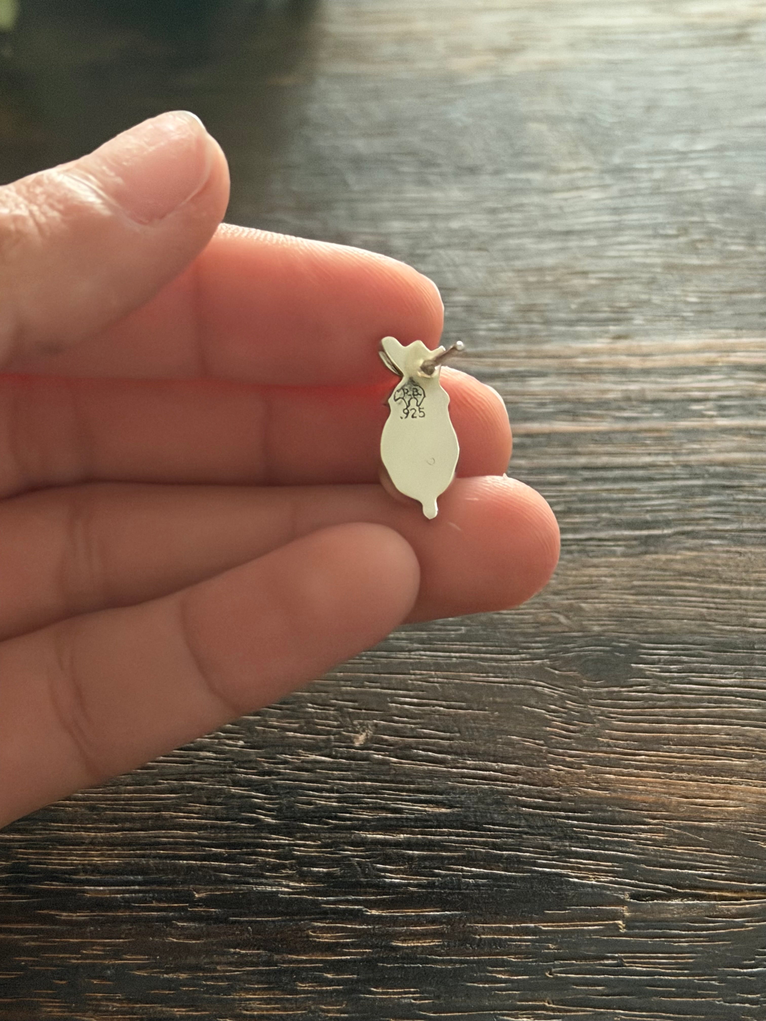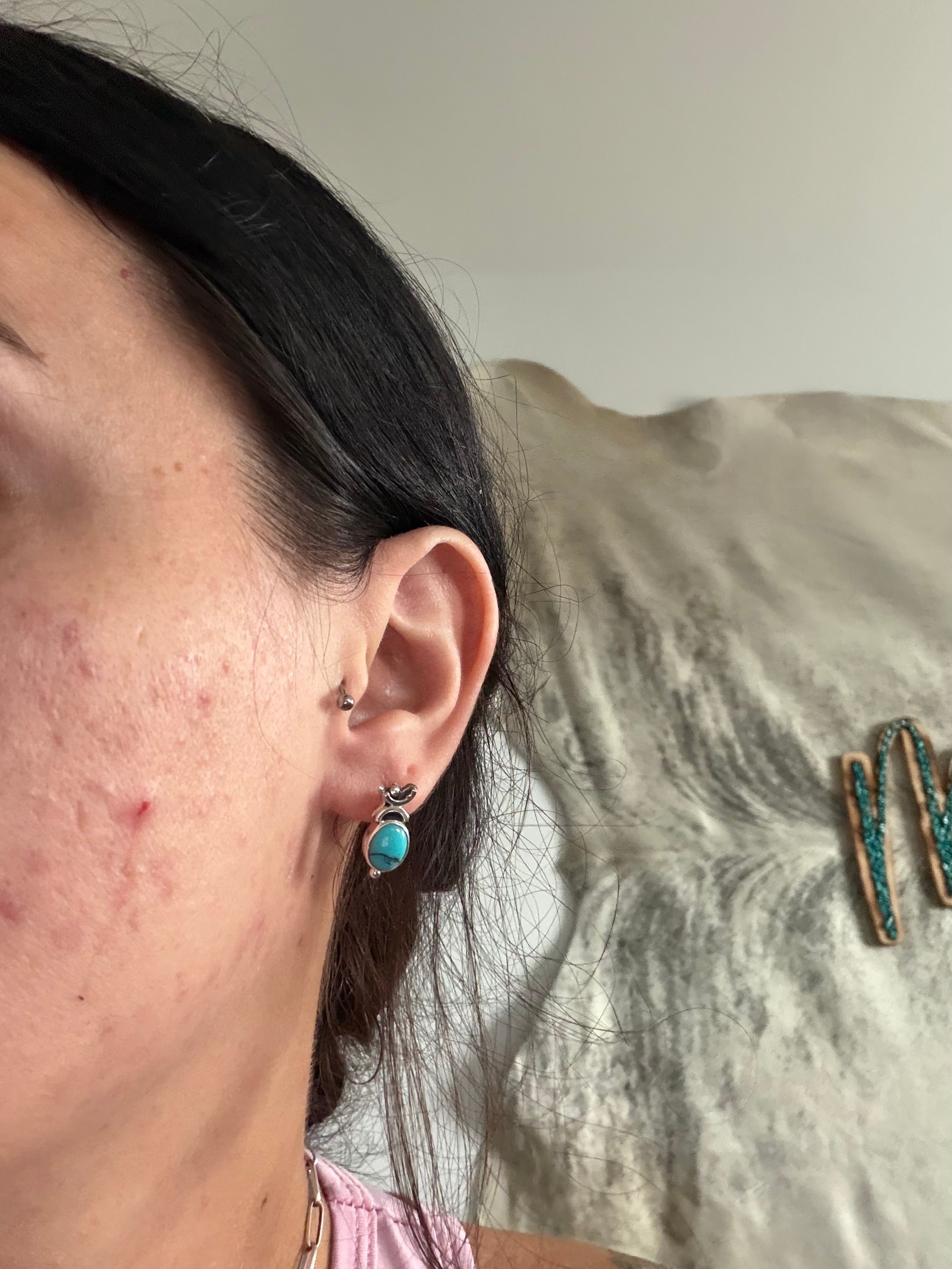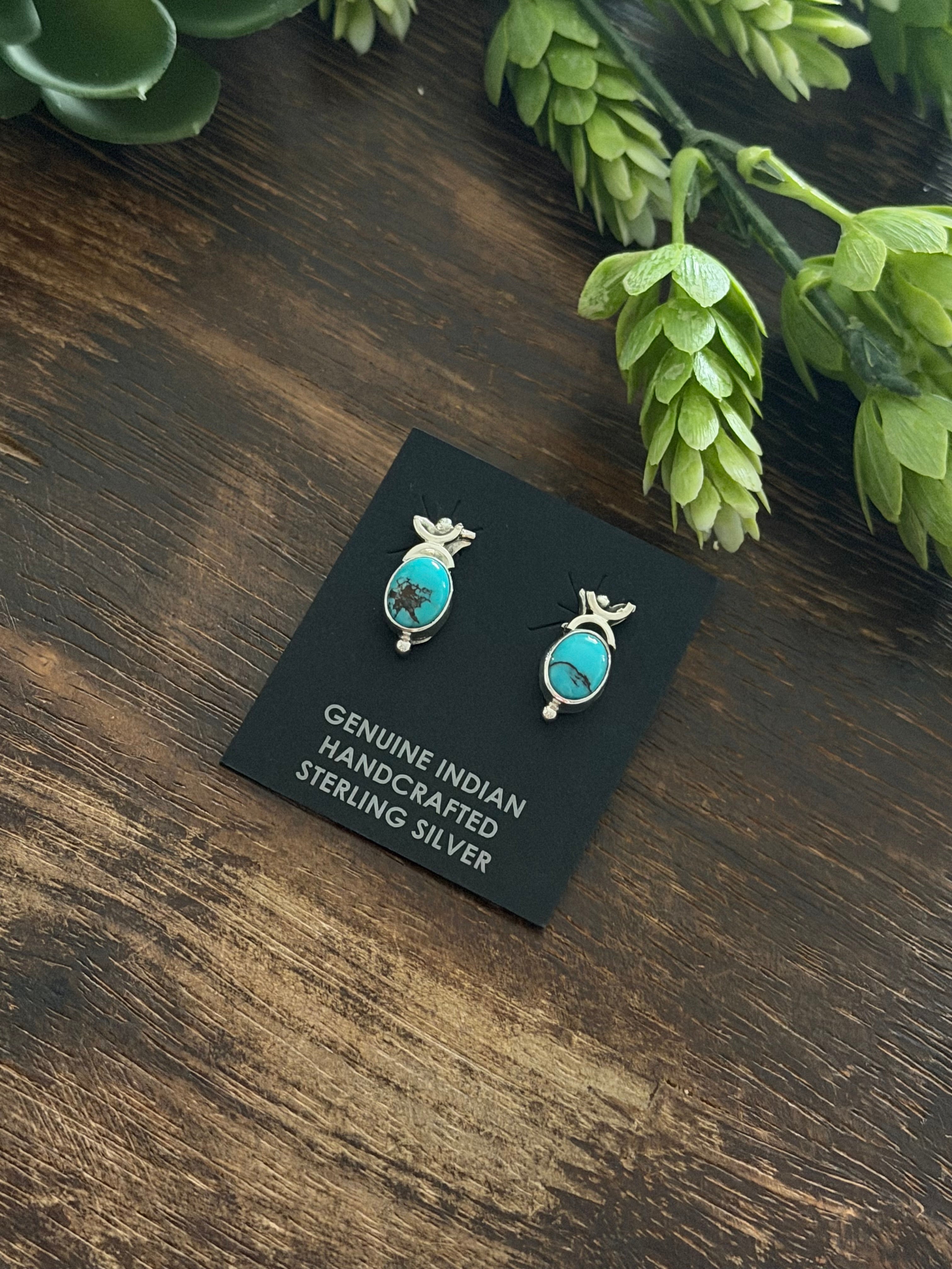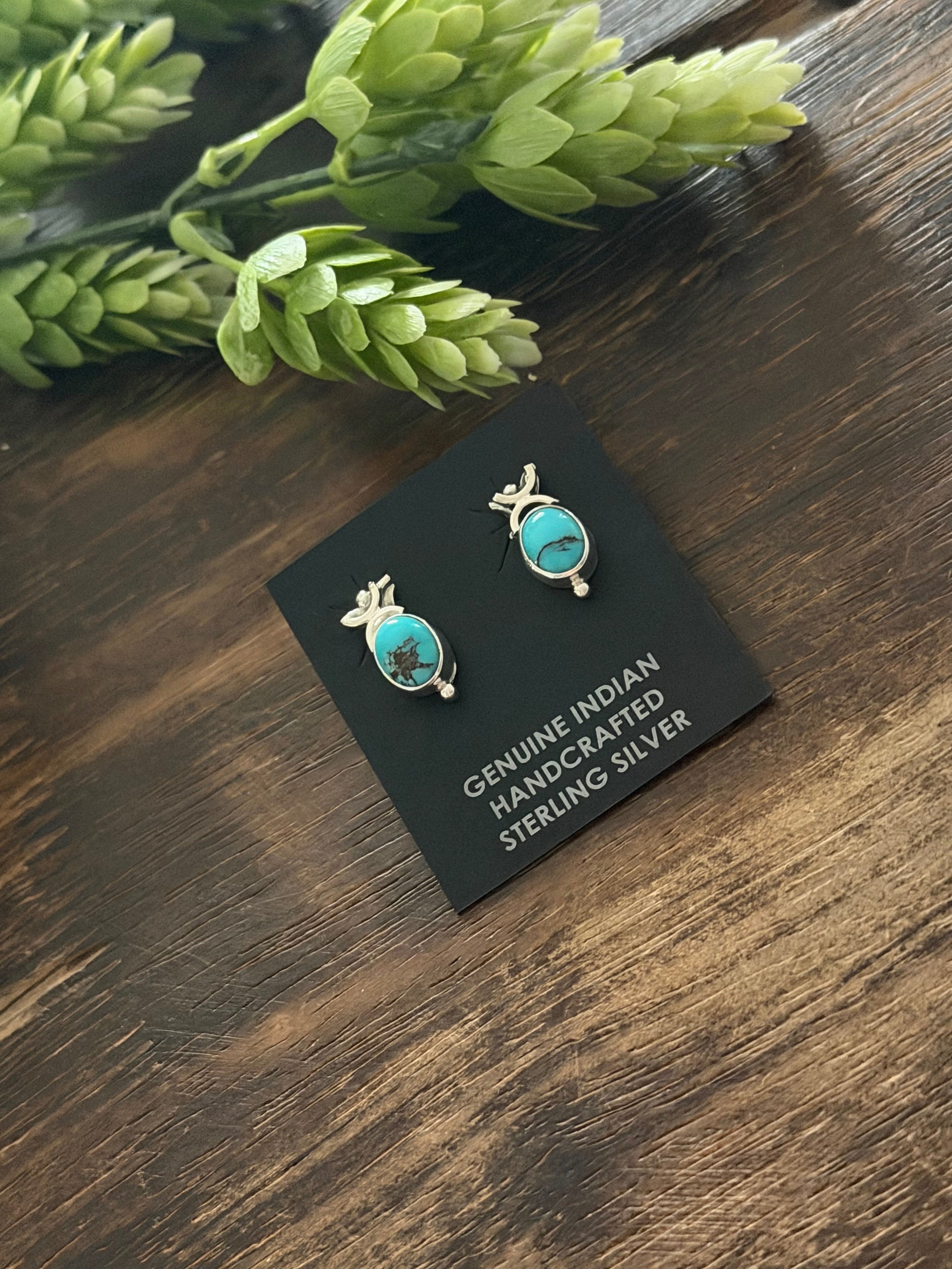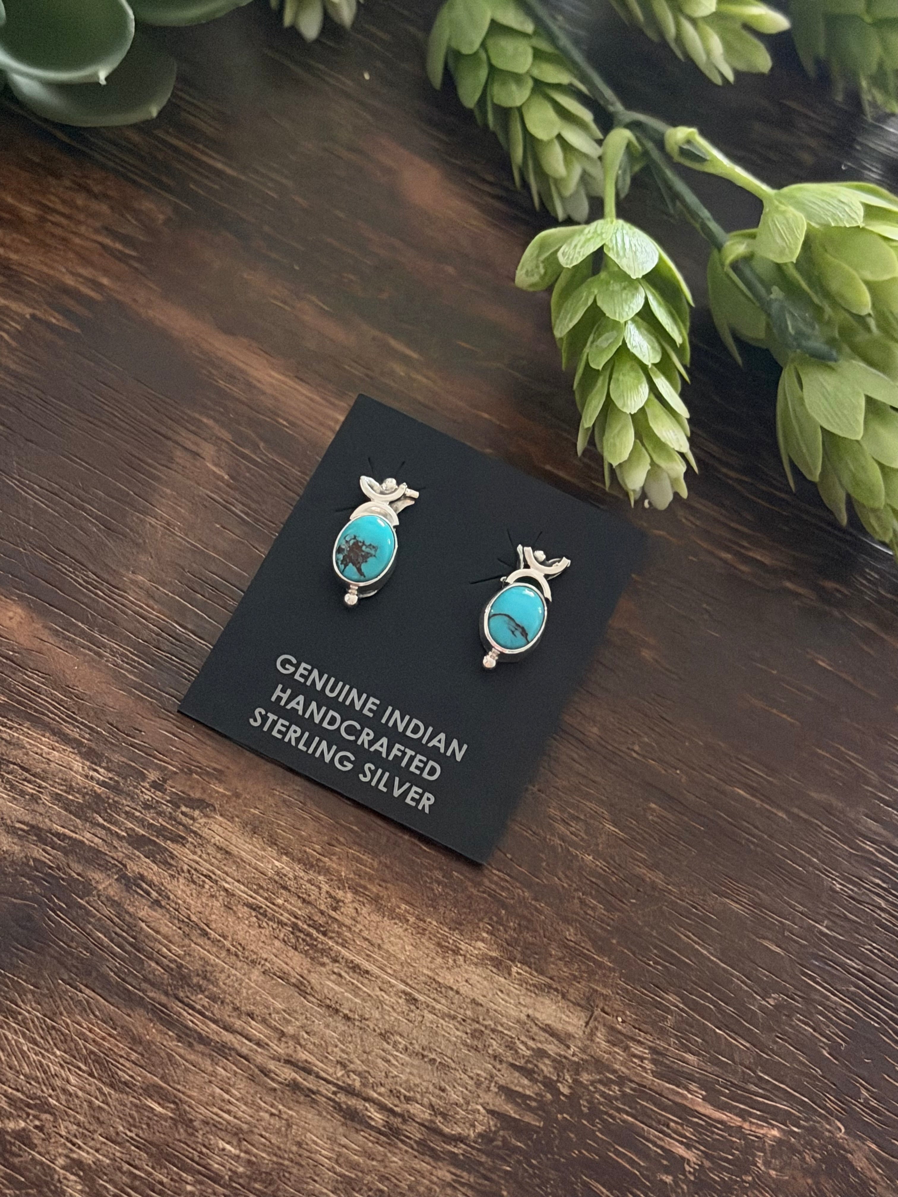 Navajo Made Red Skin Turquoise & Sterling Silver Post Earrings. It measures 5/8 of an inch long and 3/8 of an inch wide. Signed by artist and stamped sterling silver. Stones will differ due to natural stones.