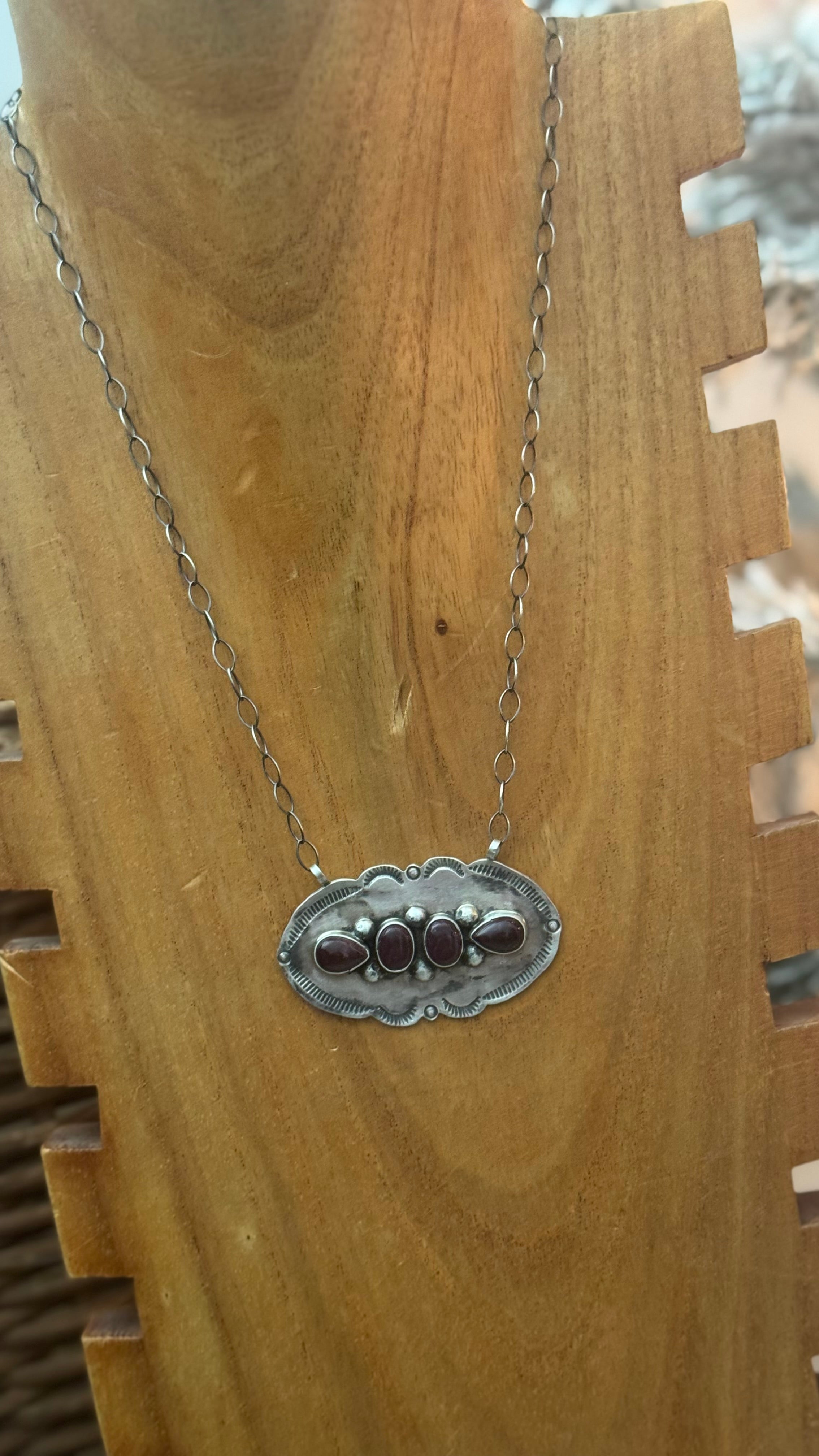 Navajo Made Spiny Oyster & Sterling Silver Necklace. It measures 20 inches long with hang while the chain measures 18 inches long. Signed by the artist and stamped sterling silver. Stones will differ due to natural stones.