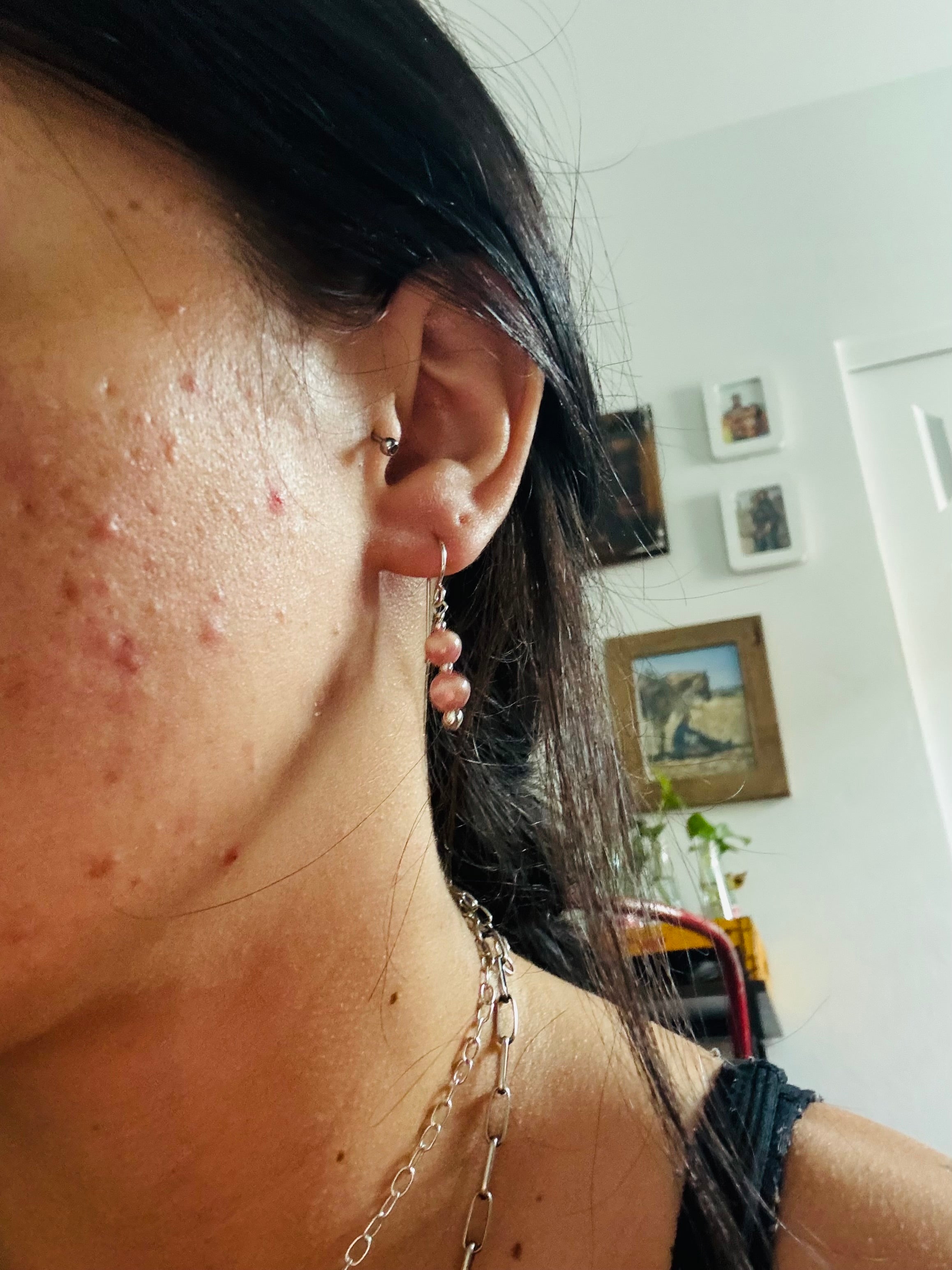 Navajo Made Rhodochrosite & Sterling Silver Dangle Earrings. They measure just over 1 3/8 inches long and 1/4 of an inch wide.
