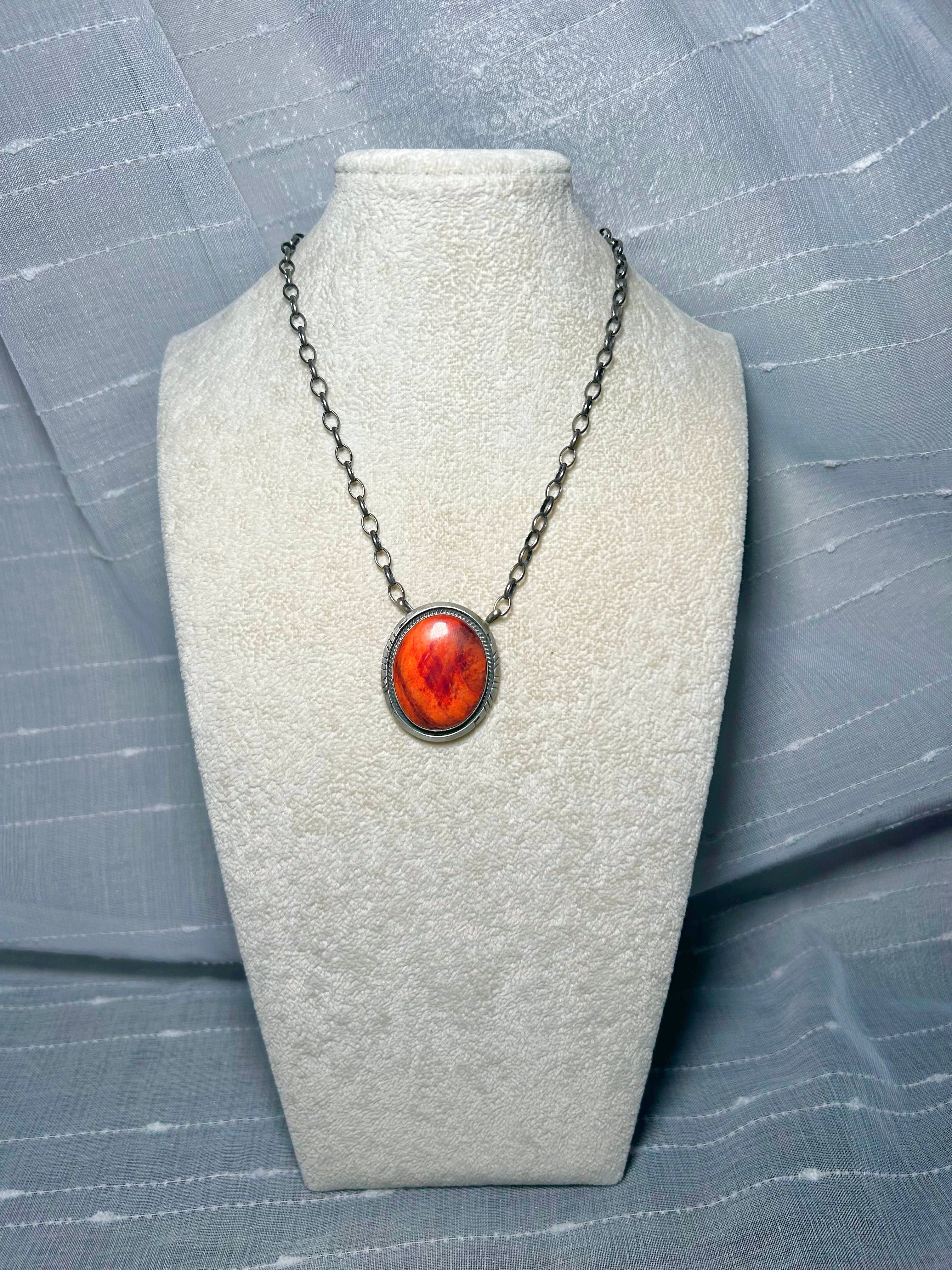 Alfred Martinez Spiny Oyster & Sterling Silver Necklace. It measures 18 3/4 inches long with hang while the chain measures 15 1/2 inches long. Signed by the artist and stamped sterling silver.