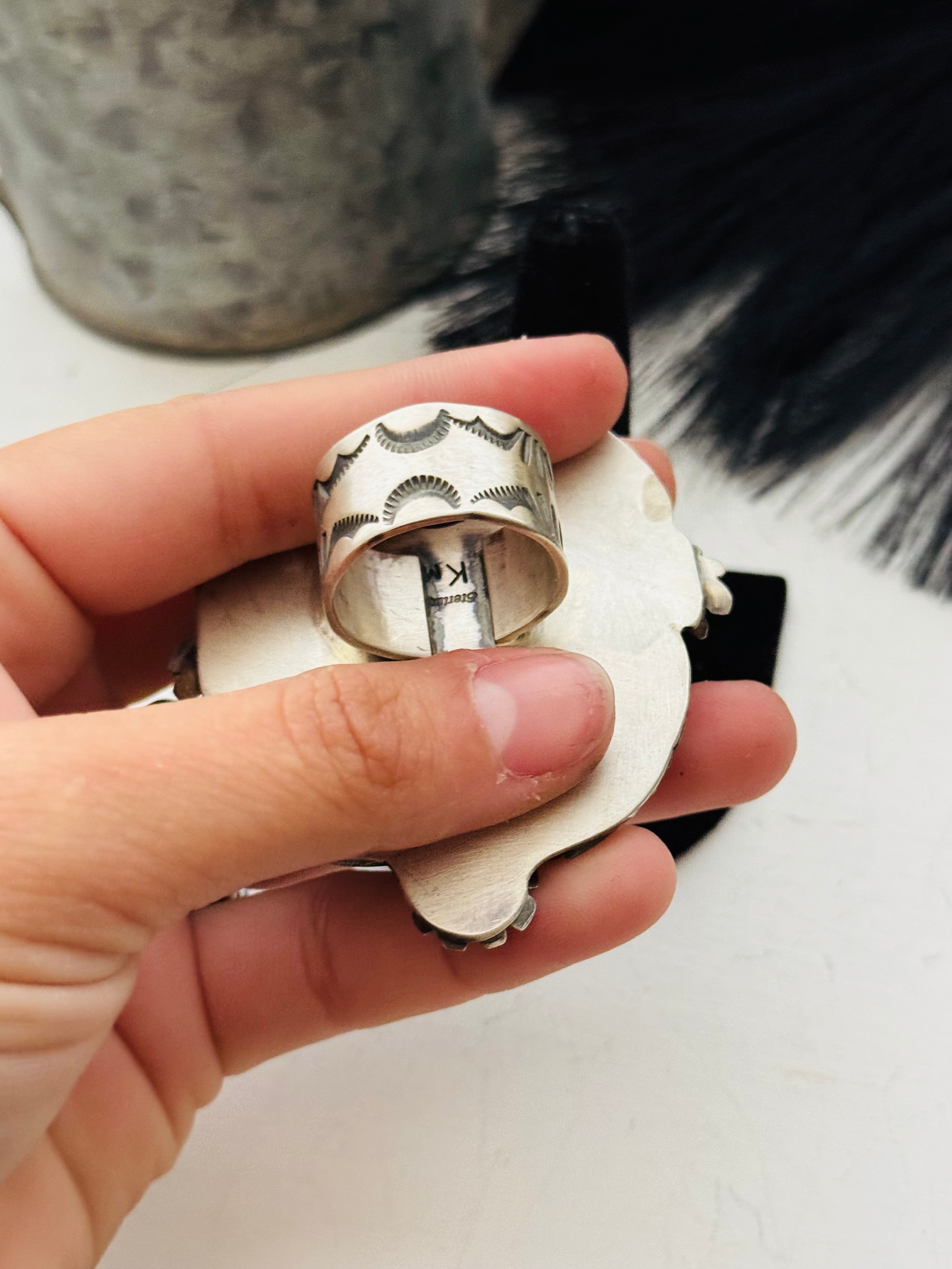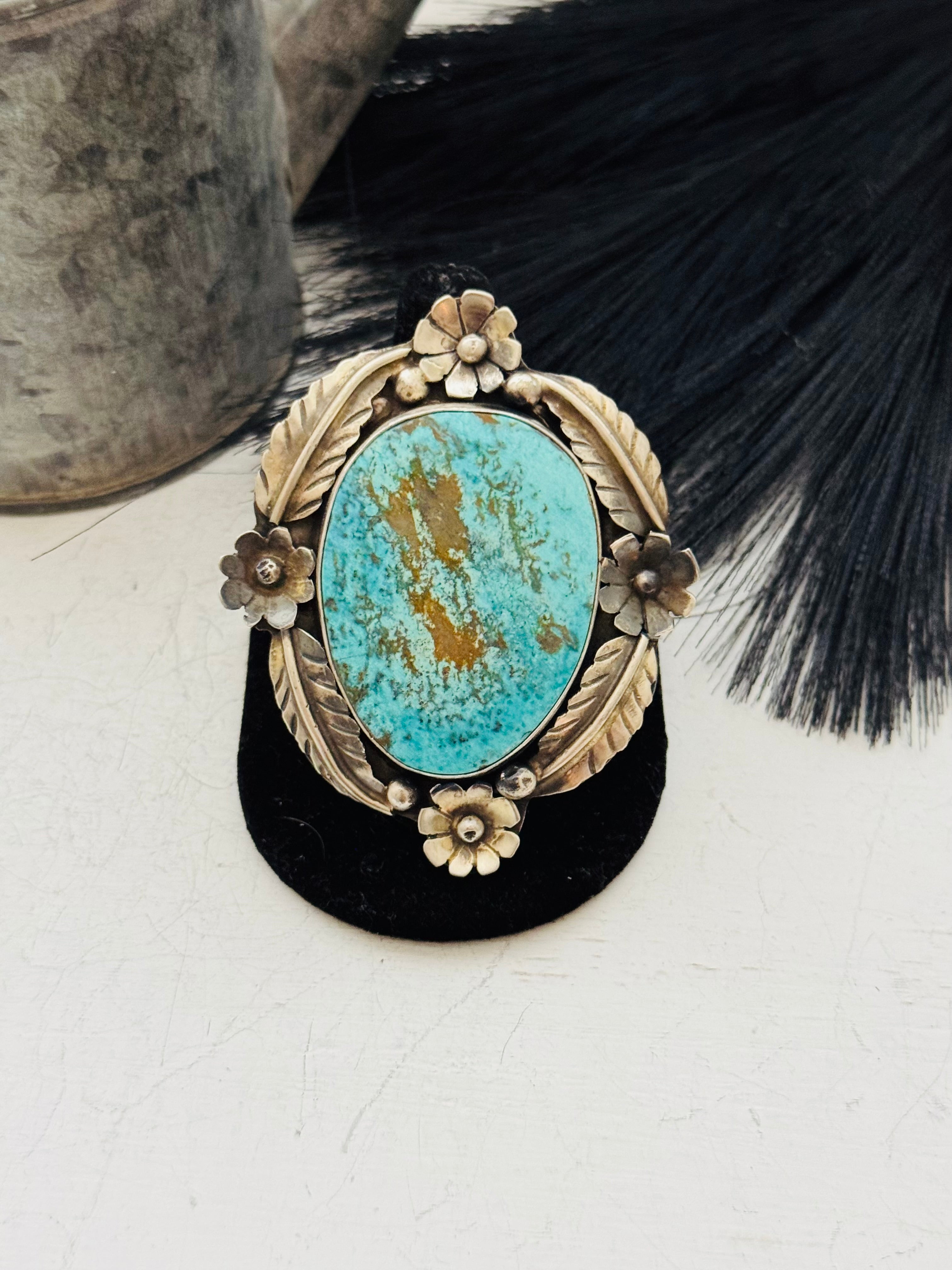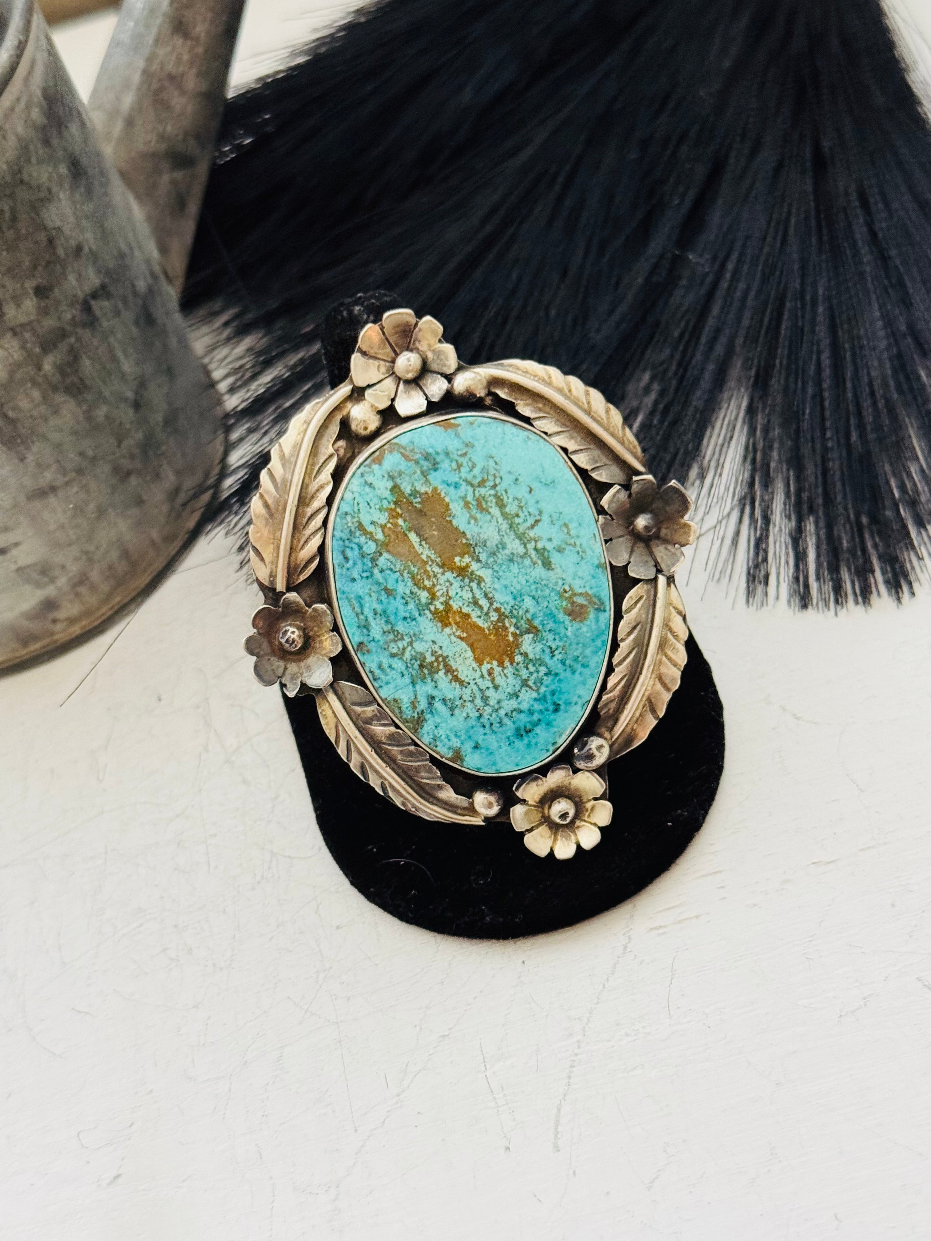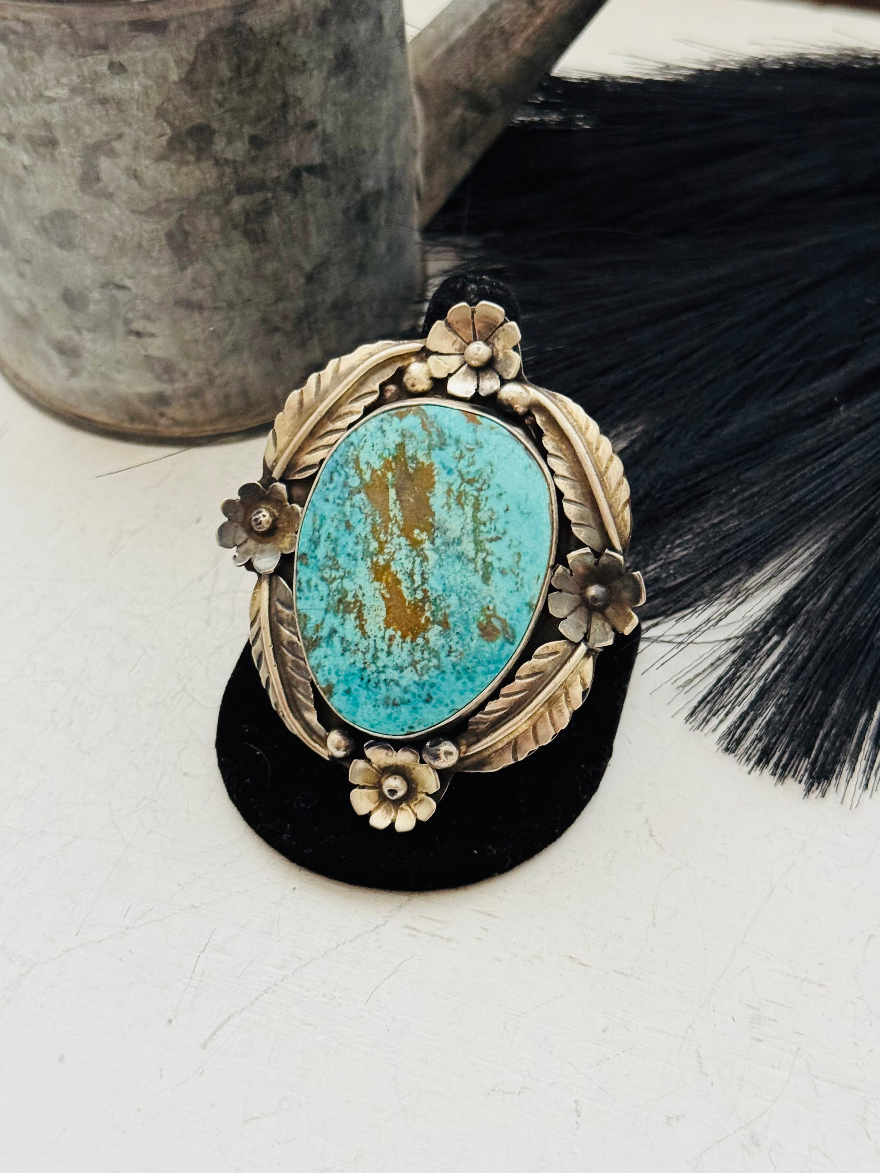 A stunning piece. Navajo Made Royston Turquoise and Sterling Silver Ring Size 10.5. It measures 2 3/4 inches long and 2 3/8 inches wide. Signed by the artist and stamped sterling silver.