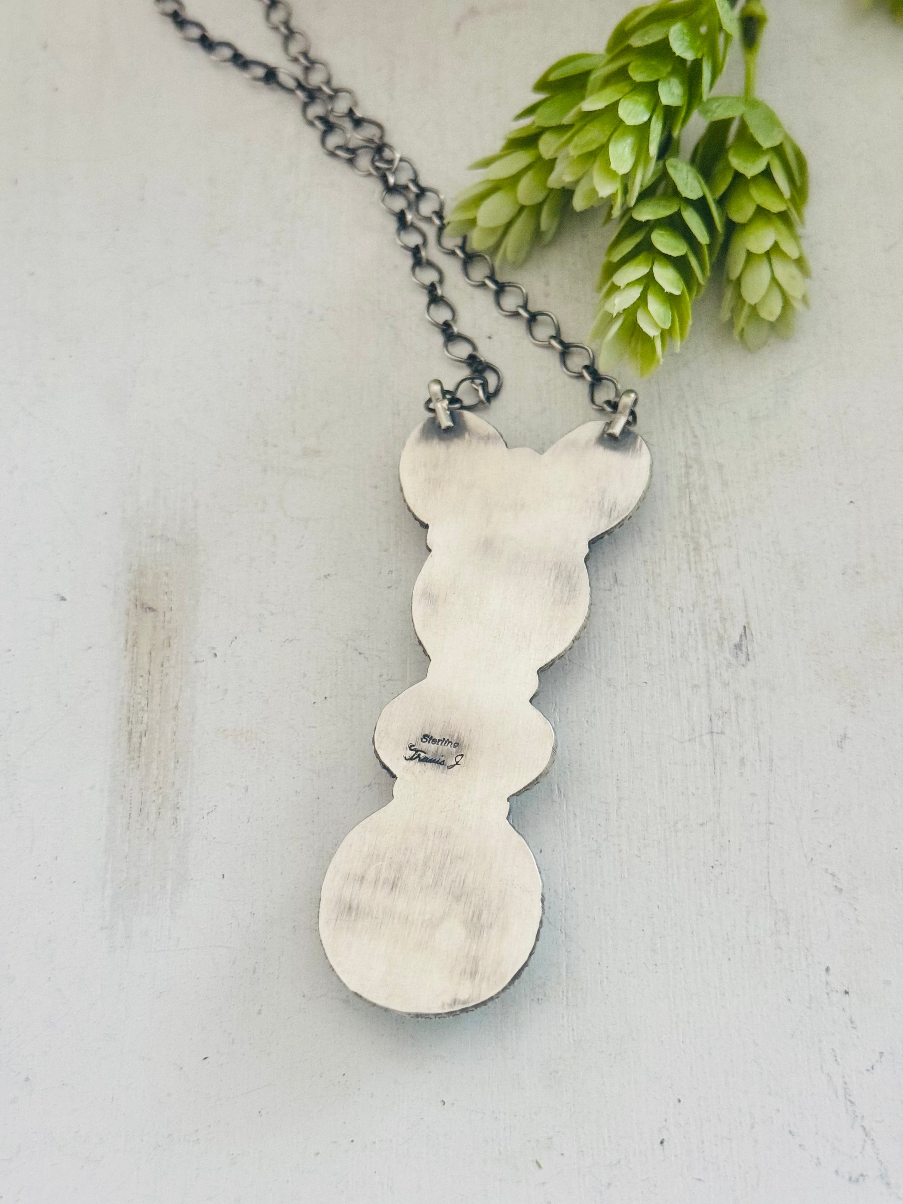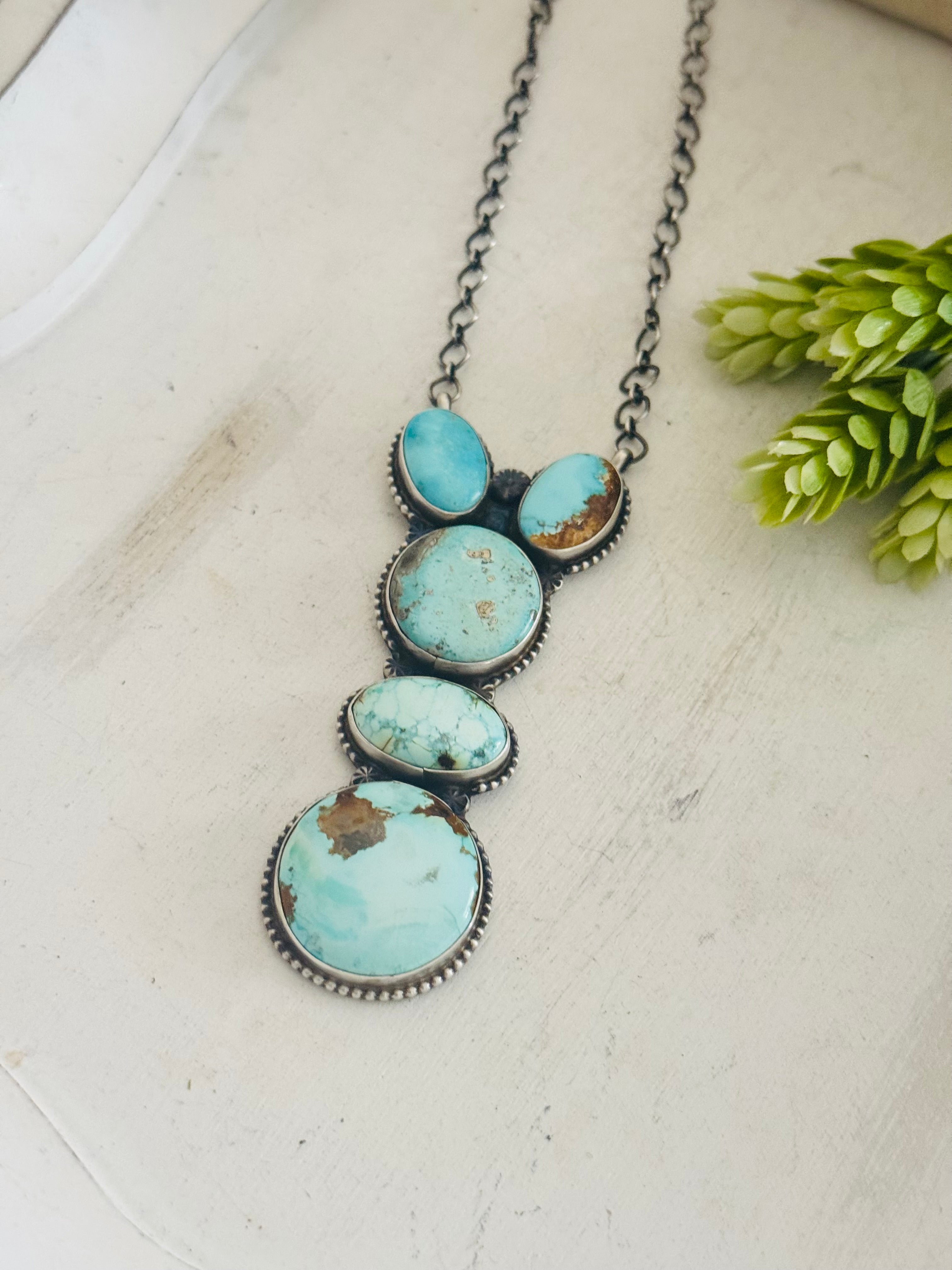 Navajo Made Royston turquoise & Sterling Silver Cluster Necklace. It measures 26 1/4 inches long with hang while the chain by itself measures 19 inches long. Signed by the artist and stamped sterling silver.